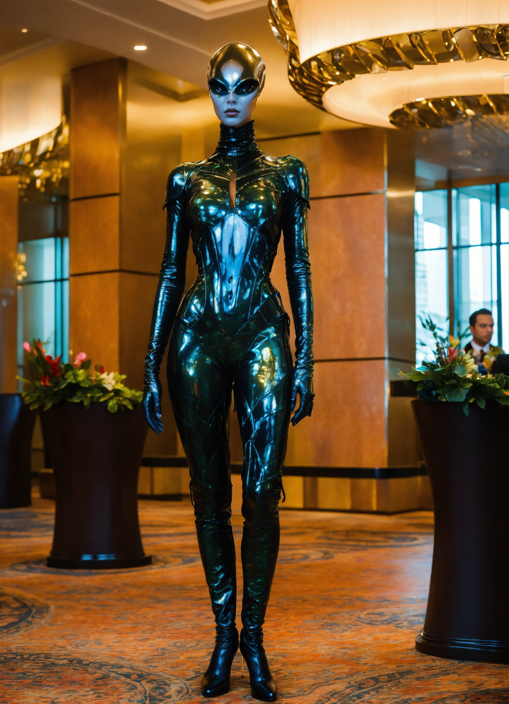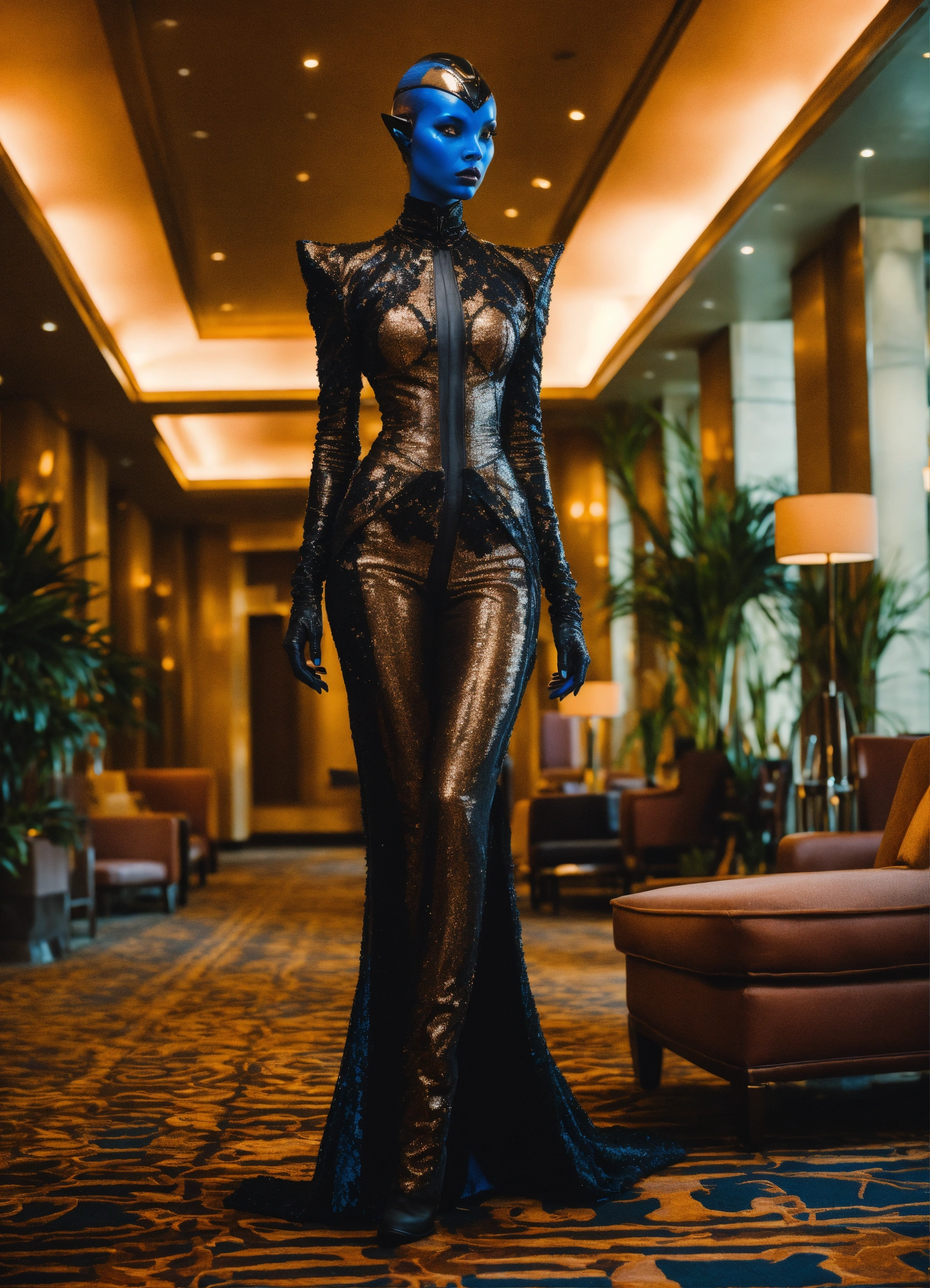 dressed in haute couture. in hotel lobby