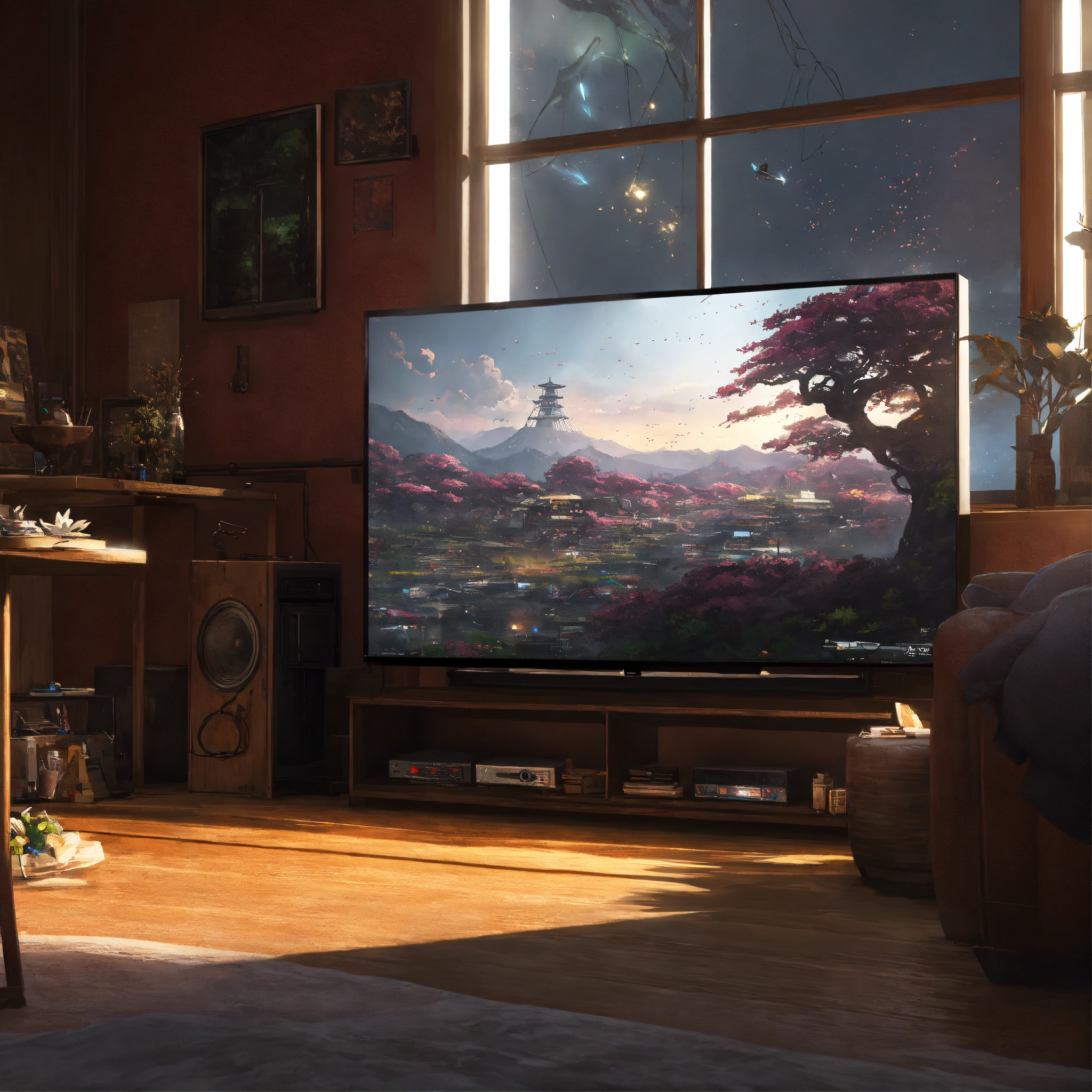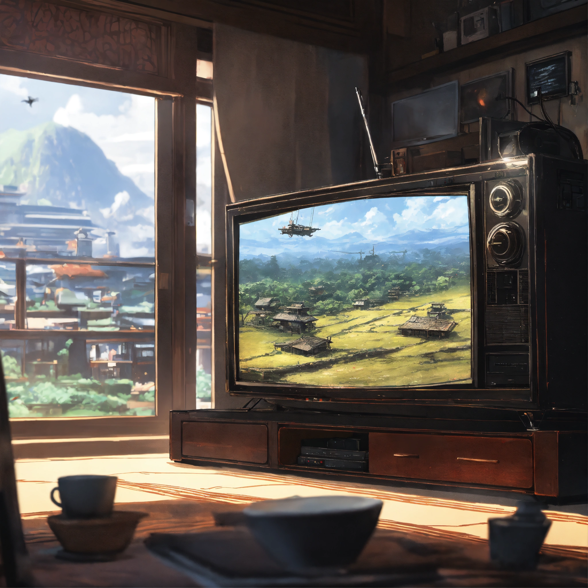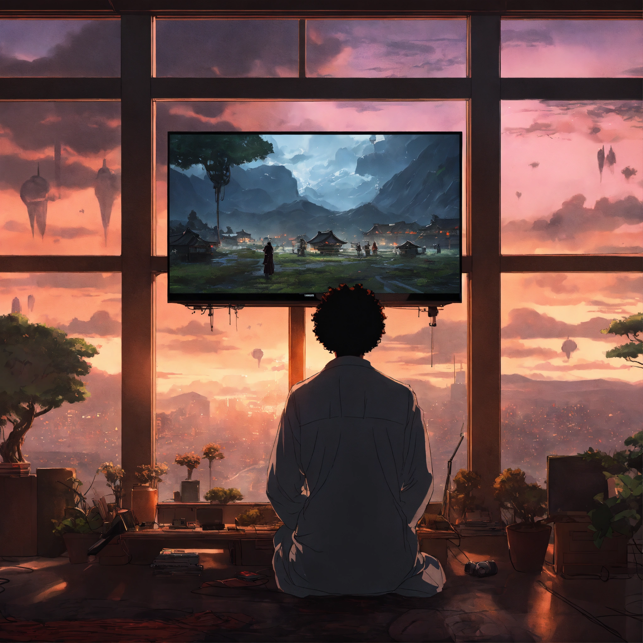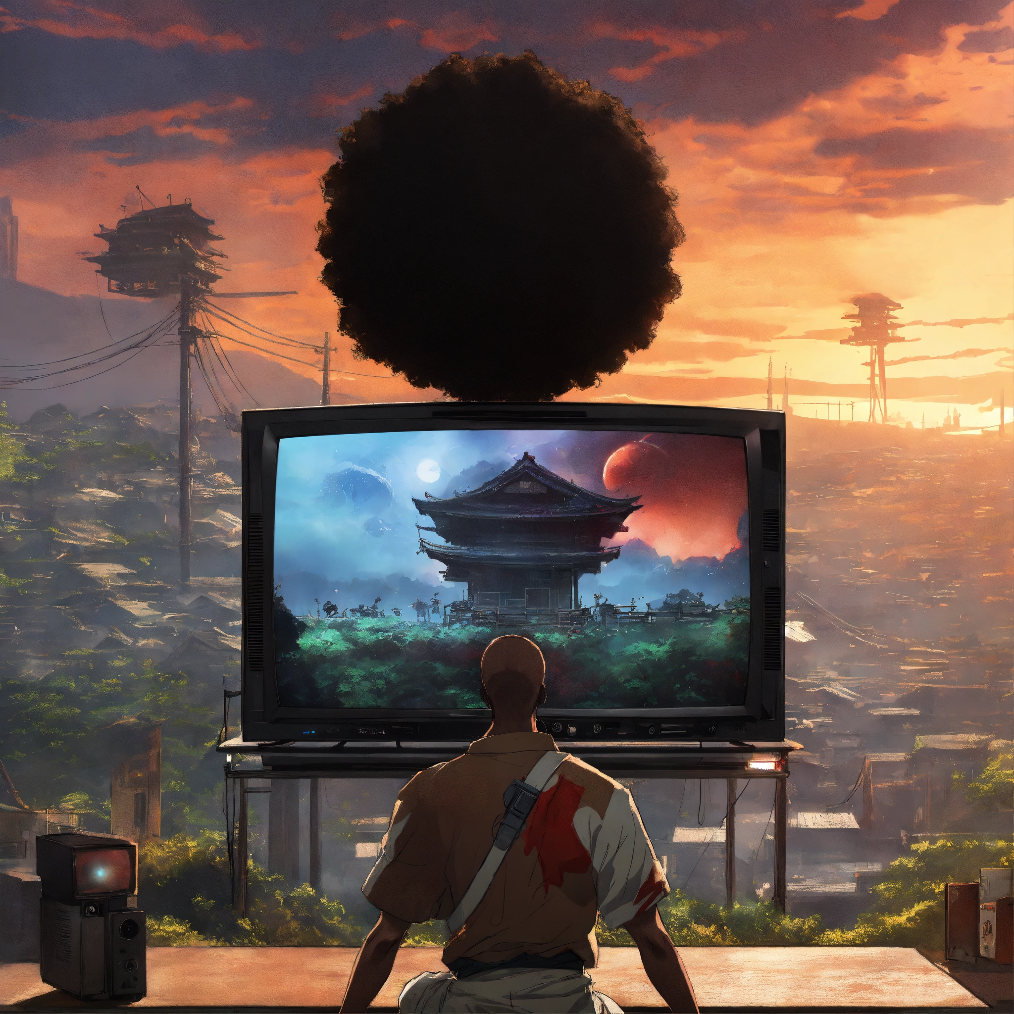 Afro samurai anime, close up of a tv on a channel with tv static alien invasion outside windows, wlop, concept art, japanese anime, trending on art station, highly detailed, epic composition, 8 k uhd