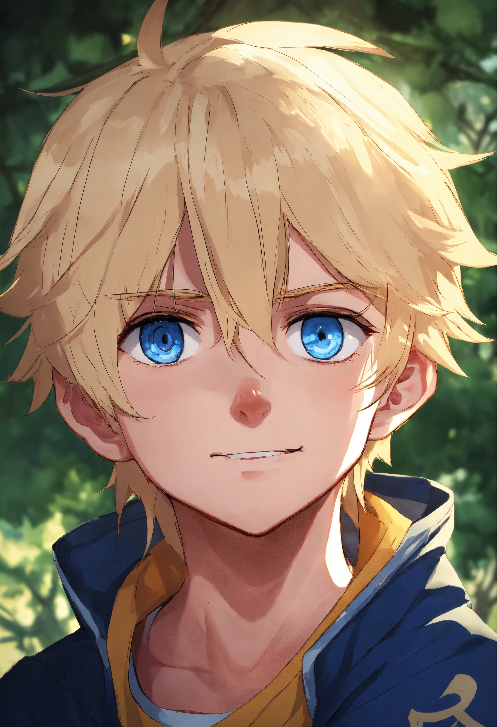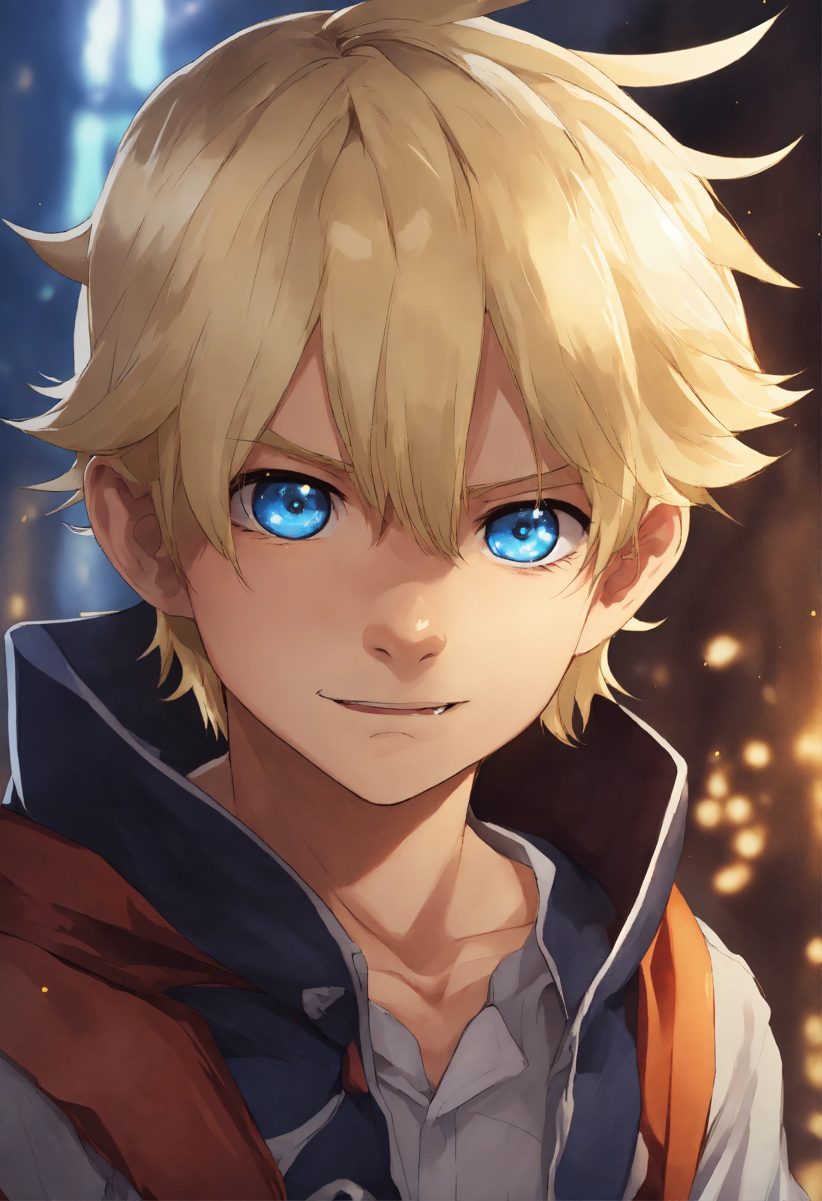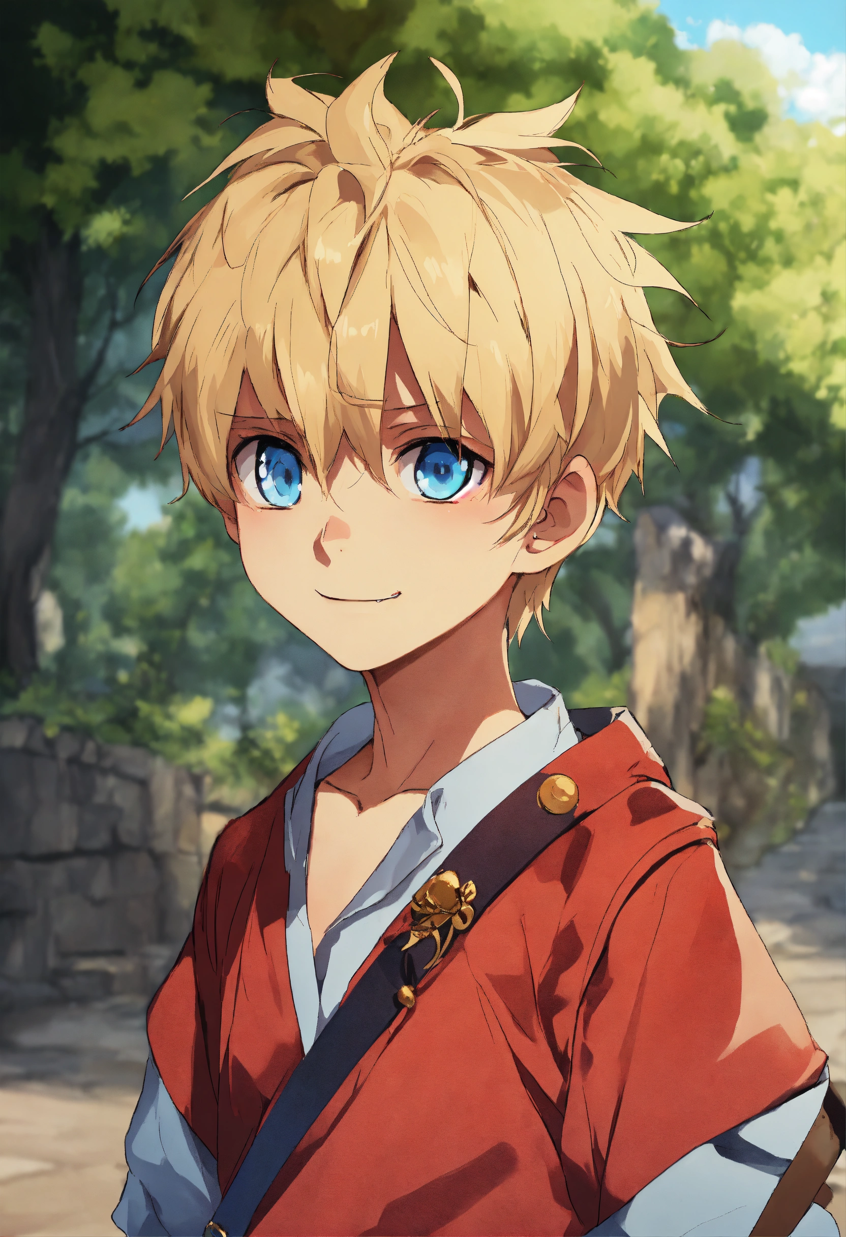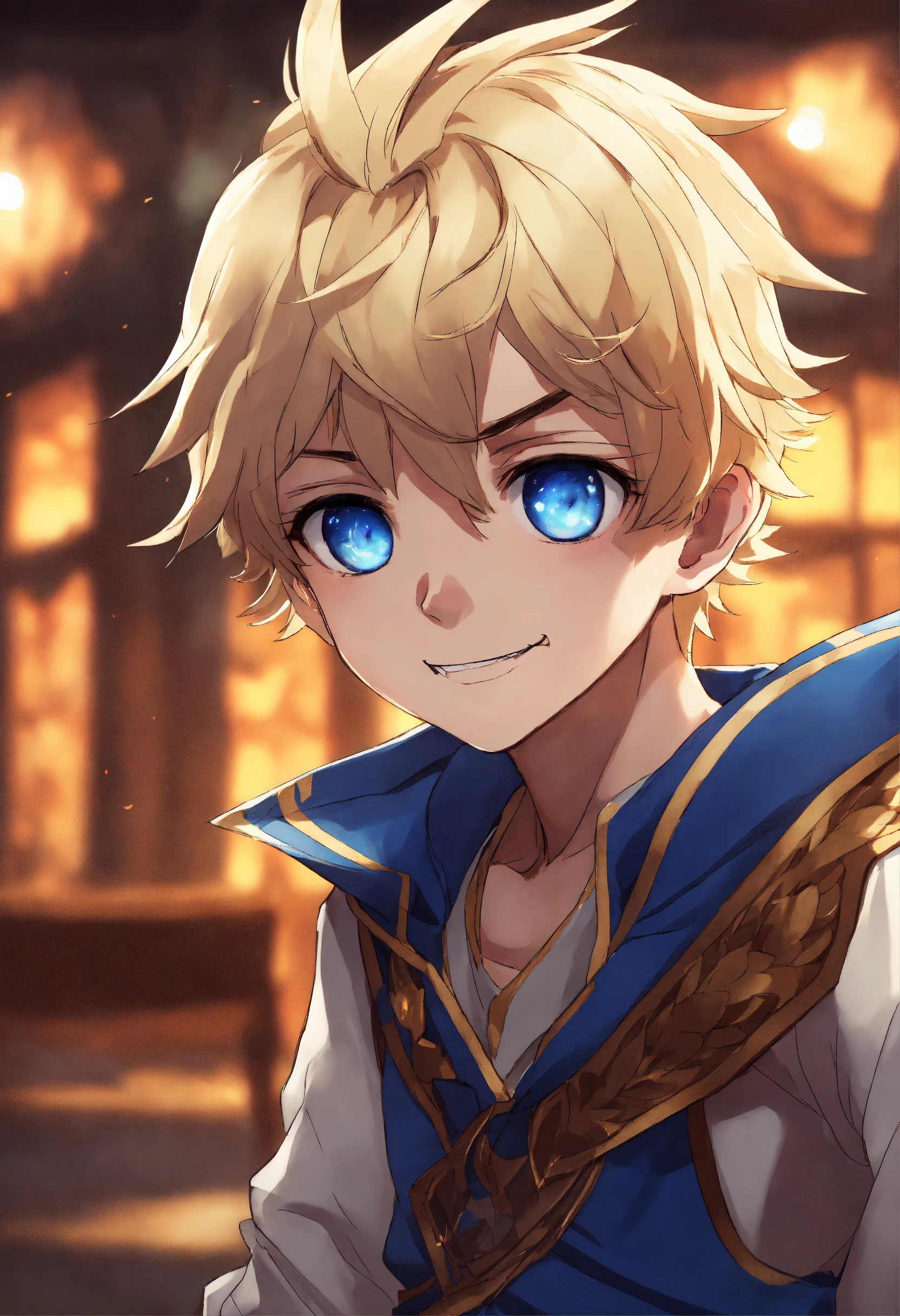 Anime, character art, little blonde boy, high fantasy, brat, blue eyes, obnoxious, arrogant, 6-year-old boy, smirk, looking at viewer, best quality, young boy, wide shot, full body image, adorable, annoying, bratty, wicked, raised eyebrow, grin, proud