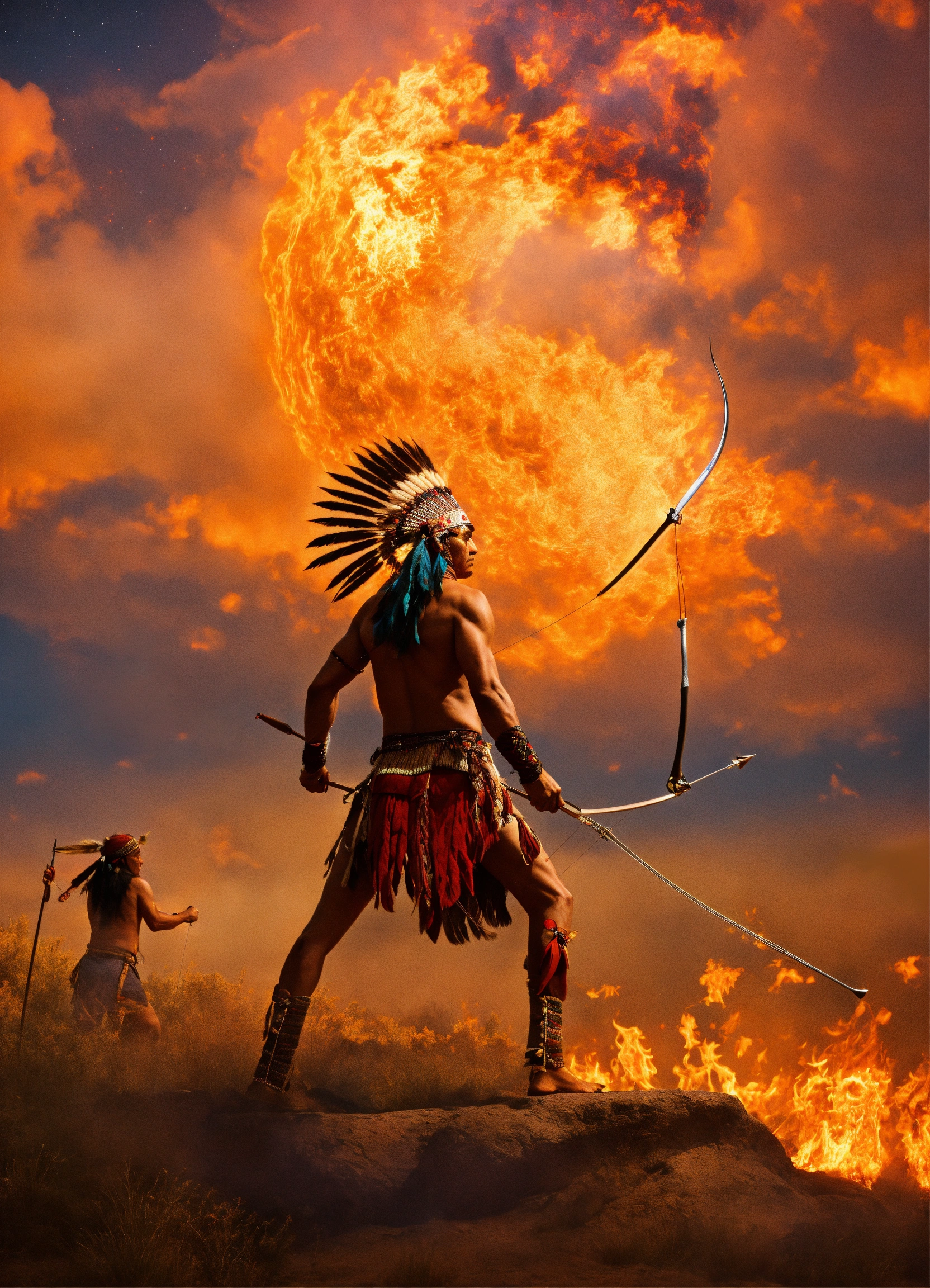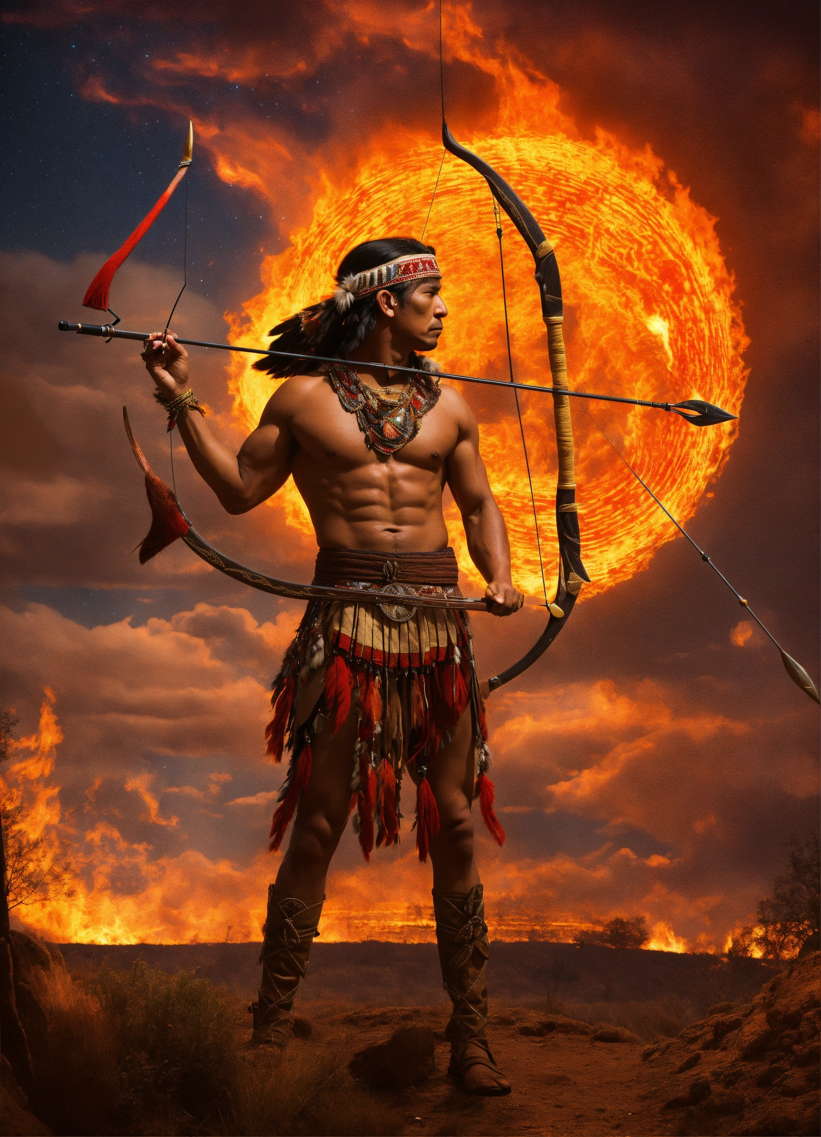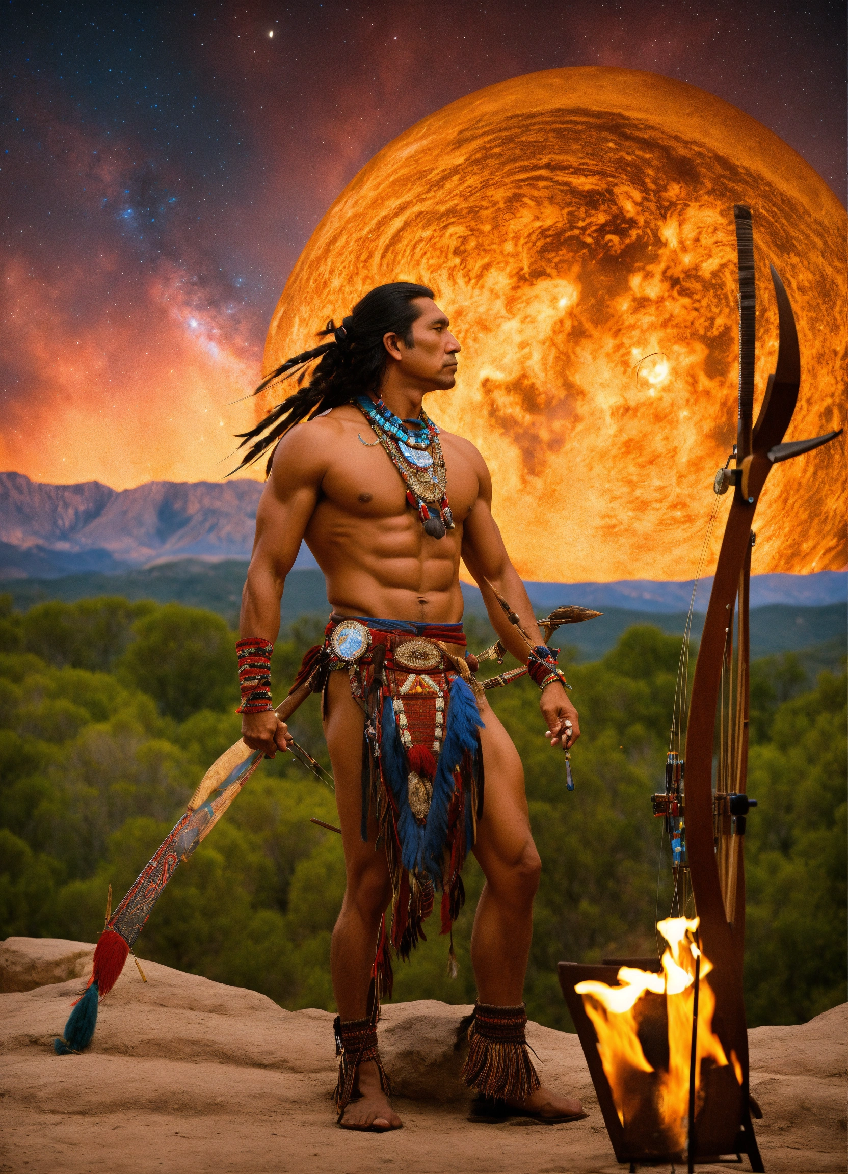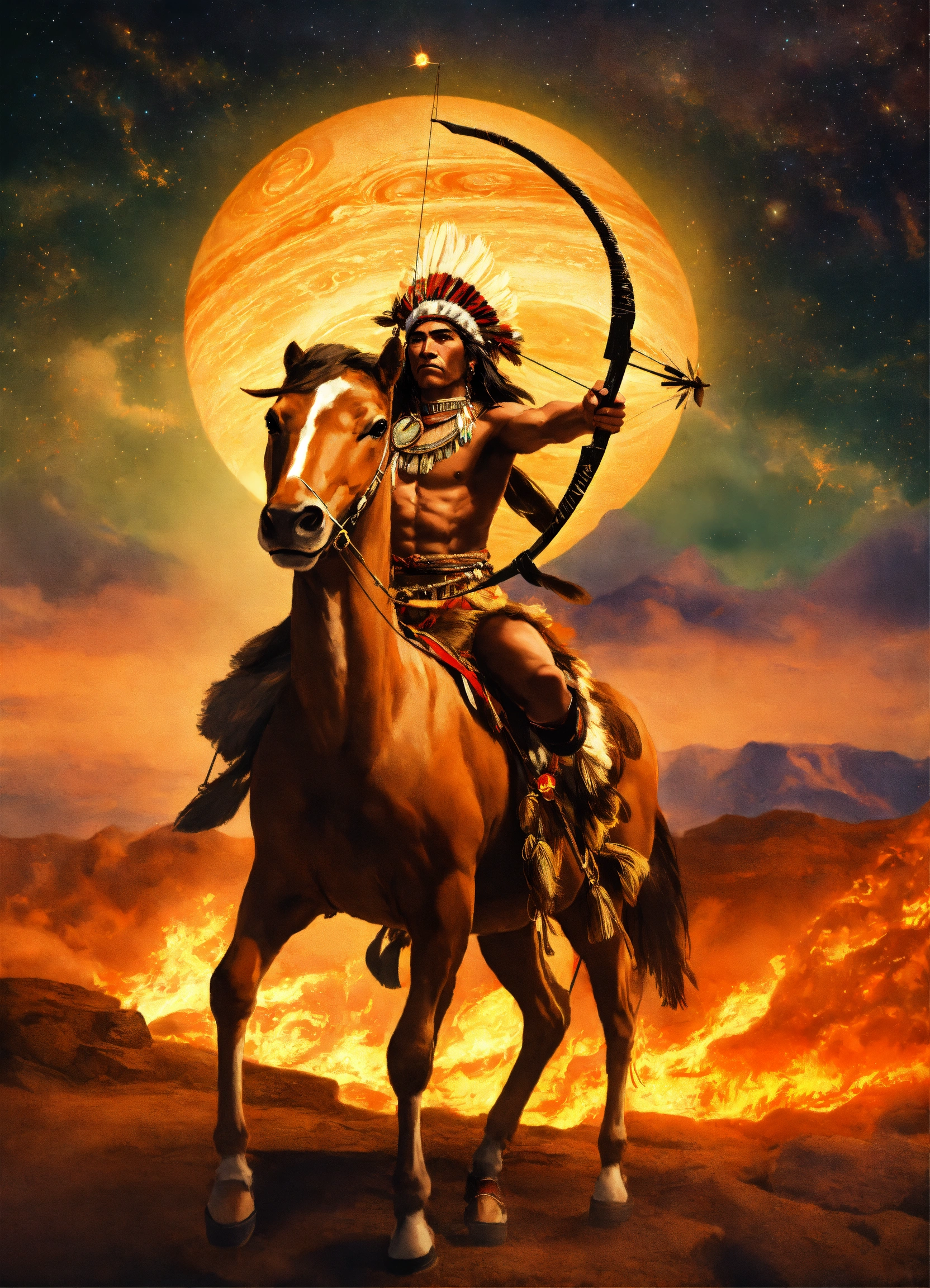 Jupiter in background with native american indian man as sagittarius the archer with fire