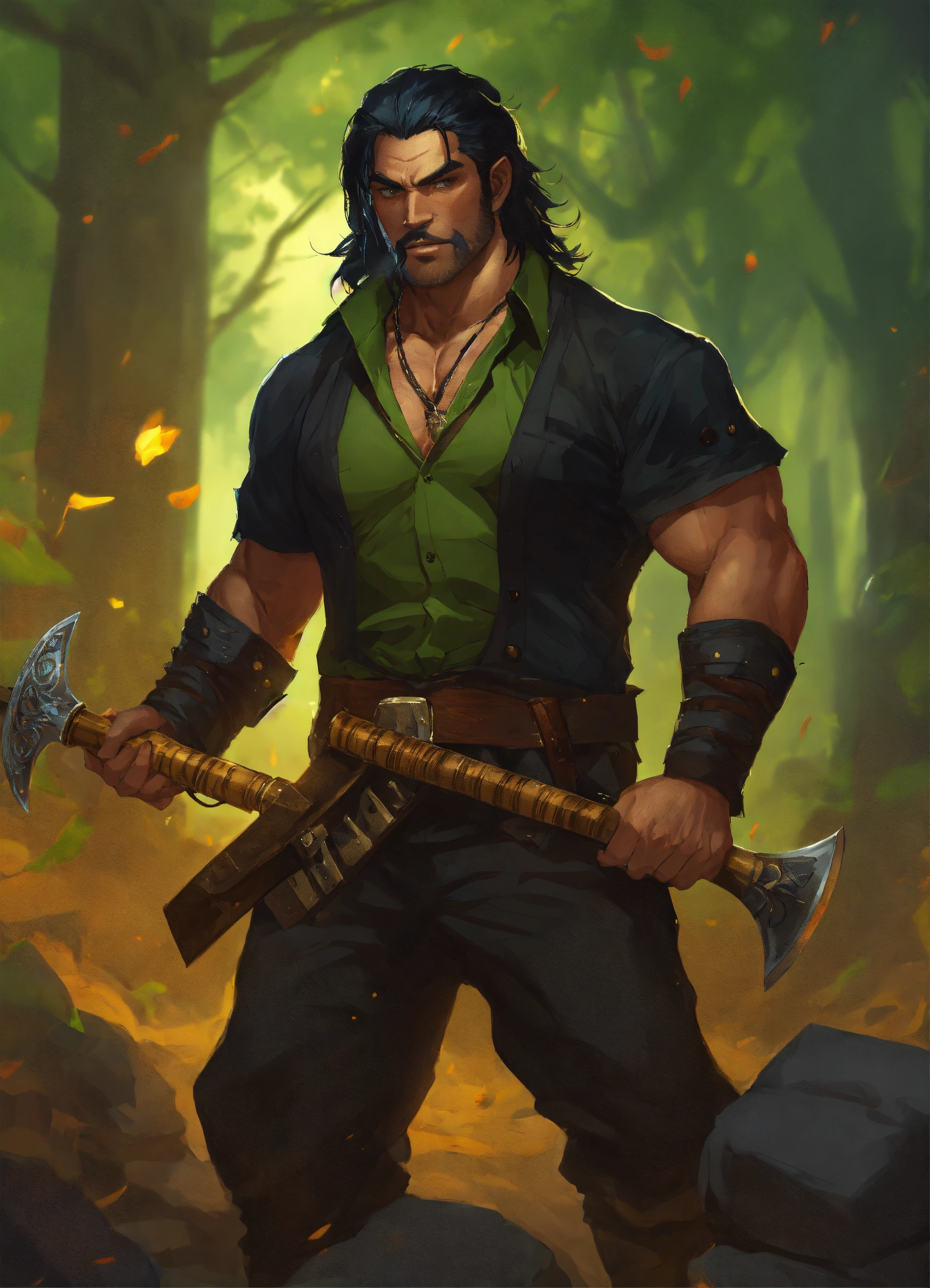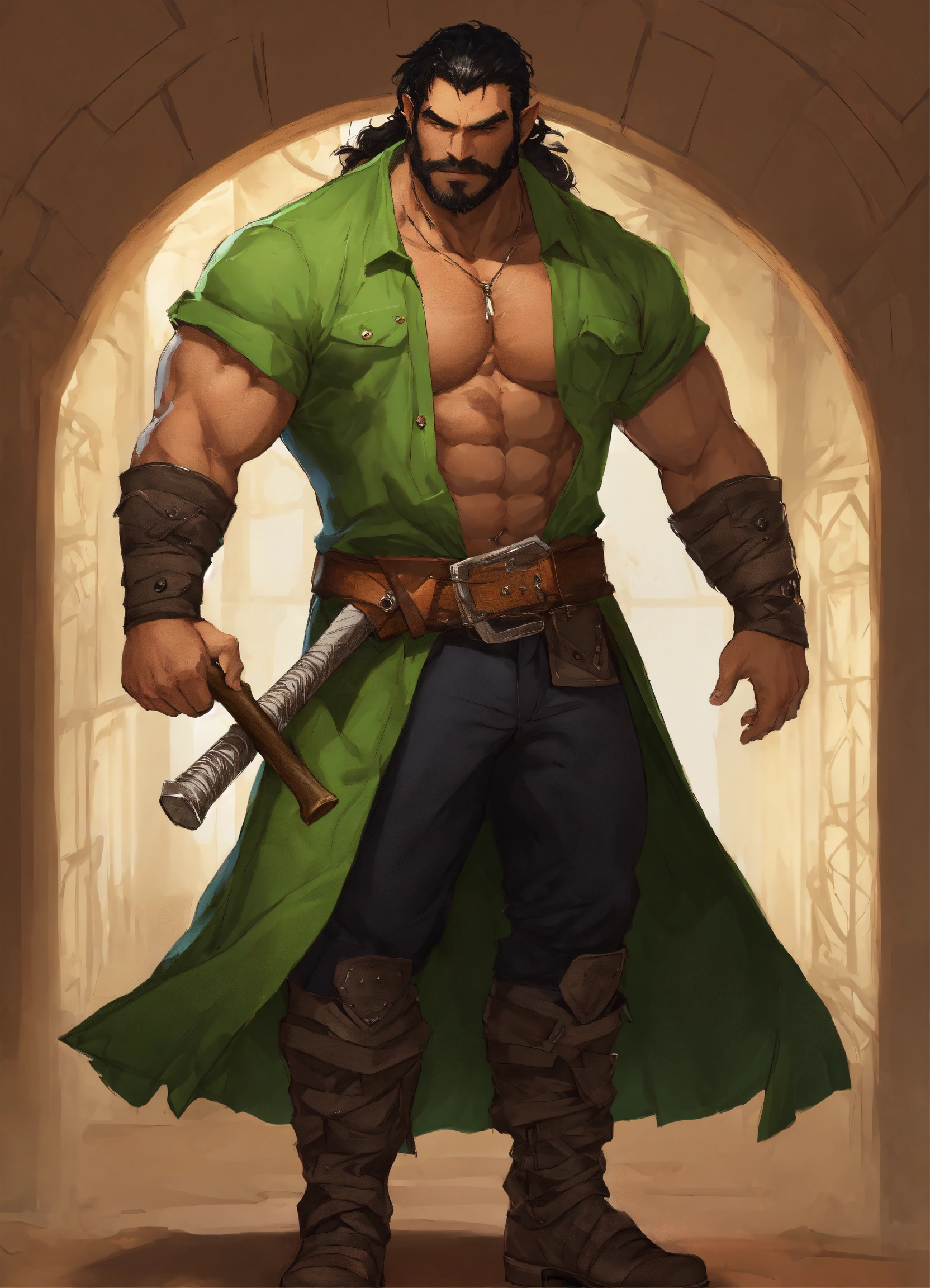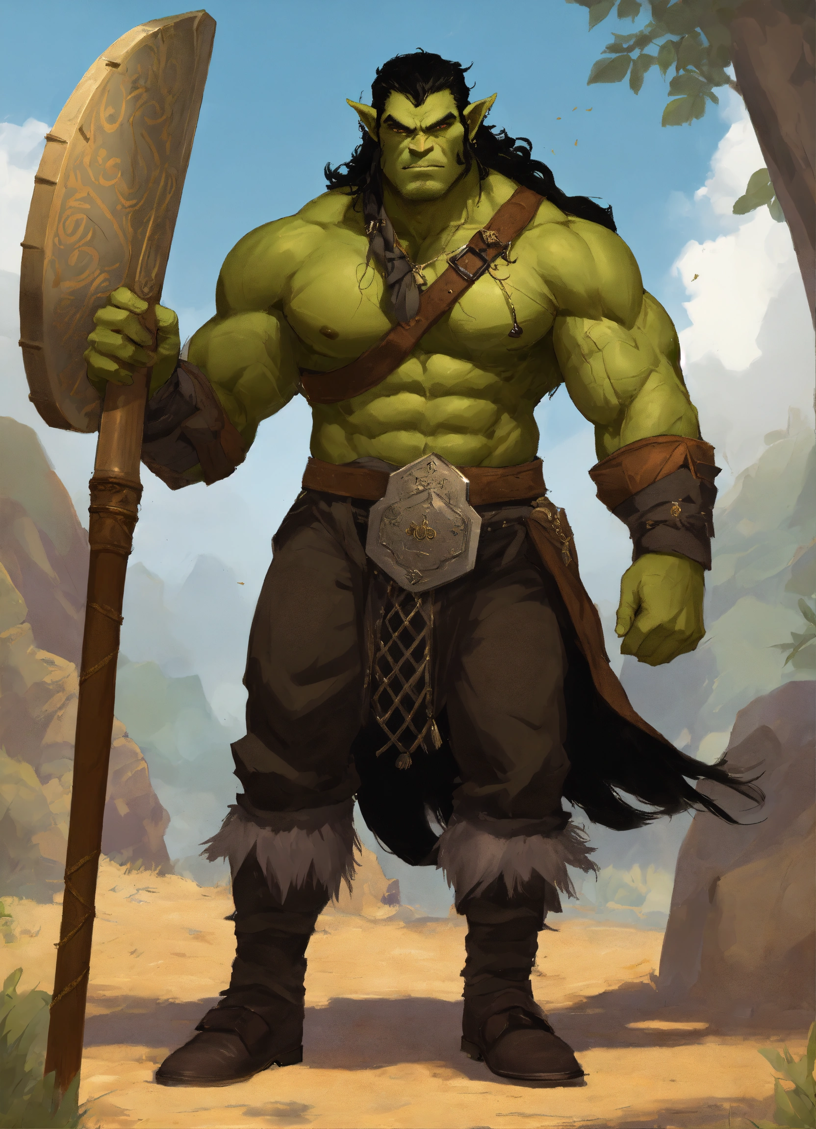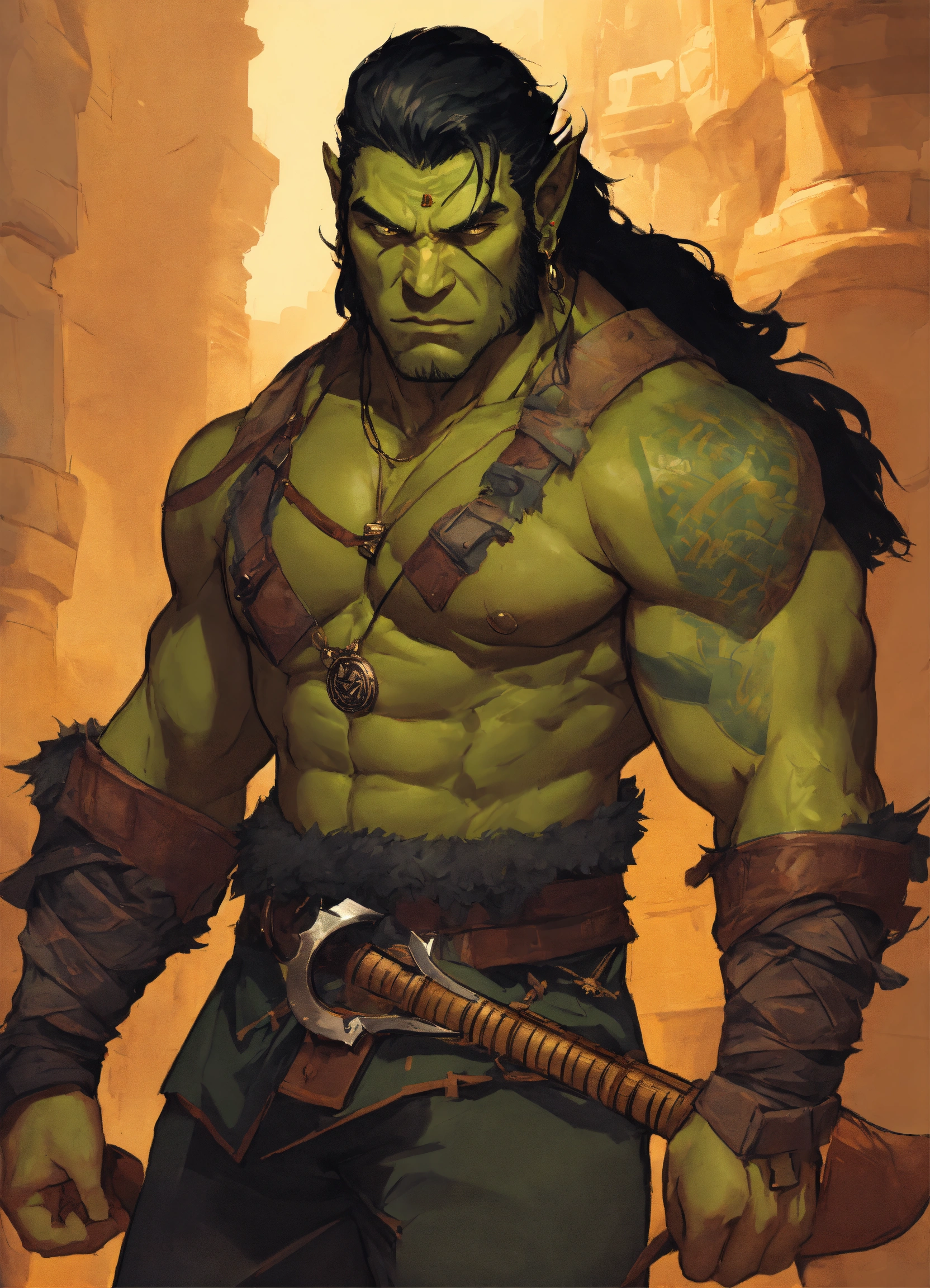 A d&d half-orc with massive muscles, he is wearing a black short sleeved button up shirt with almost all the buttons undone, he has a mass of black chest hair, he has shoulder length black hair, he has green skin and short tusks, he is wearing black pants and dress shoes, he is holding a greataxe, he has the musical instrument the pan flute around his neck
