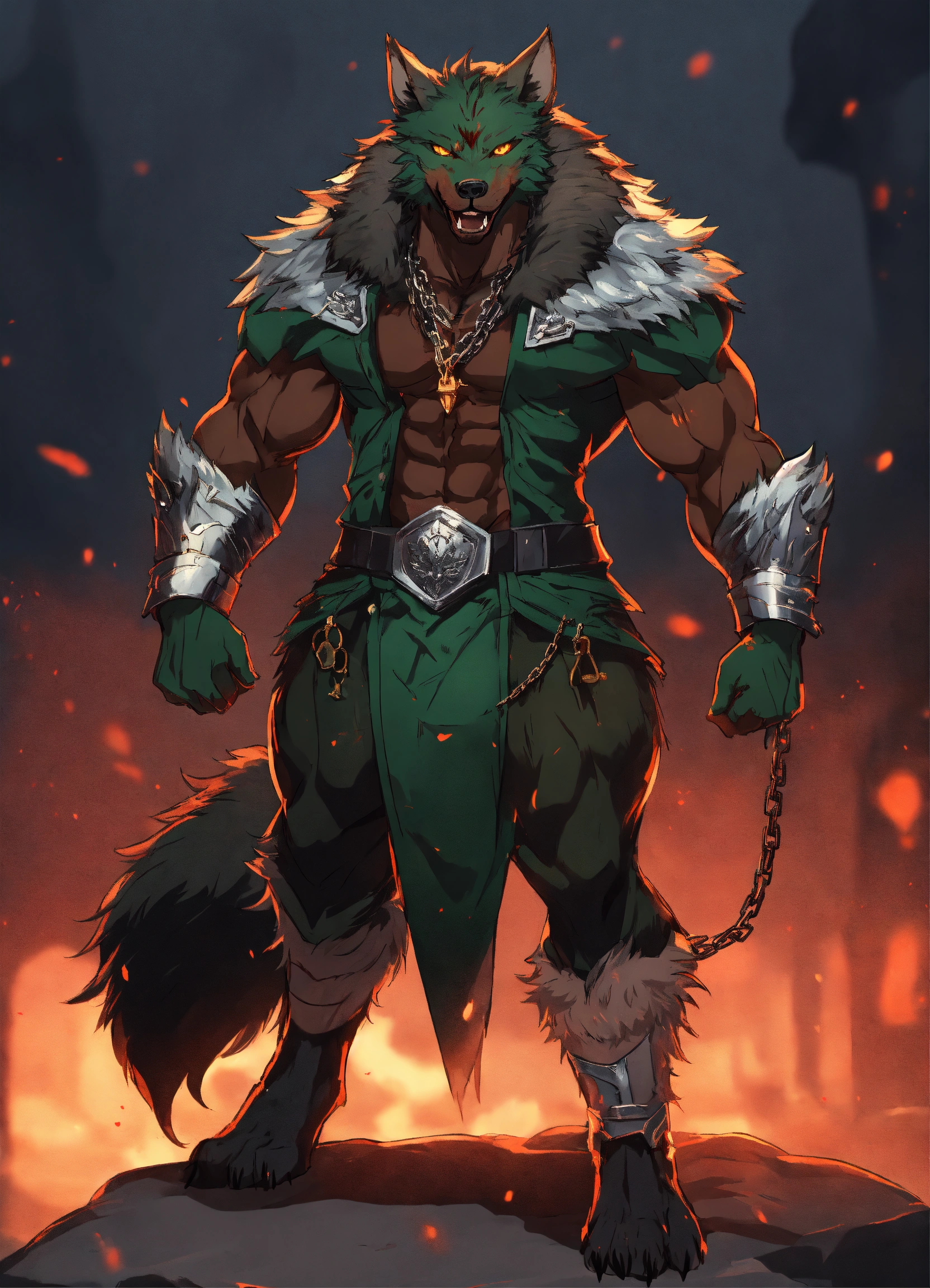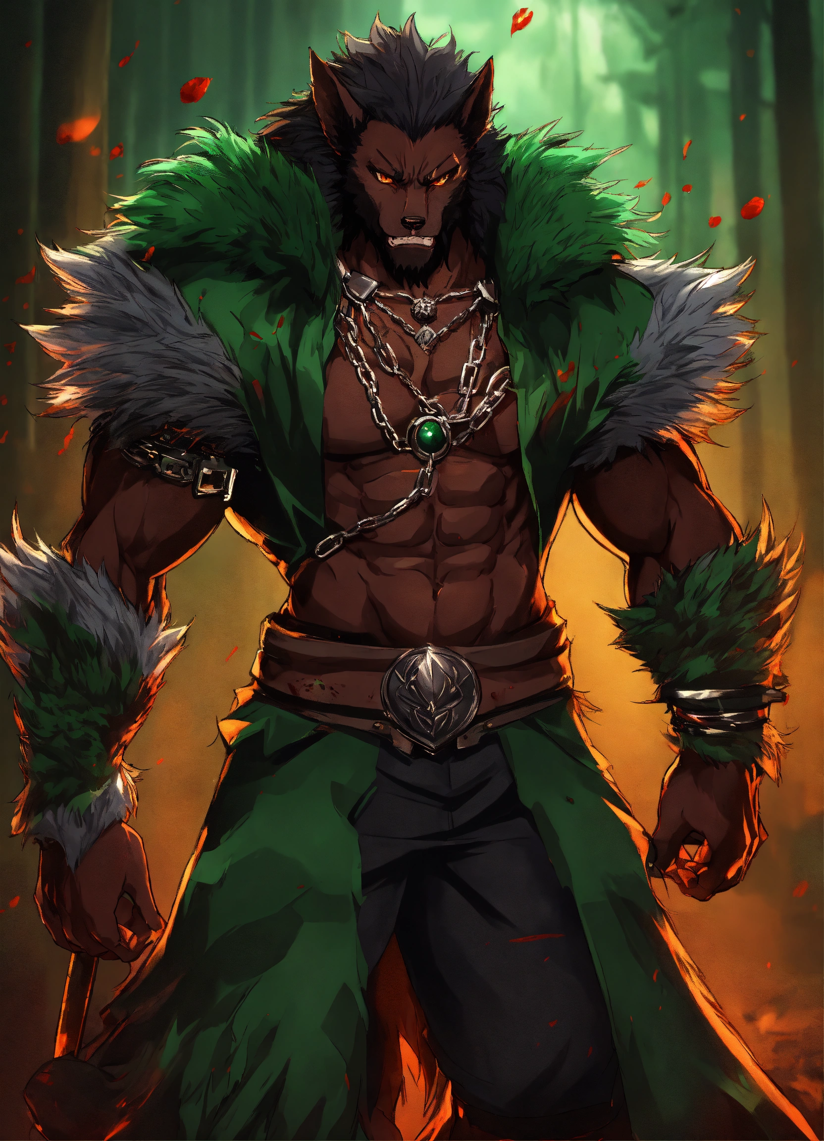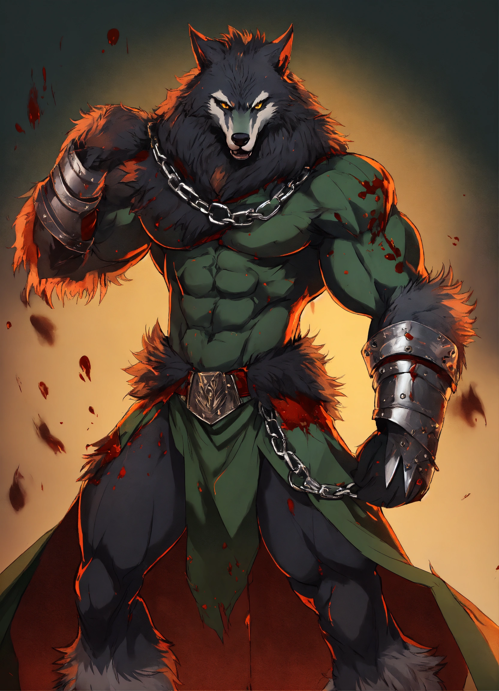 African werewolf anime character, muscular physique, which is styled in a wild black fur and untamed manner, he wears a dark green and silver cloak, anime style, male, werewolf form, werewolf transformation fur in heavy armor with chain blade, covered in blood.