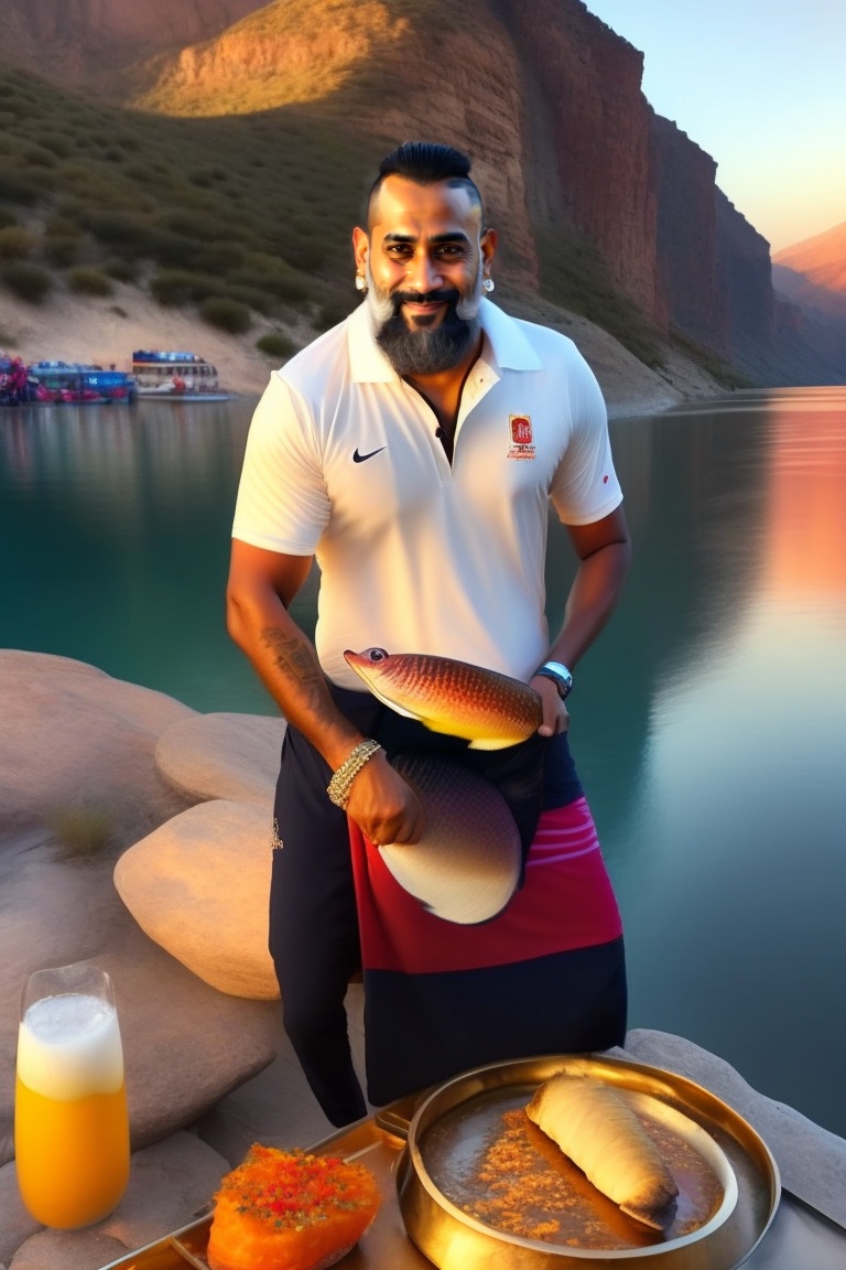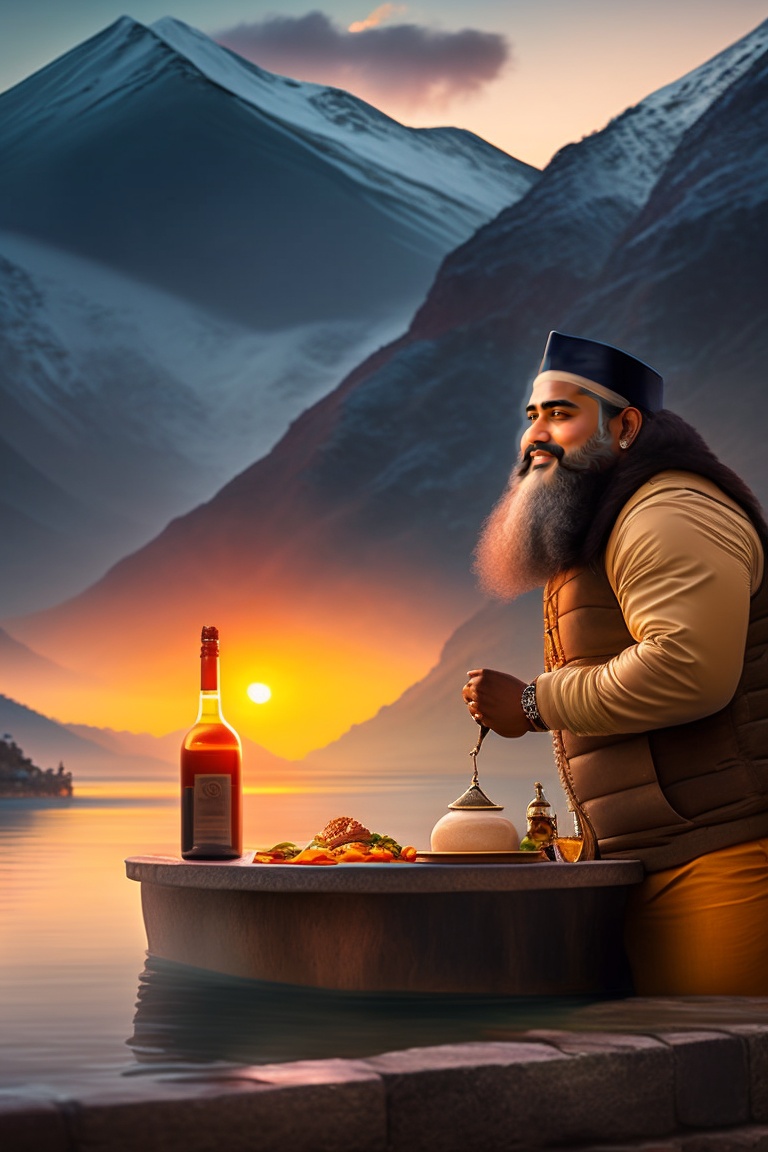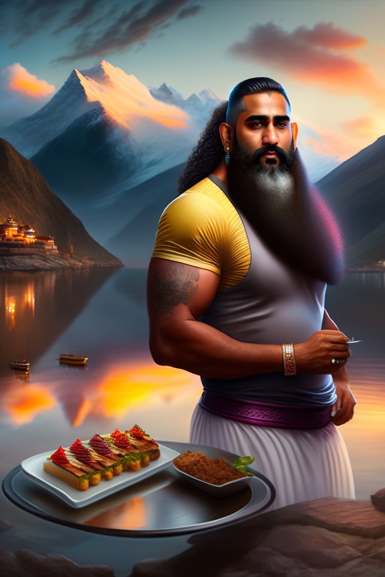 Mahendra singh dhoni in himalayas, as rishi doing tapas with a long beard during sunset, with river ganga behind him