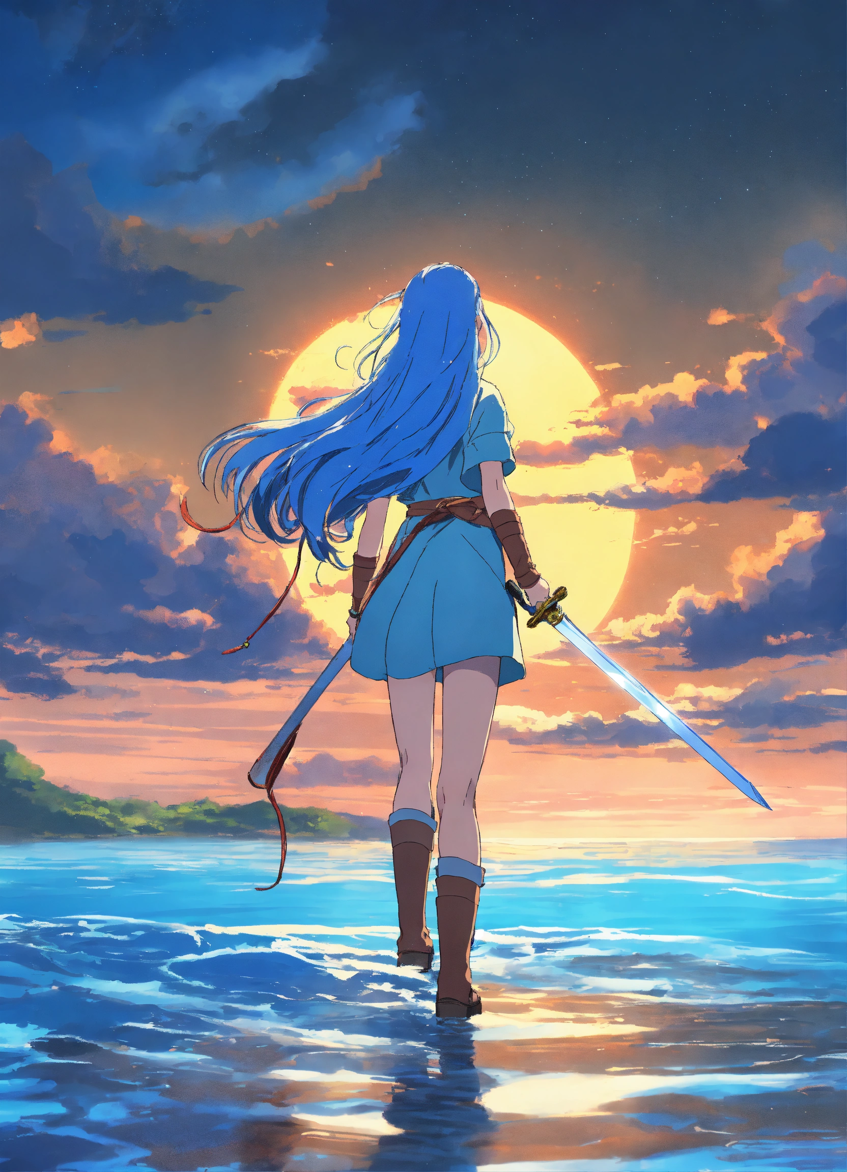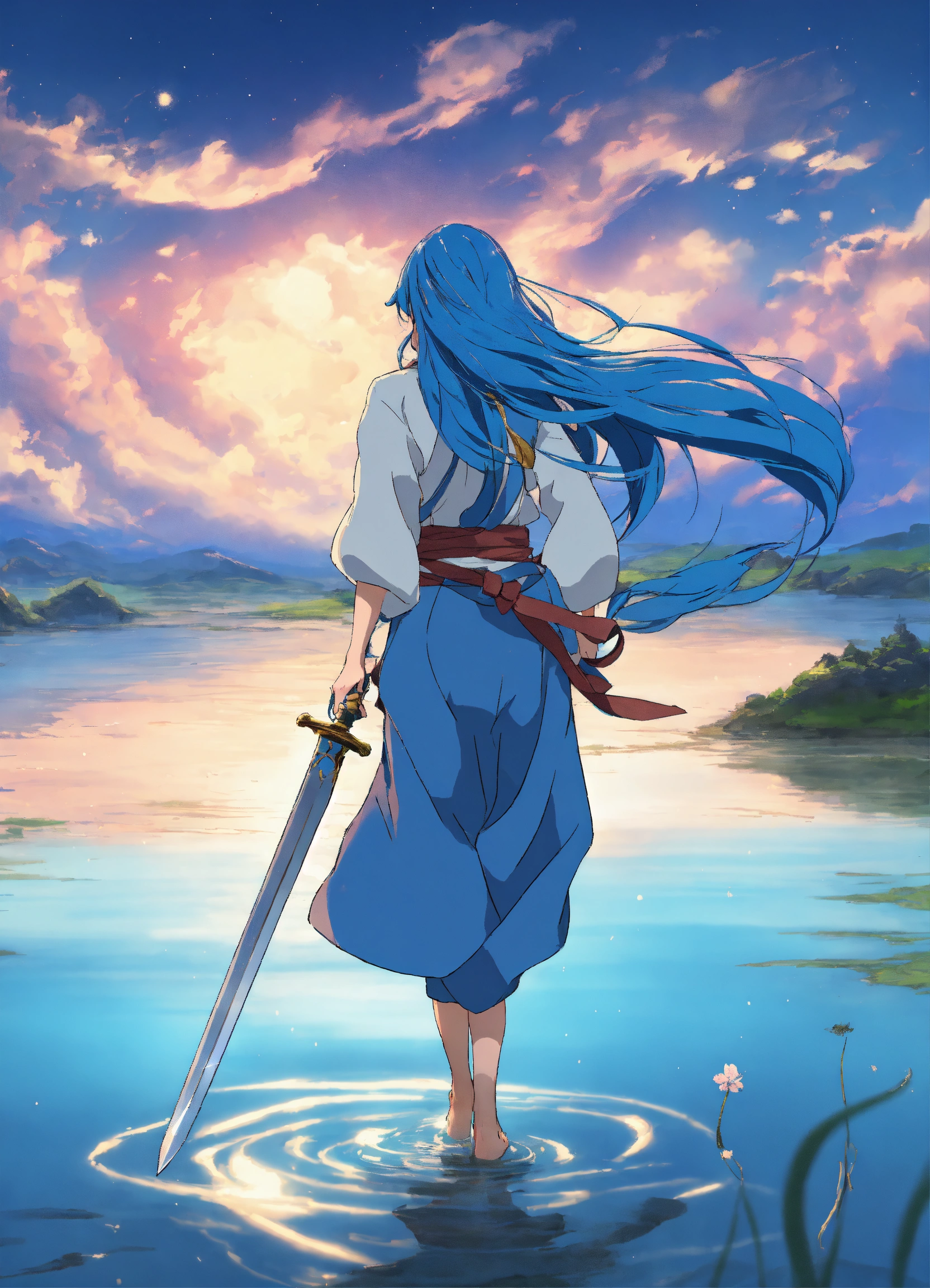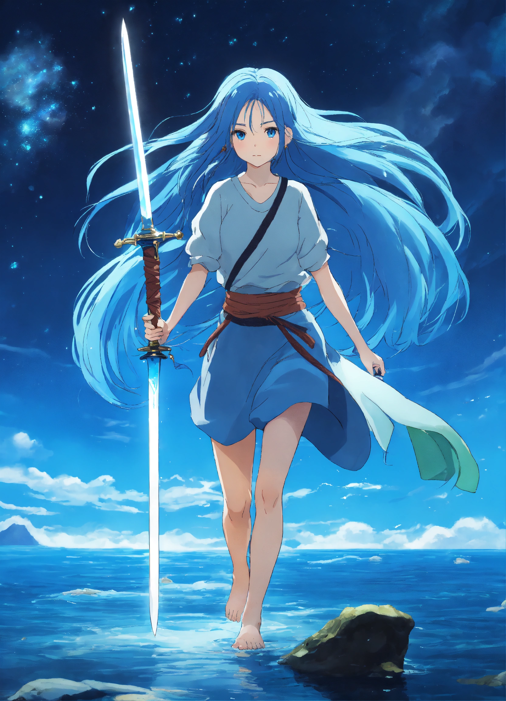 Woman front view, studio ghibli, long blue hair, shining blue eyes, galaxy, hair in the wind, full body, walking on water, with a sword in hand 4k, hd