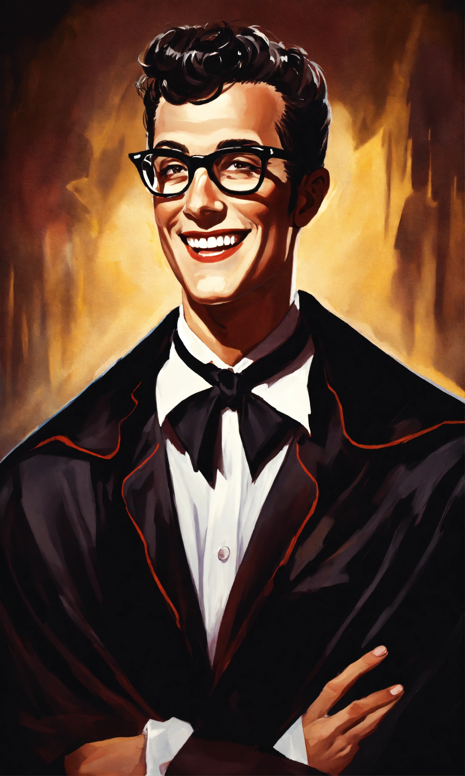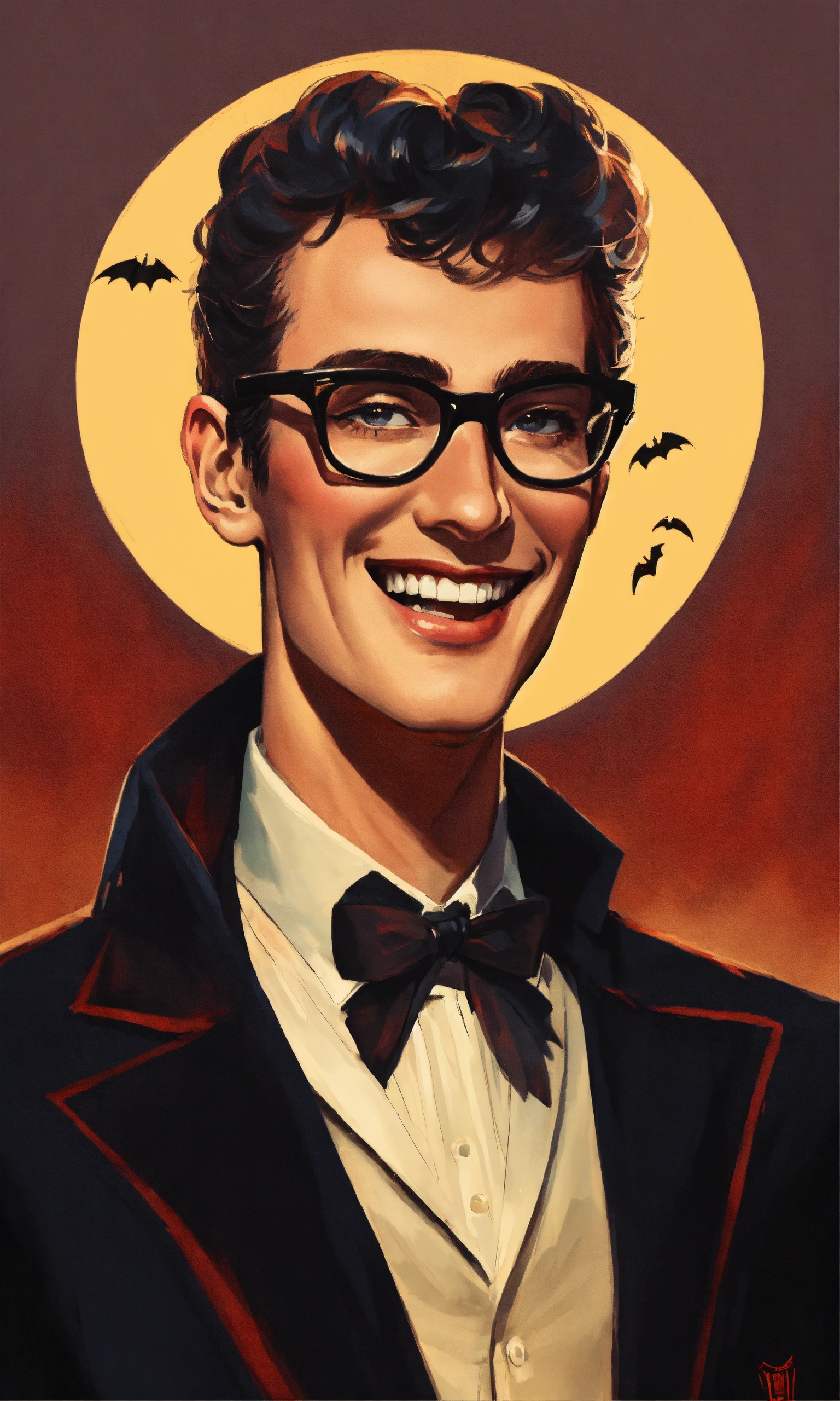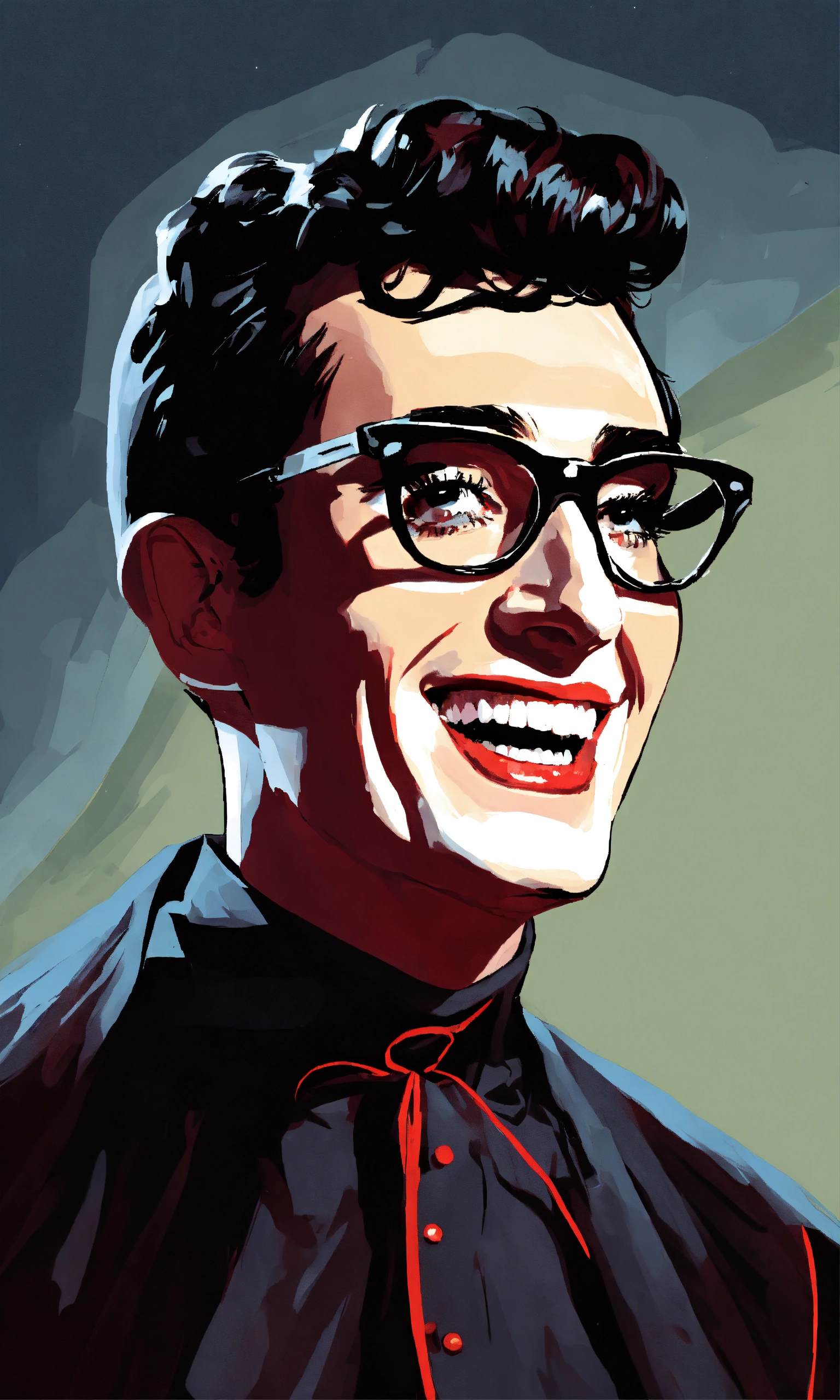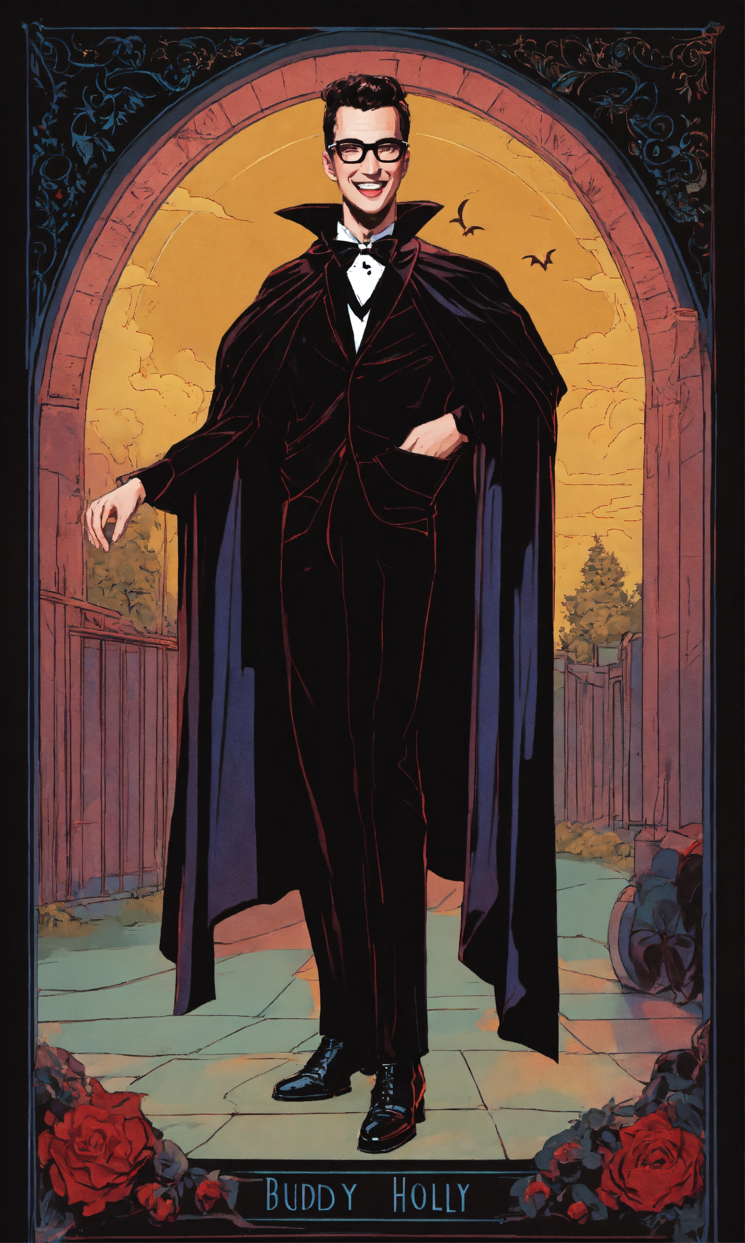 Buddy holly as a smiling vampire in a black cape with a large collar