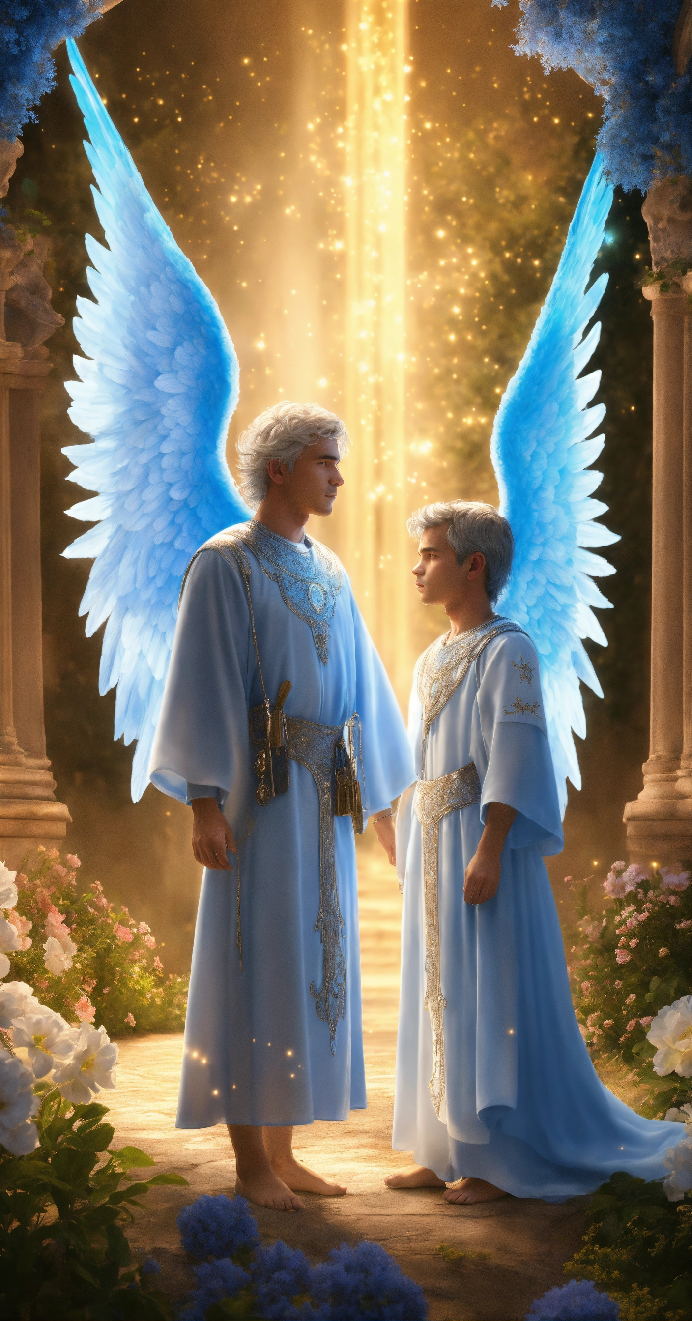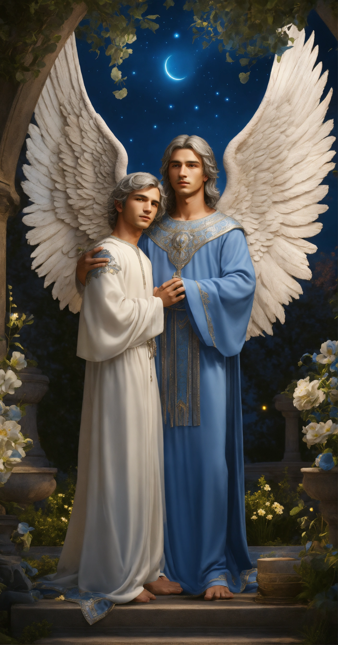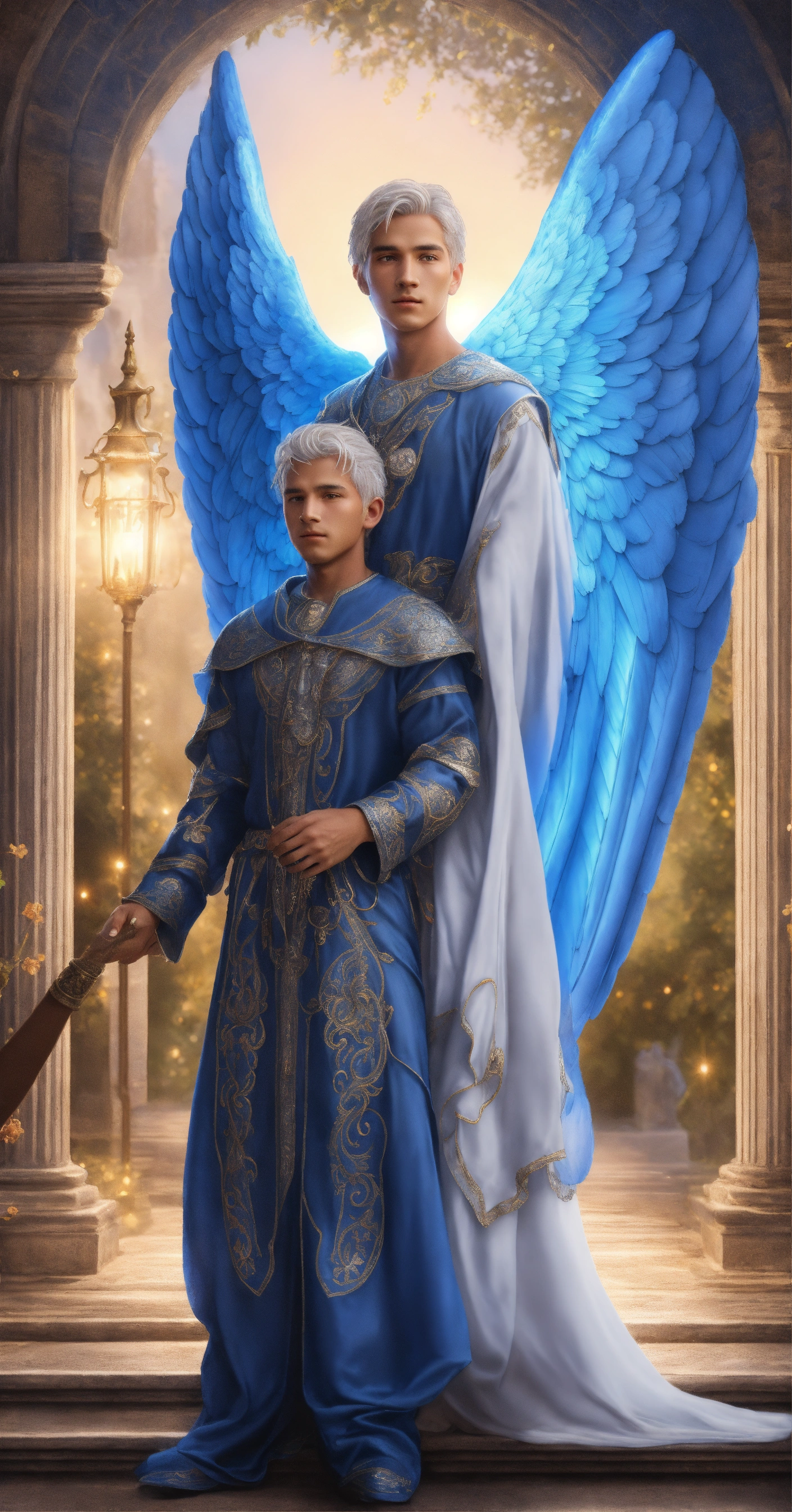 2 male guardian angels with detailed and luminous blue angel wings. 1 30-year-old male angel protecting a 9-year-old male angel child. the 2 male angels have large, uniform luminous blue wings. their faces beautiful and detailed. very clear eyes that open with a deep and penetrating look. detailed and manly short white hair. blue tunic-type dresses with many silver details. they are in a beautiful, detailed garden with a night sky. hyper-detailed, hyper-realistic illustration. realism. masterpiece. digital art, hd, high quality. high definition, high definition. 8k.