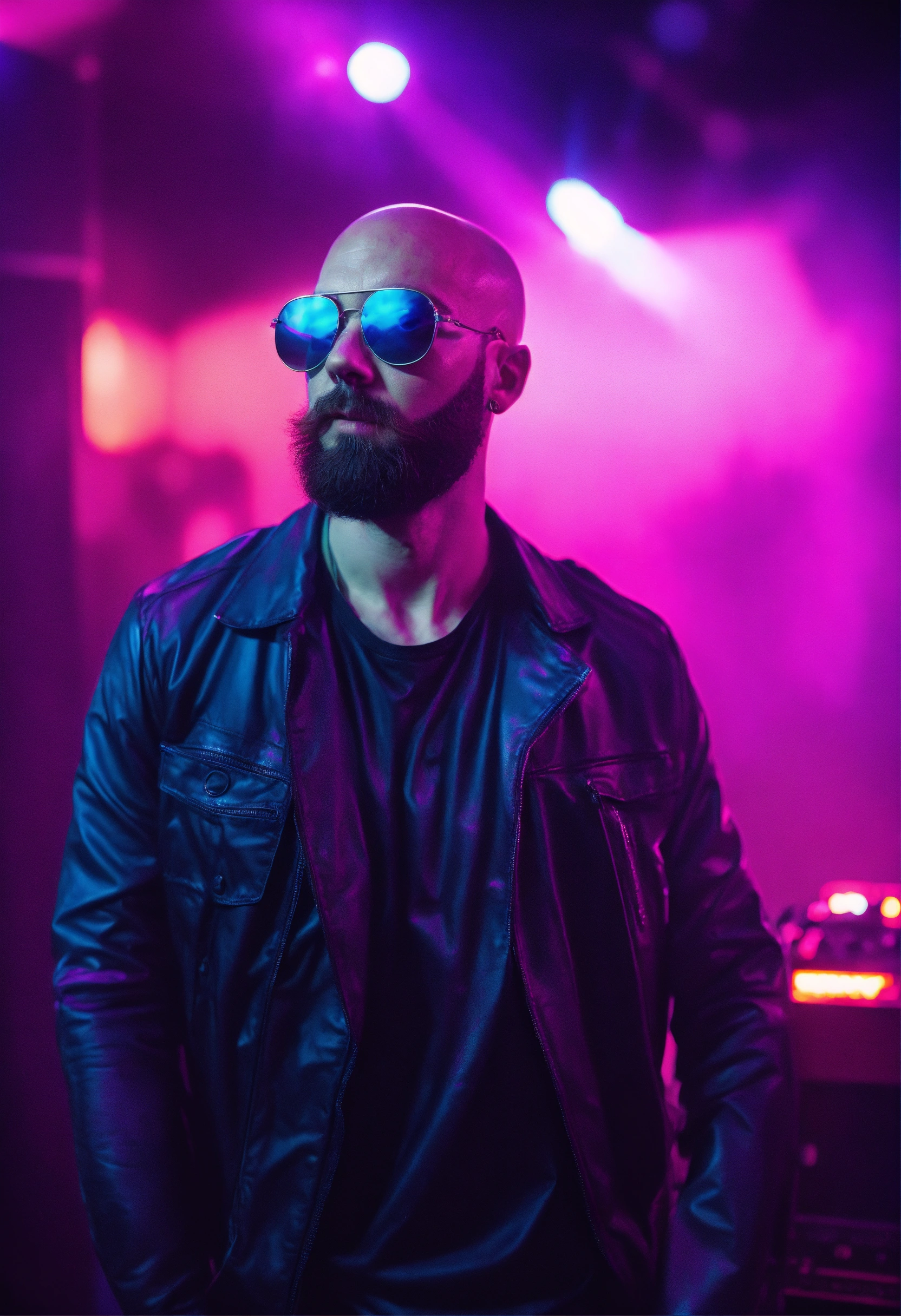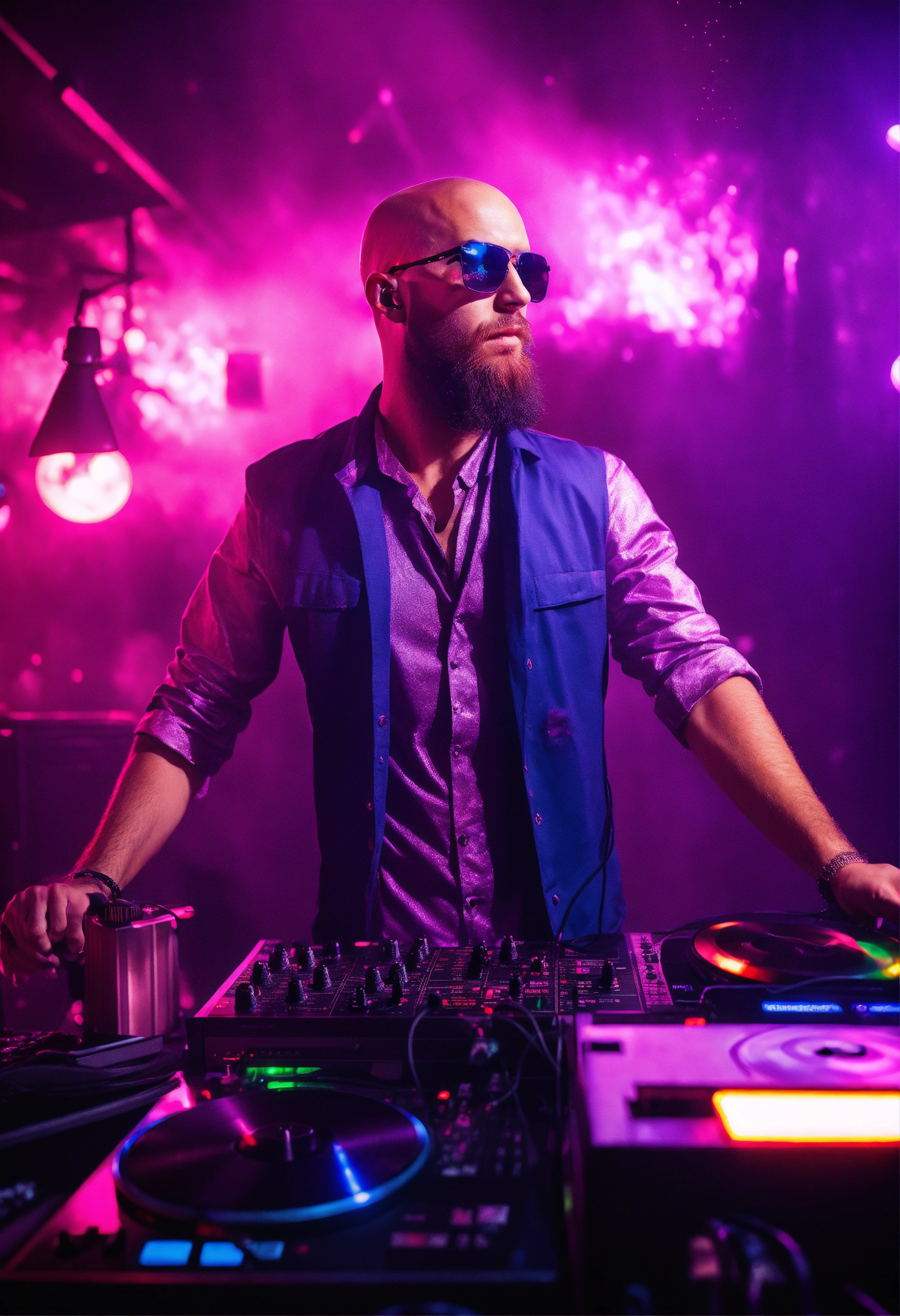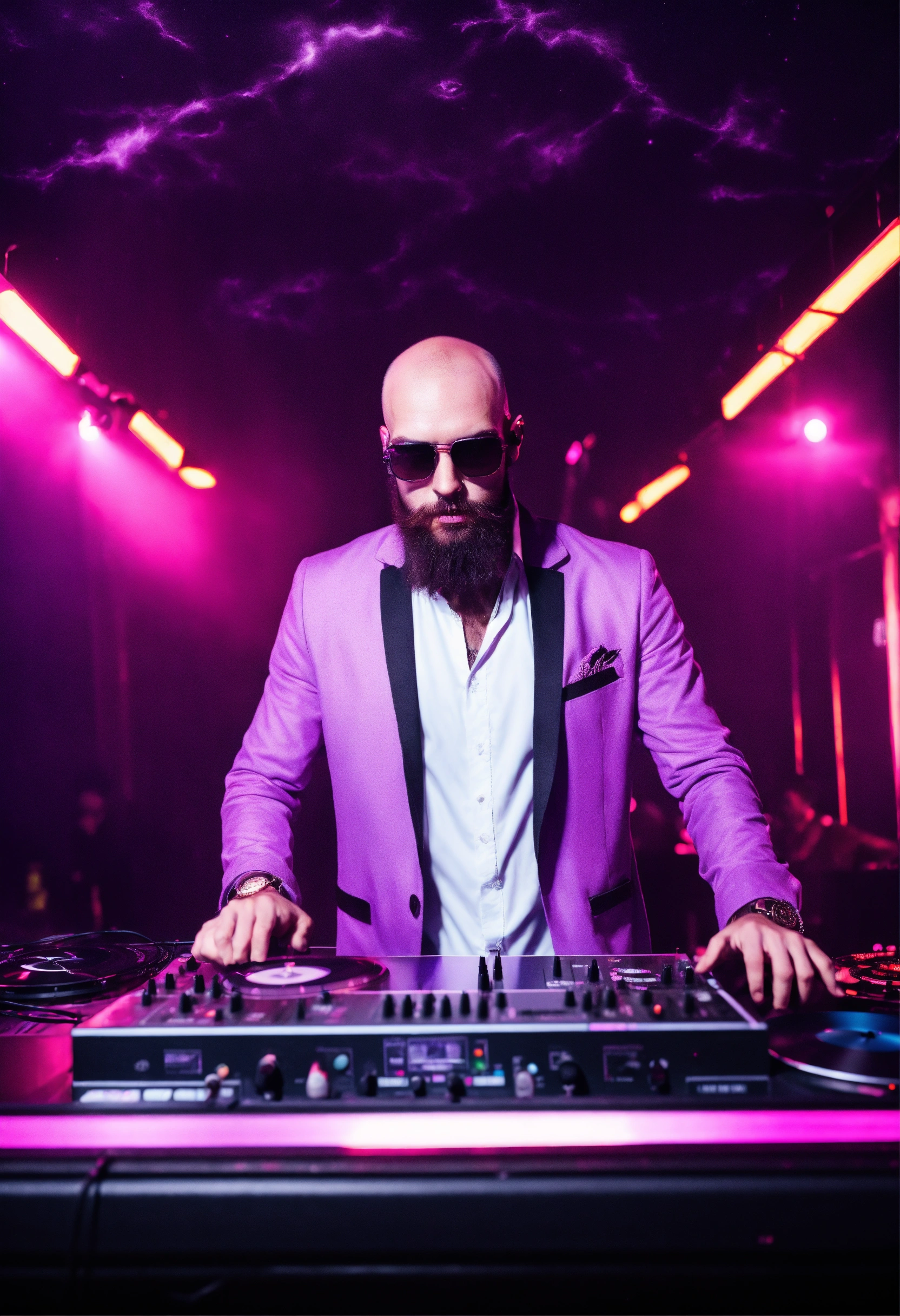 A young bald man with beard haunted disco night club during halloween at night, behind a dj booth large speakers boom edm lightning haze exudes a sense of power and confidence. the muted pink & purple bokeh of the synthopia background only add to her captivating presence. zombie party people remove sunglasses, remove glasses