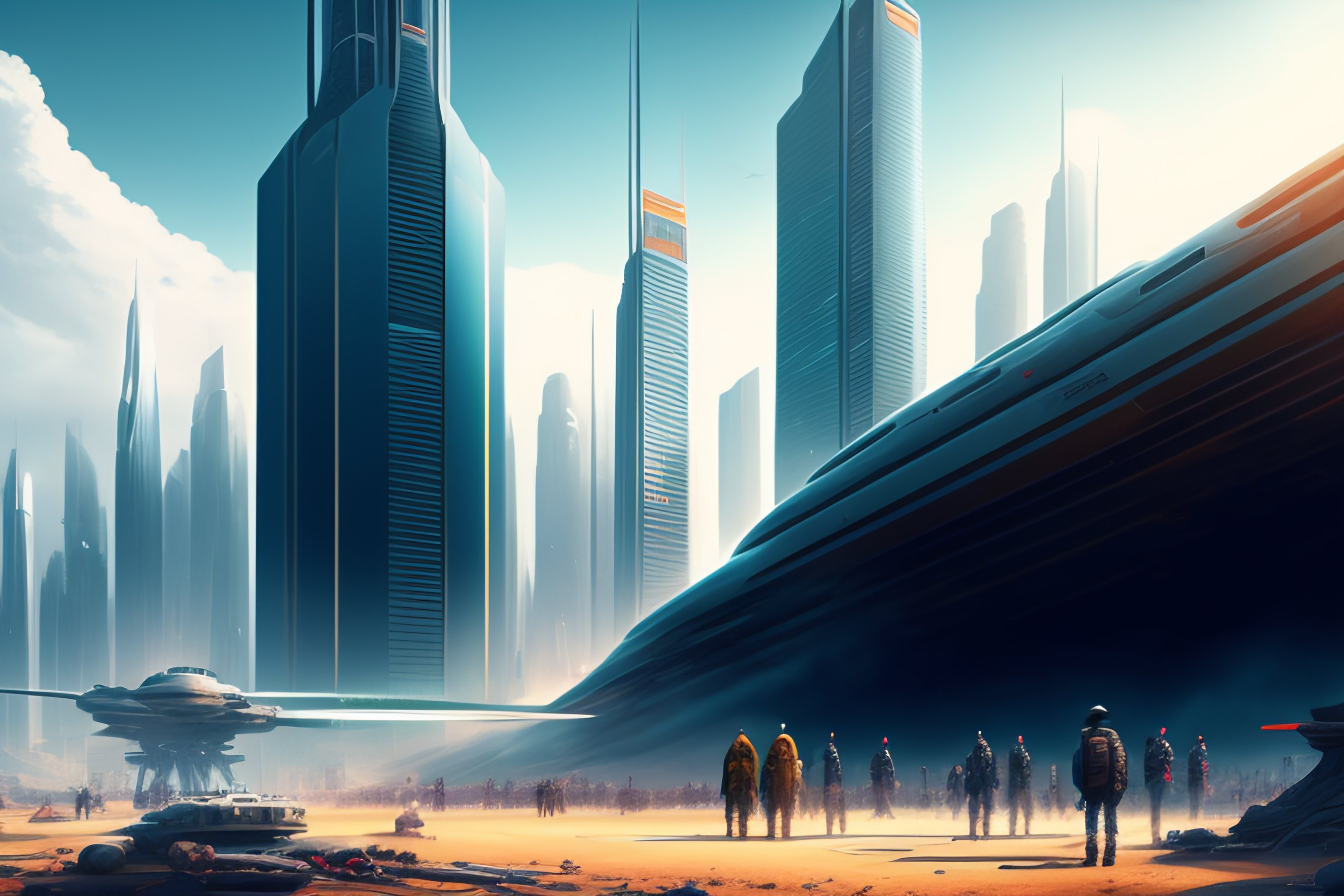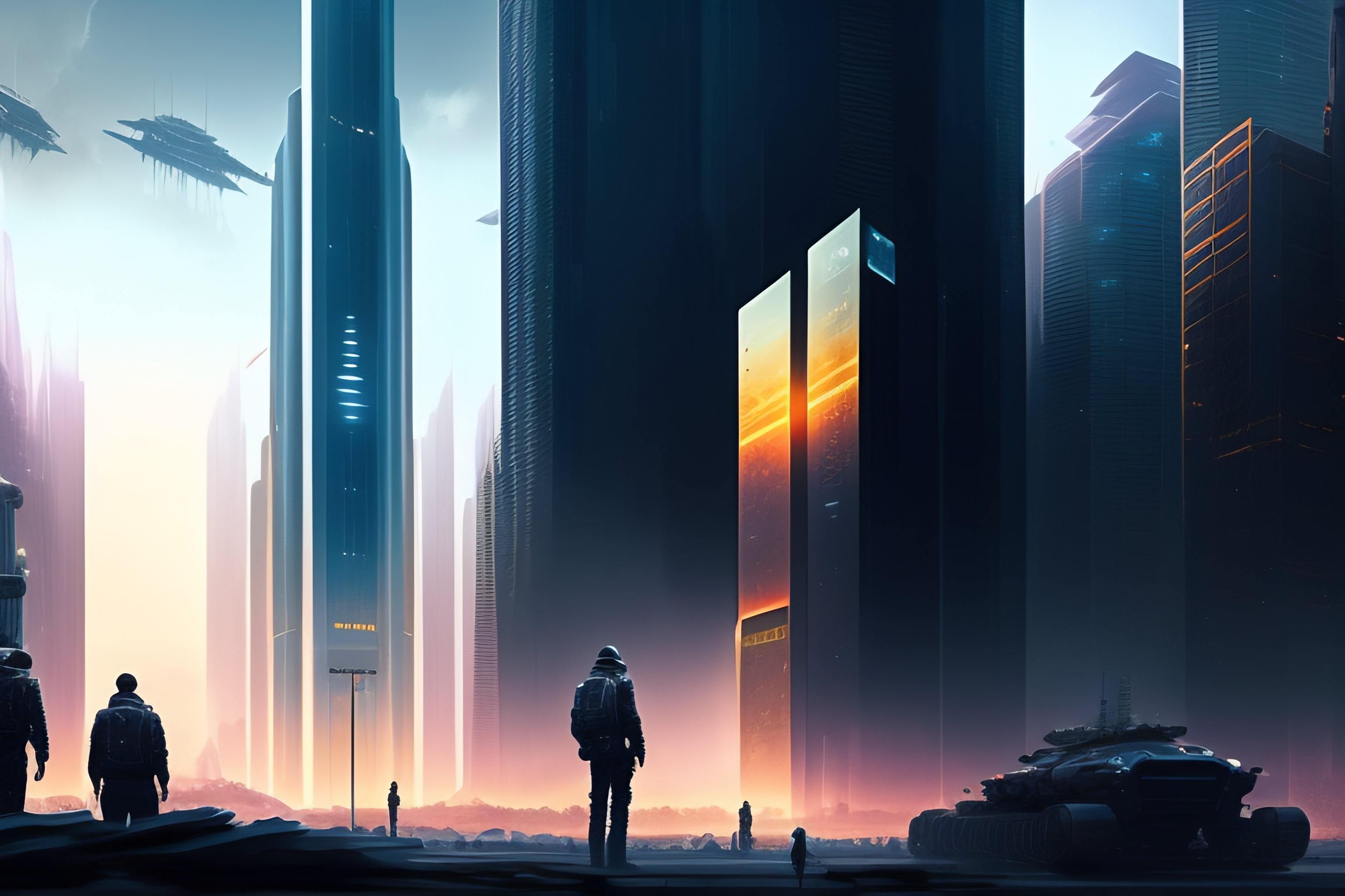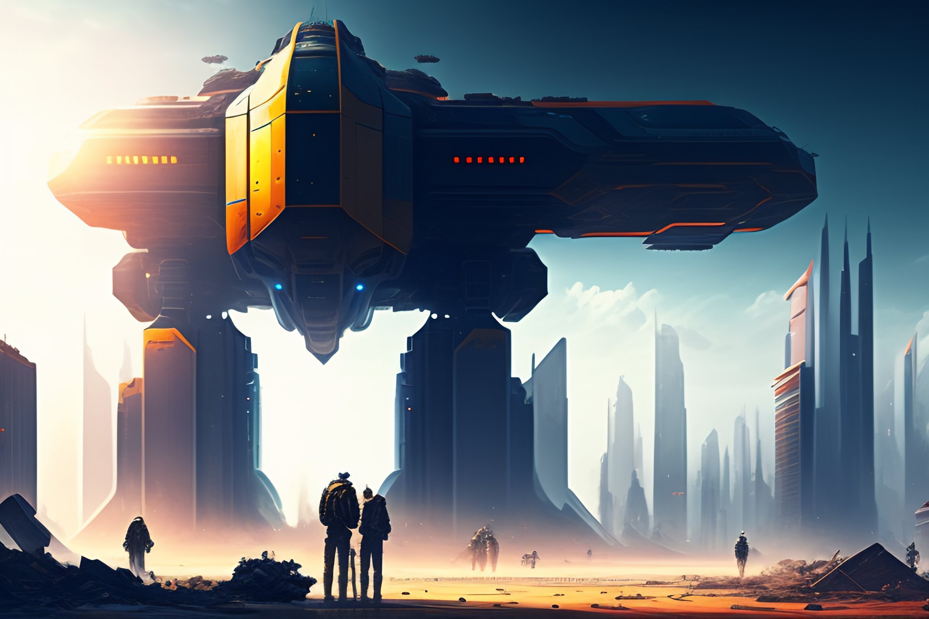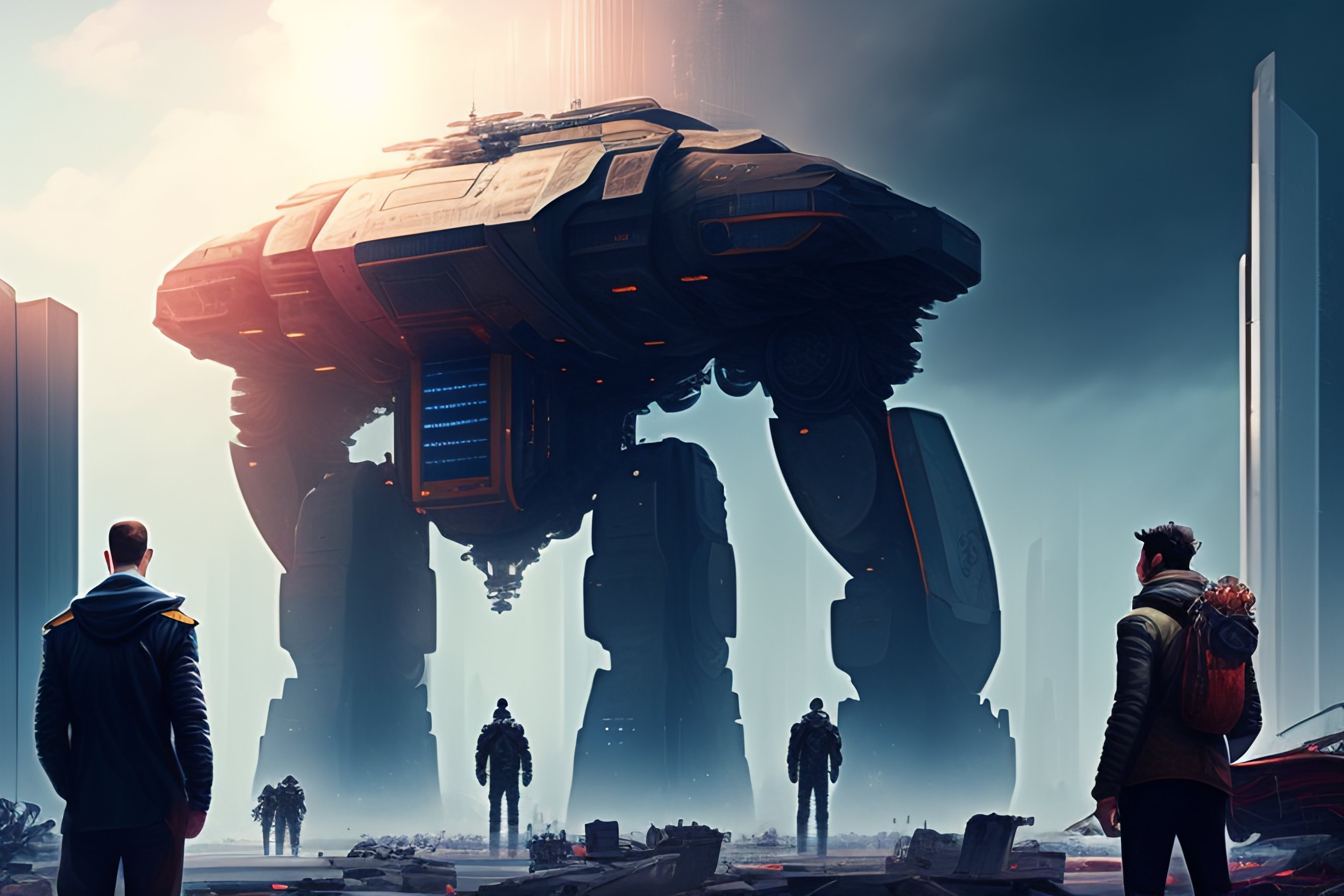 Scifi scene people looking at giant robot standing destroyed city digital art illustration, highly detailed