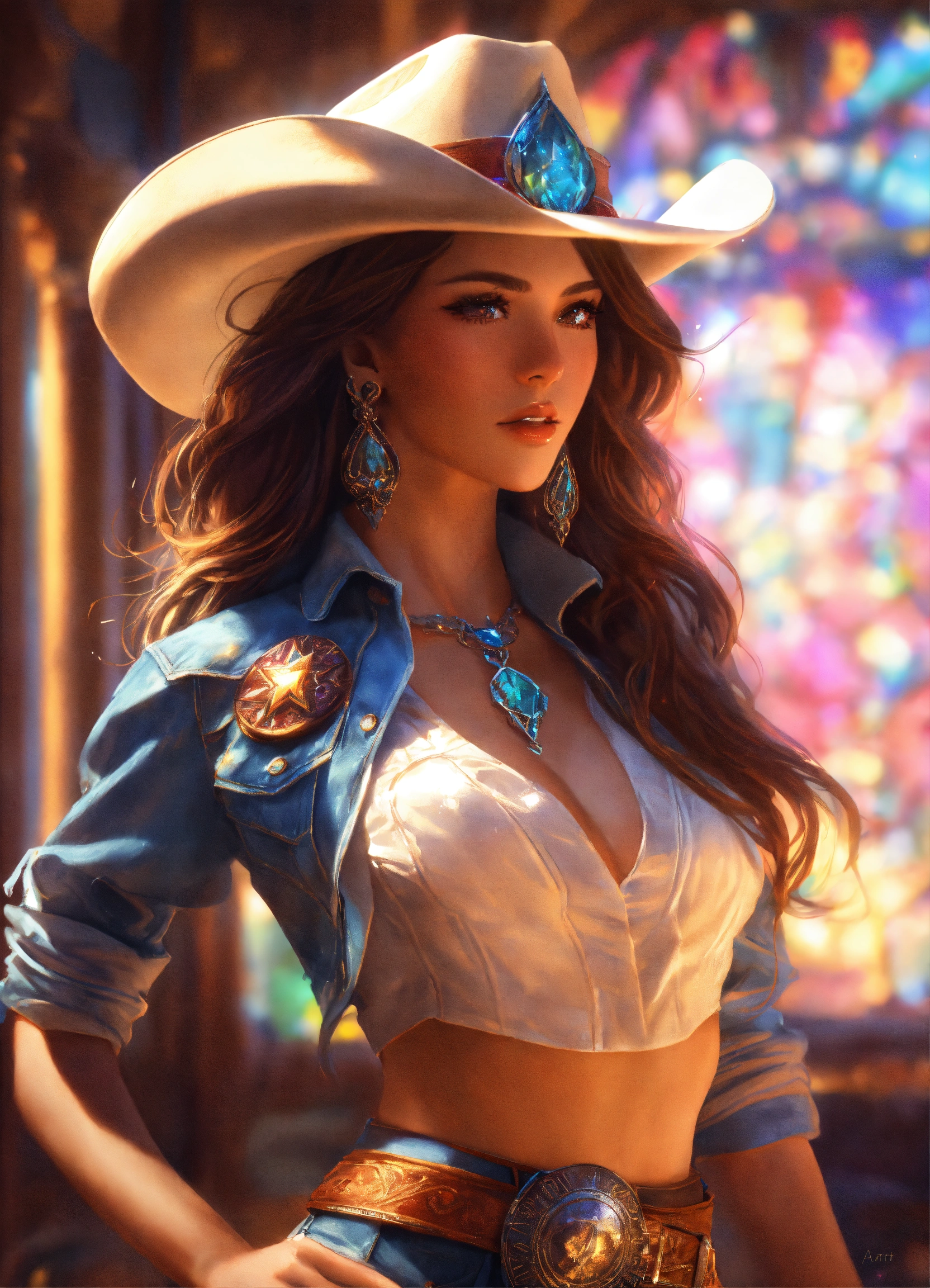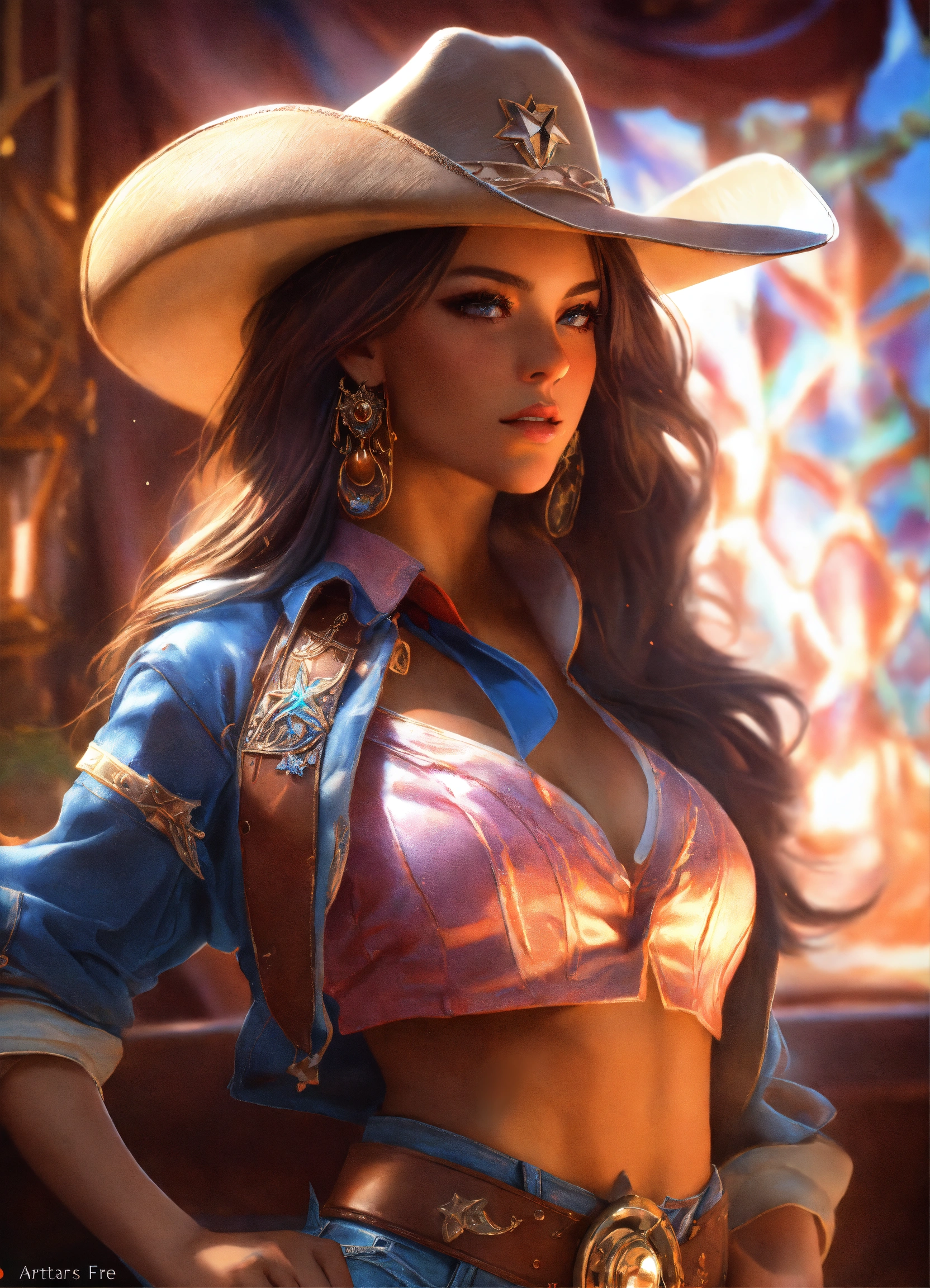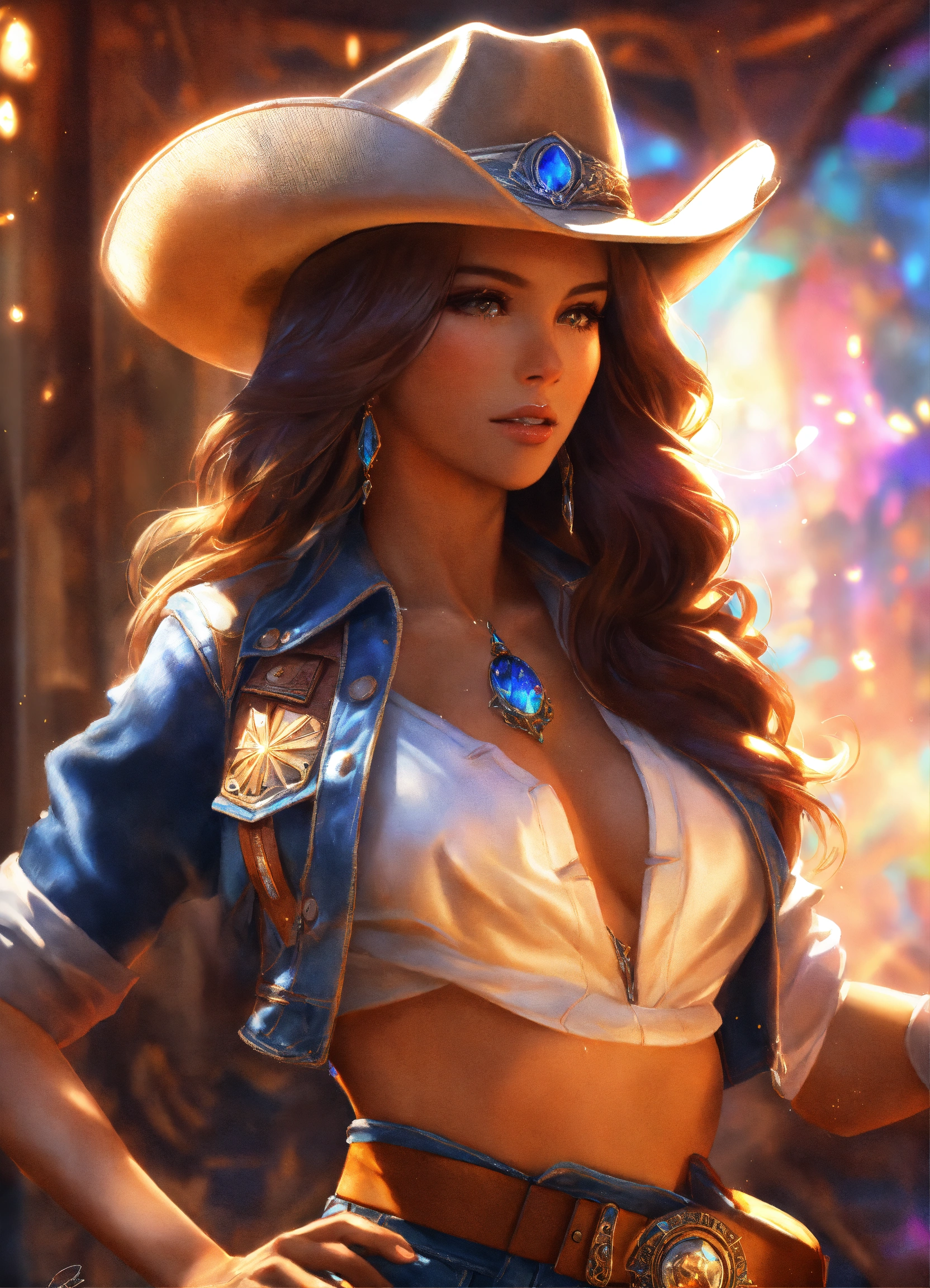 A southern beauty queen wearing a denim wild west outfit and cowboy hat. by artgerm, intricate detail, trending on artstation, 8k, fluid motion, stunning shading. masterpiece, splash, sailor mars, full portrait, starlight gas atmosphere background, ethereal, luminous, filigree, liquid fire, translucency aura, slight glow, ultra details. alberto seveso, broken glass effect, no background, stunning, mythical being, energy, molecular, textures, iridescent and luminescent scales, volumetric light, auras, rays, vivid colors reflects