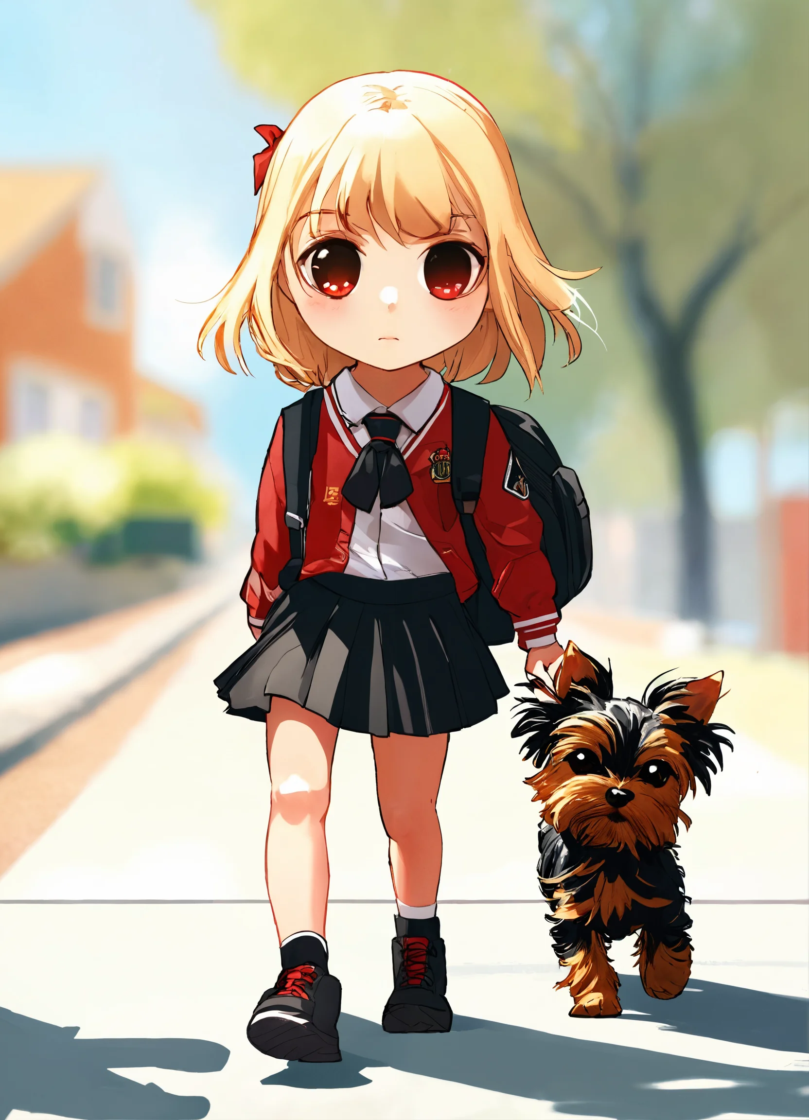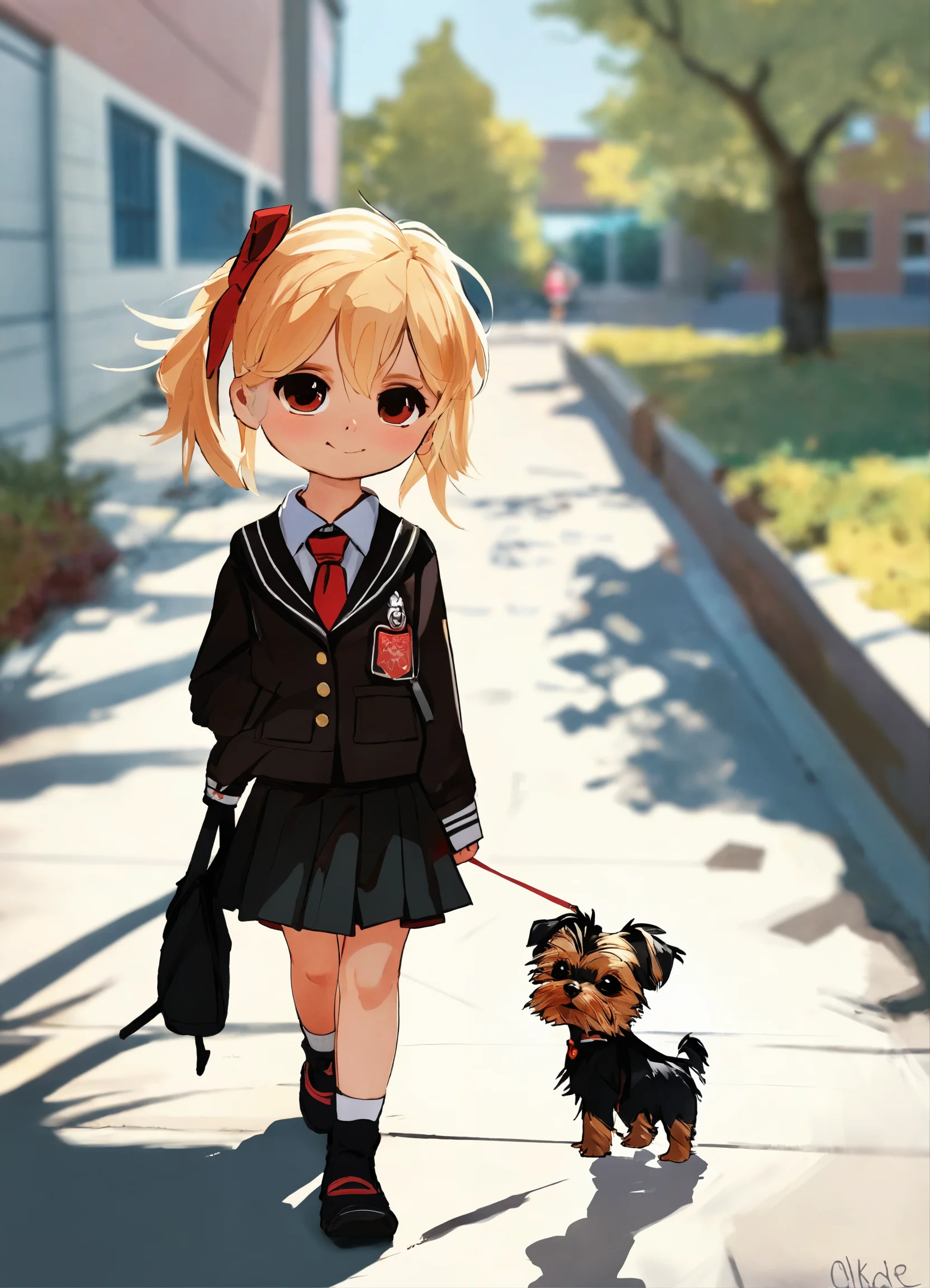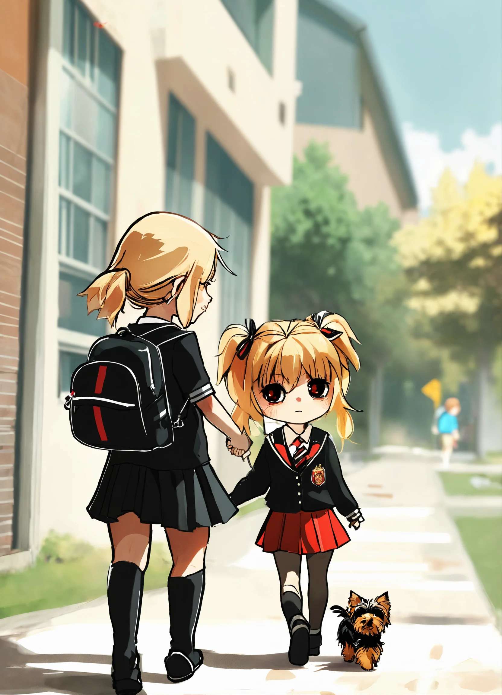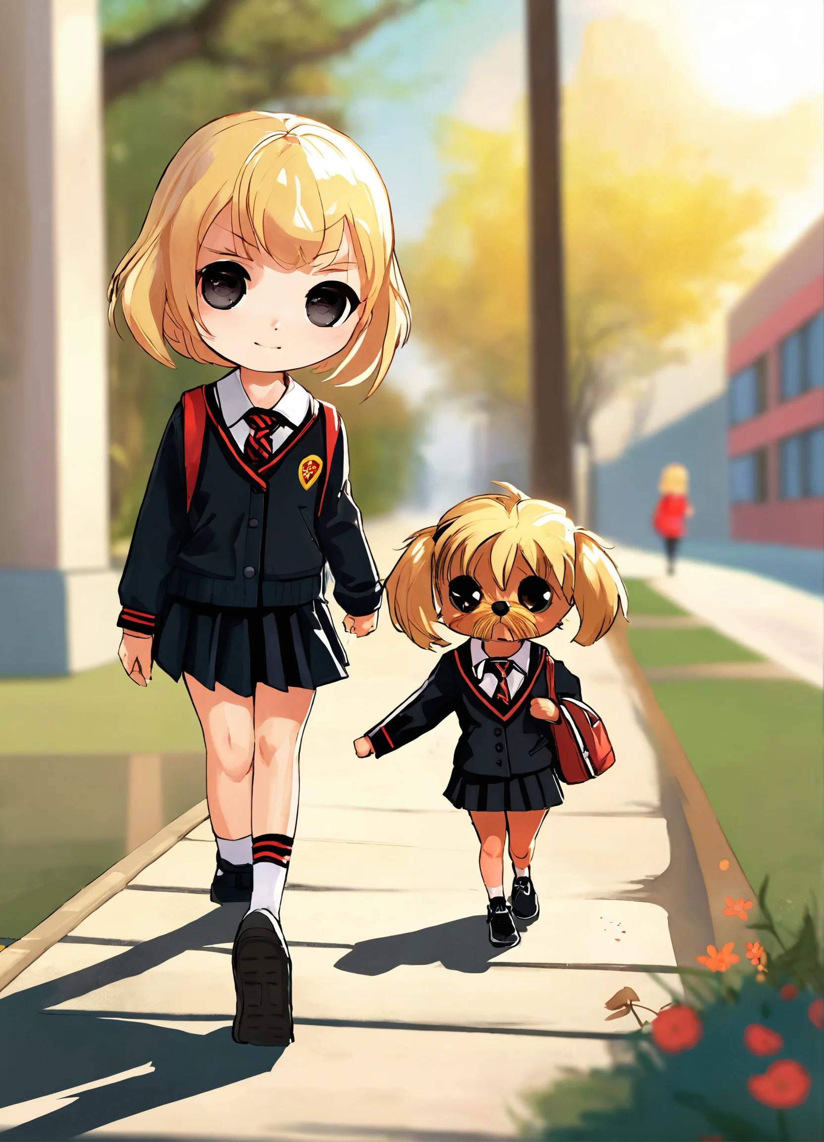 A chibi with blonde hair girl in her black and red school uniform walking to school on a sunny day with her small black yorkie walking behind her on the sidewalk