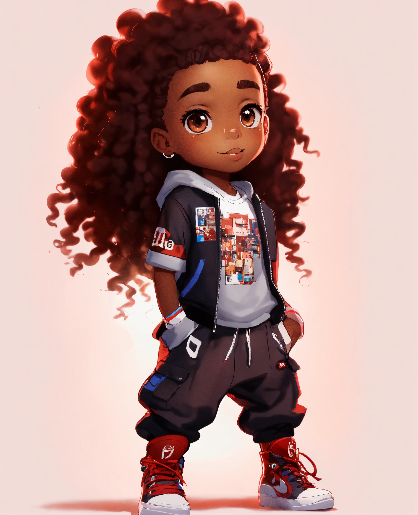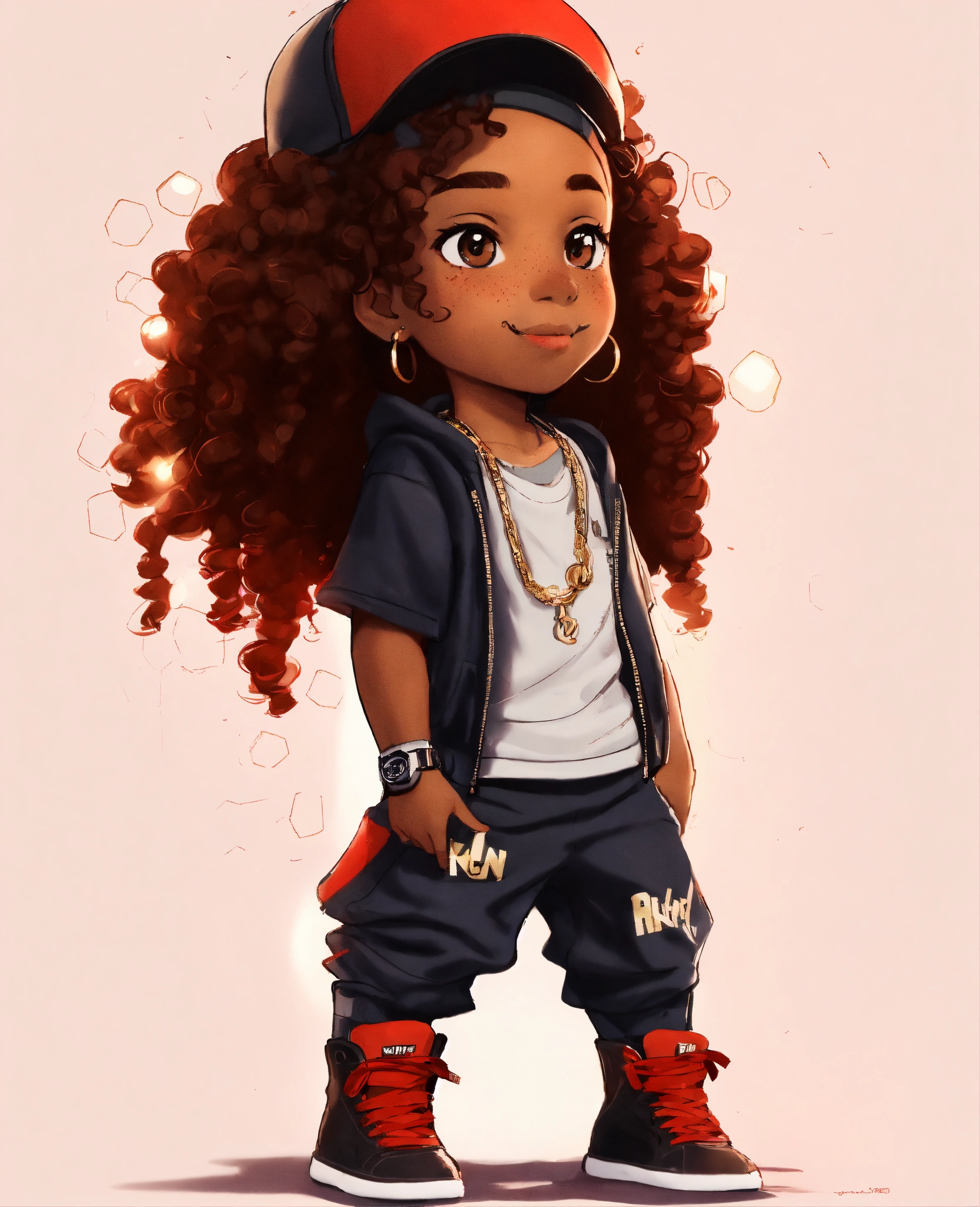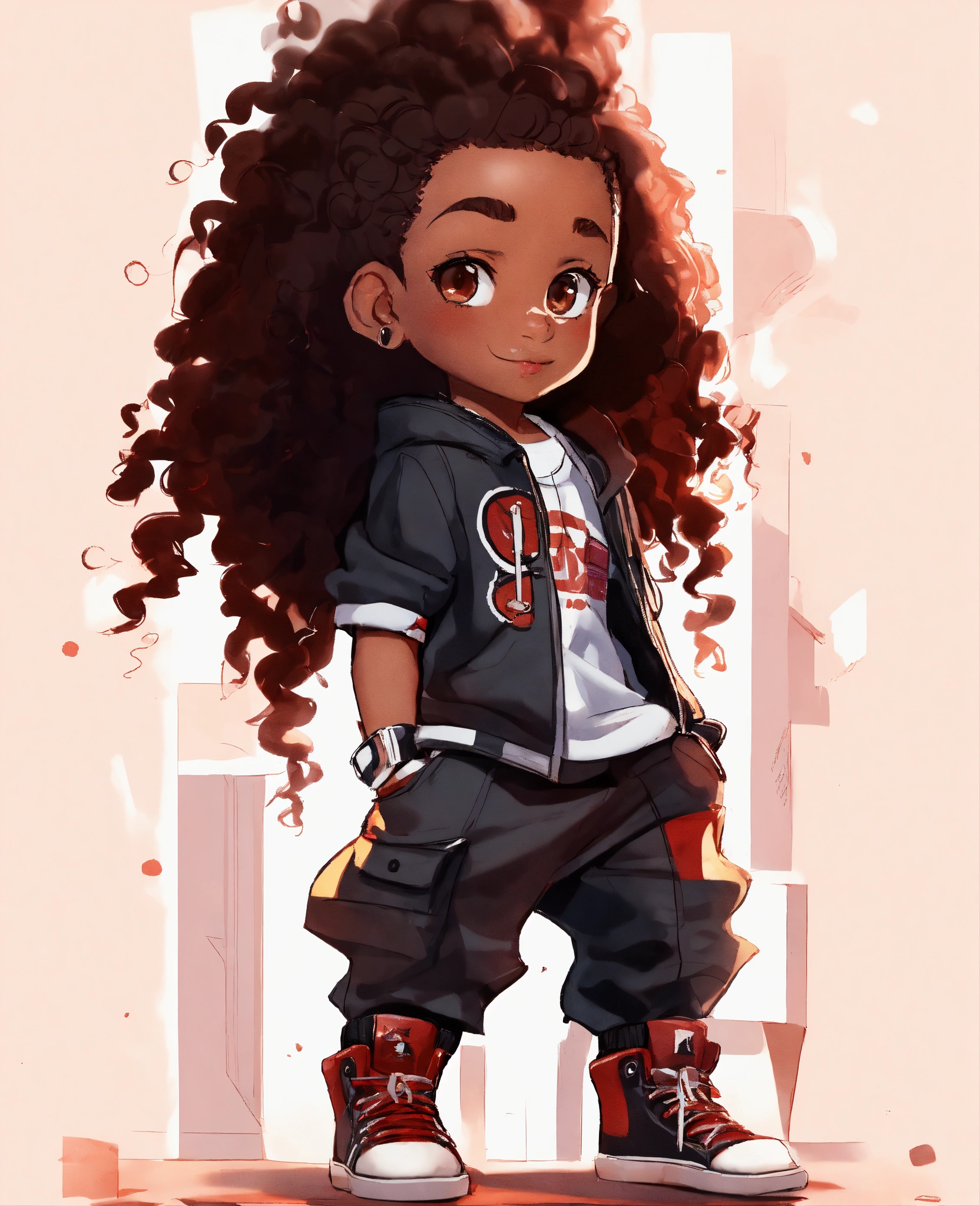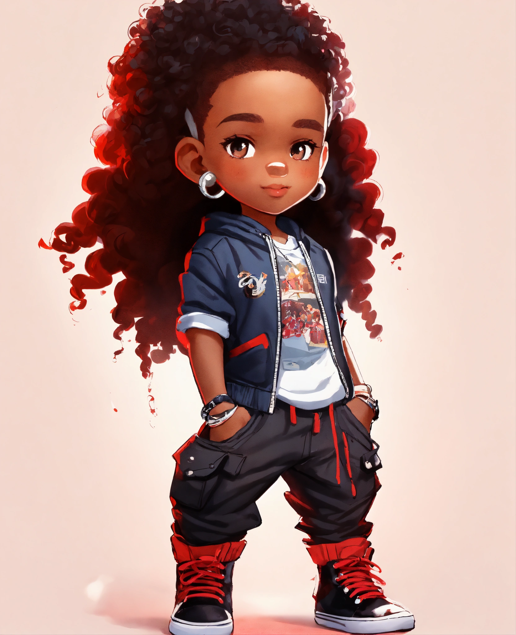 Adorably cute multiracial boy with melanin, wearing hip hop clothes full body pose, shiny curly hair, hazel eyes, brick background, 4k, high contrast elegant, centered, concept art, sharp focus, boy, realistic white and red pixar