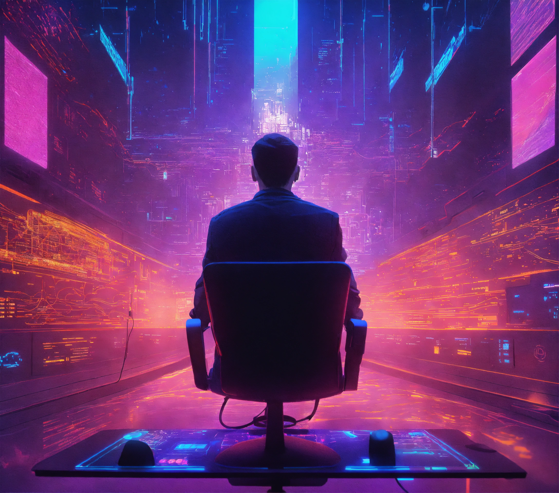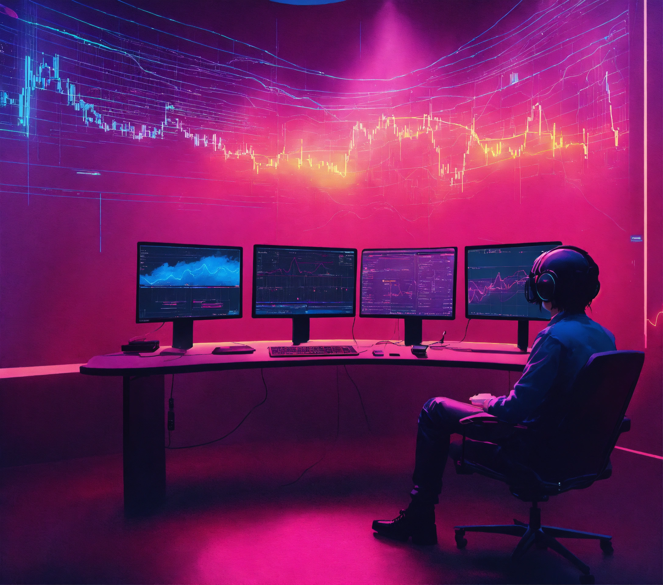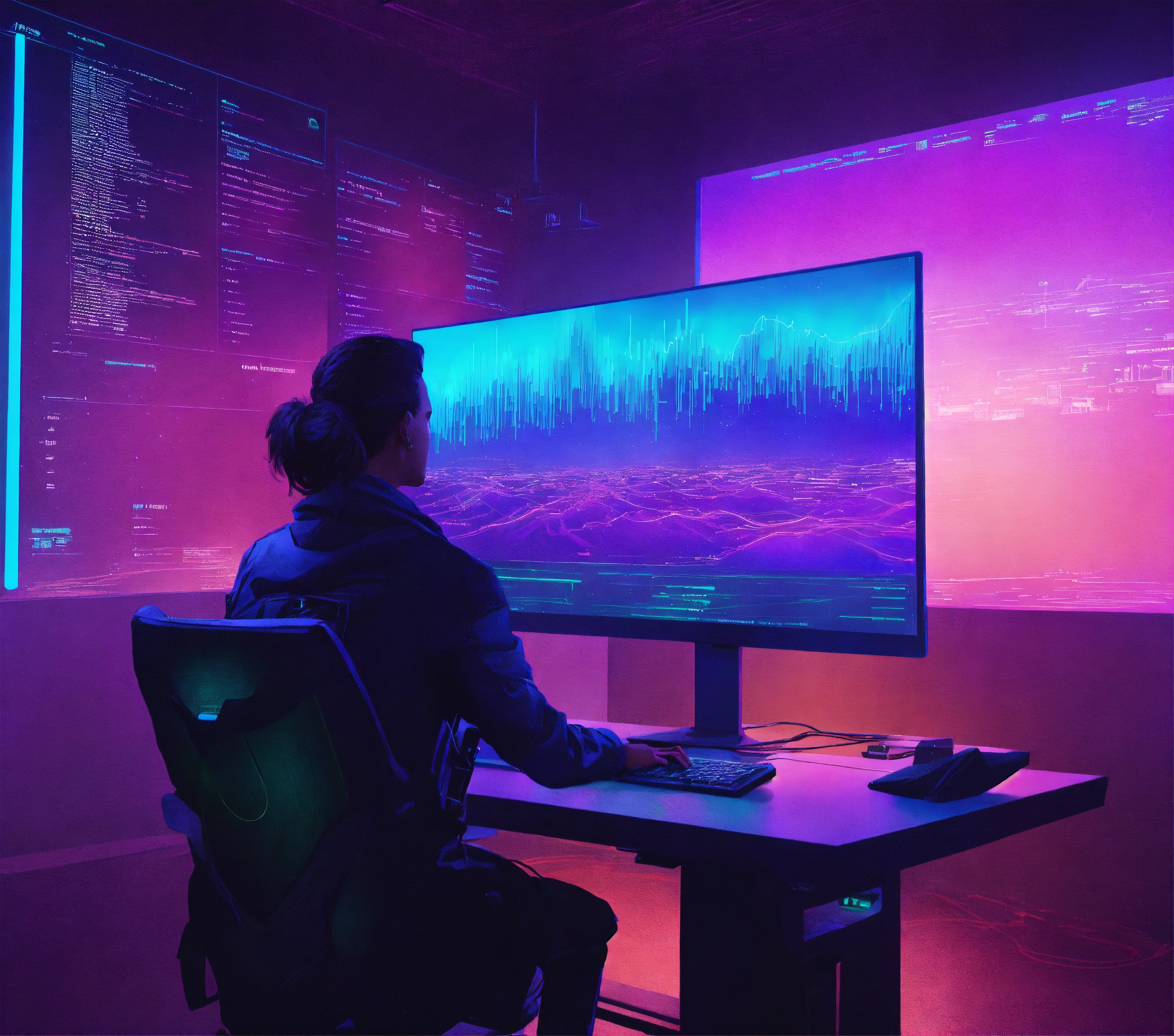 Back view of a futuristic chart on a computer, rsi trading, traveling through neons at the speed of light. 8k ultra hd, purple and electric blue haze, soft light, art by beksinski