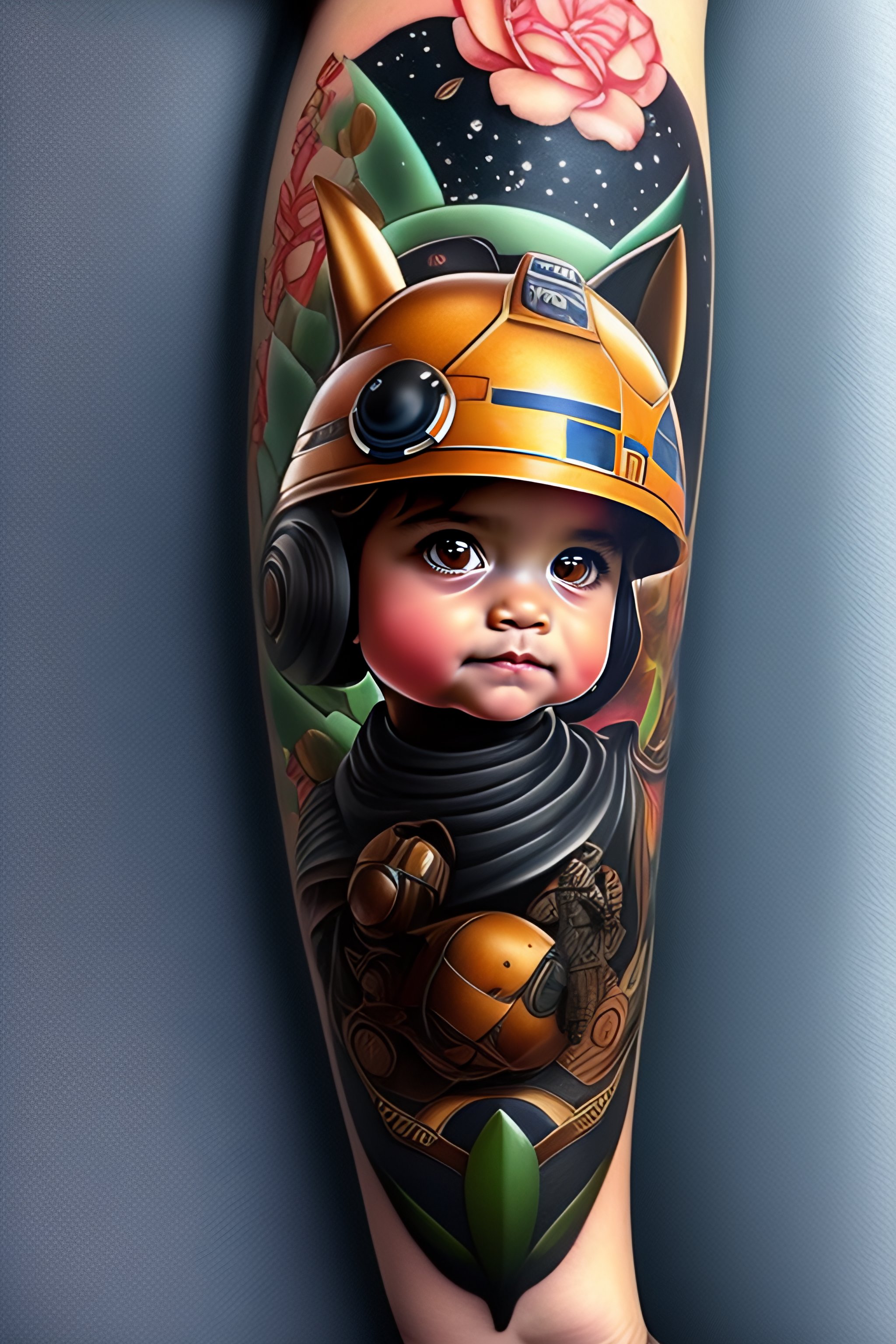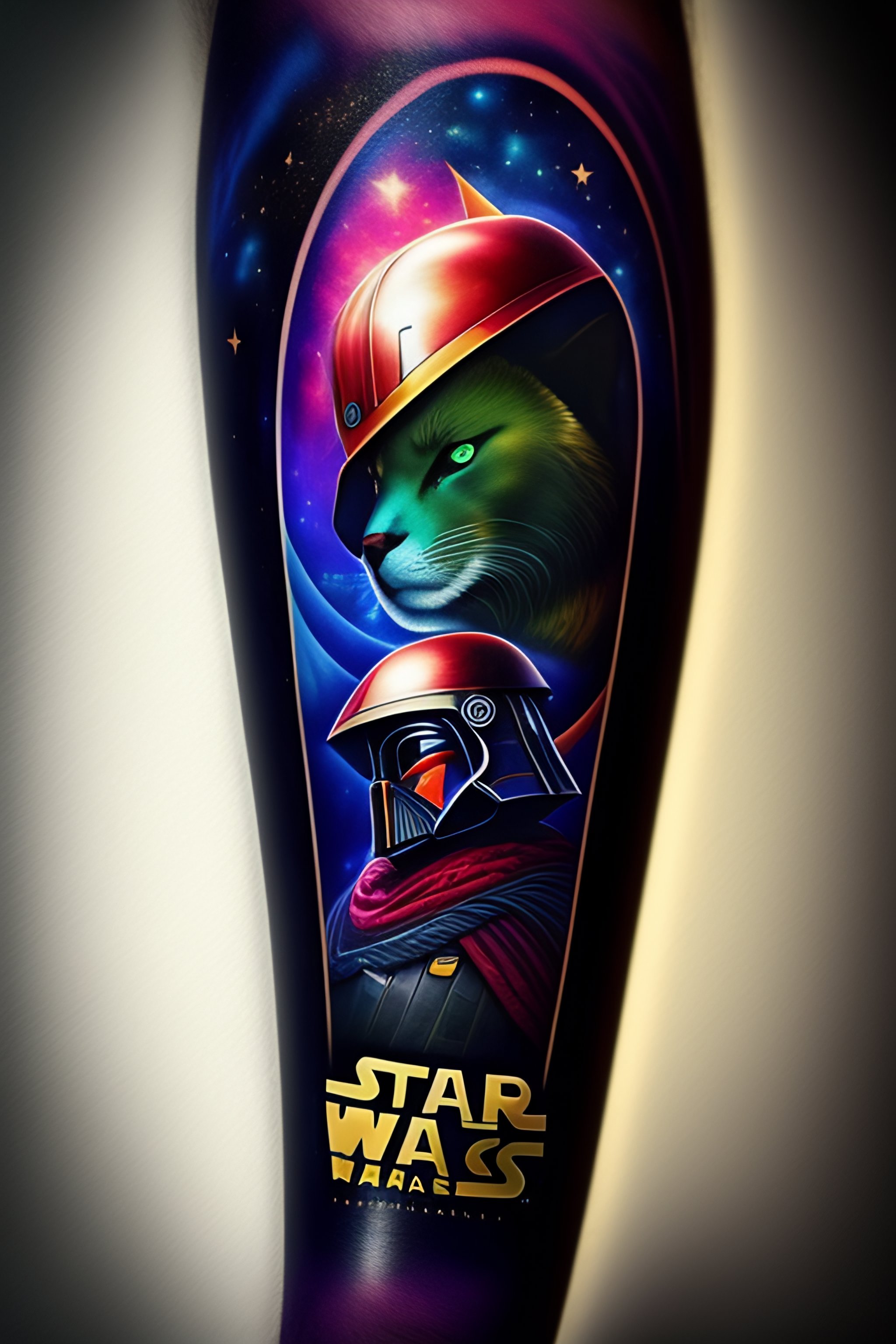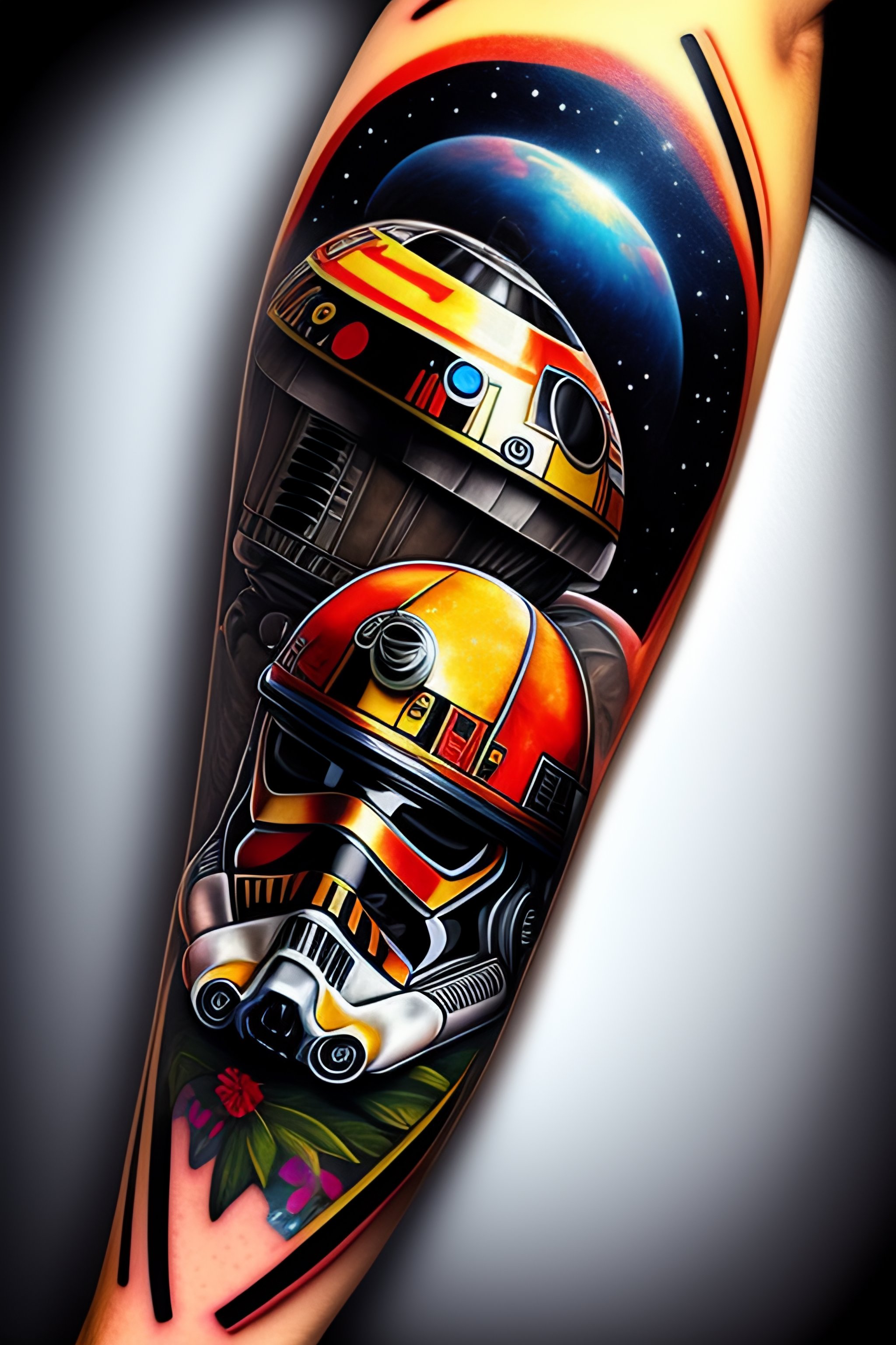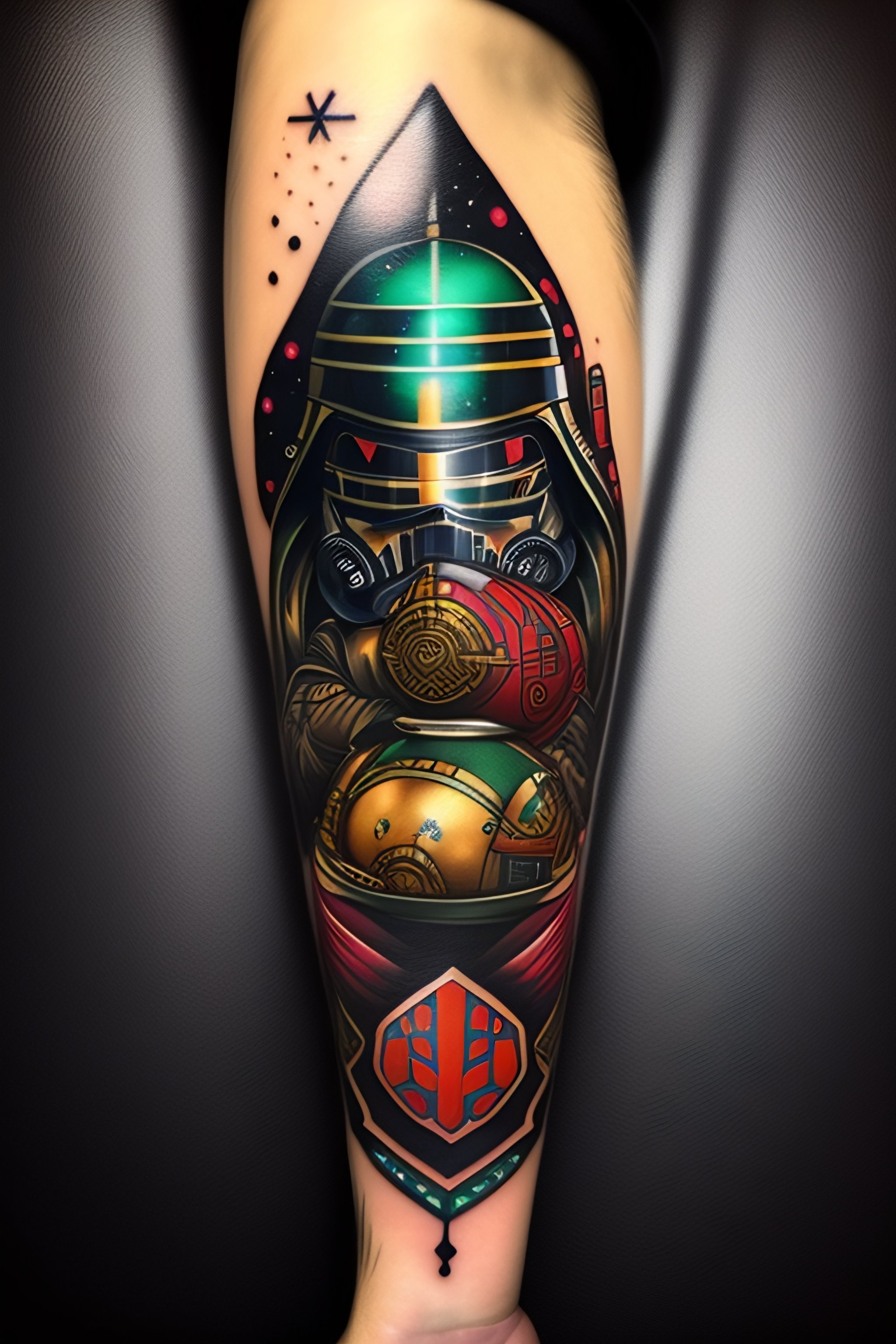 A mashup between star wars and pokemon themed design of a full arm tattoo
