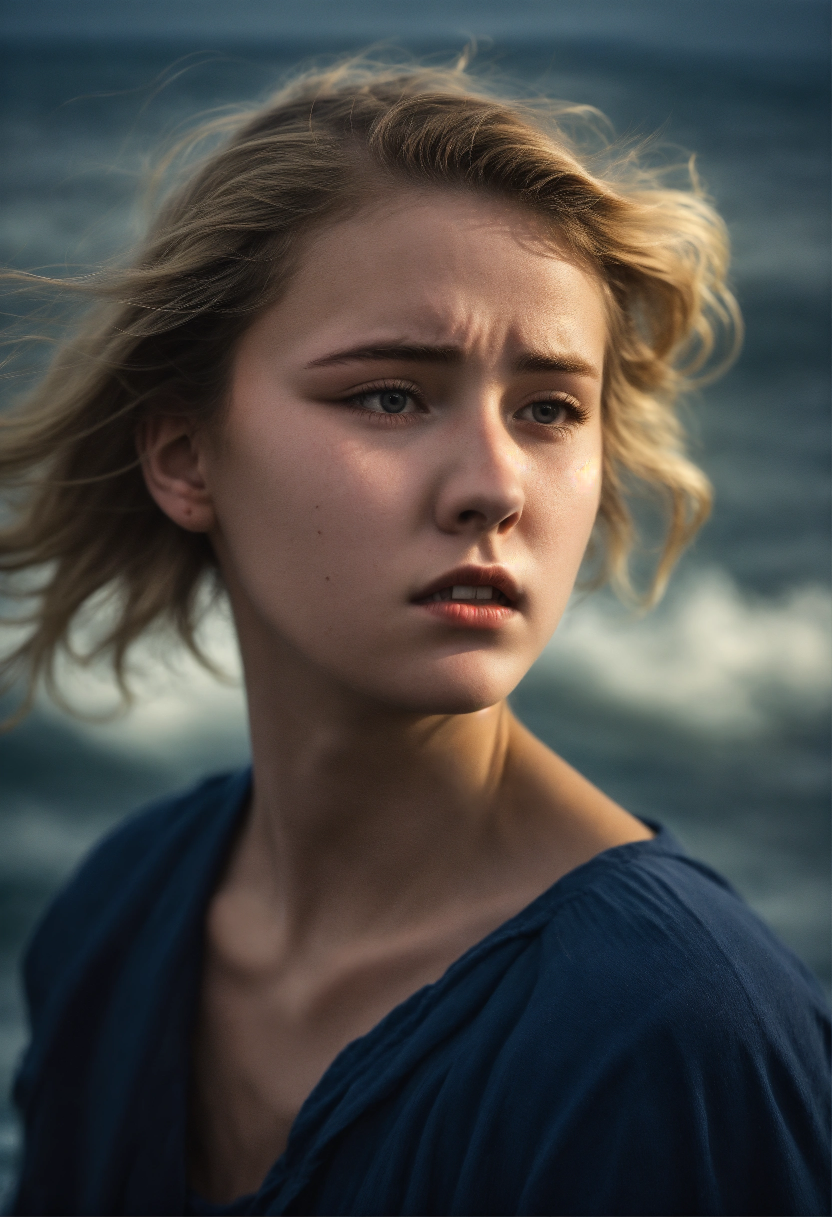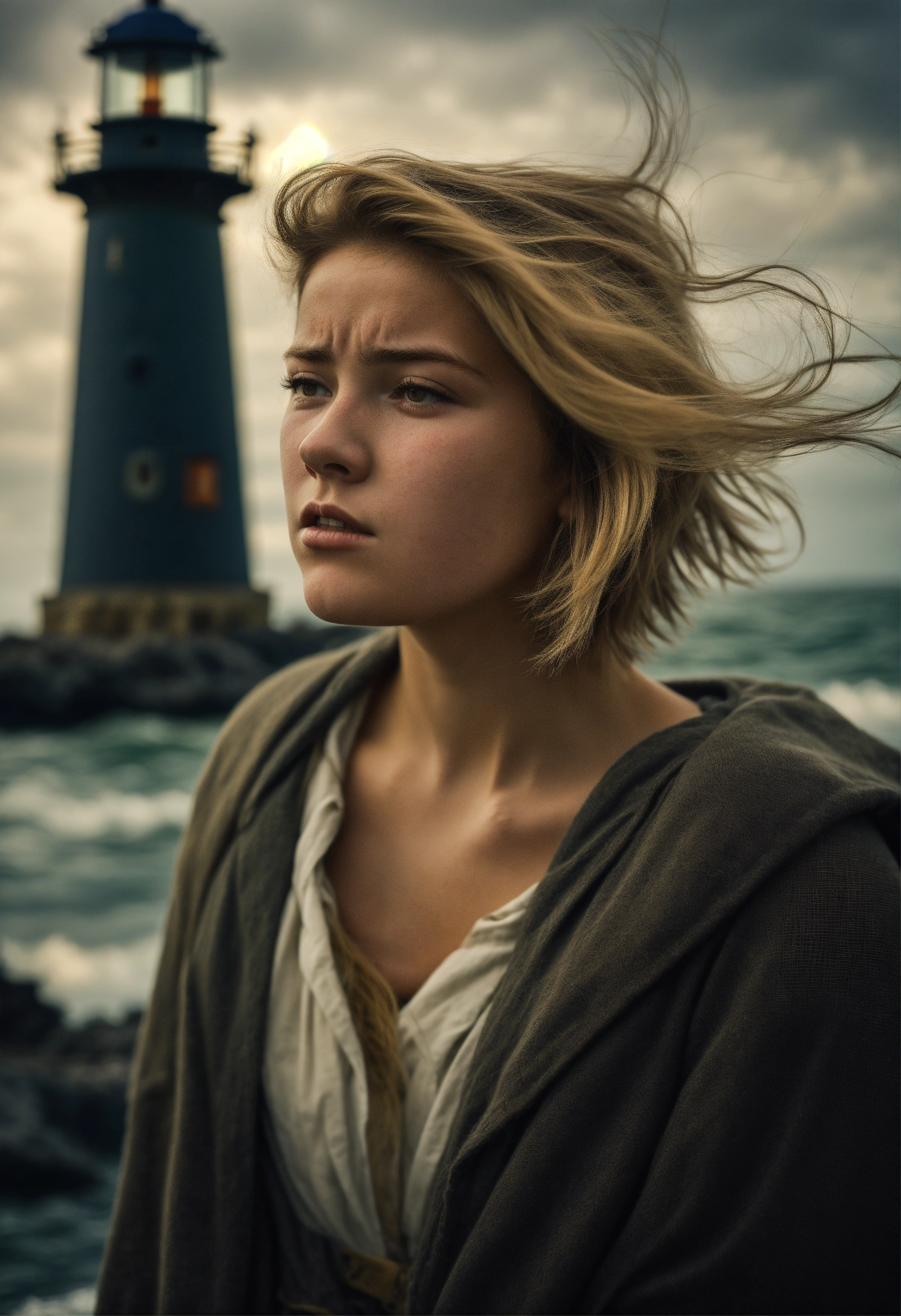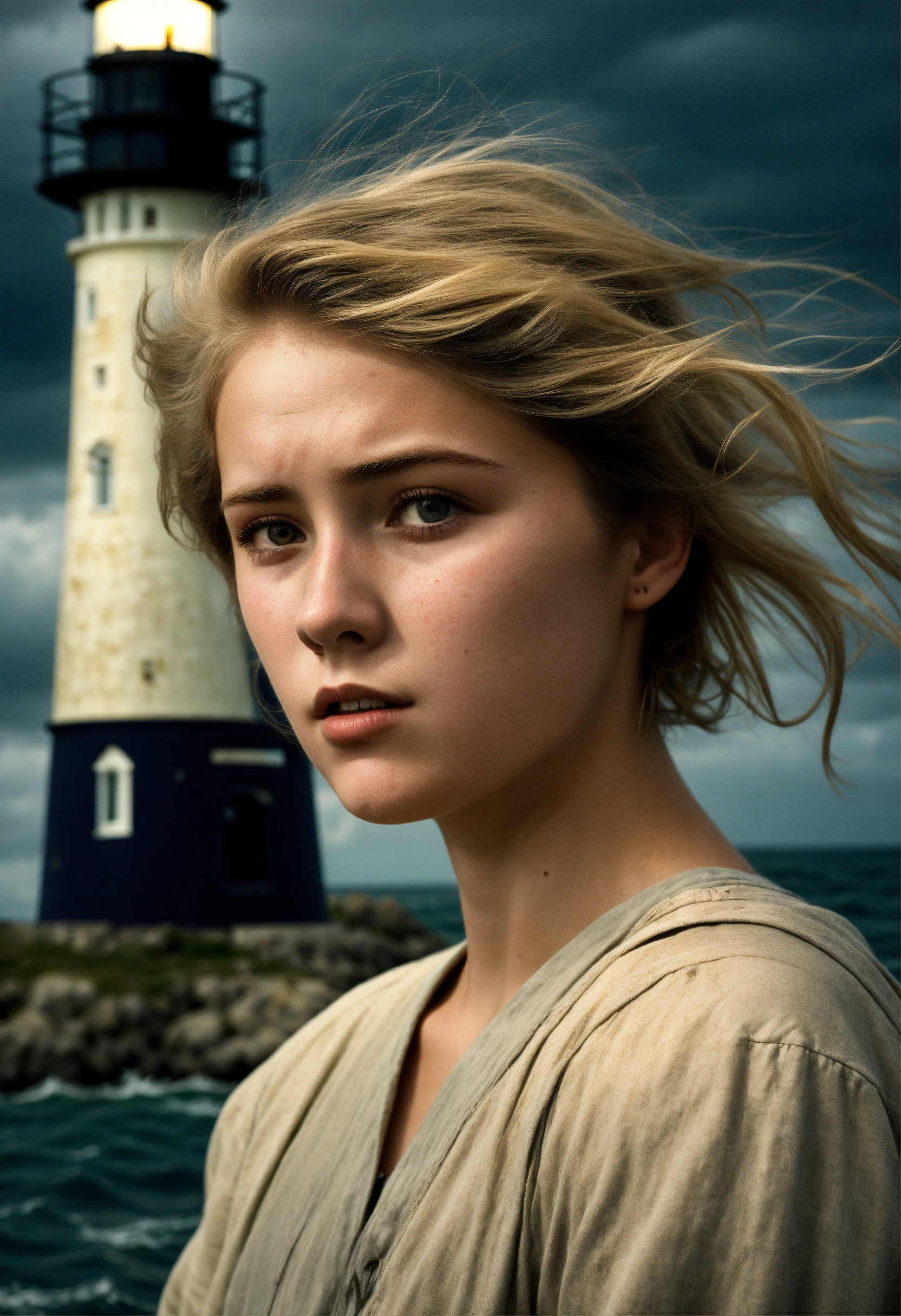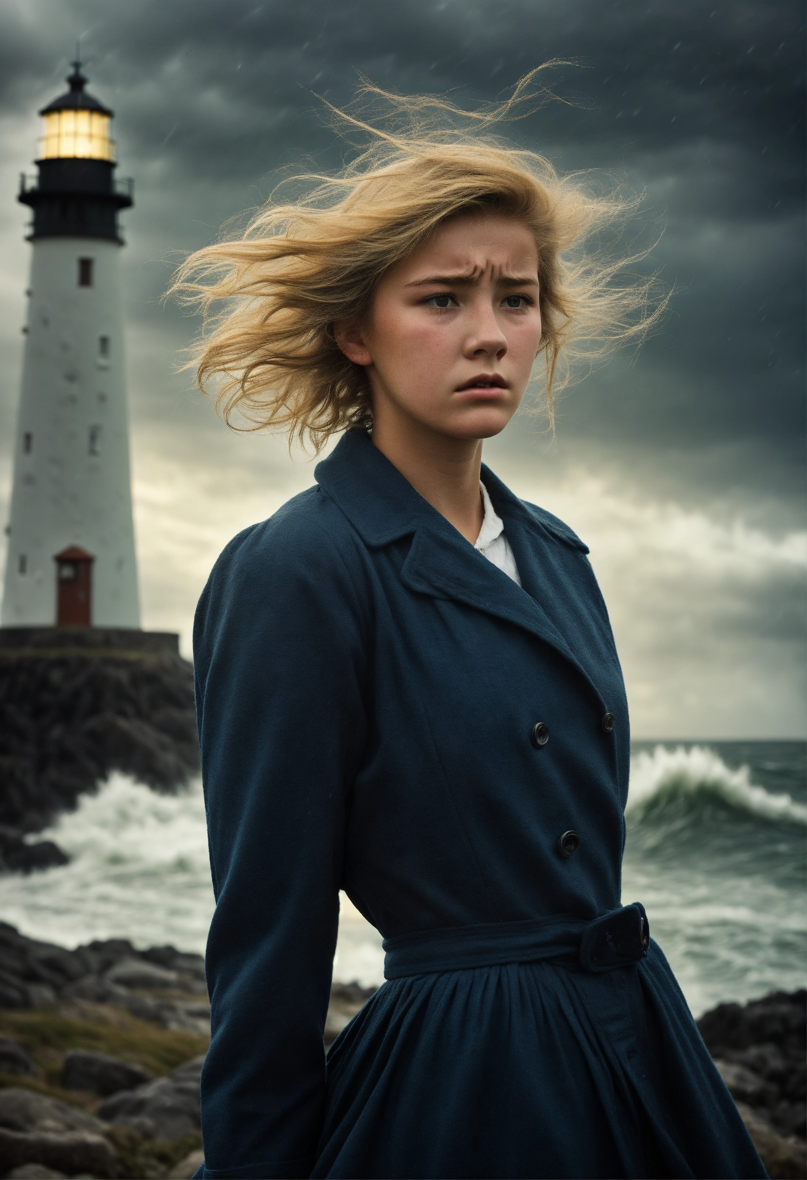 1910's 16 year old girl, worried face, short blonde hair blowing in the wind, by the dark ocean, in storm, lighthouse