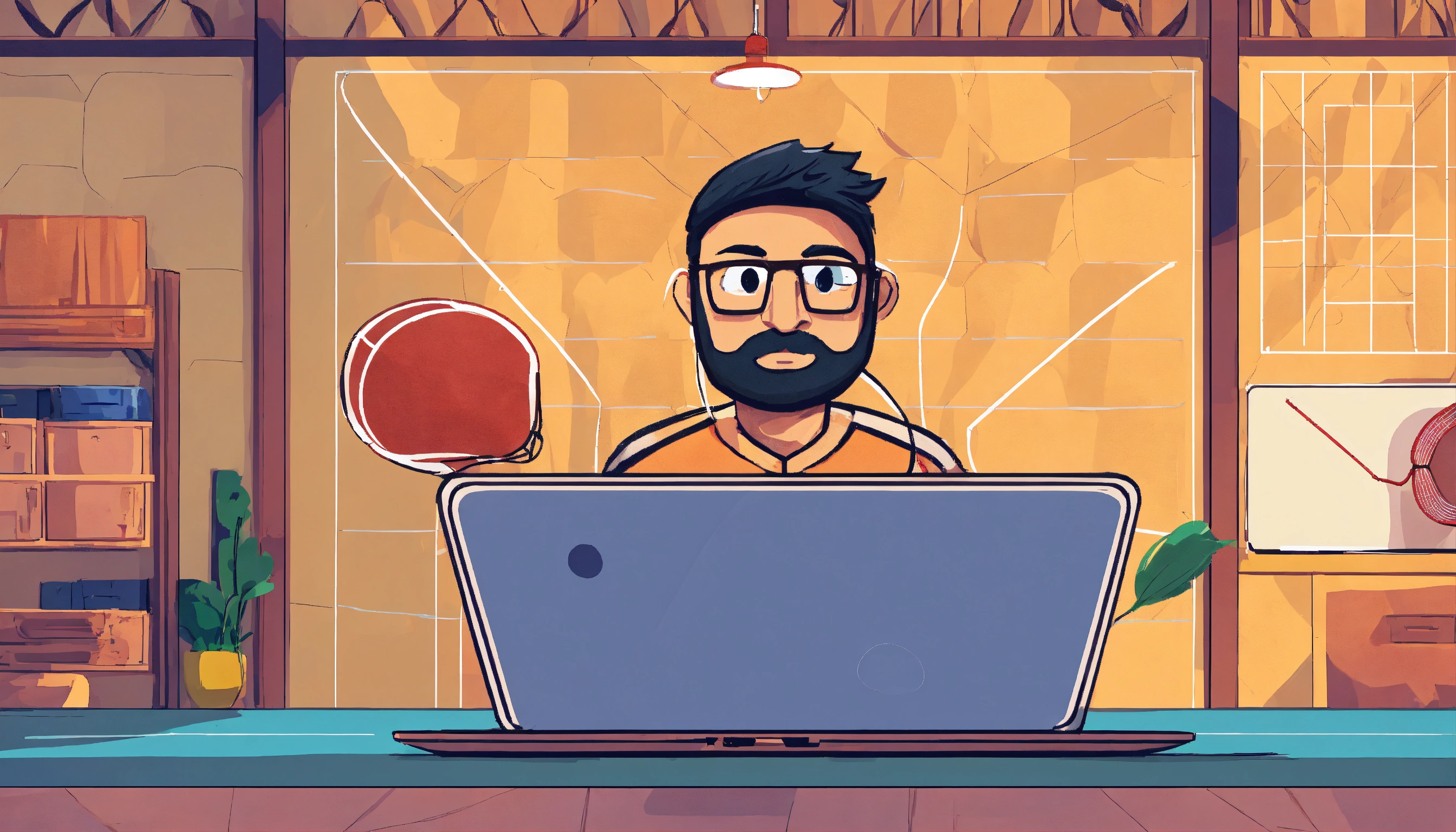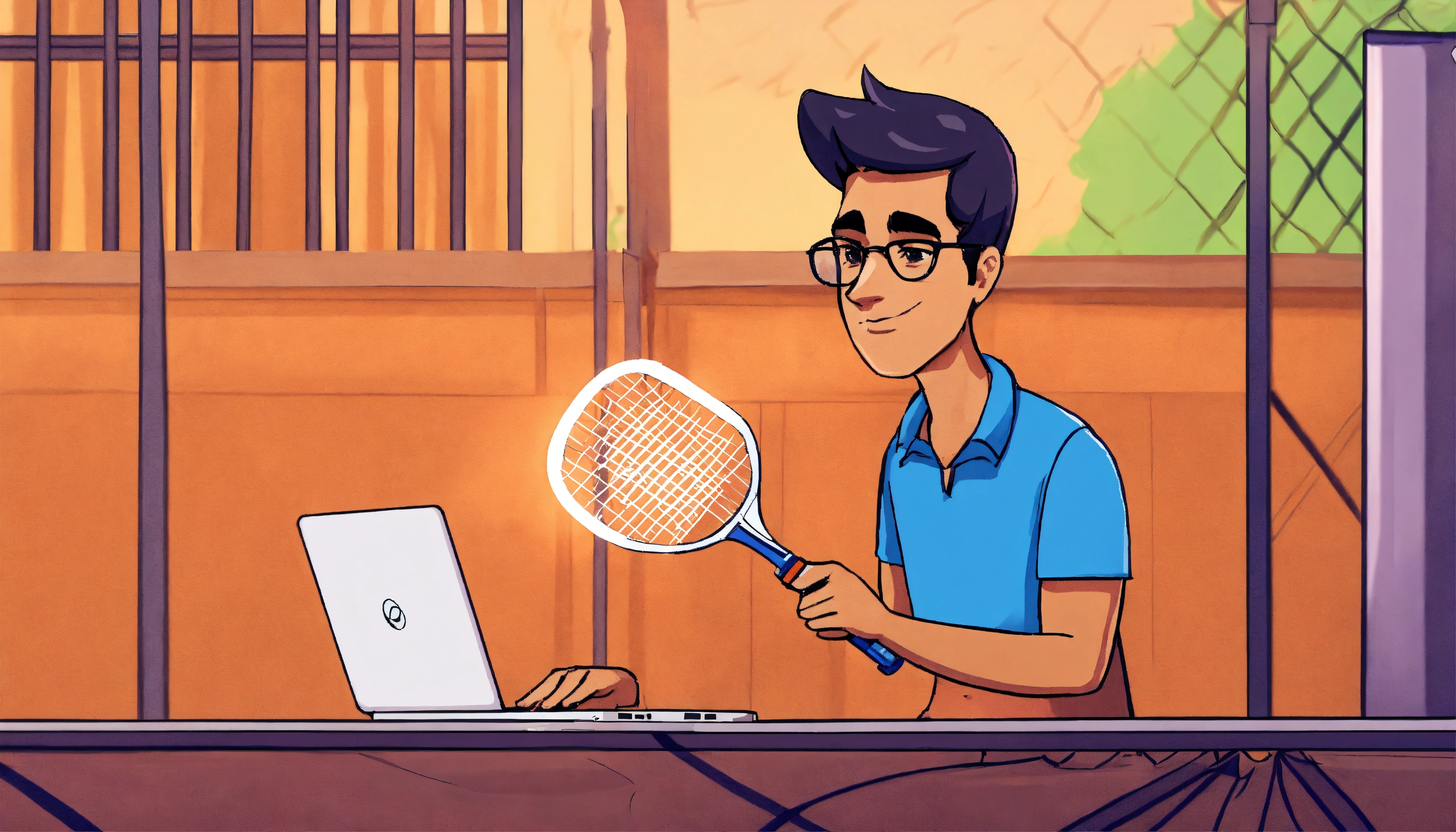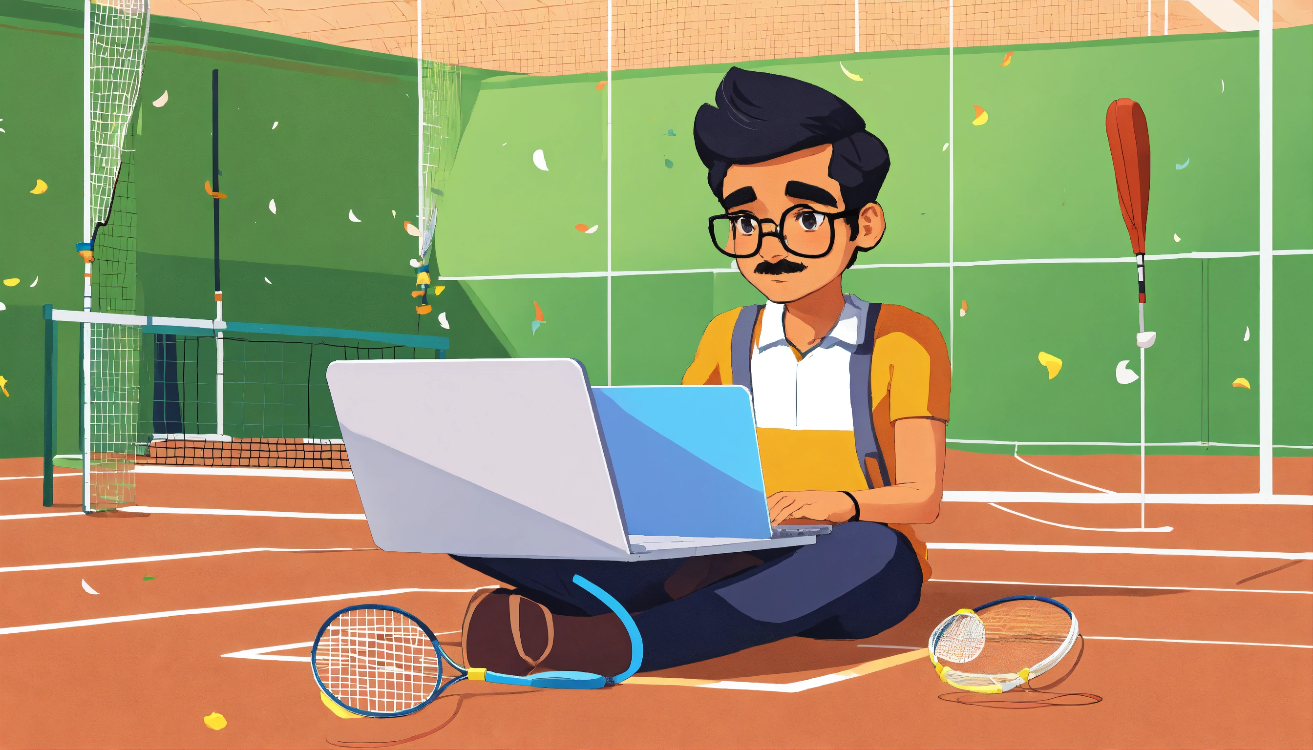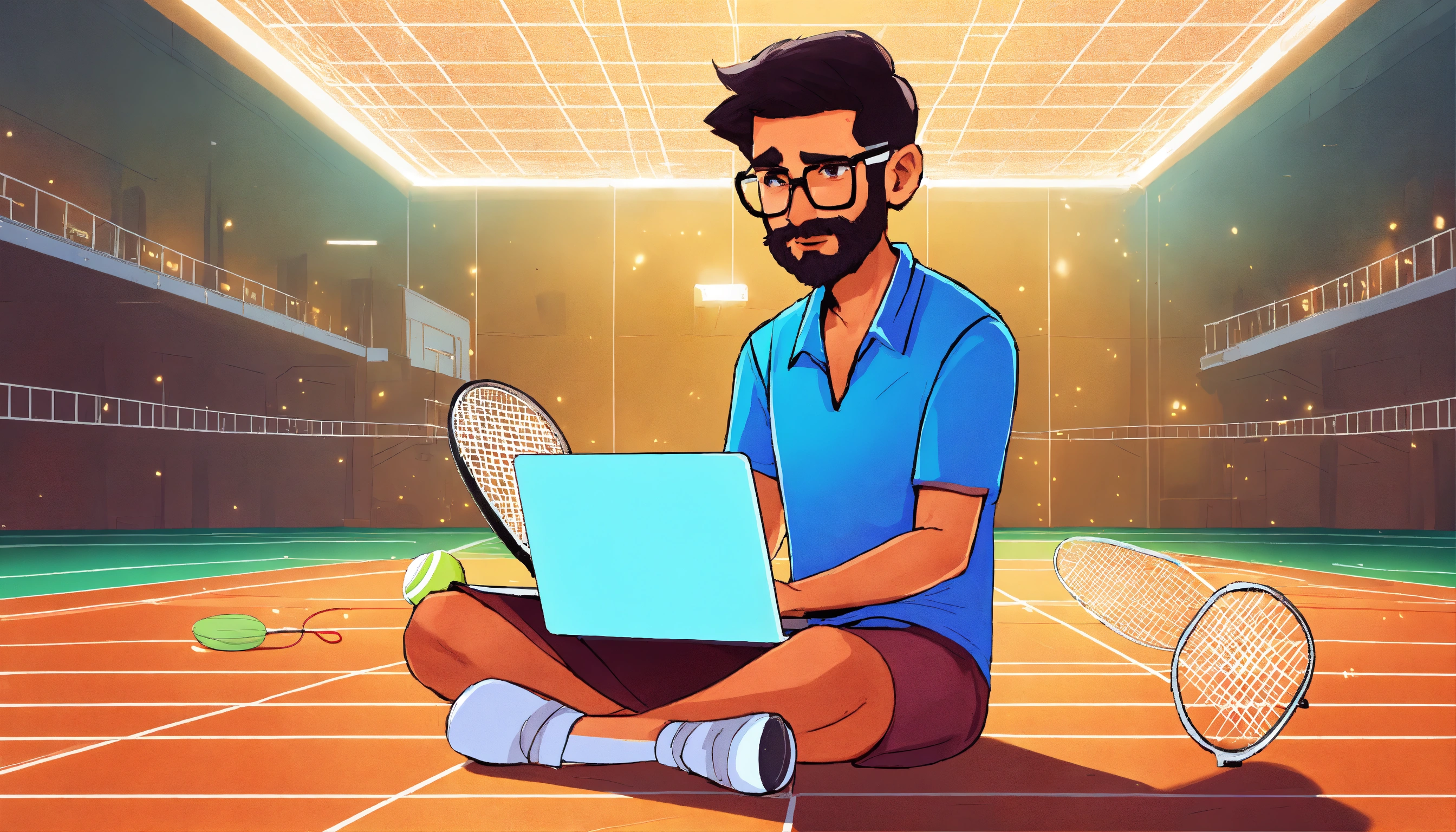 Indian, smooth-faced man coding on a laptop holding badminton racquet on a badminton court in the style of a cartoon.