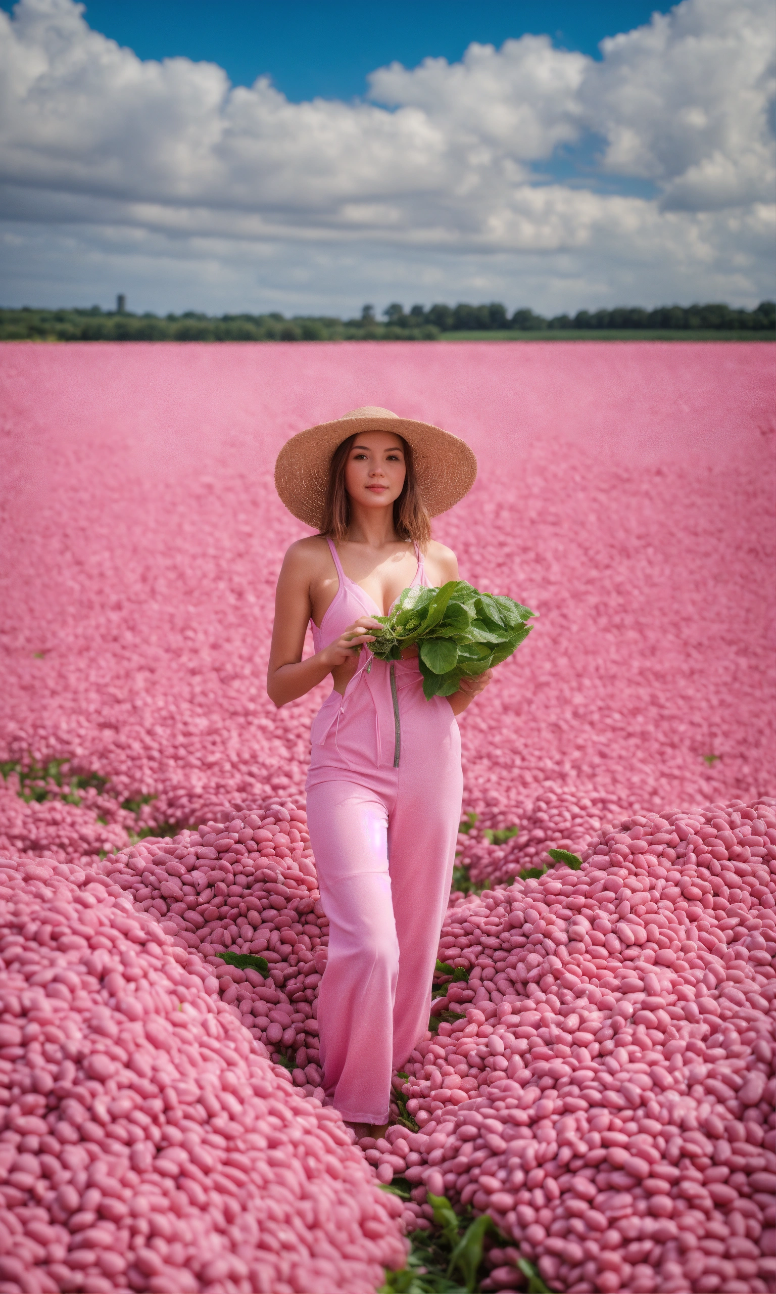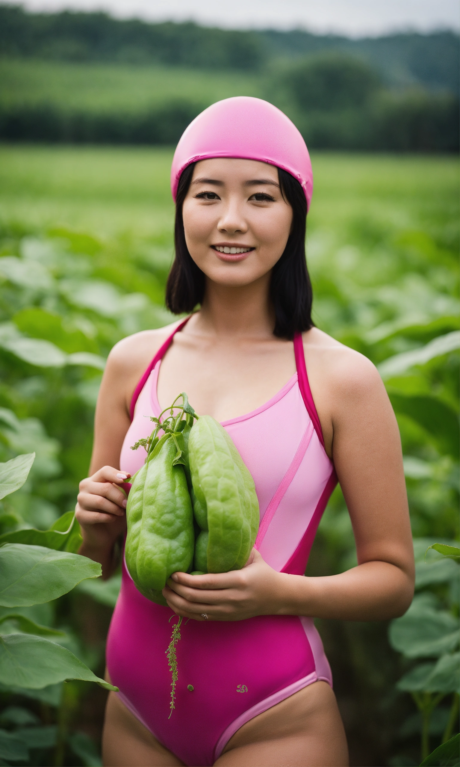 25 years old lady in a pink swimming suit holding giant soya bean in a field of giant soya
