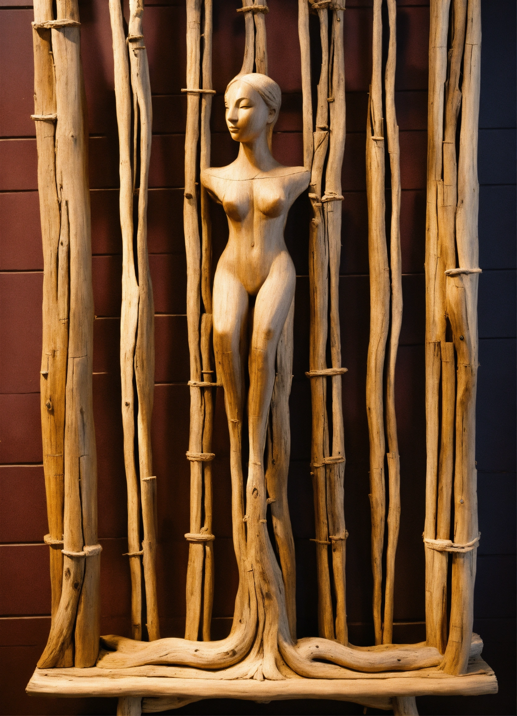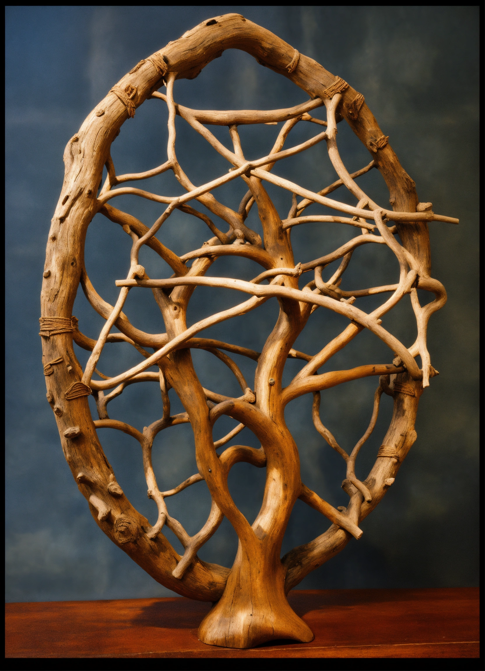 An ancient driftwood trellis hand made meditative sculptured in the style of alex grey