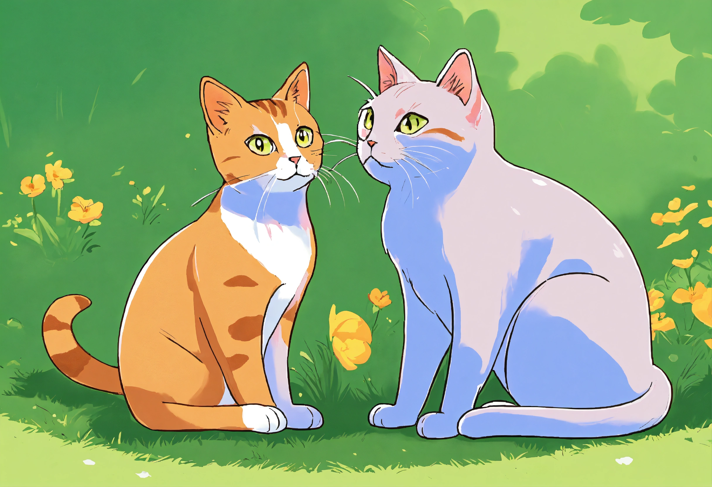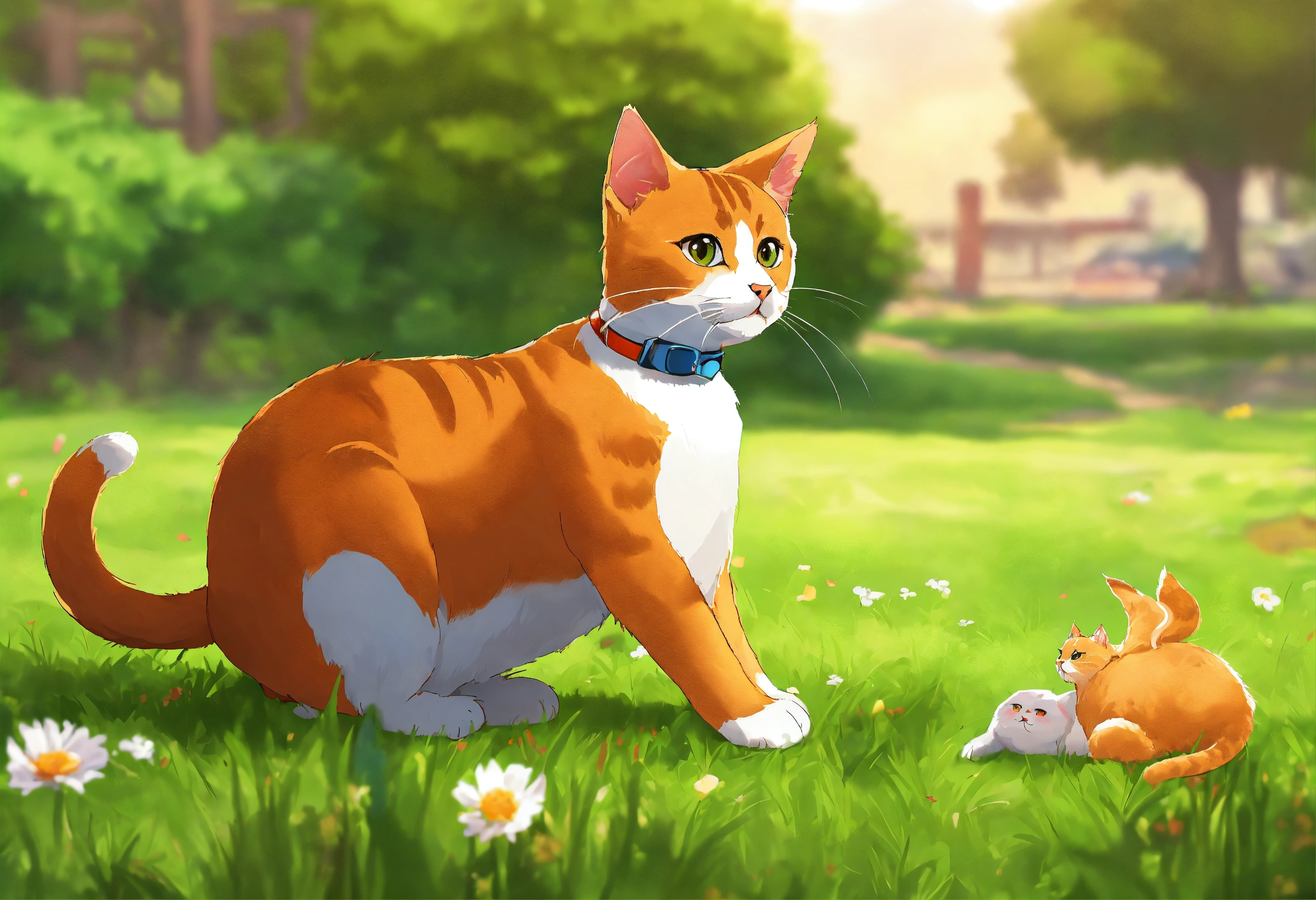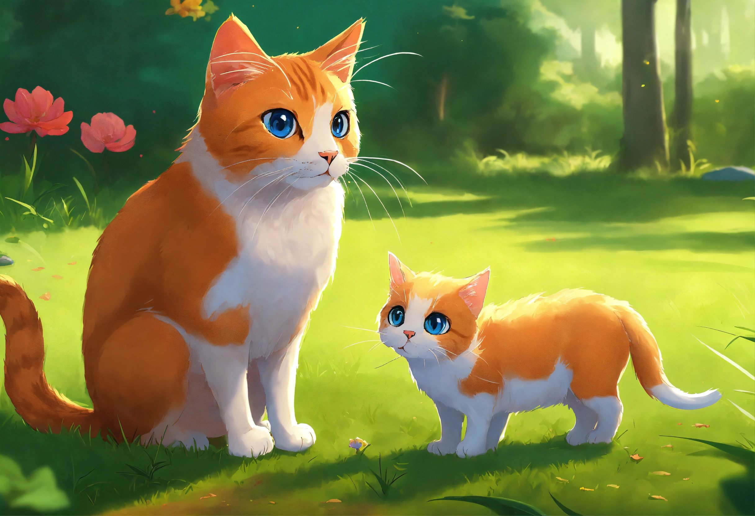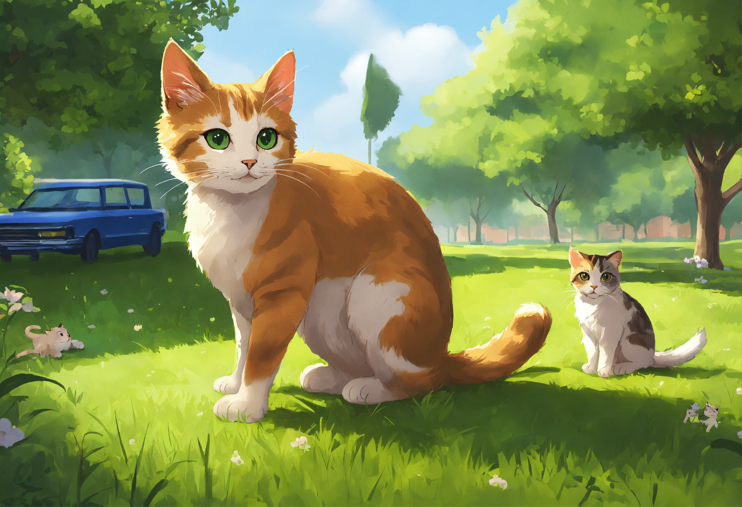 As if the cat also gradually forgot its mother and started wandering in the streets, one day suddenly he saw his sister rano cat who was sitting on the grass in the lawn drinking milk from a huge one, ai cartoon image