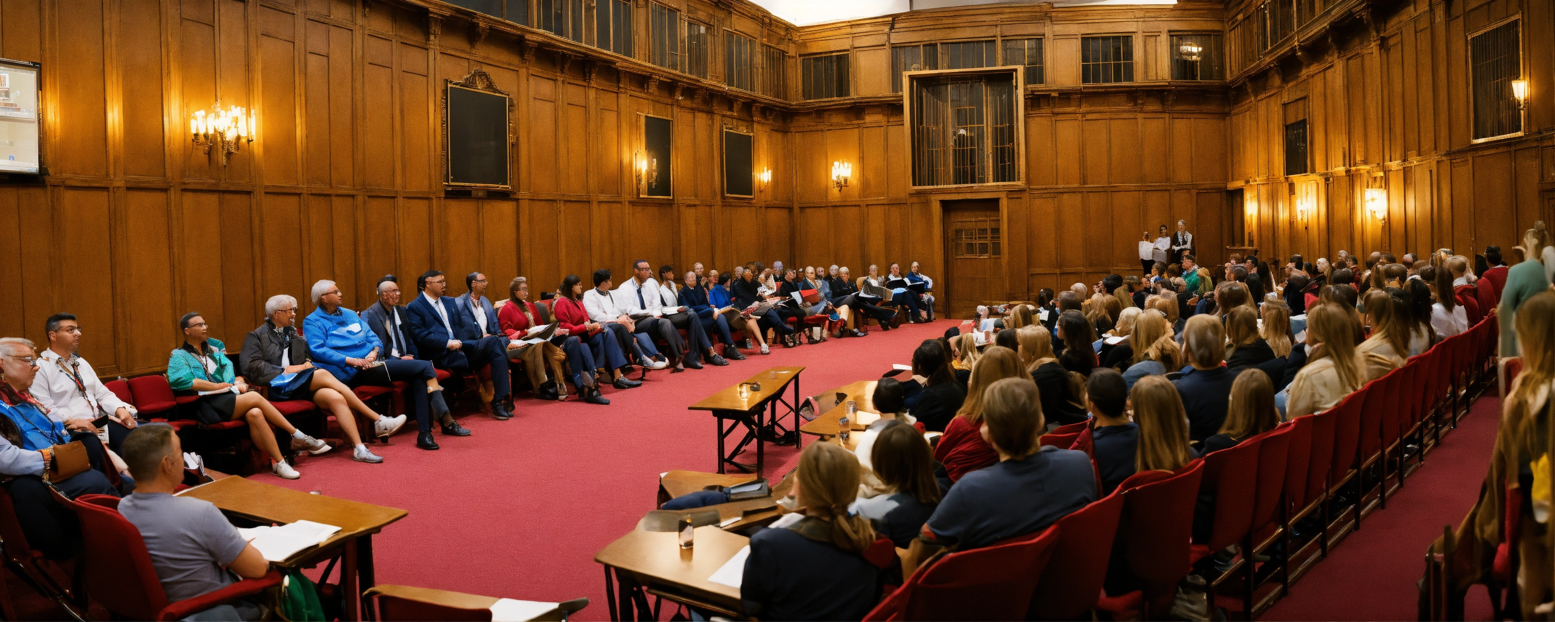 Create a lecture centered around a knowledgeable mentor to focused spectators from europe