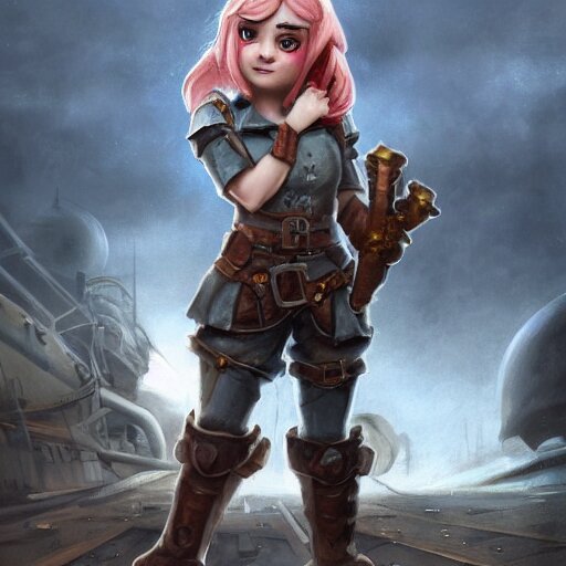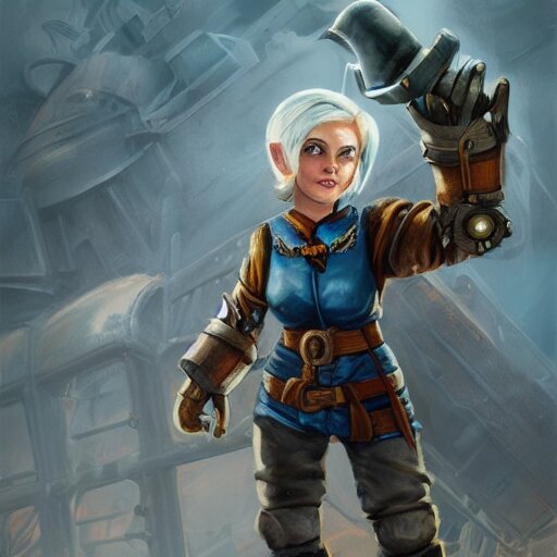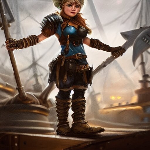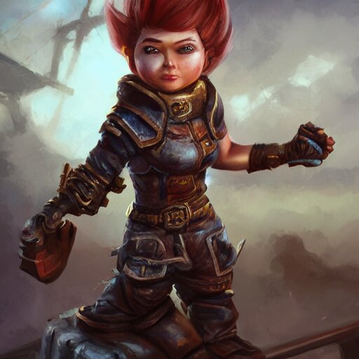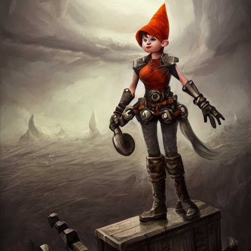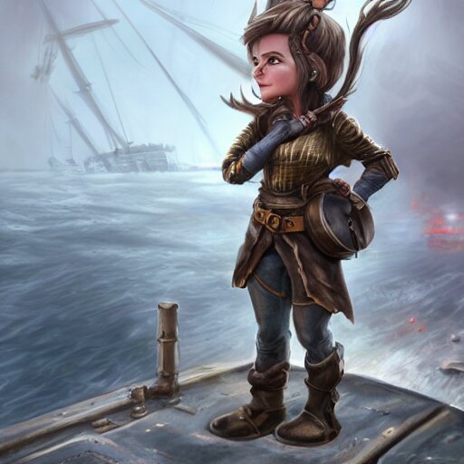 Full body portrait of a scrappy female gnome engineer with pixie undercut hair, one of her arms is a prosthetic metal thunder gauntlet, standing on a ship deck, naval background, fantasy, d&d, highly detailed, digital painting, hd, trending on artstation, dark fantasy, great composition, concept art, matte, sharp focus, illustration, by greg rutkowski
