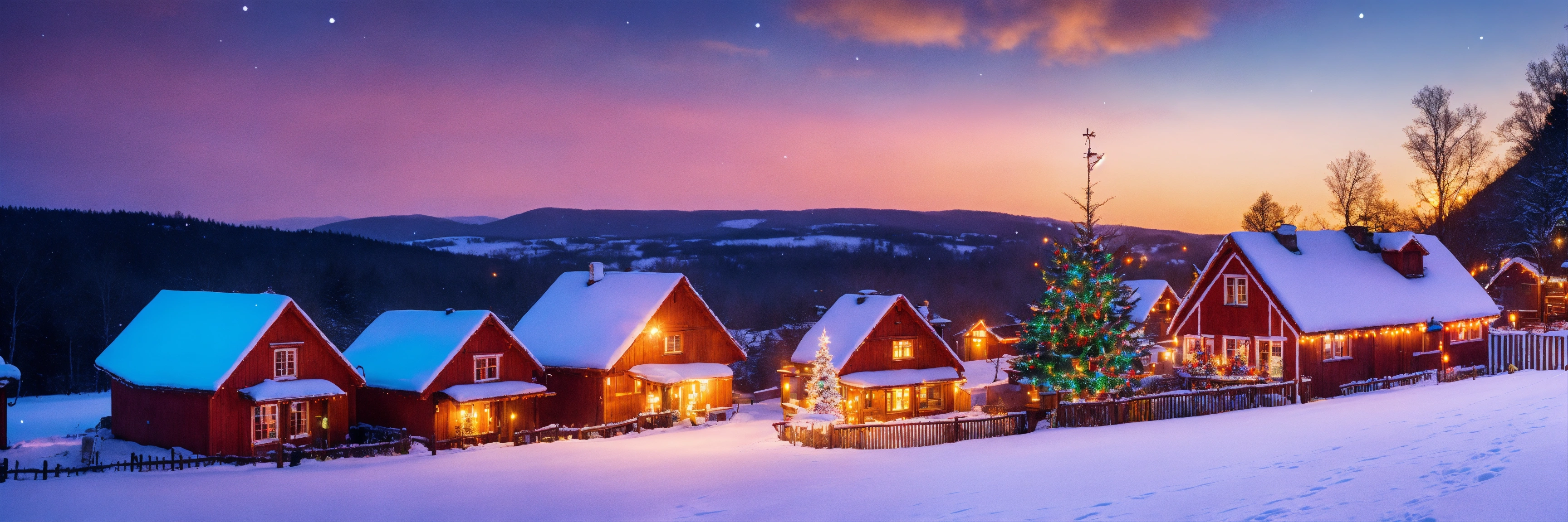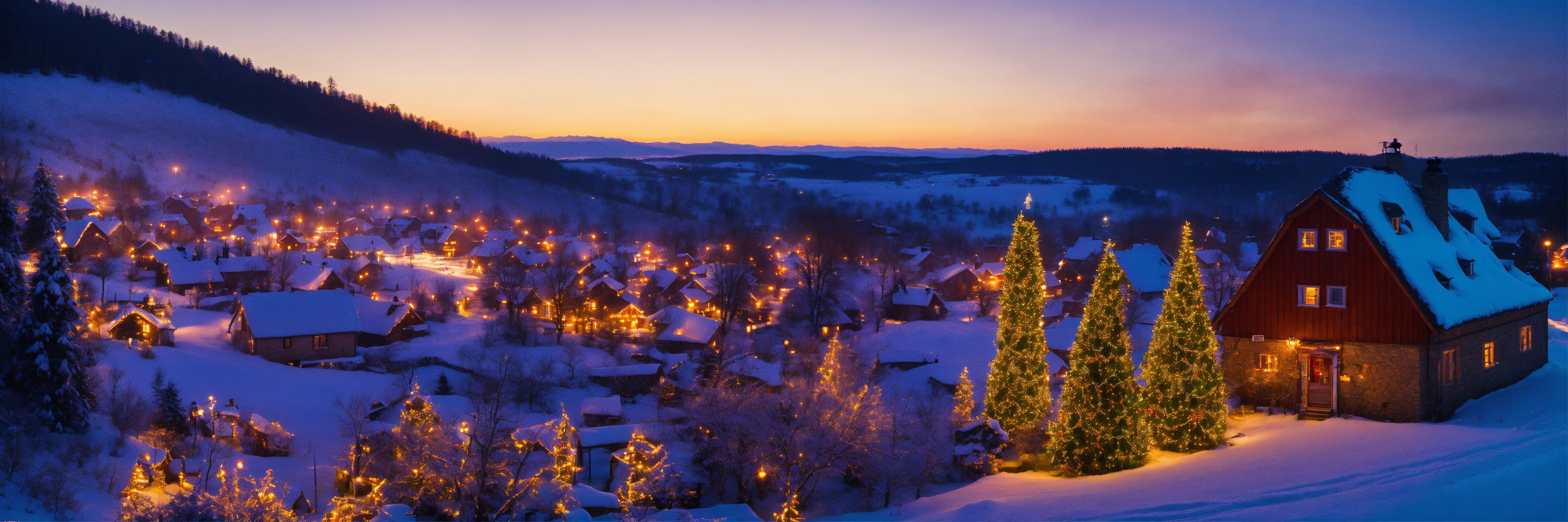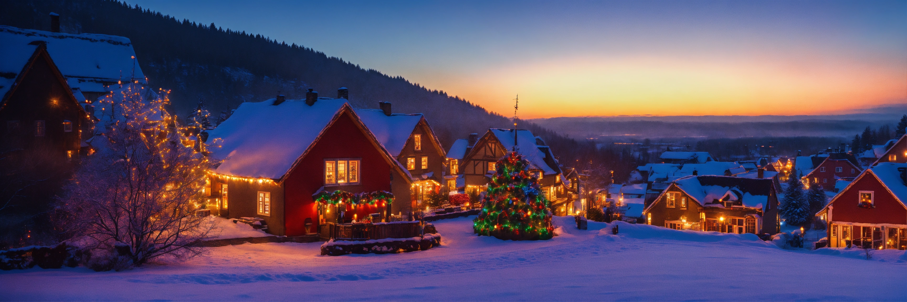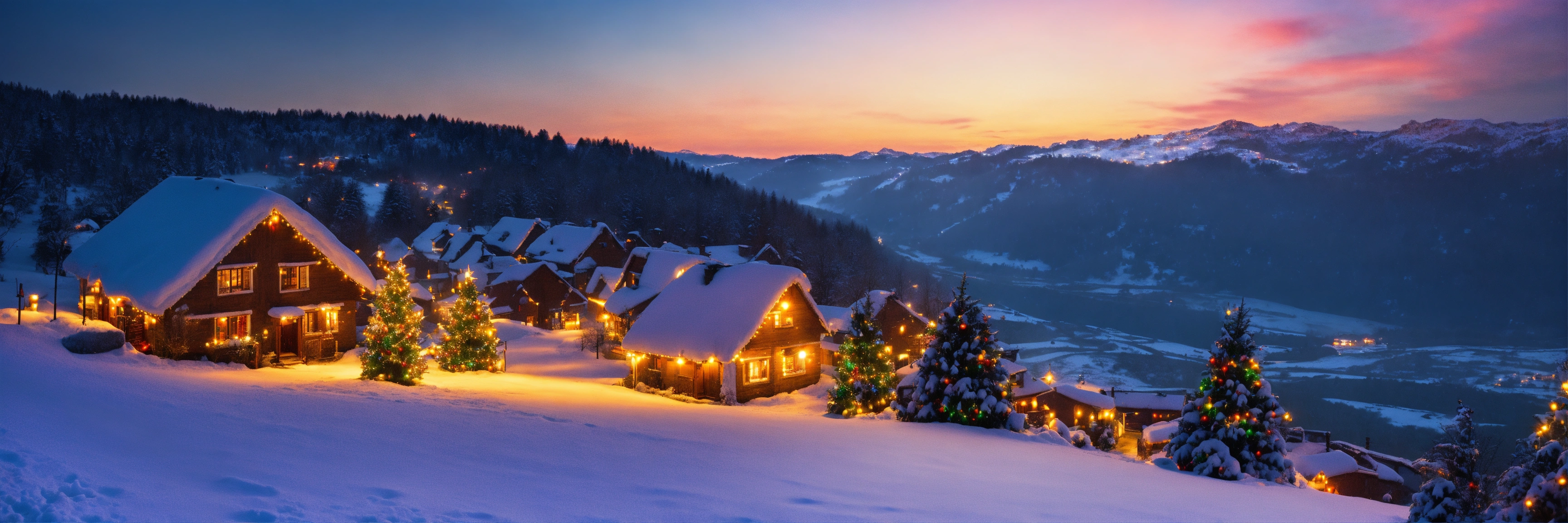 Image picturesque snowy village with charming houses adorned with christmas lights and wreaths." descriptive keywords solitude, contemplation, wilderness, freedom, cozy. camera lens wide-angle lens. time of day sunrise or sunset. style of photograph ethereal. camera settings low aperture for a shallow depth of field, moderate shutter speed. post-processing techniques enhance colors, add a soft glow effect, create a dreamlike atmosphere.