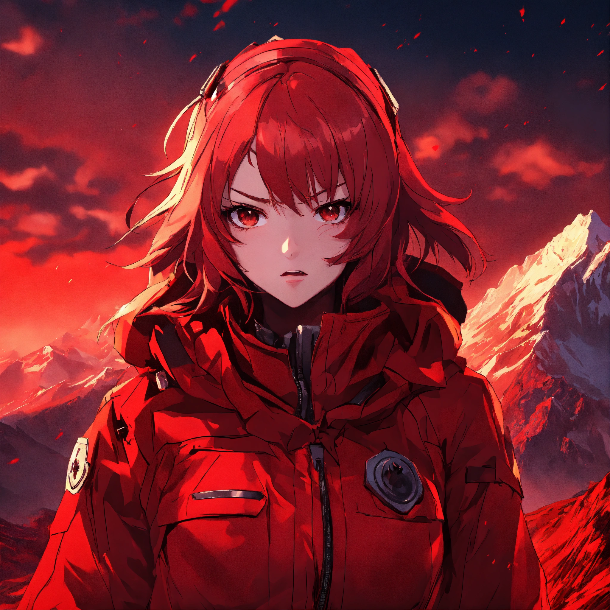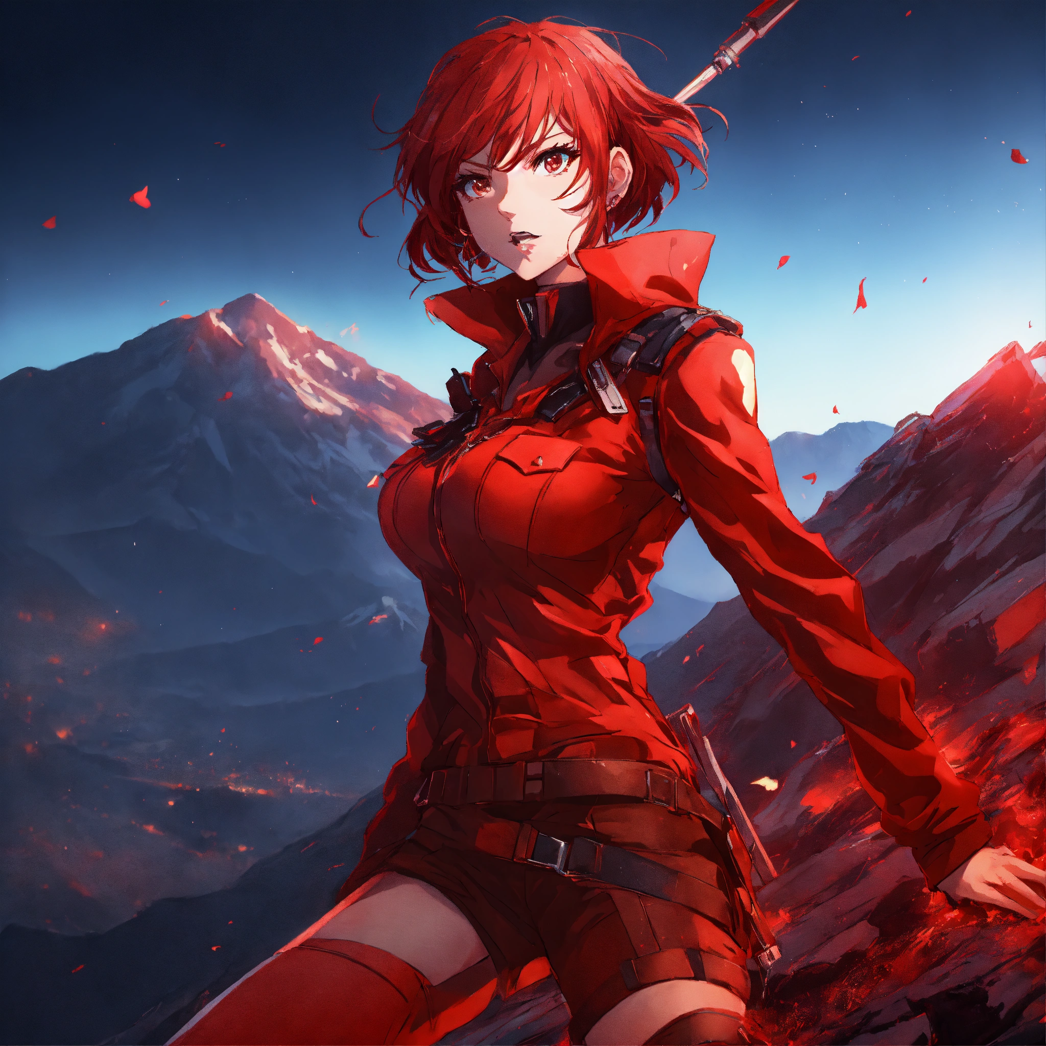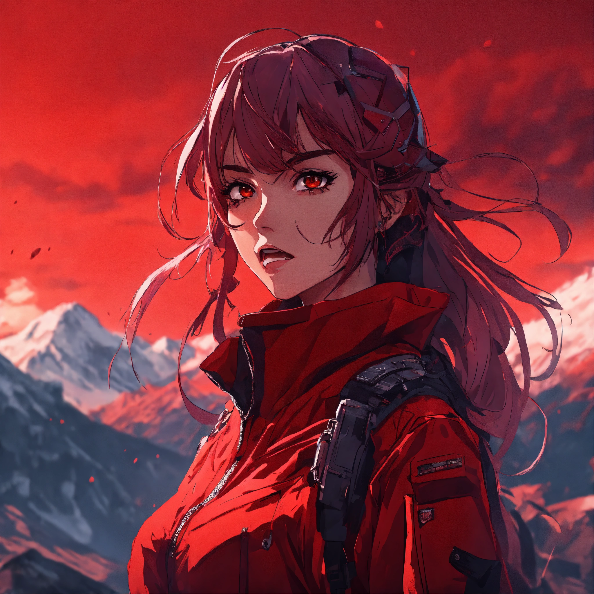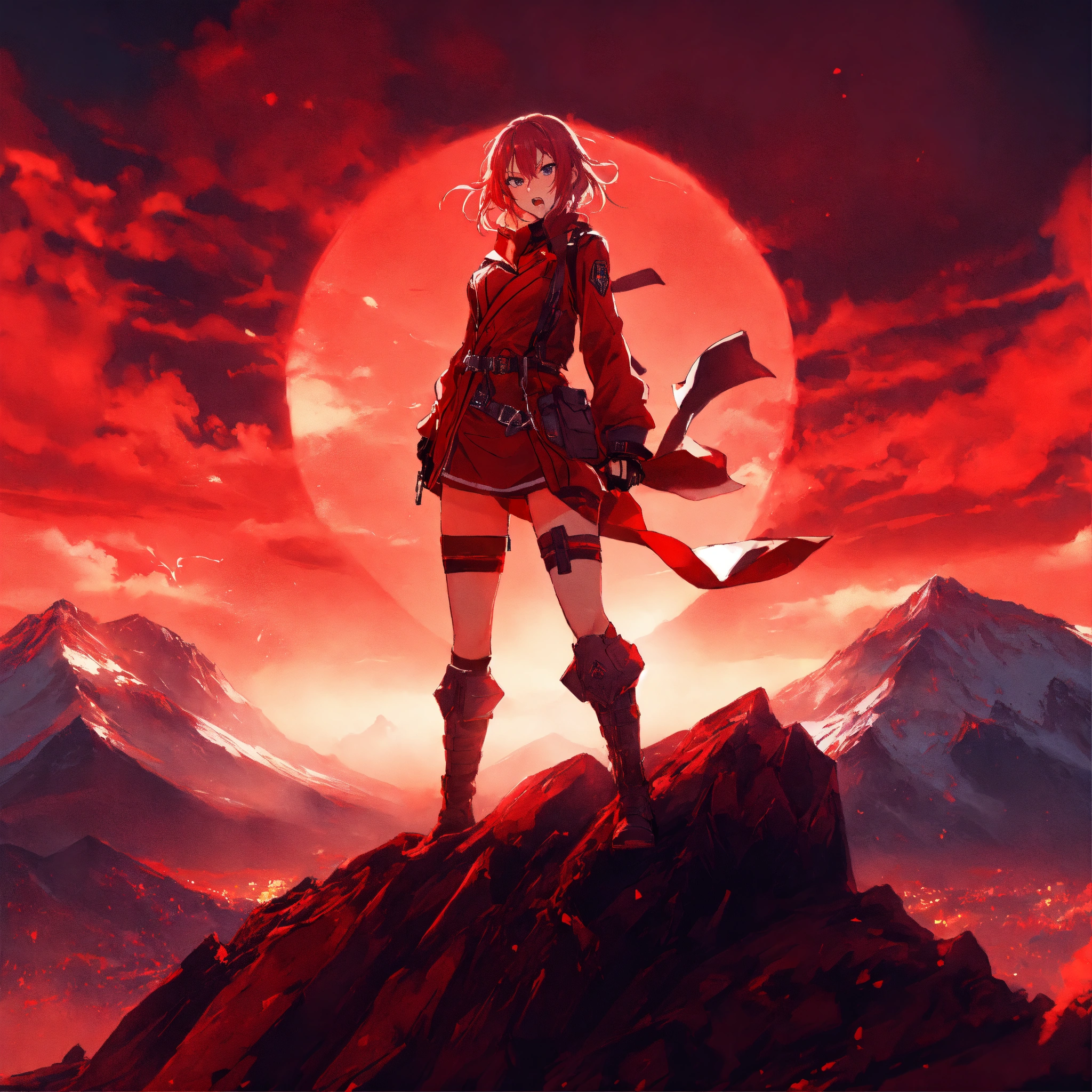 Generate a crazy anime villain girl, red background, war scenary, crazy face, suspense light, higly detailed, 4k, badass pose, on top of a mountain