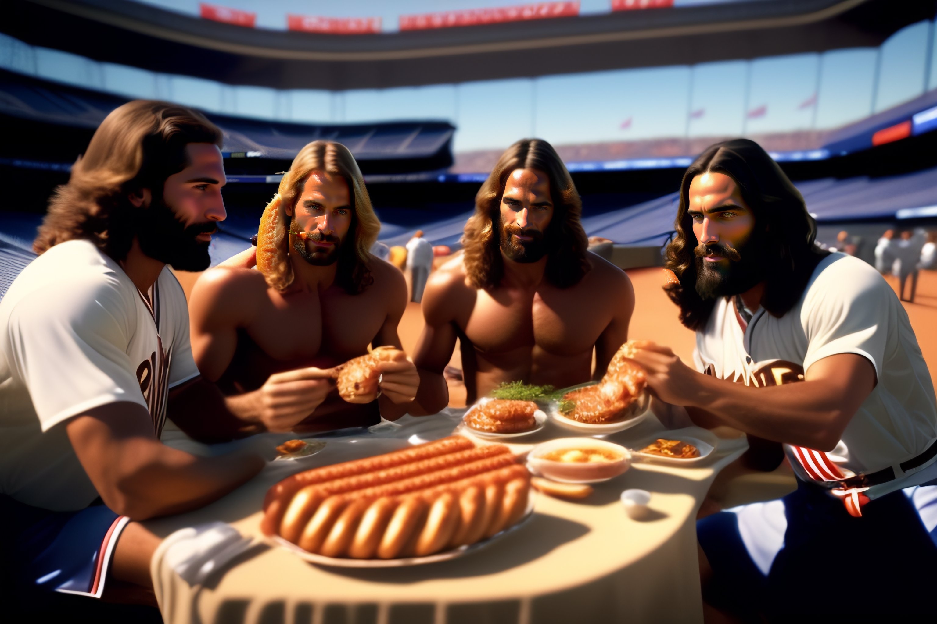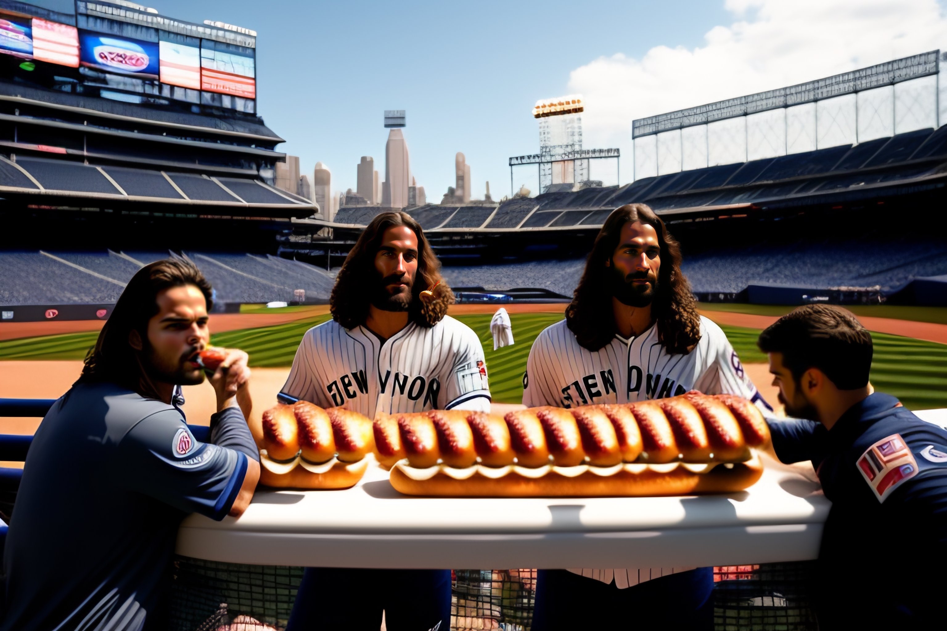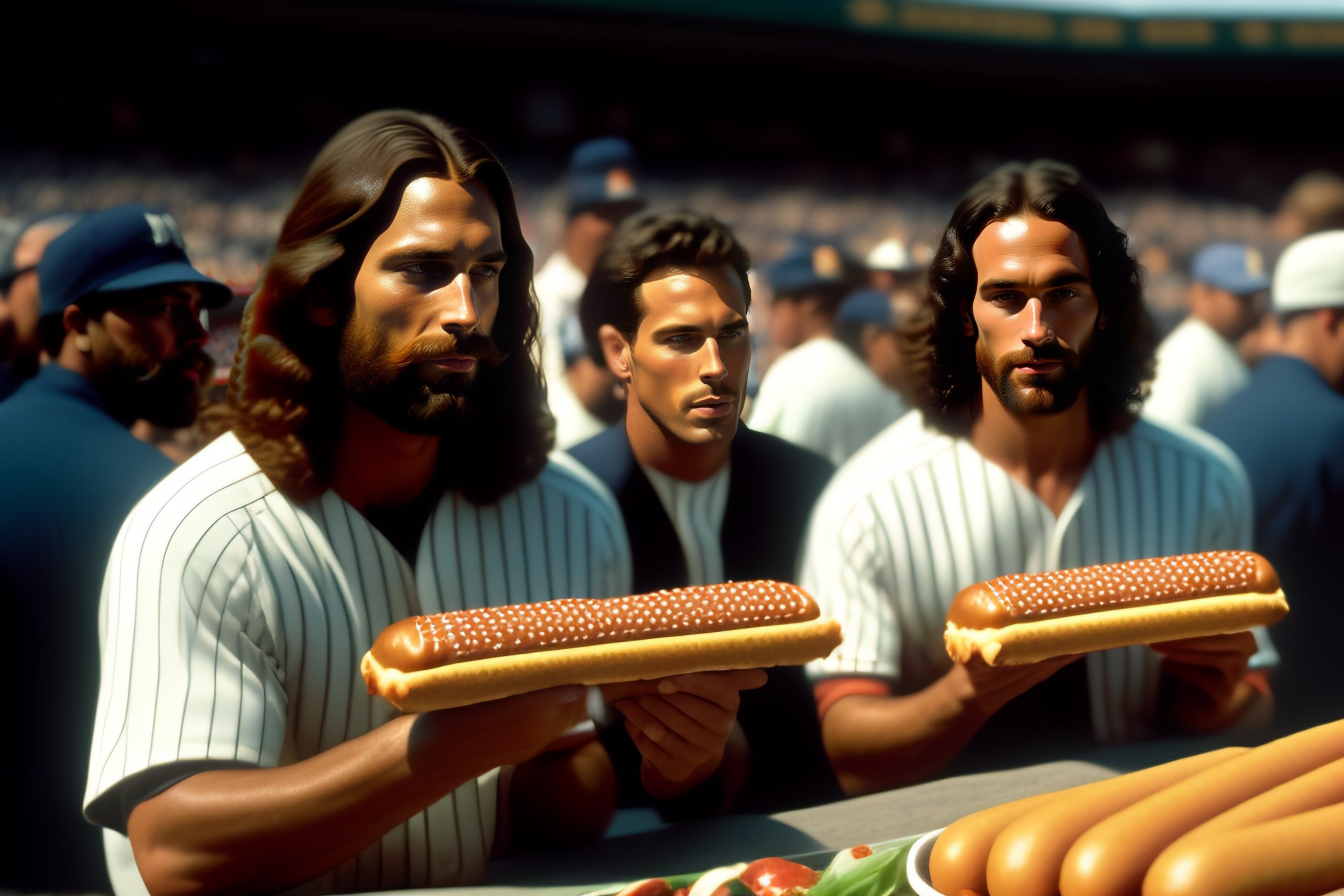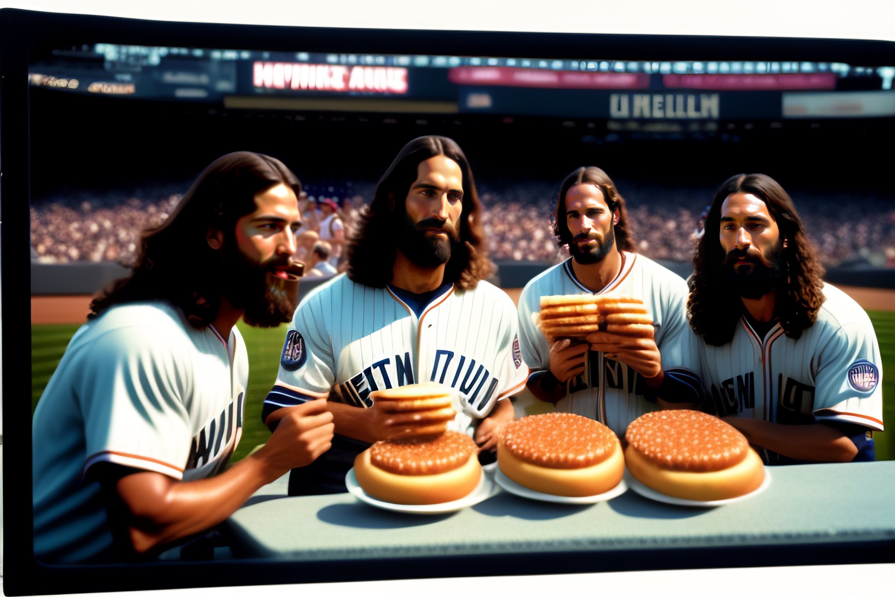 Photo of jesus christ and the 12 apostles eating hot dogs at yankee stadium in new york