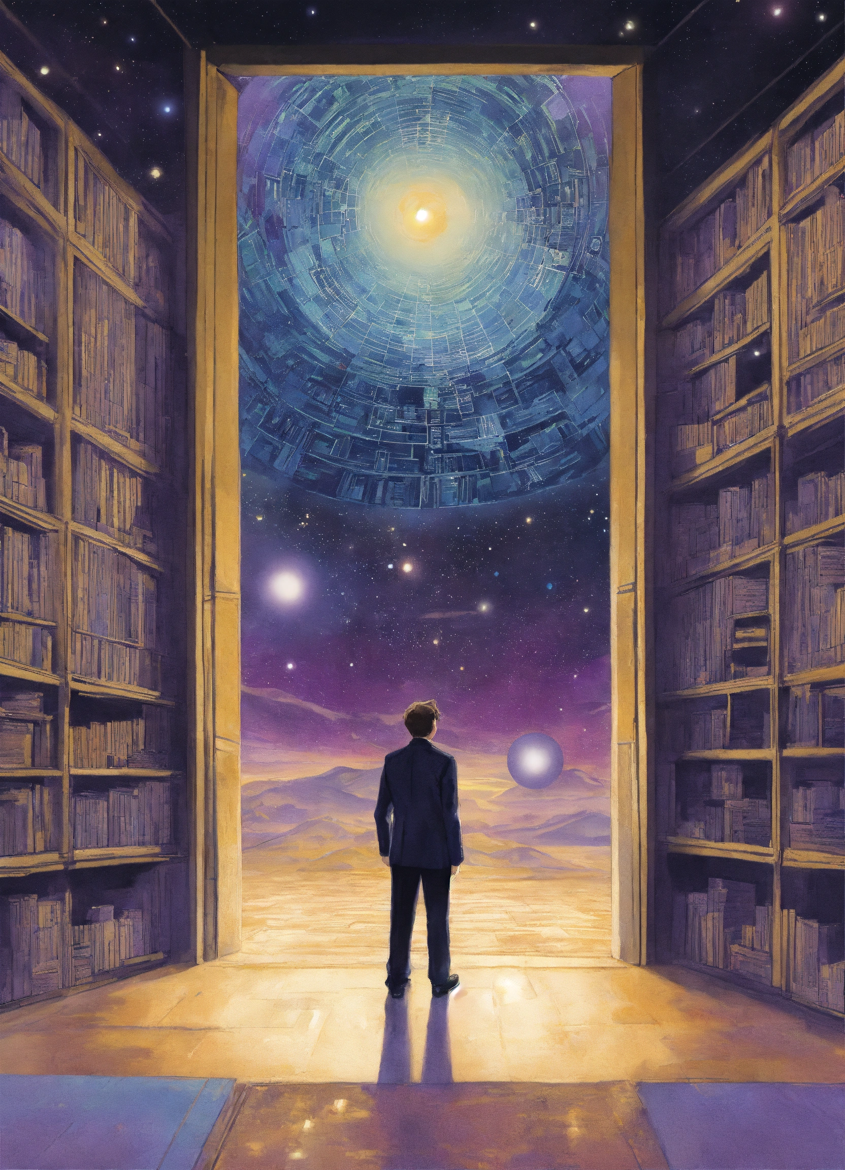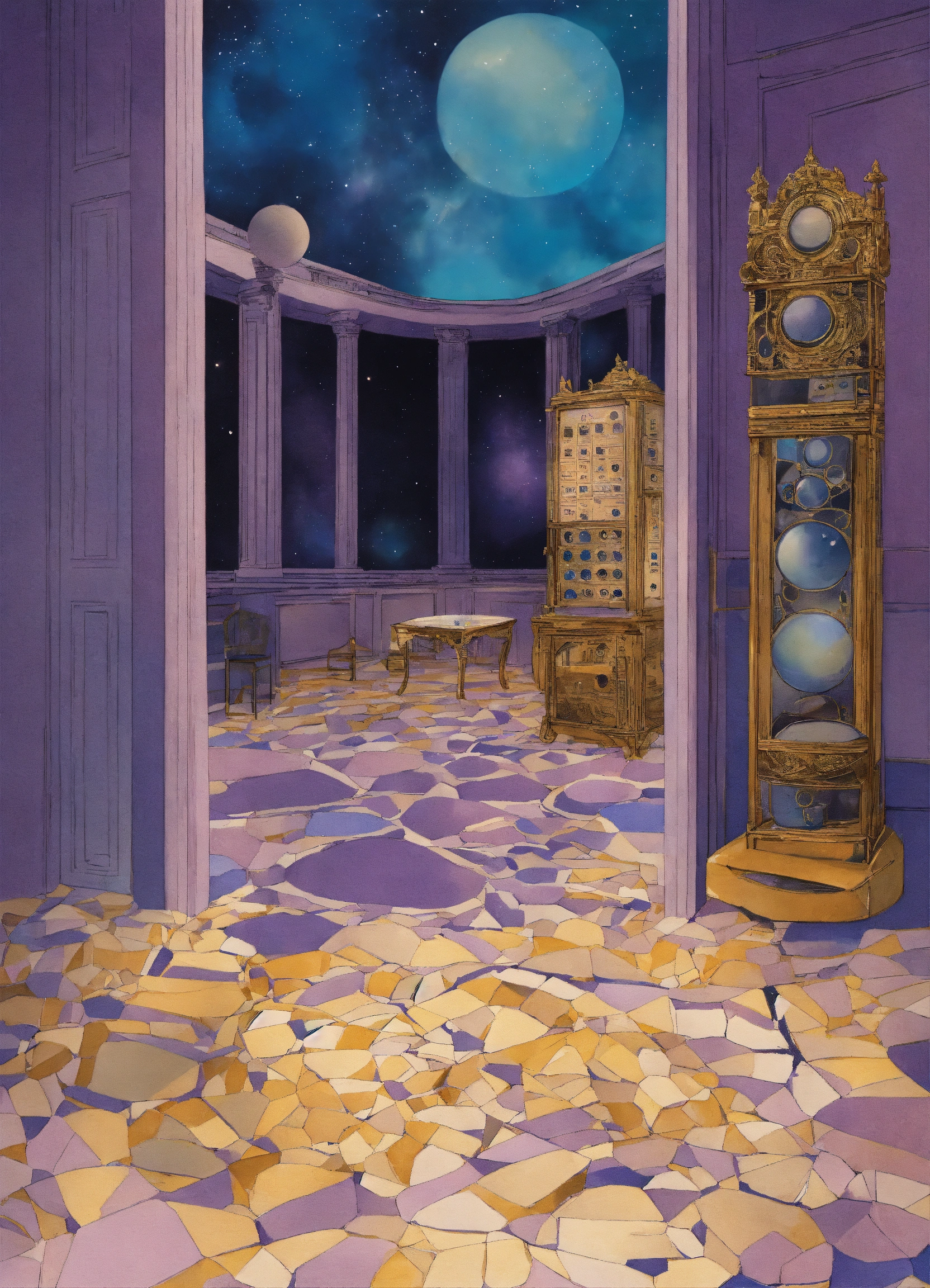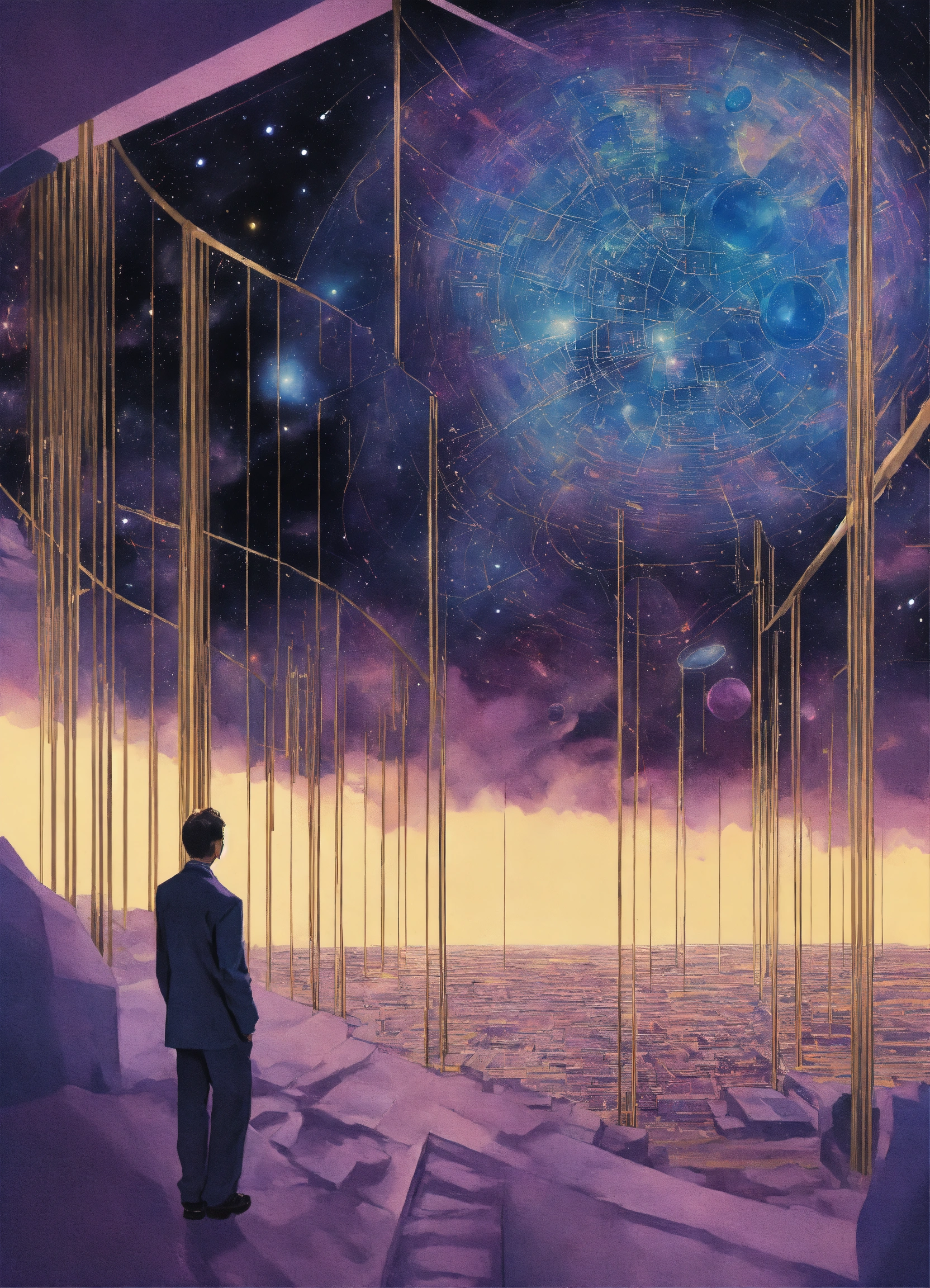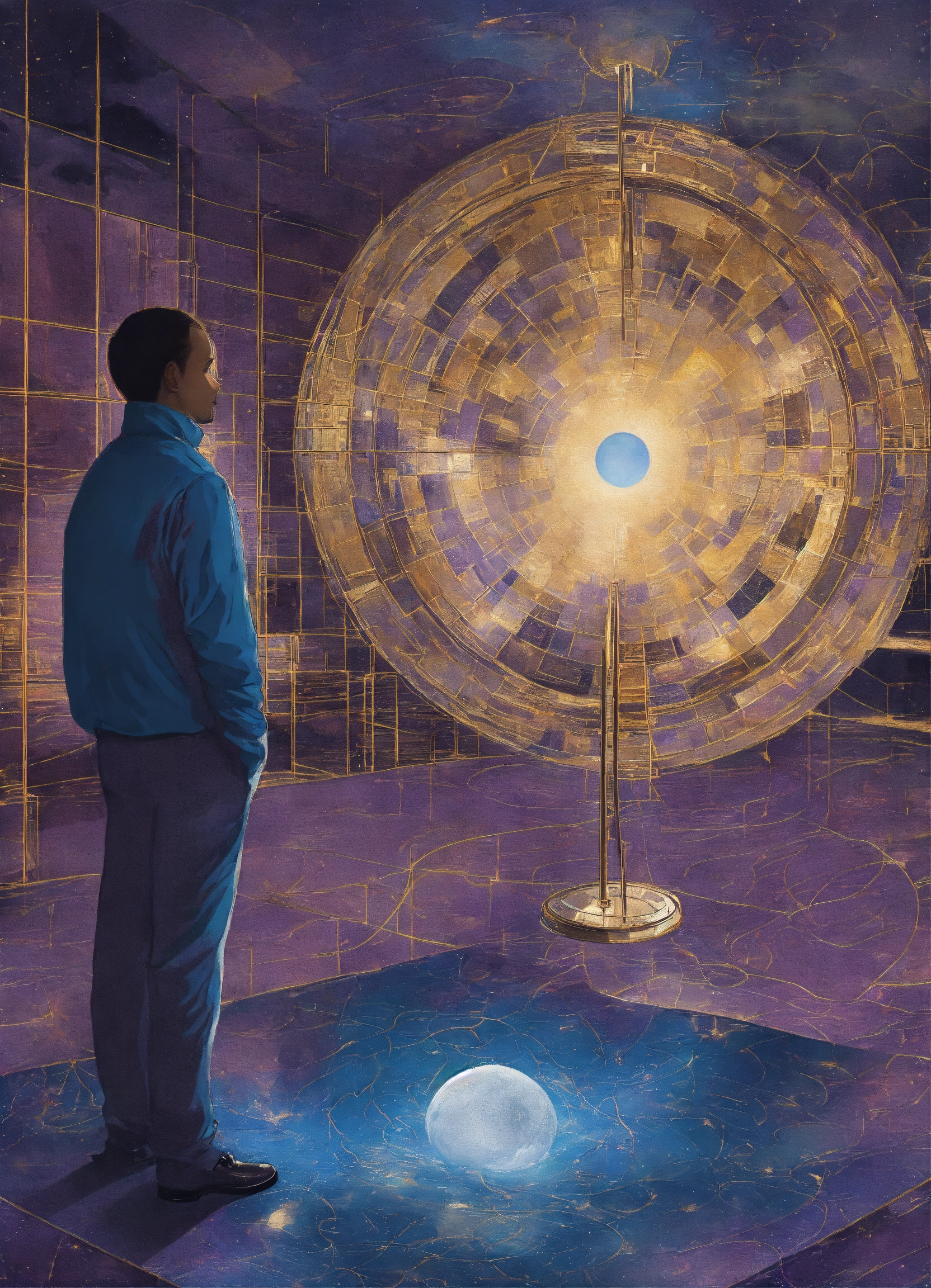 Illustration in the style of deleece cook, remote viewing, seeking impressions about a distant or unseen subject, sensing with the mind, a remote viewer, information about an object, event, person, or location that is hidden from physical view and separated at some distance, space, blues, purples, blacks, silver, gold, cream