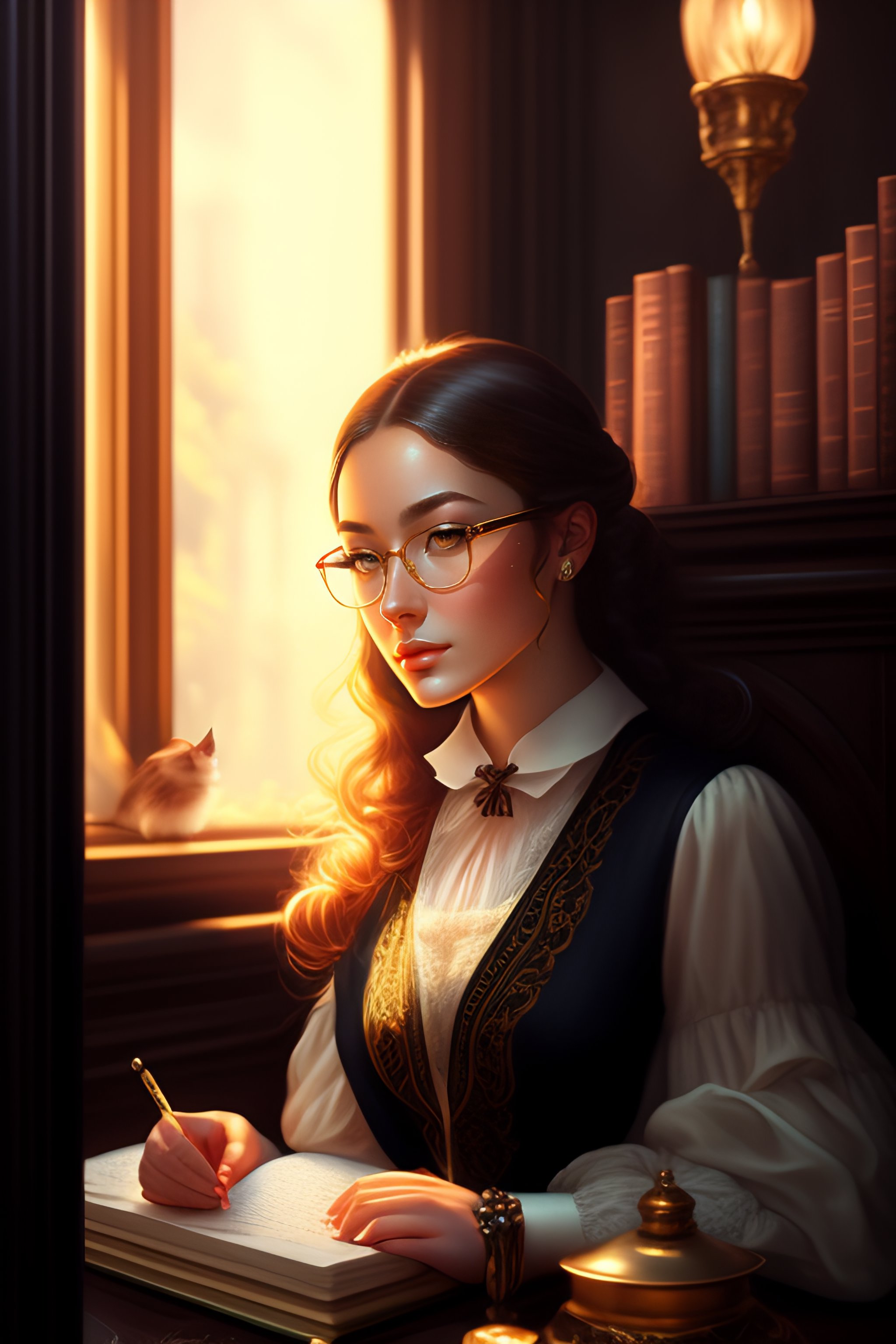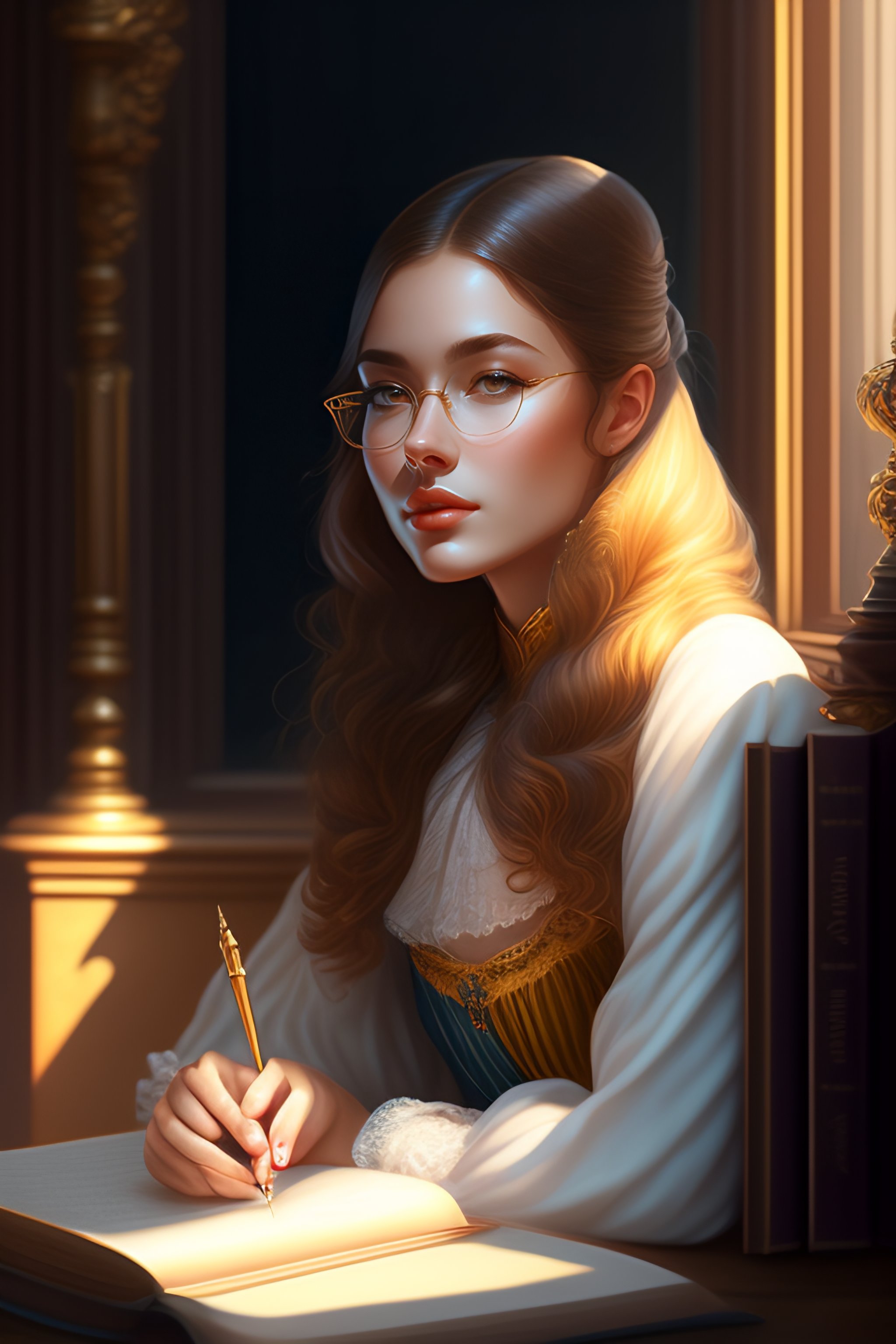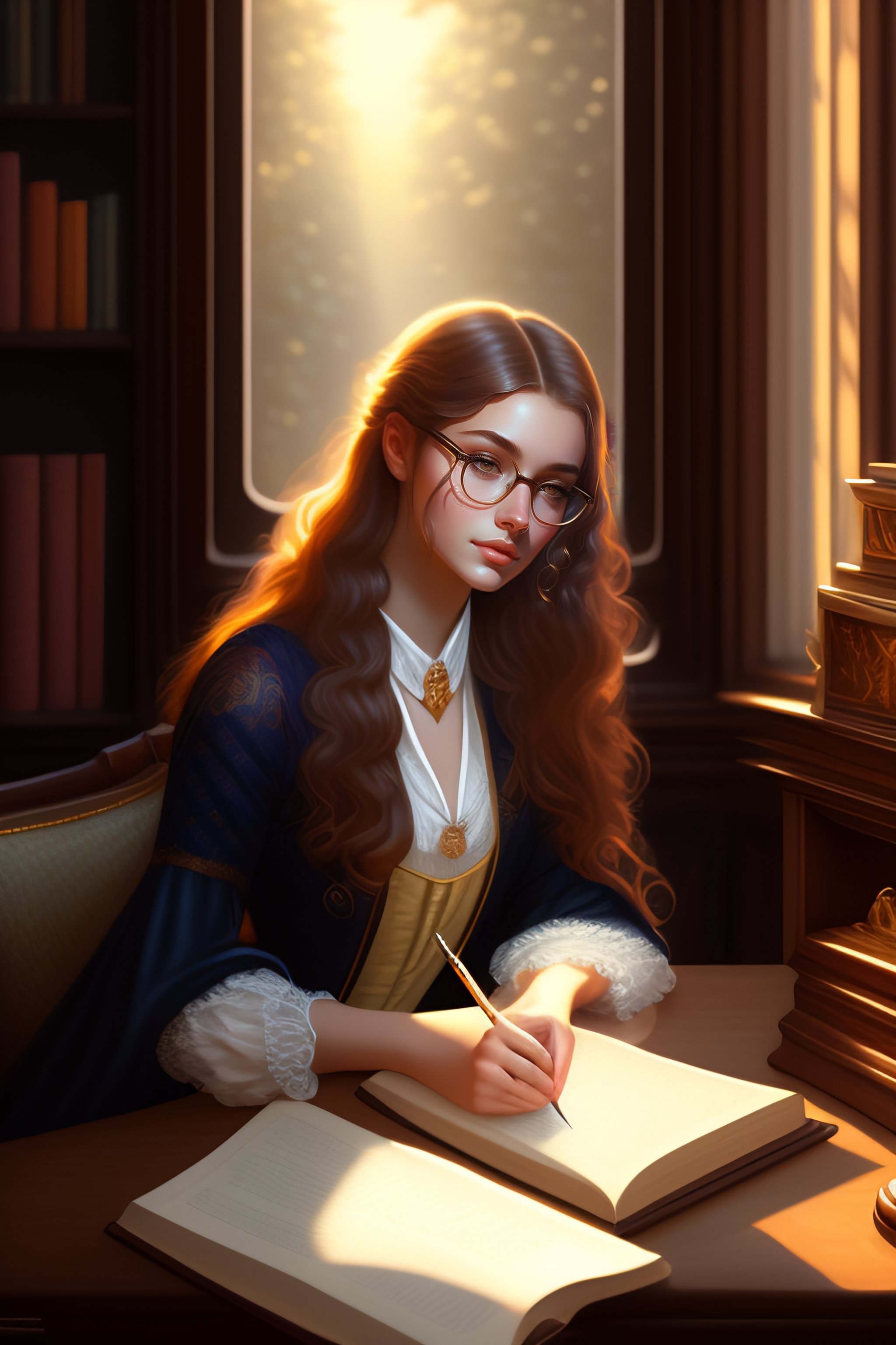 Young female writer, writing a novel, glasses, rococo furniture, window, sun rays, inkwell and quill, vintage books, very detailed, digital painting, artstation, concept art, smooth, sharp focus, illustration, art by wlop, charlie bowater and alexandra fomina