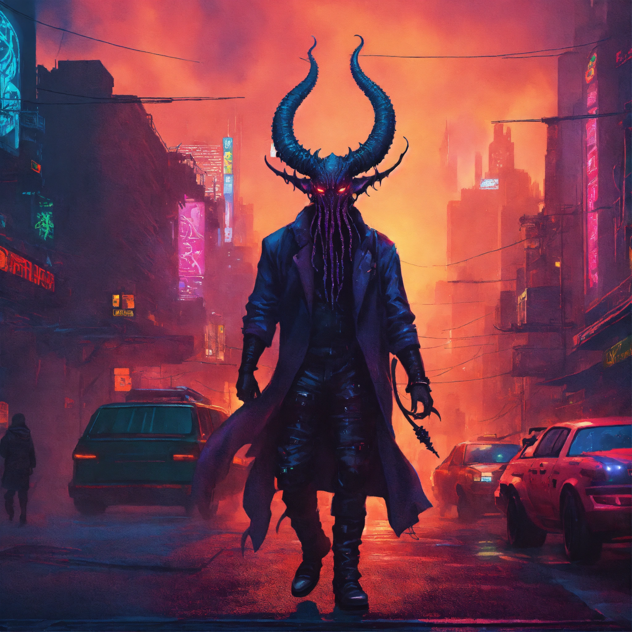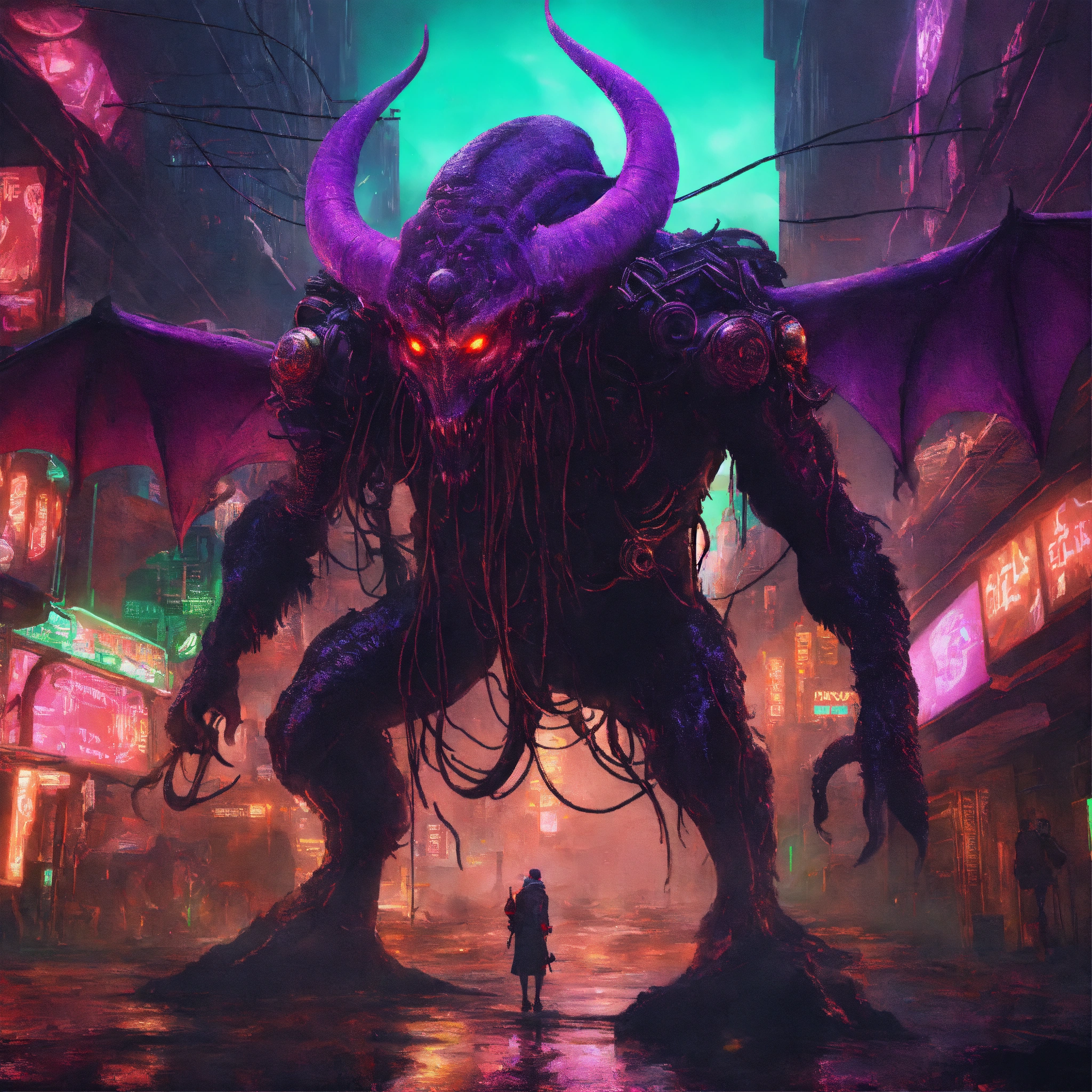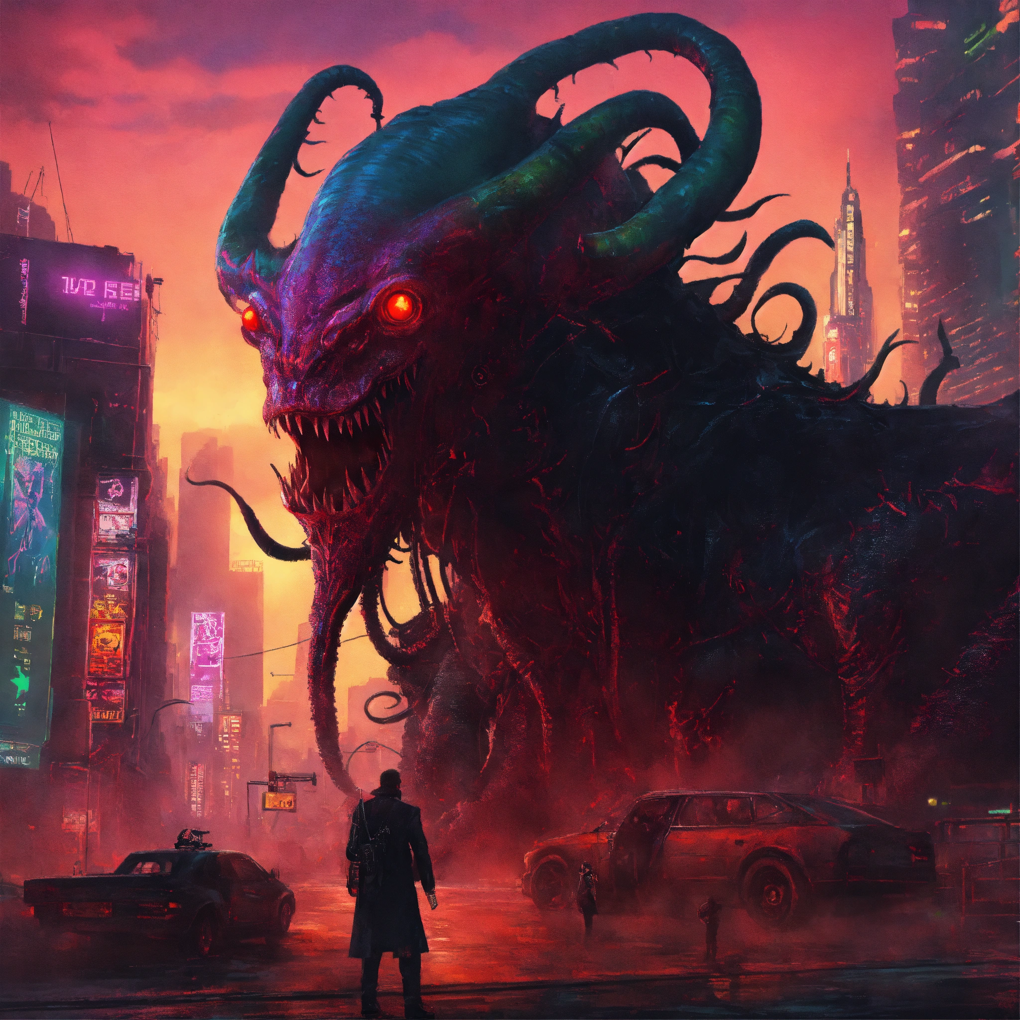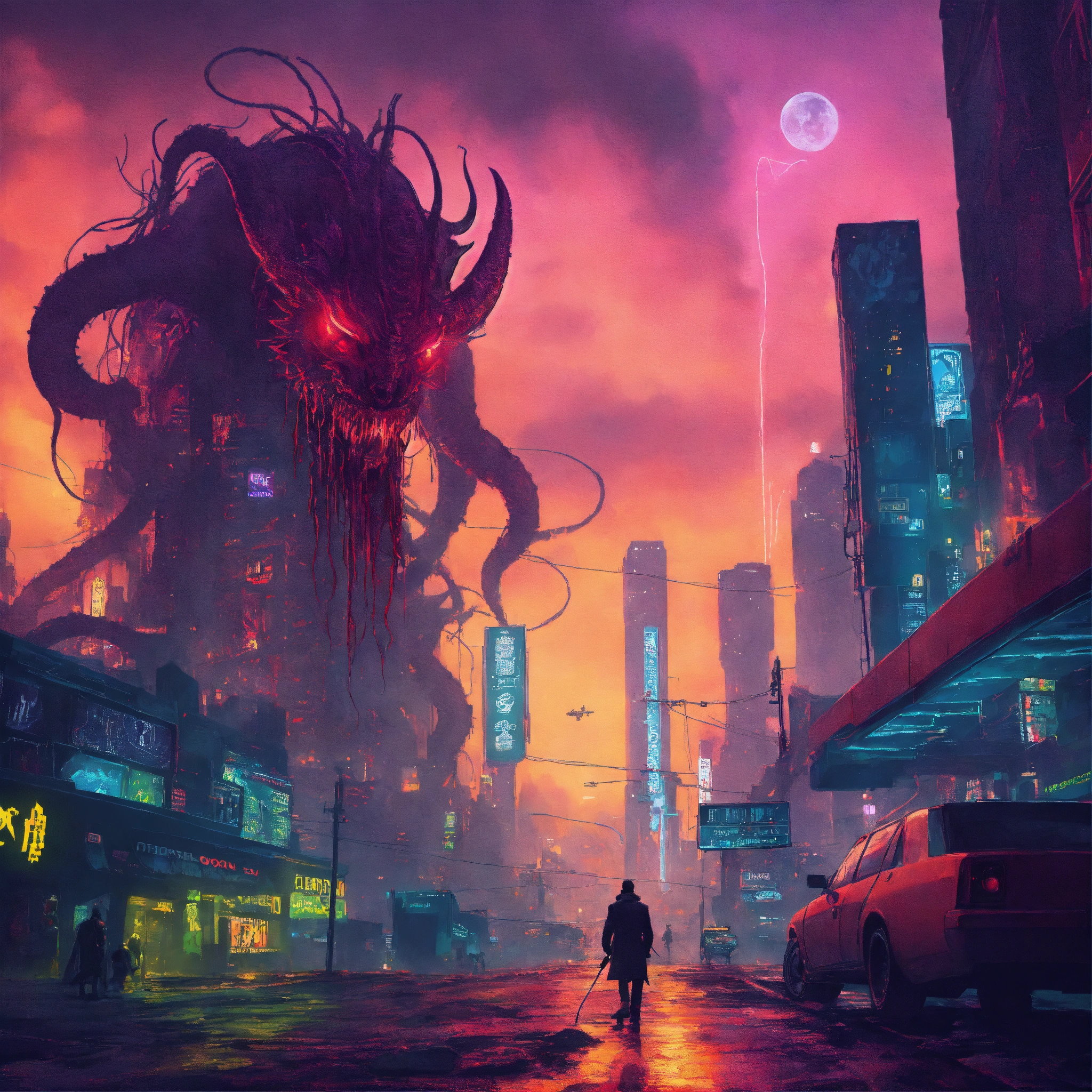 Lovecraftian demon on cyberpunk city
