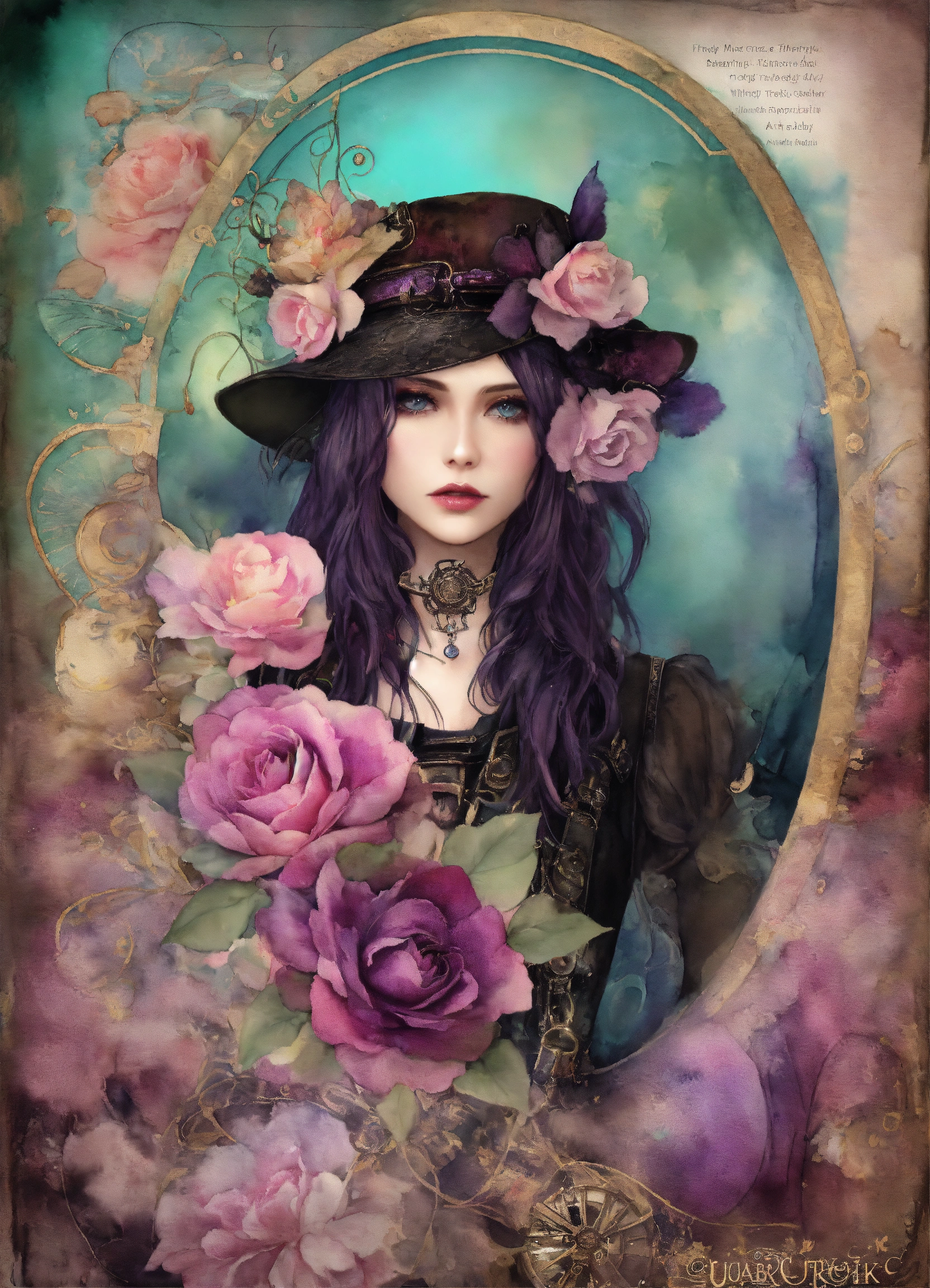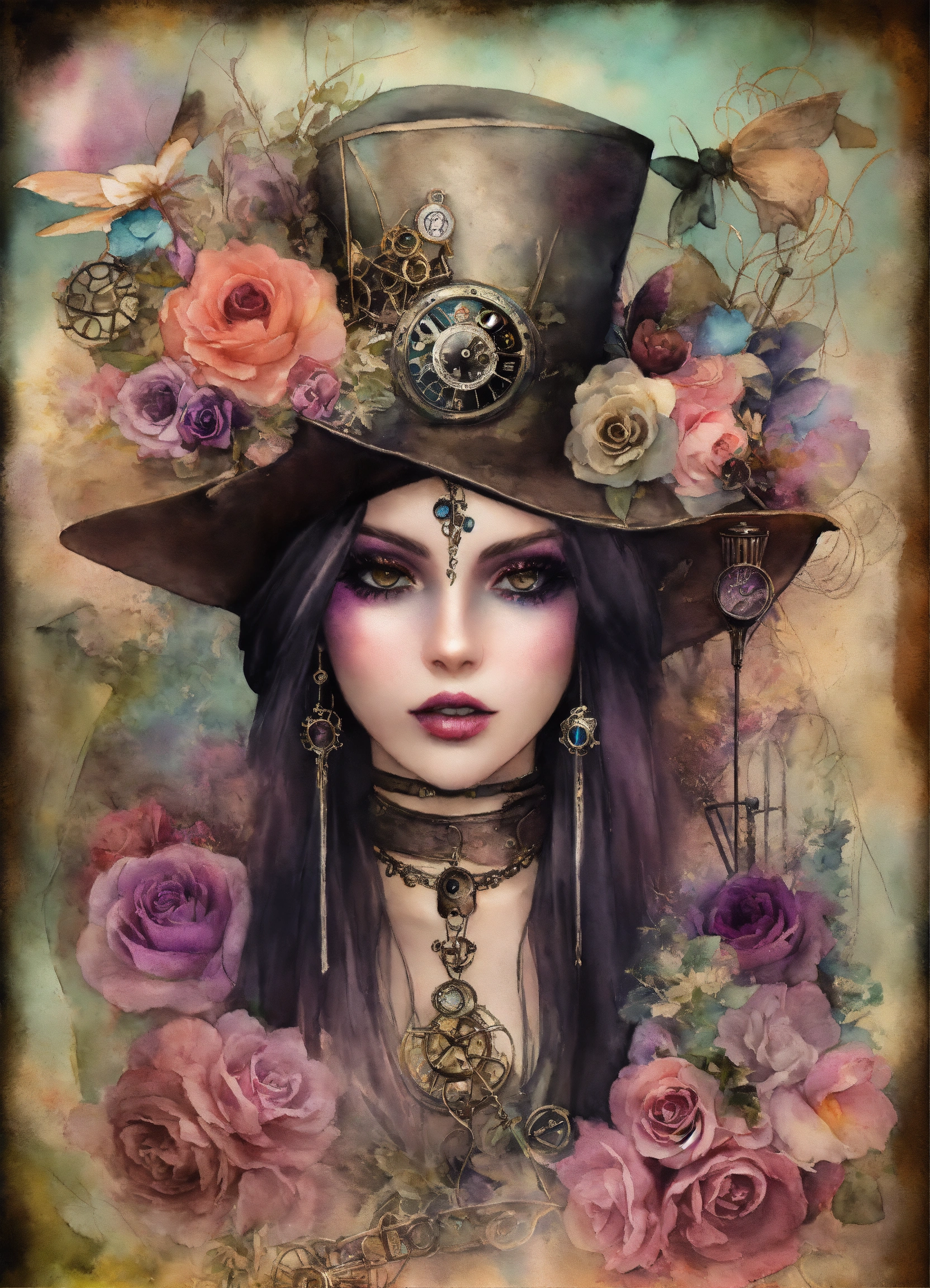 Shabby chic dreamy mist pastel junk journals create detailed watercolor illustrations of goth steampunk subculture goth is a distinctive cultural group with its own customs and aesthetics., each as separate png images suitable for cutting out and using in various paper crafts such as card making, scrapbooking, junk journaling, and more. the digital clipart should capture the essence of gothic fantasy and steampunk aesthetics, offering a versatile resource for creative projects. each subculture goth is a distinctive cultural group with its own customs and aesthetics. should be uniquely designed and easily adaptable to a range of crafting styles. swirling magical fairytale abstract art style
