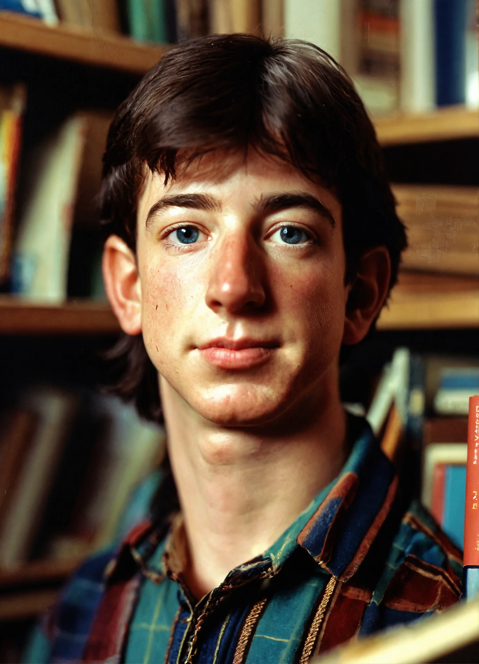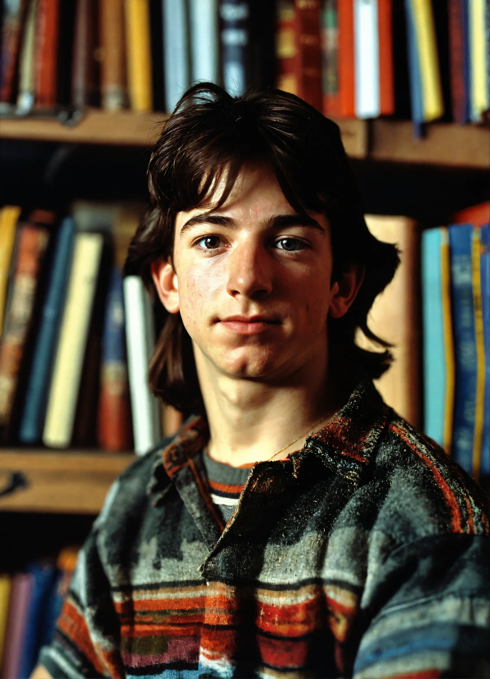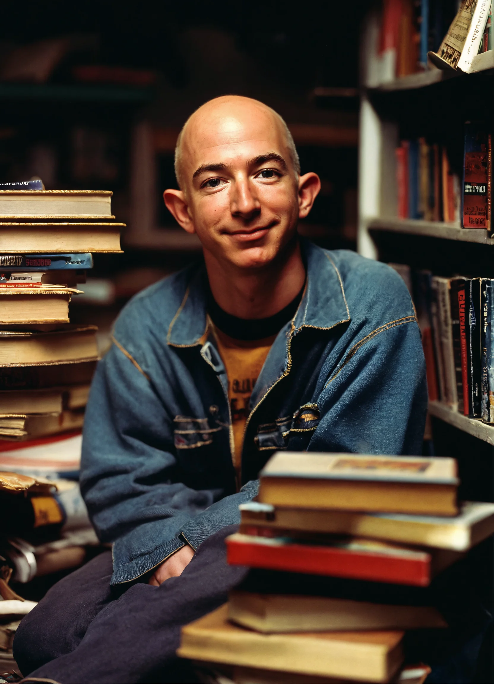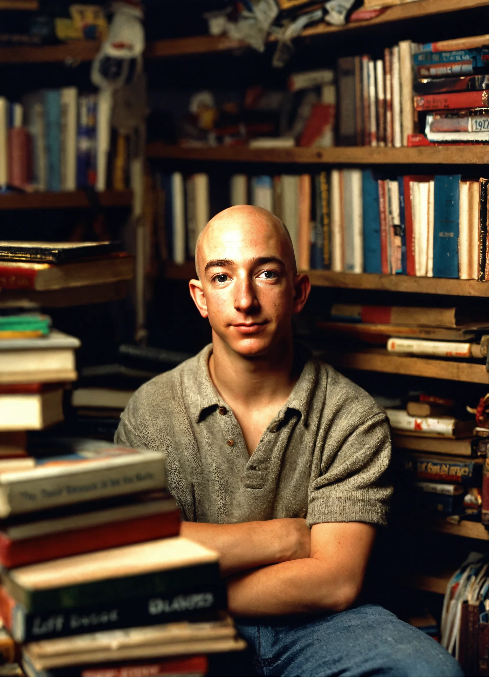 A 1280 px x 768 px photo of the young jeff bezos being twenty-seven years old, chubby face, still with some hair on his head, surrounded by books in his garage, simple casual clothing 1994 style, hyper-realistic.