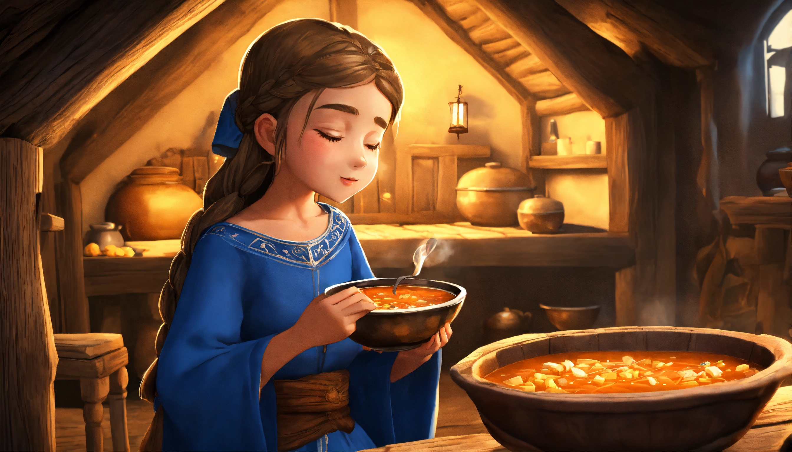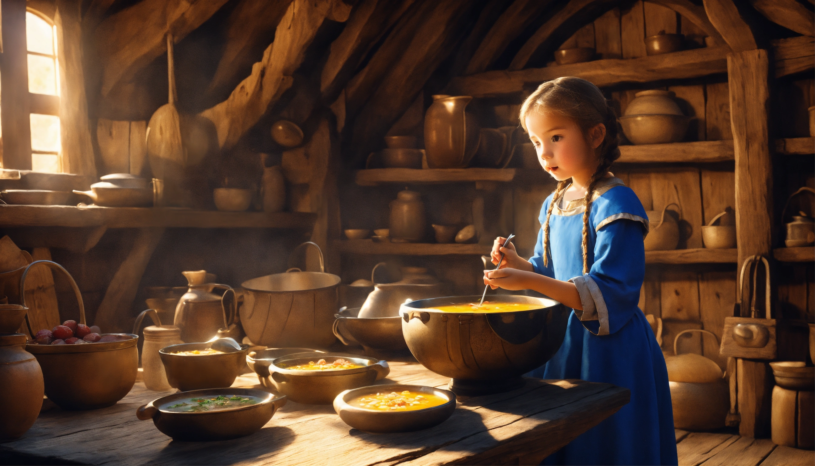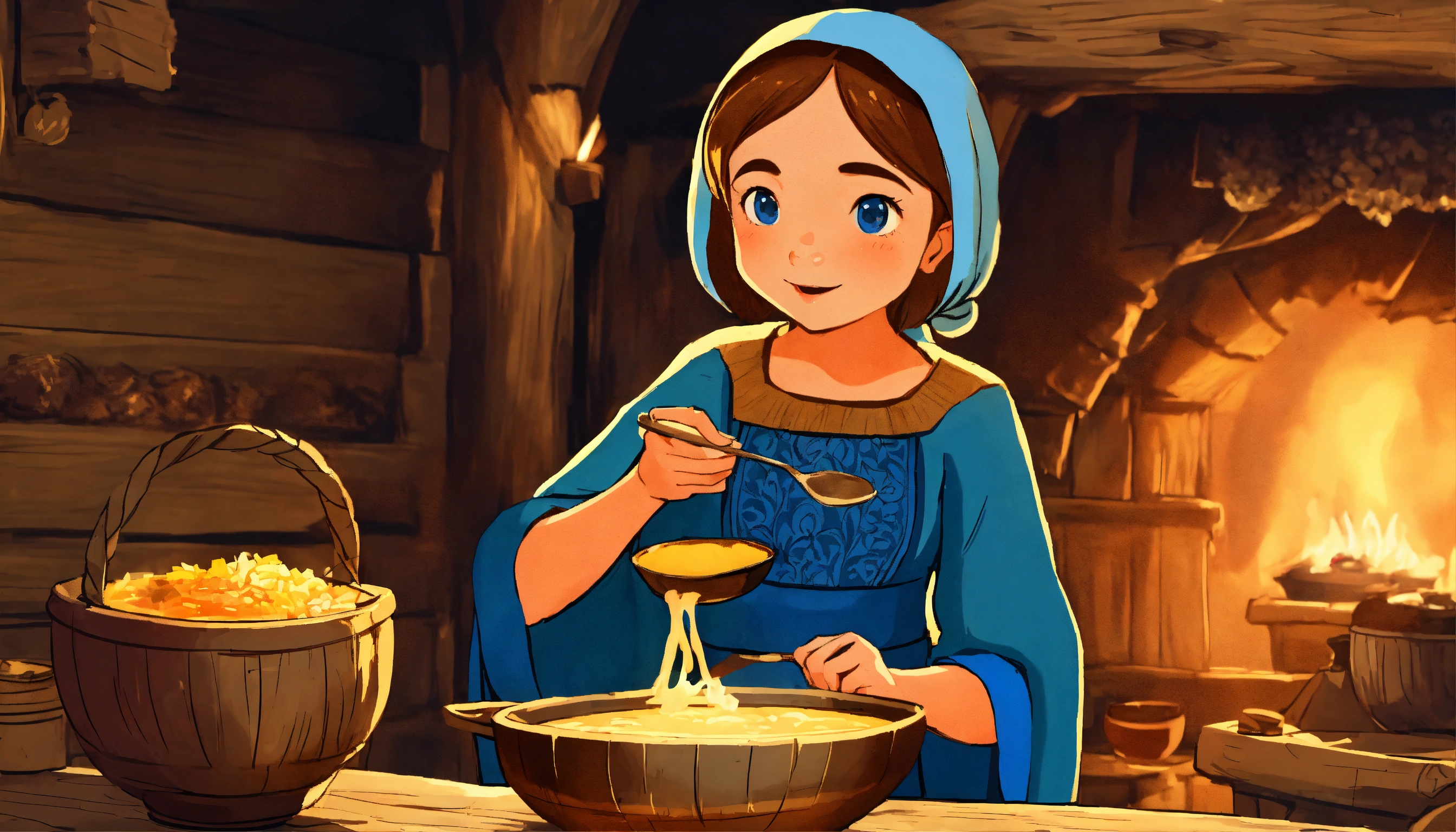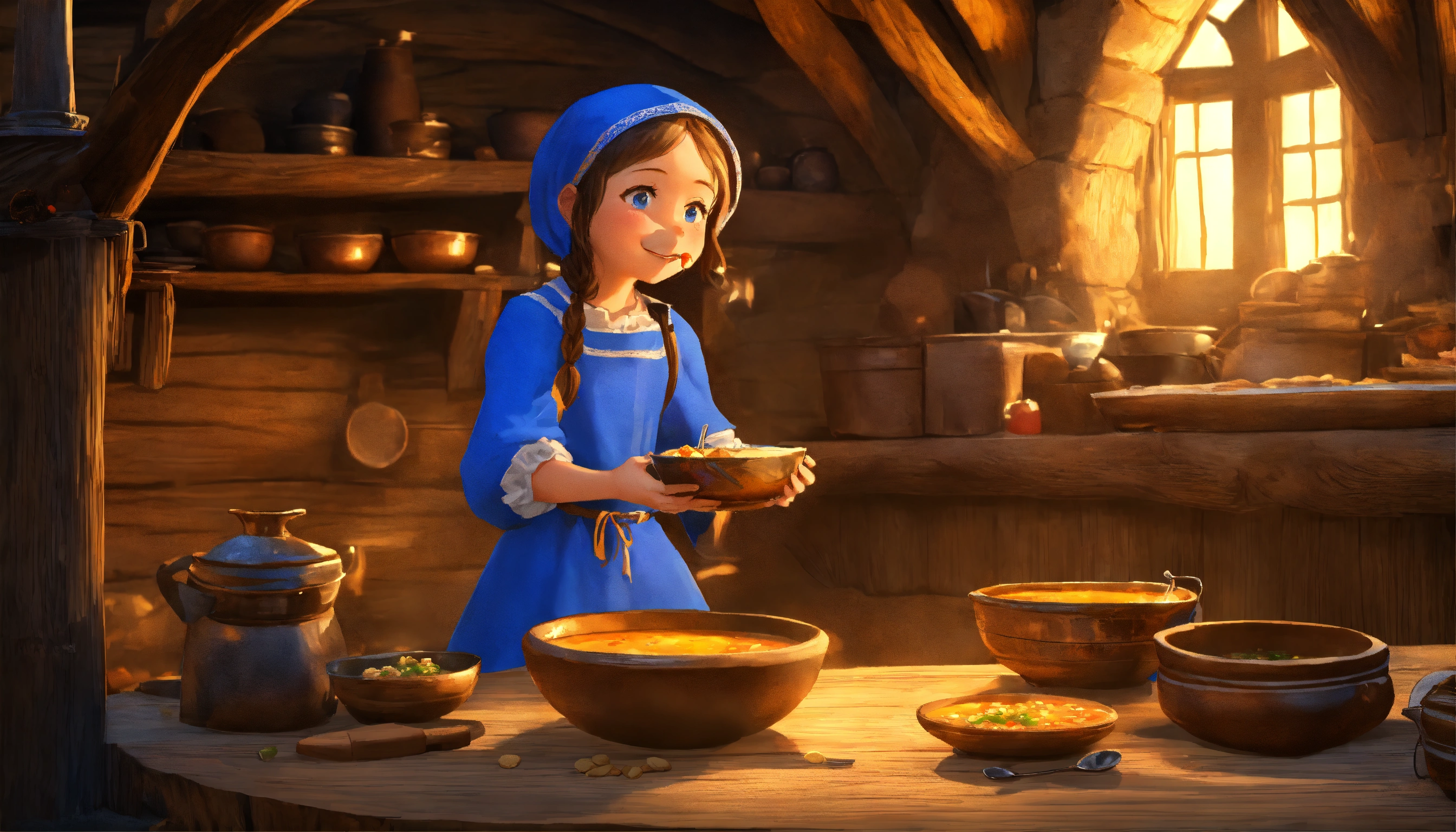 A cartoon-style ten-year old girl in a medieval slavic blue dress is eating a soup from the huge bowl in the medieval kitchen hut