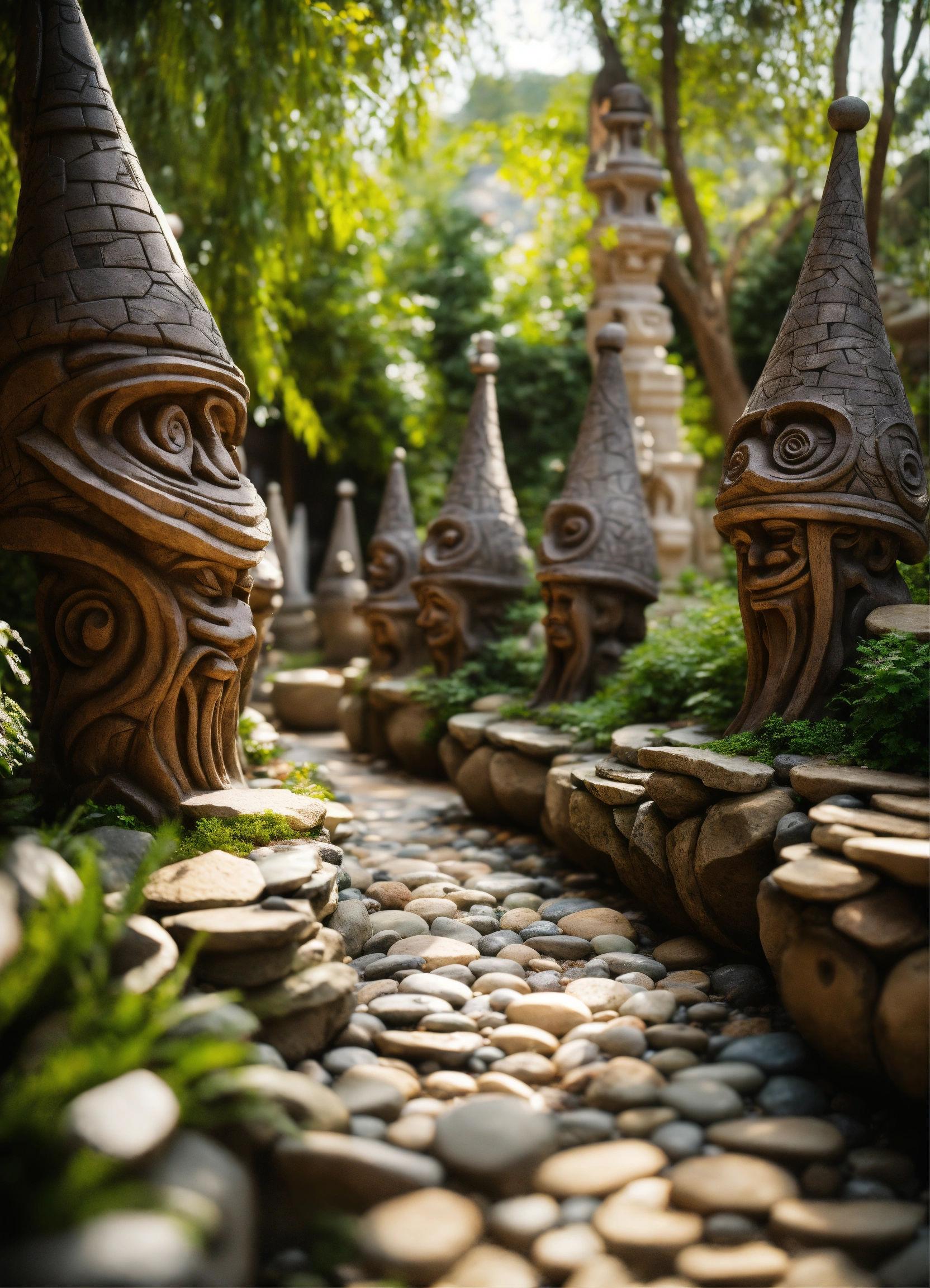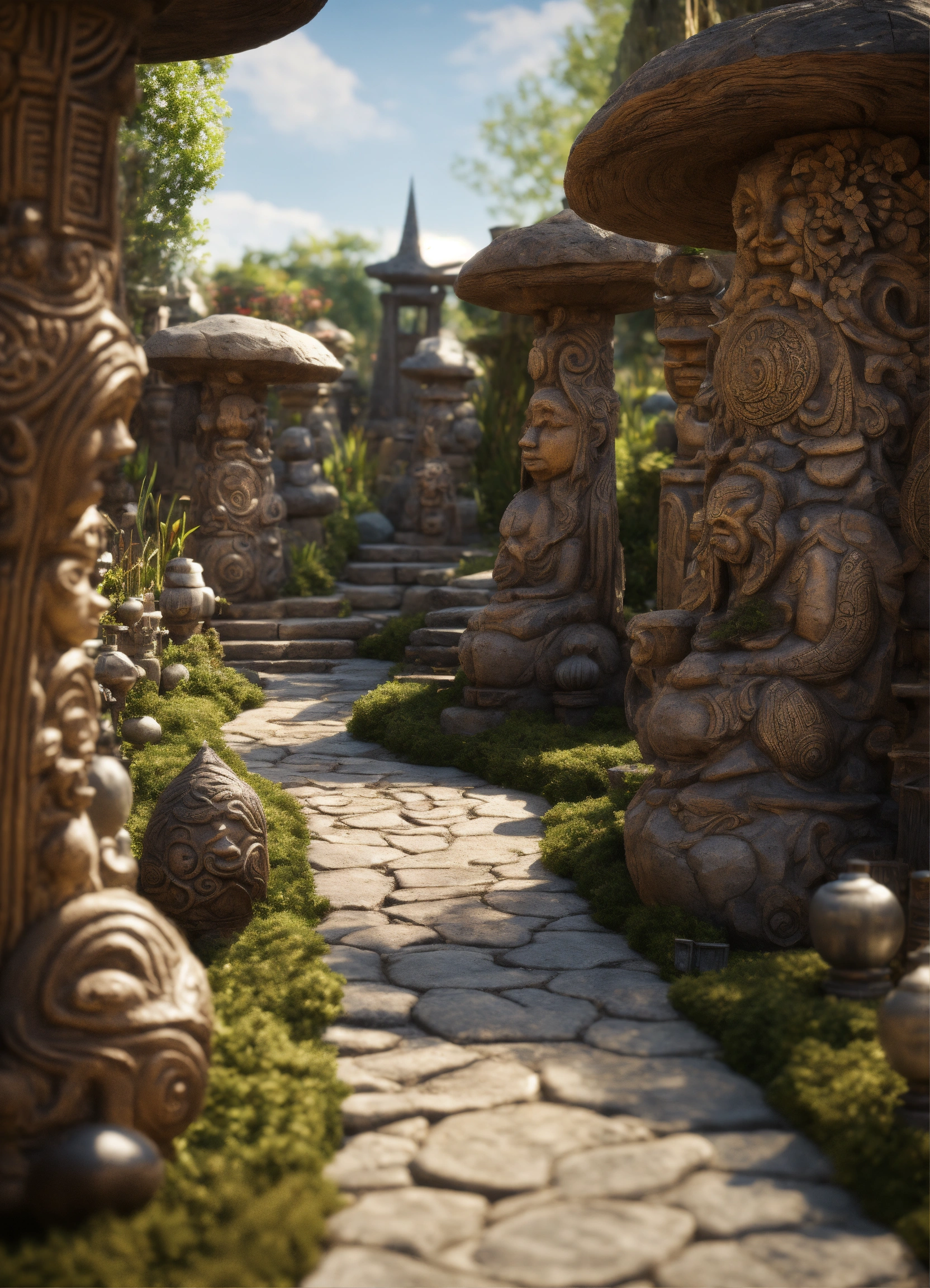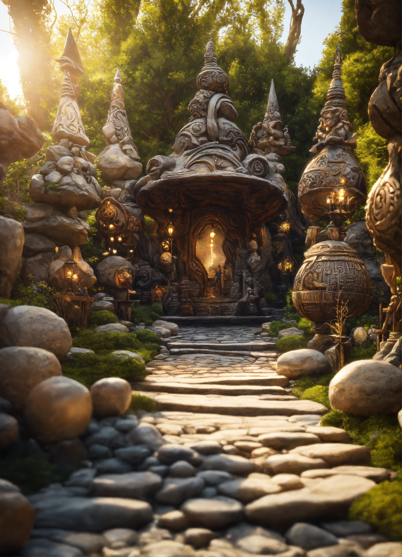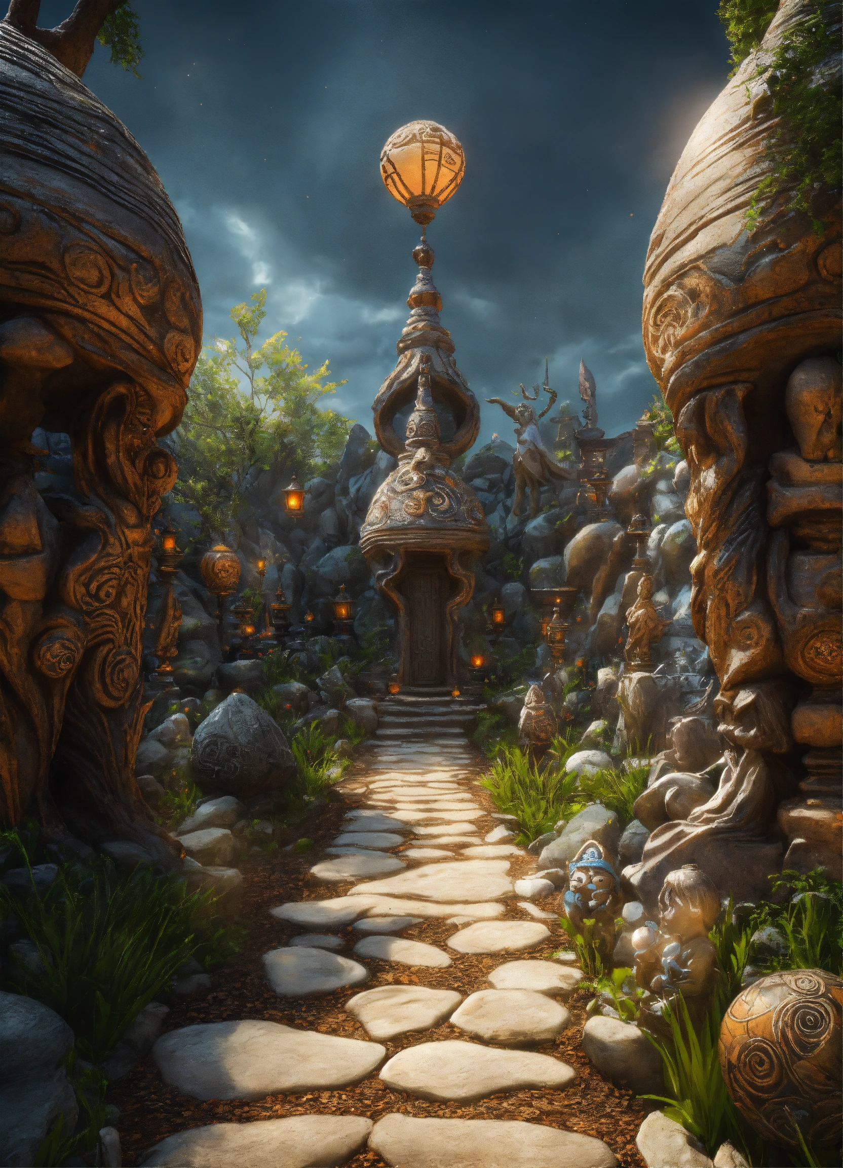 An ancient spiritual gnomes stone pathway rock garden.sculptured . style of alex grey, giger.unreal engine.totem sculptures.swirling patterned stone pathway courtyard.wood.stone.driftwood.statues. artistic sculpture.lanterns.