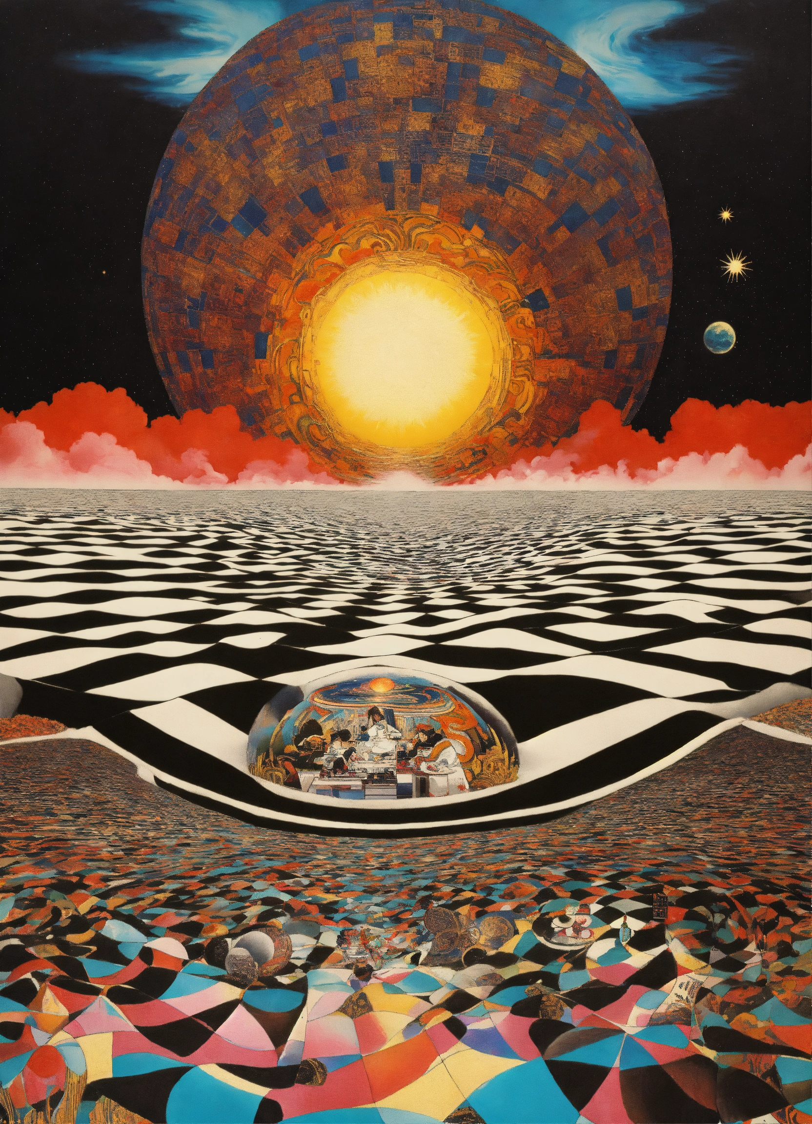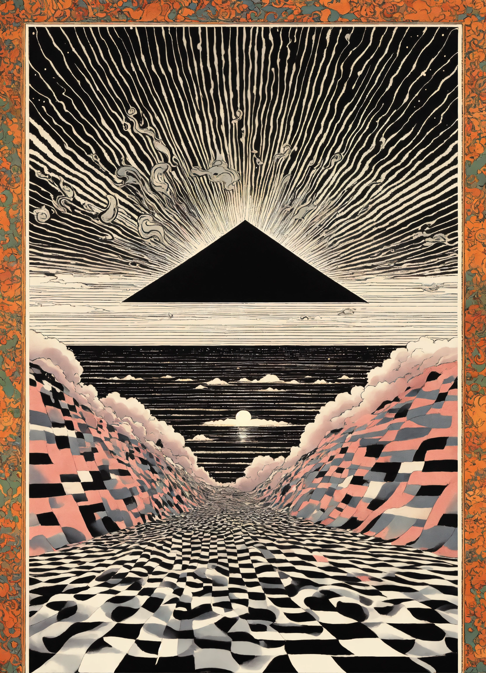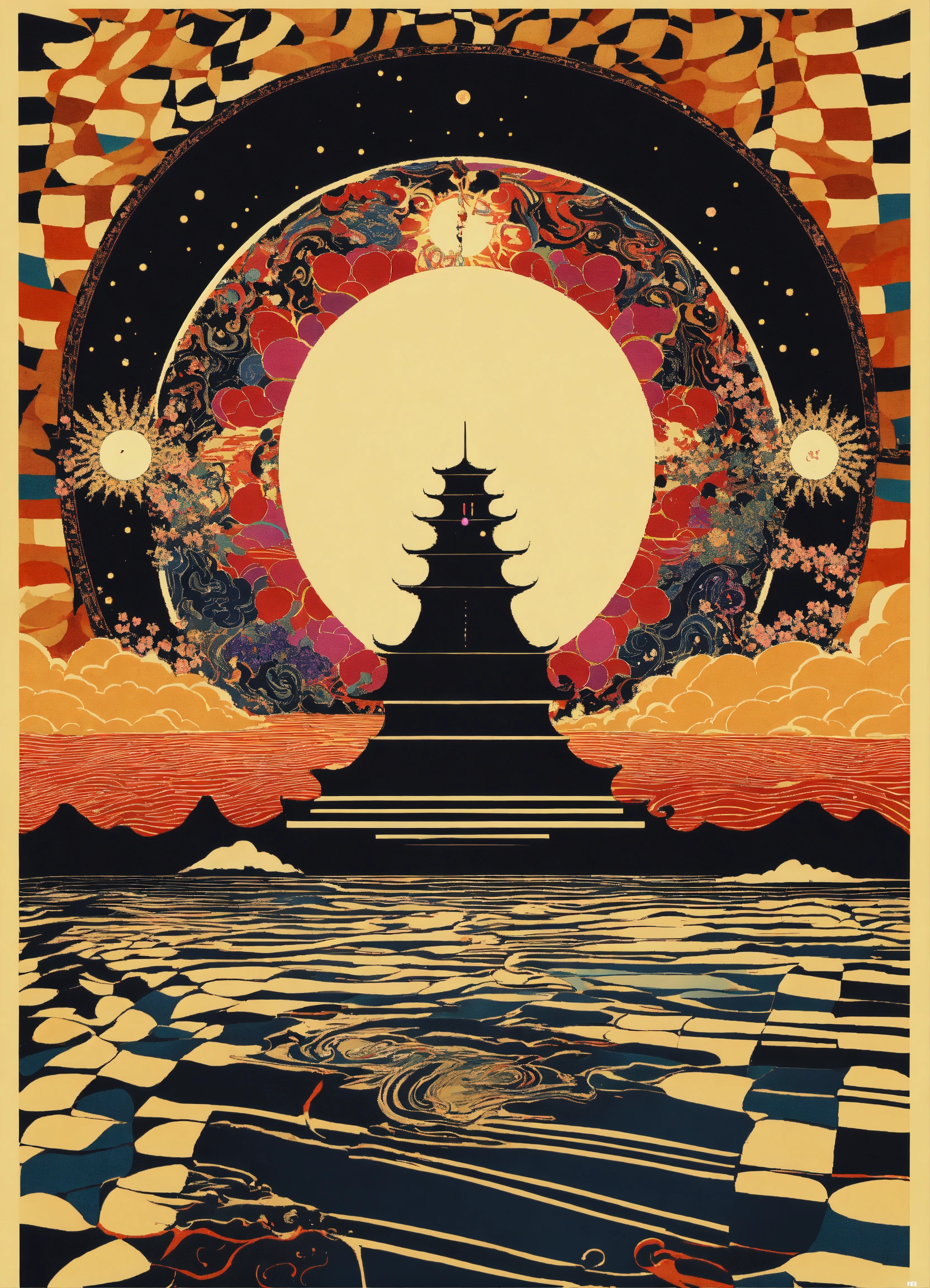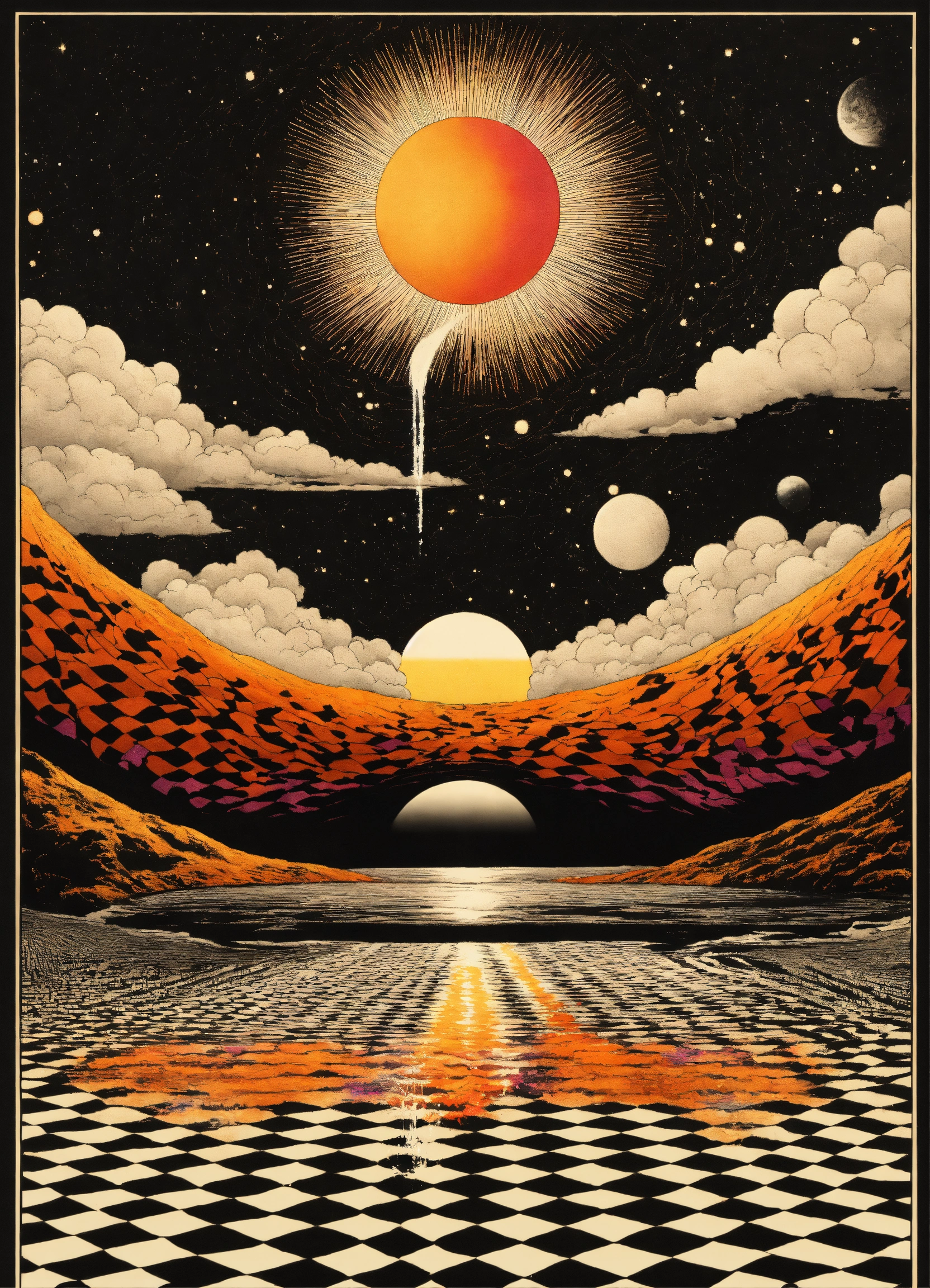 Japanese vintage poster, oriental, psychedelic cosmic realm, dream dimension merging into nebula merging into sun, geometrical clouds, the four corners of the earth, wavy black and white checkerboard patterns dripping by victor-jesus escobedo
