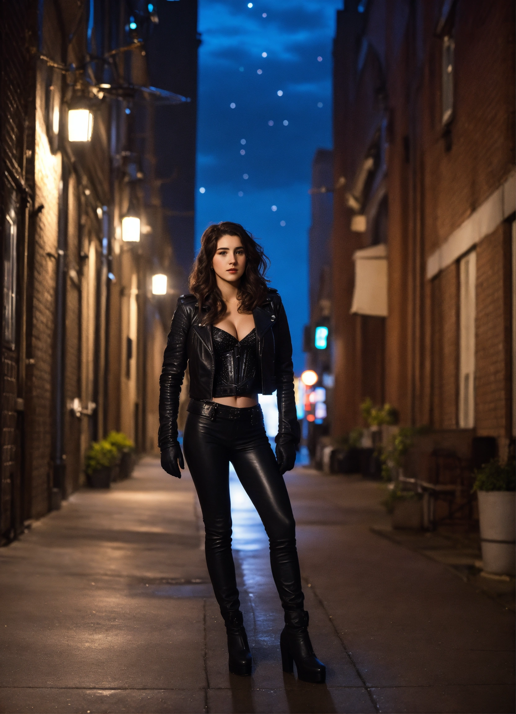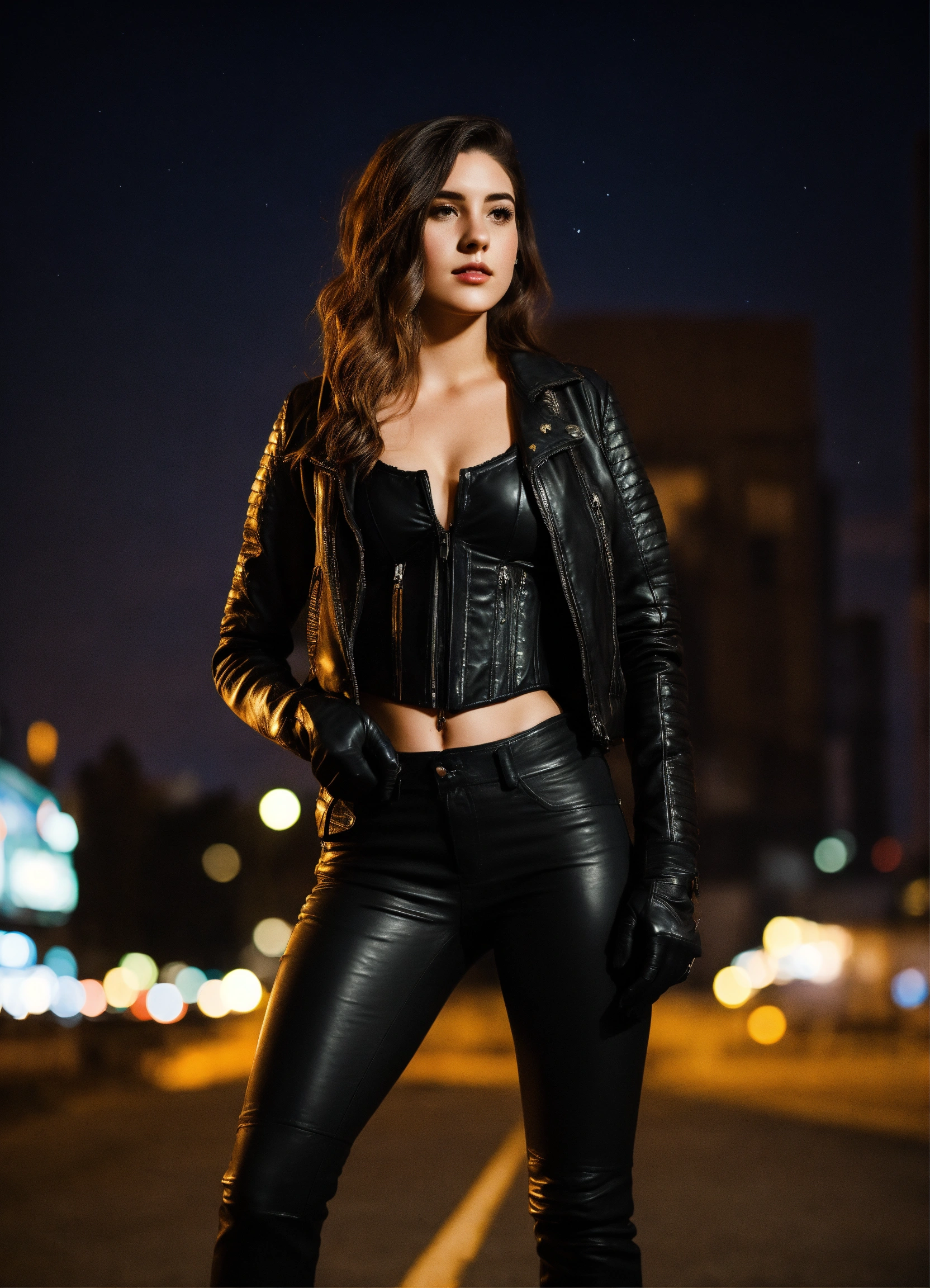 A real photo of a 25 year old woman with looking like a real version of nancy wheeler, wearing black leather jacket pants corsets and gloves. urban background in the sky we see stars. full body at night.