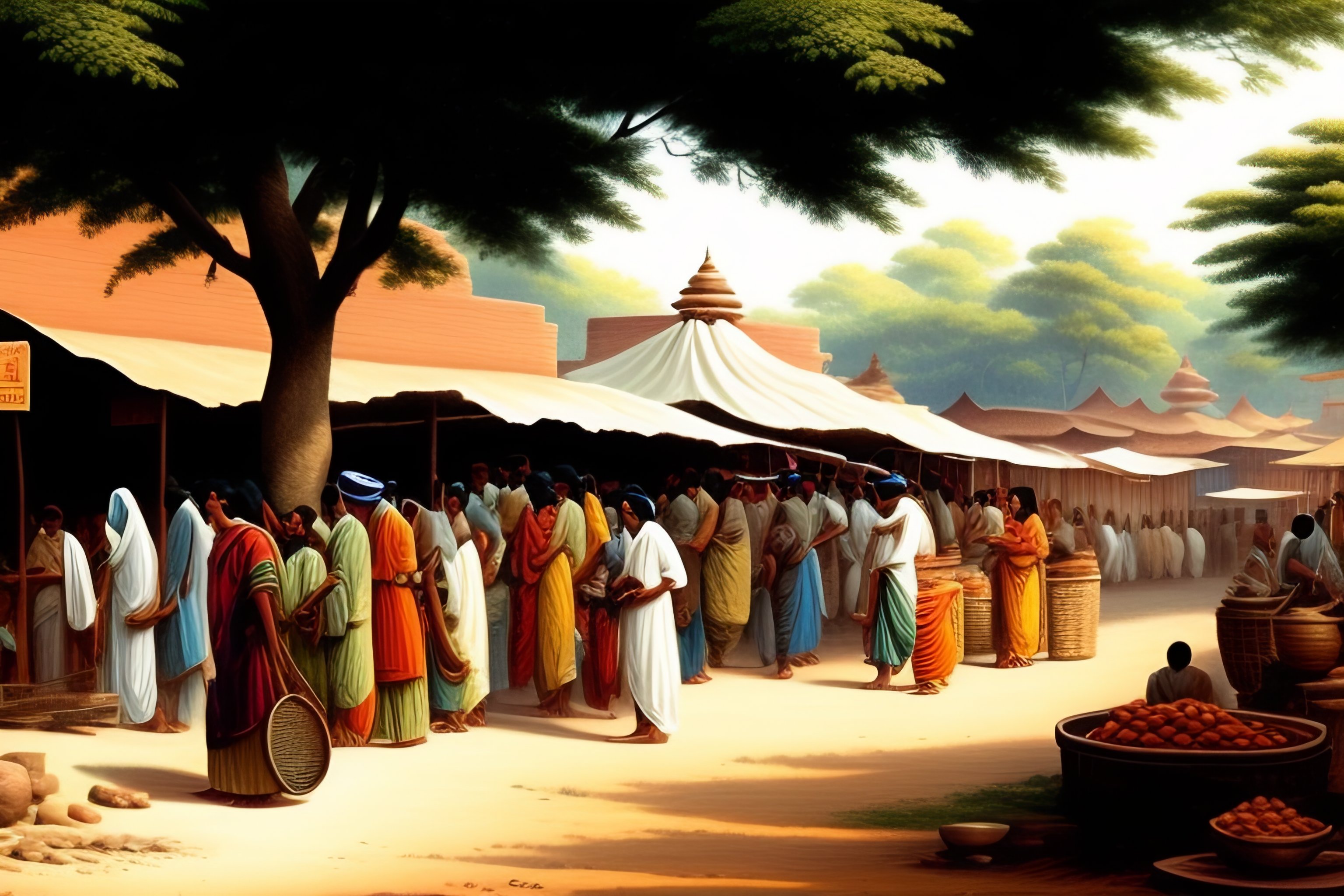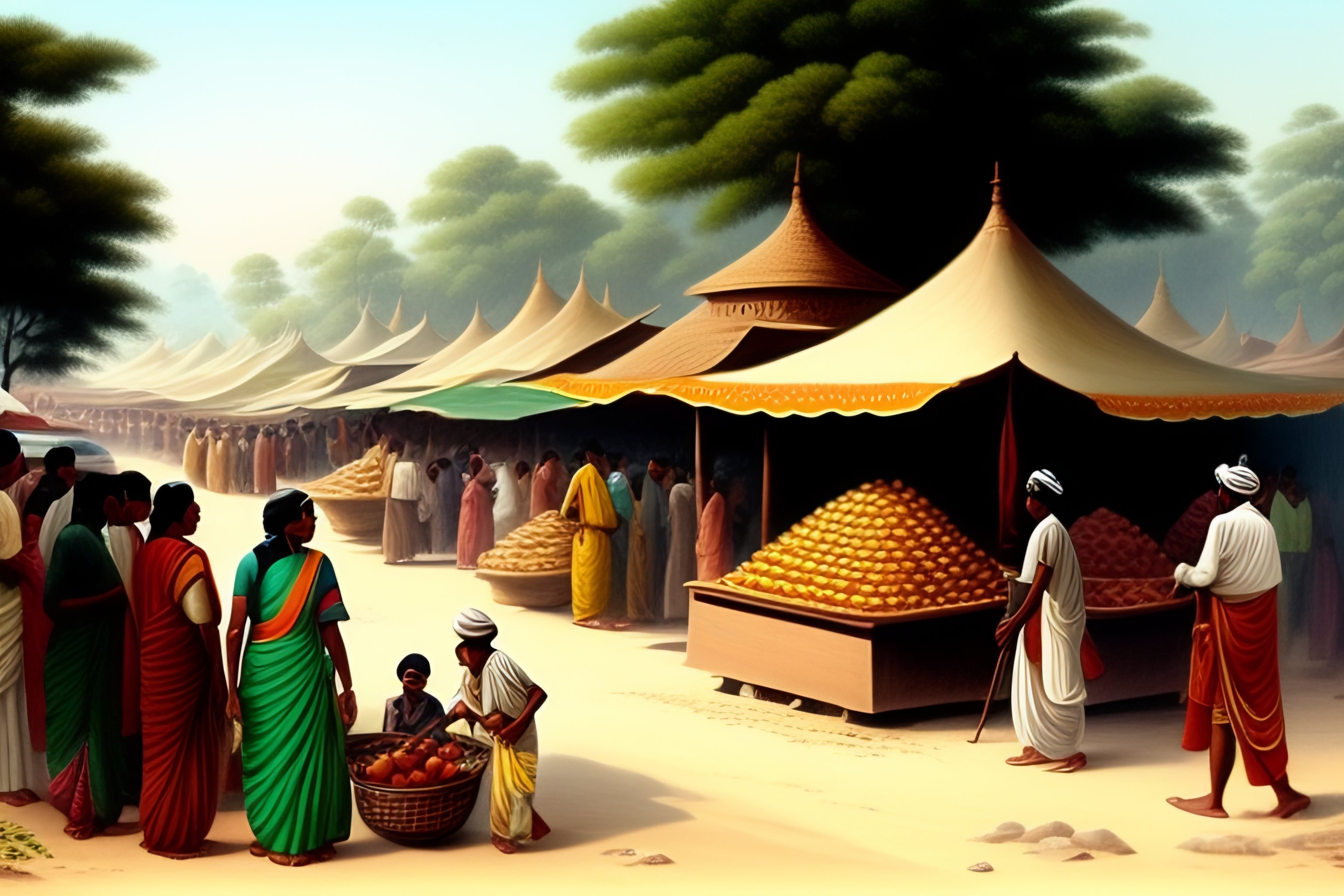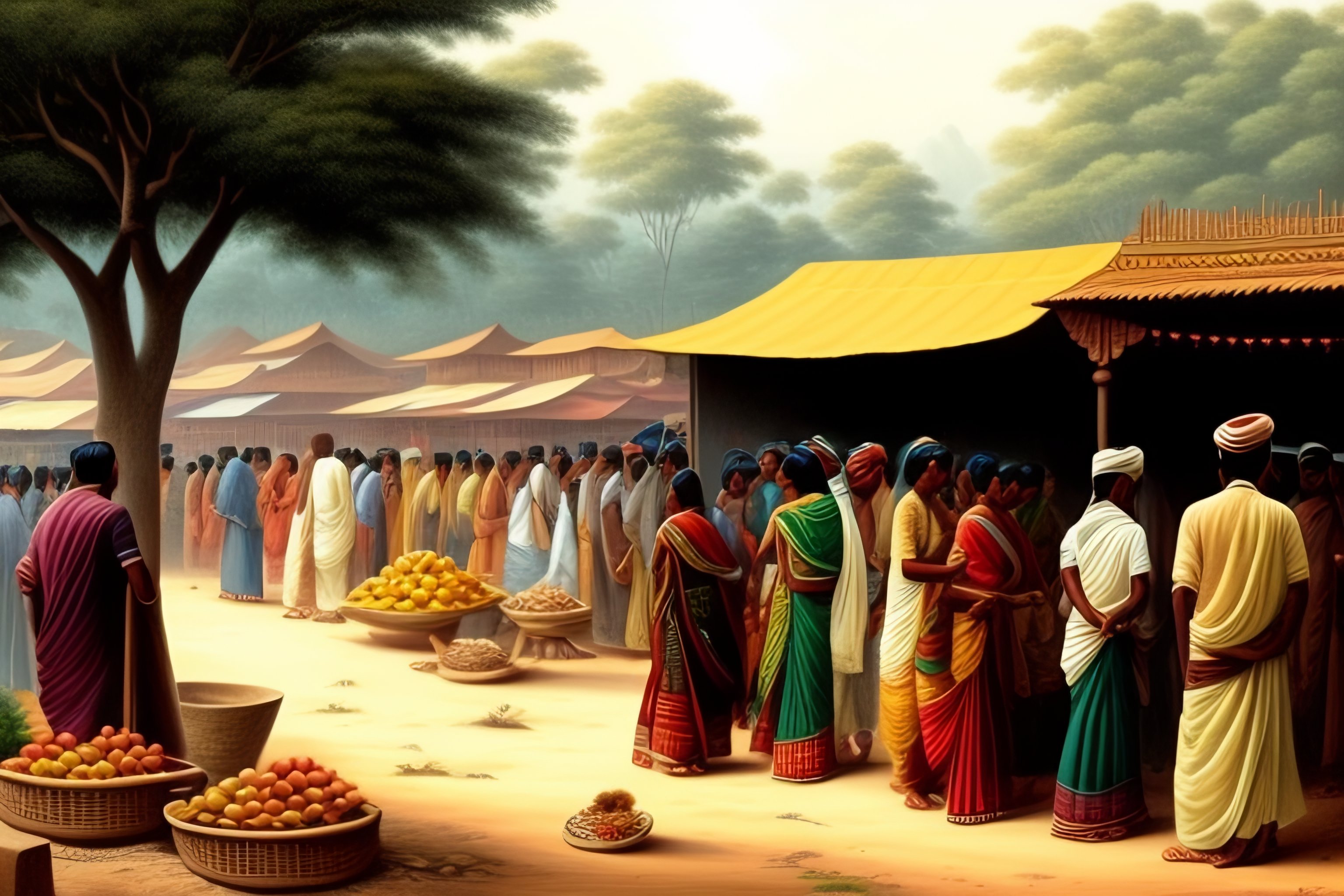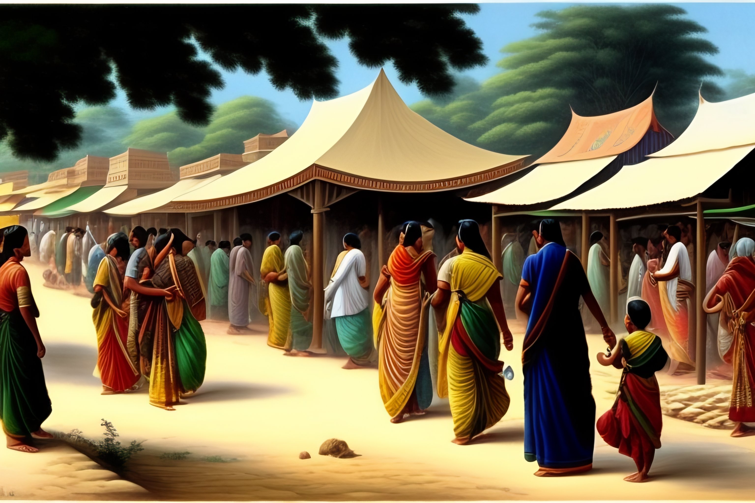 Nandalal bose style drawing of a busy indian village market