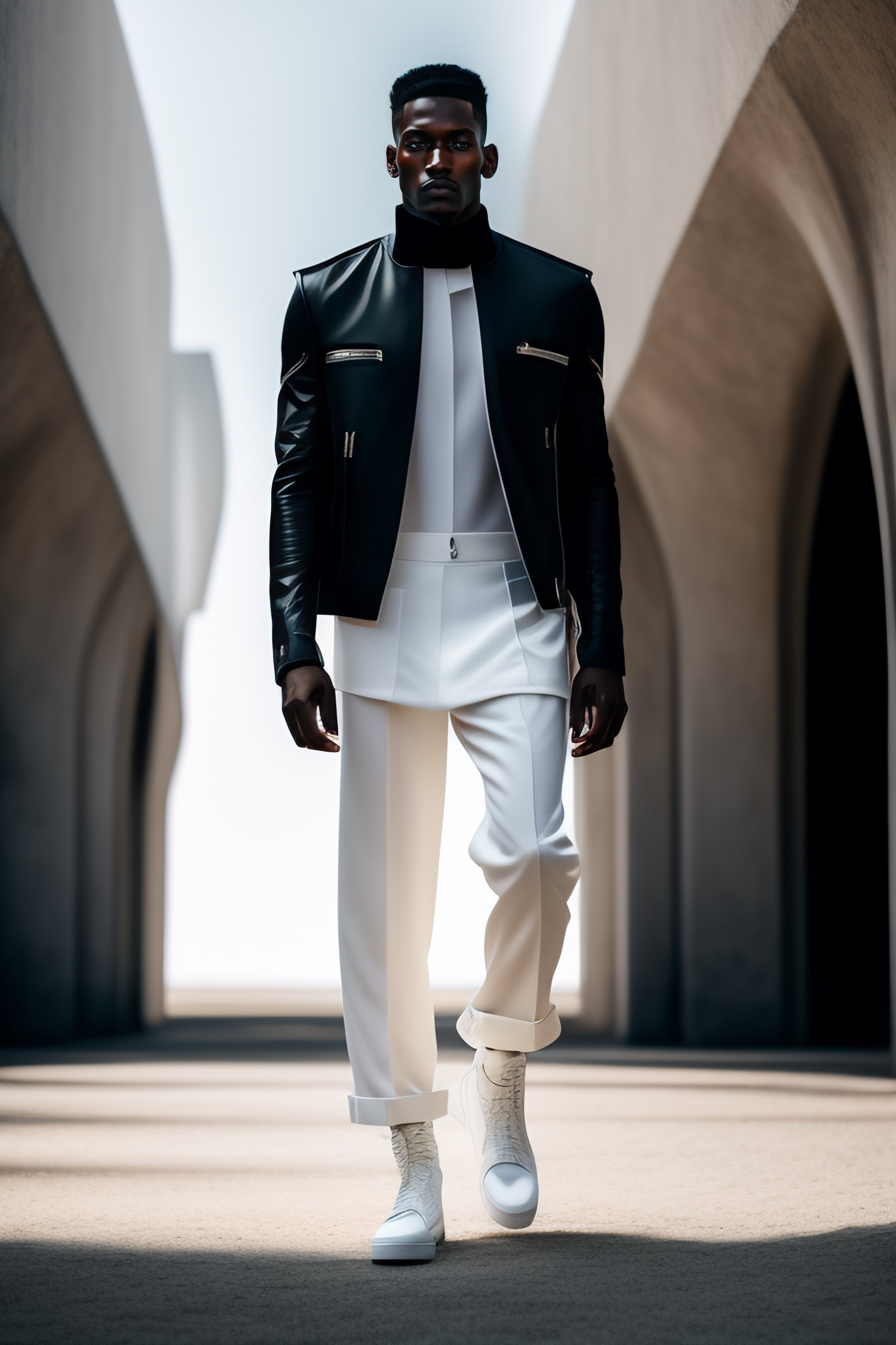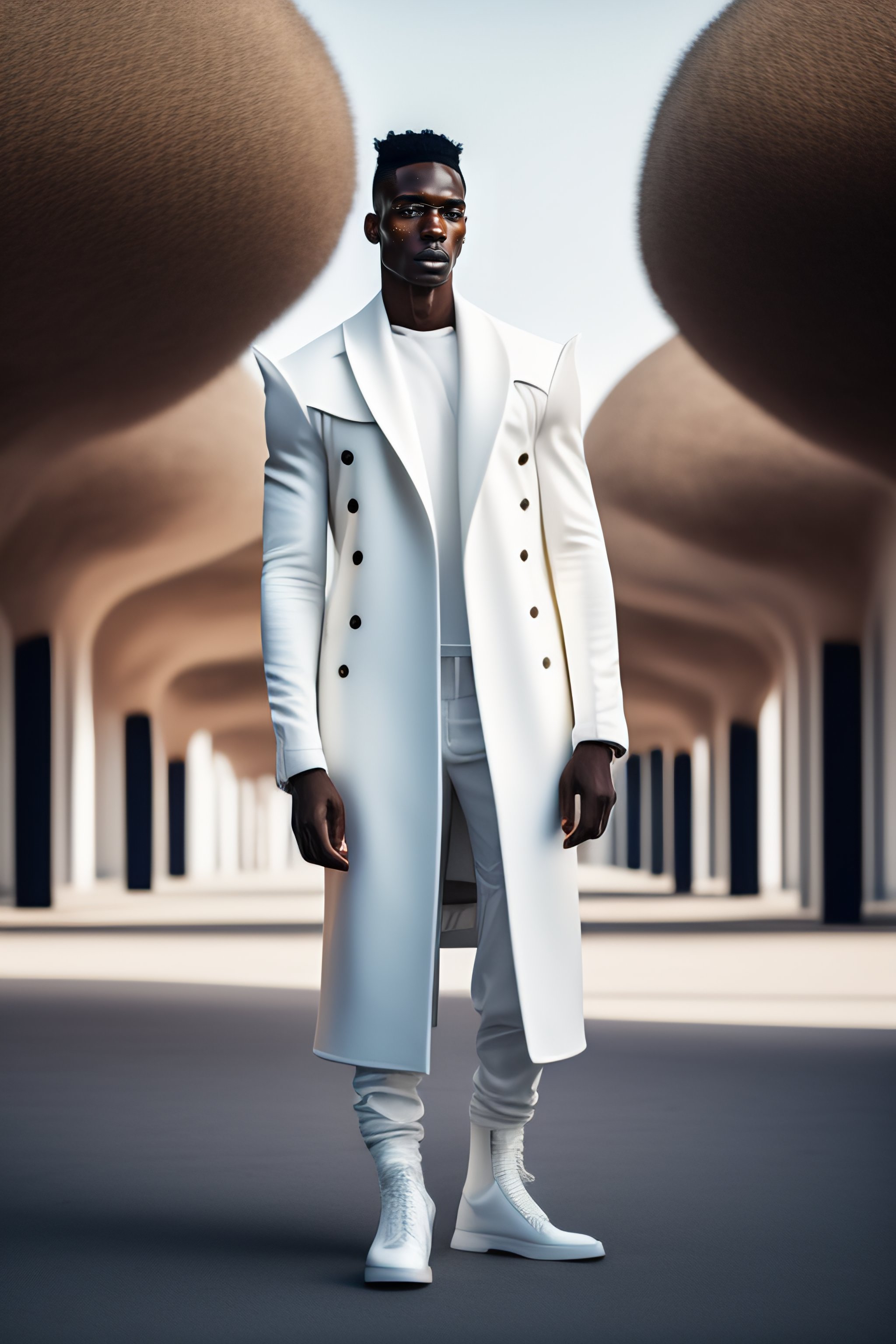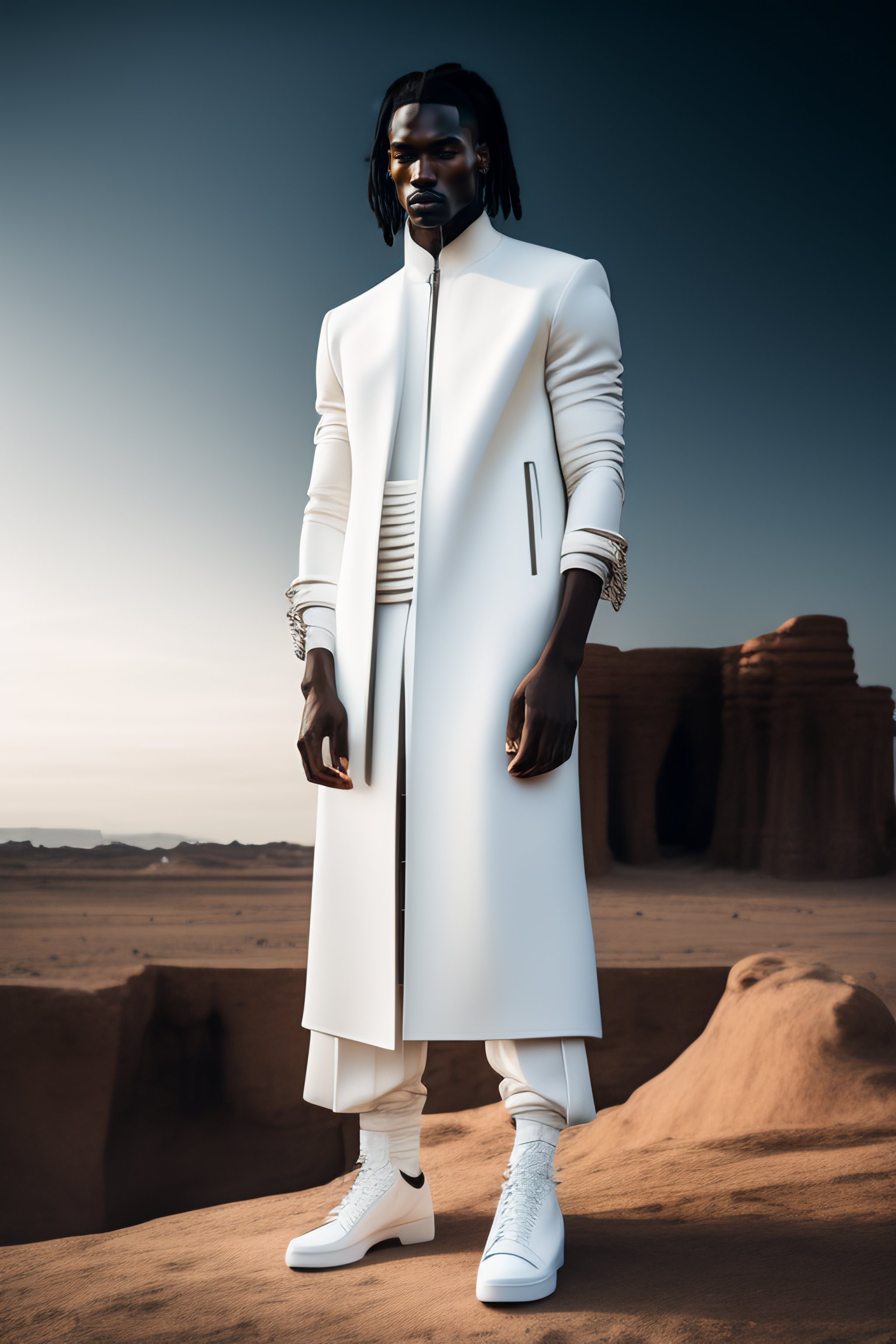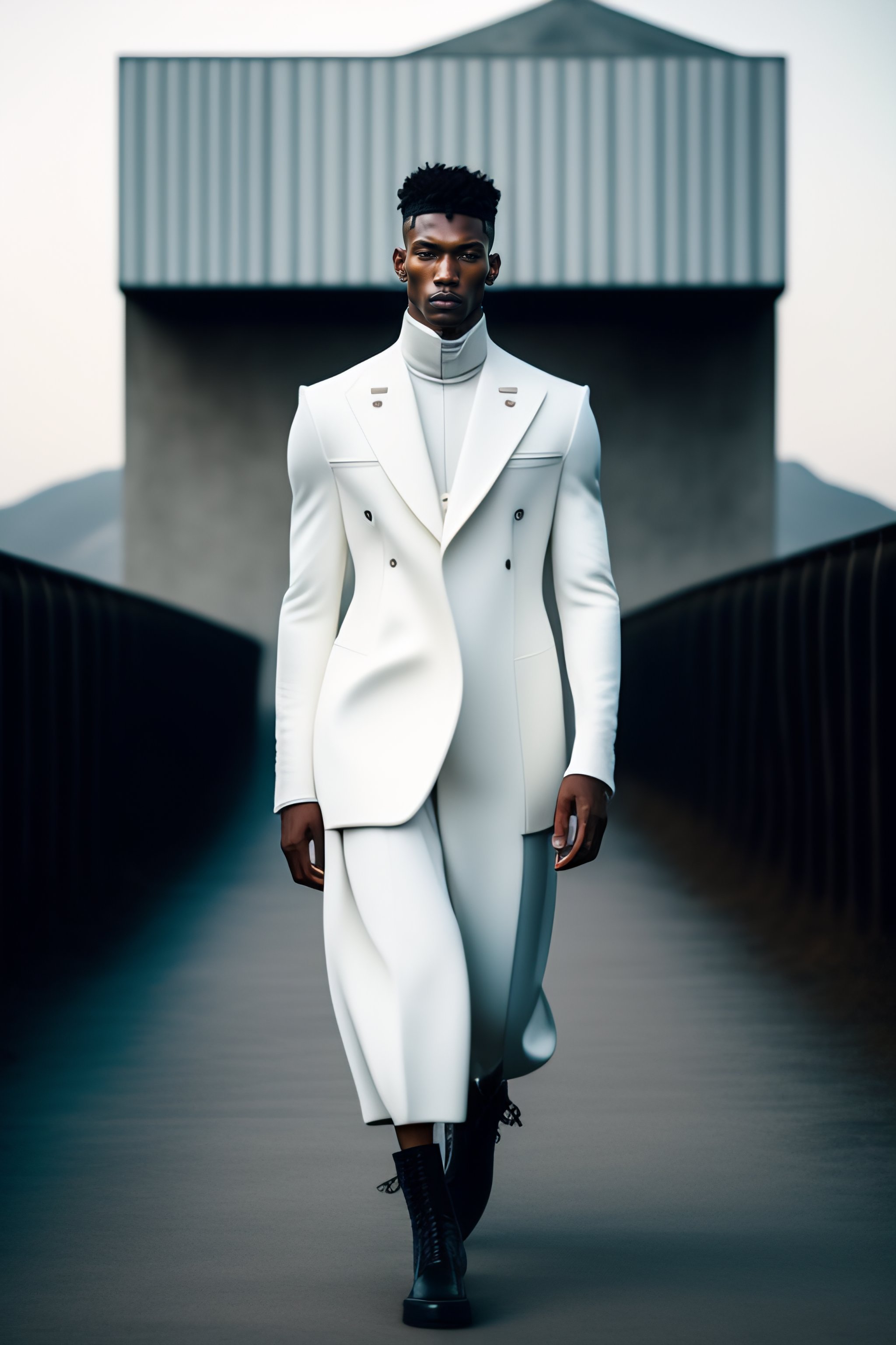 Ultra hd! editorial, rick owens, man model, white and chrome, structured outfit, platform shoes, iso 400, surrealistic, 8k, full frame, landscape, architecture