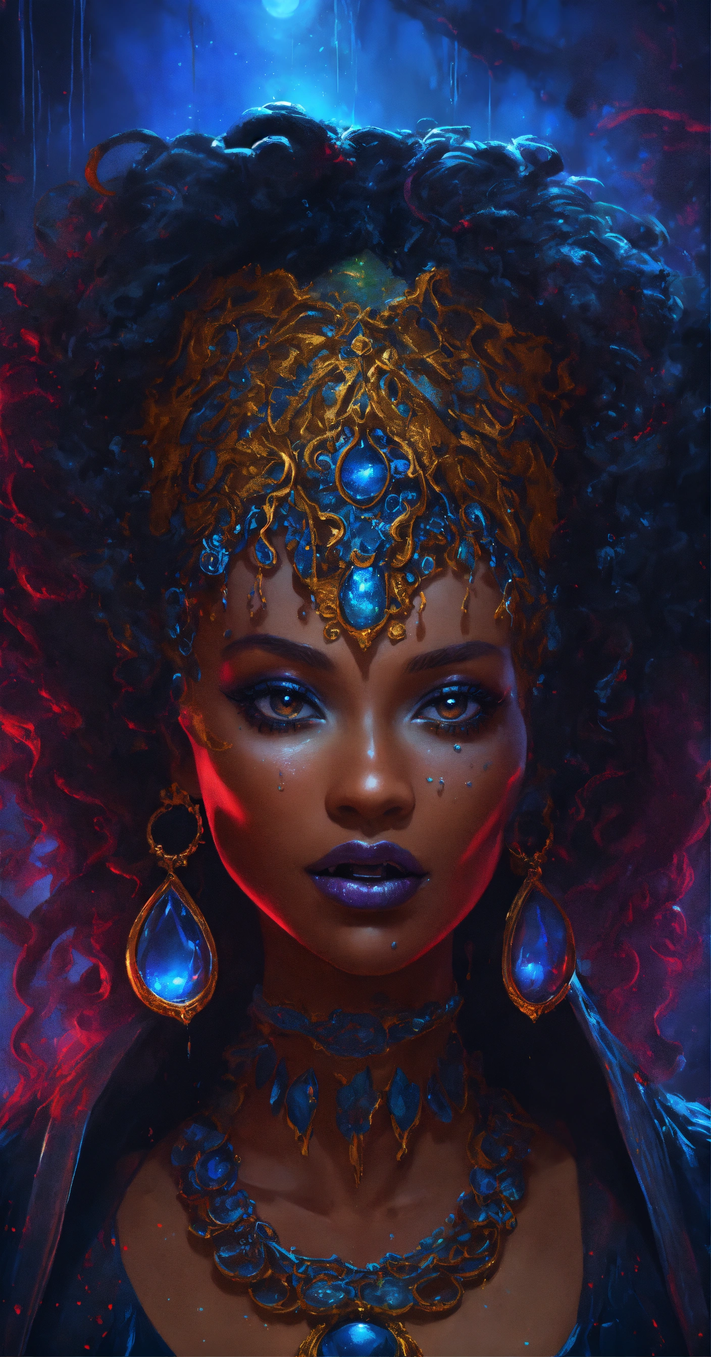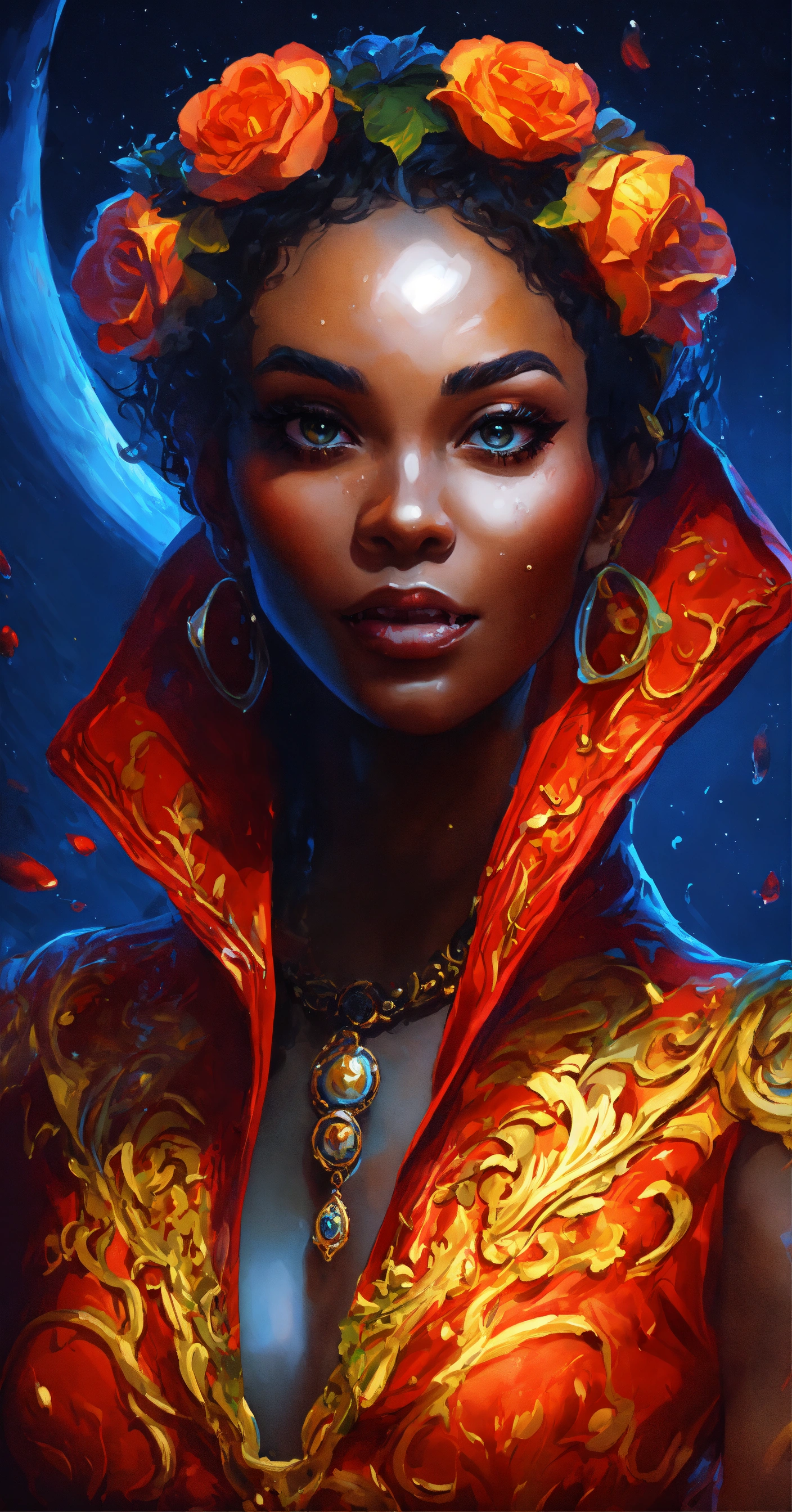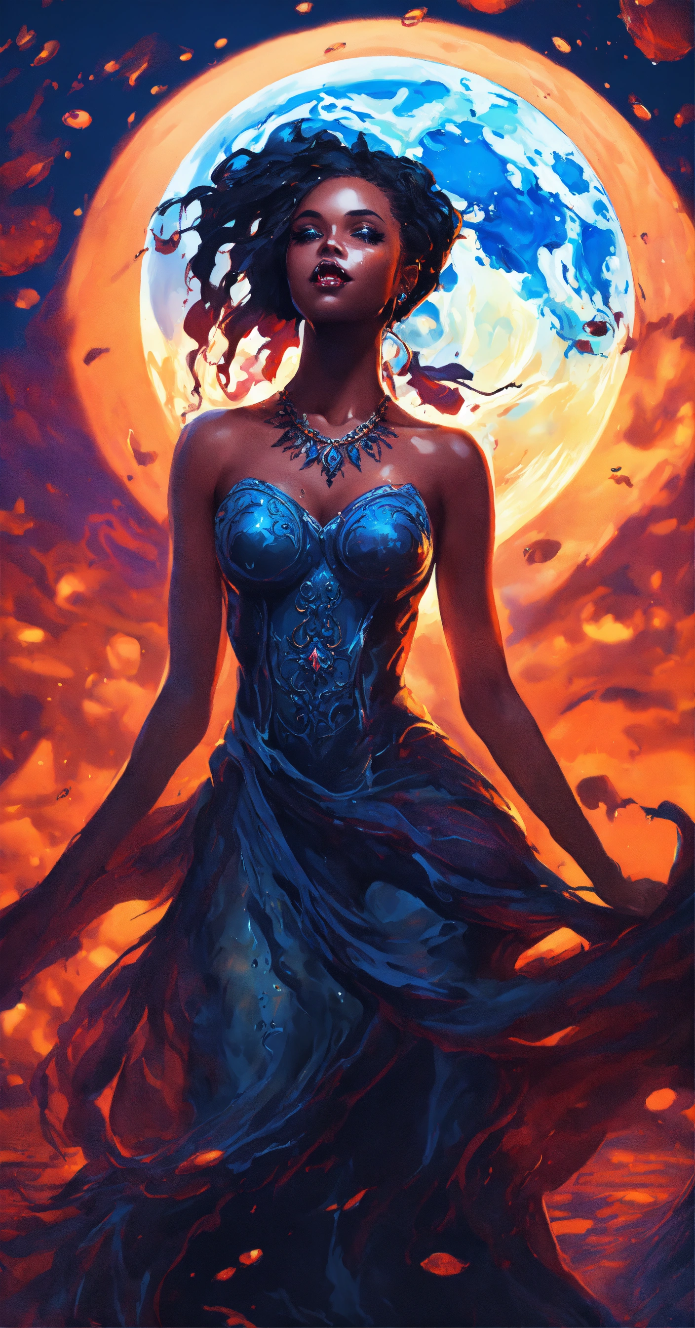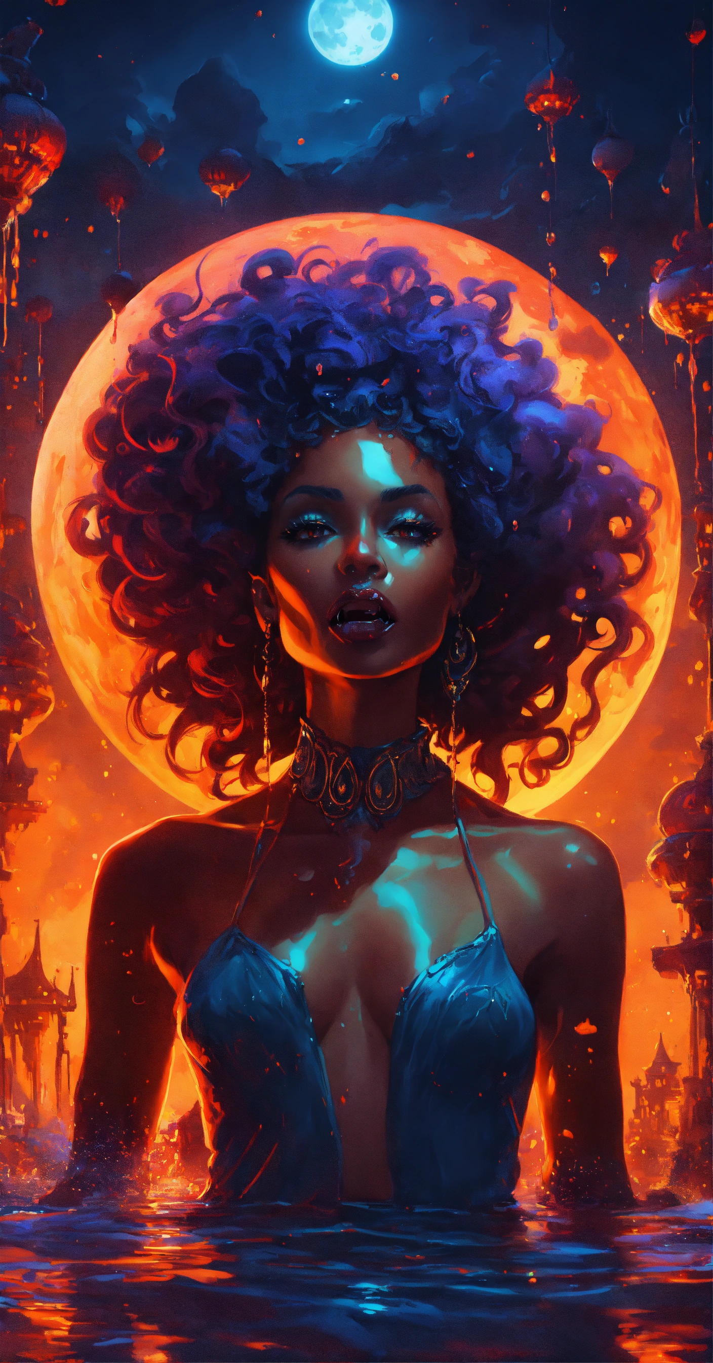 Splash art, a quirky liquid portrait of a hauntingly beautiful black vampire woman with fangs, splash style of paint, pixar style, halloween colors, hyper detailed intricately detailed, fantastical, intricate detail, splash screen, liquid, gooey, slime, splashy, fantasy, concept art, 8k resolution, masterpiece, melting, complex background, intricate detailed, dark colors, fantasy, concept art, digital art, intricate, oil on canvas, masterpiece, expert, insanely detailed, 8k resolution. full blue moon background at night