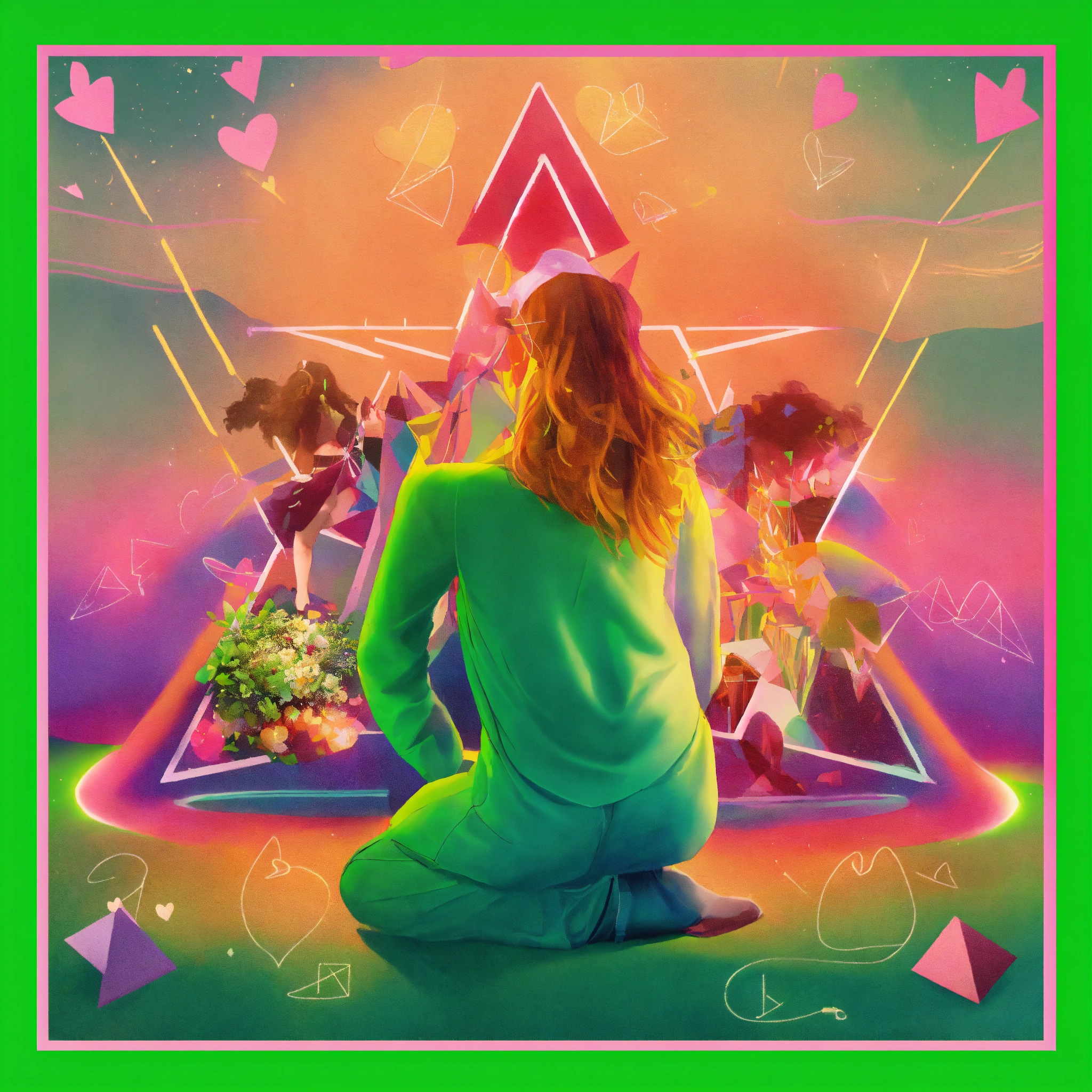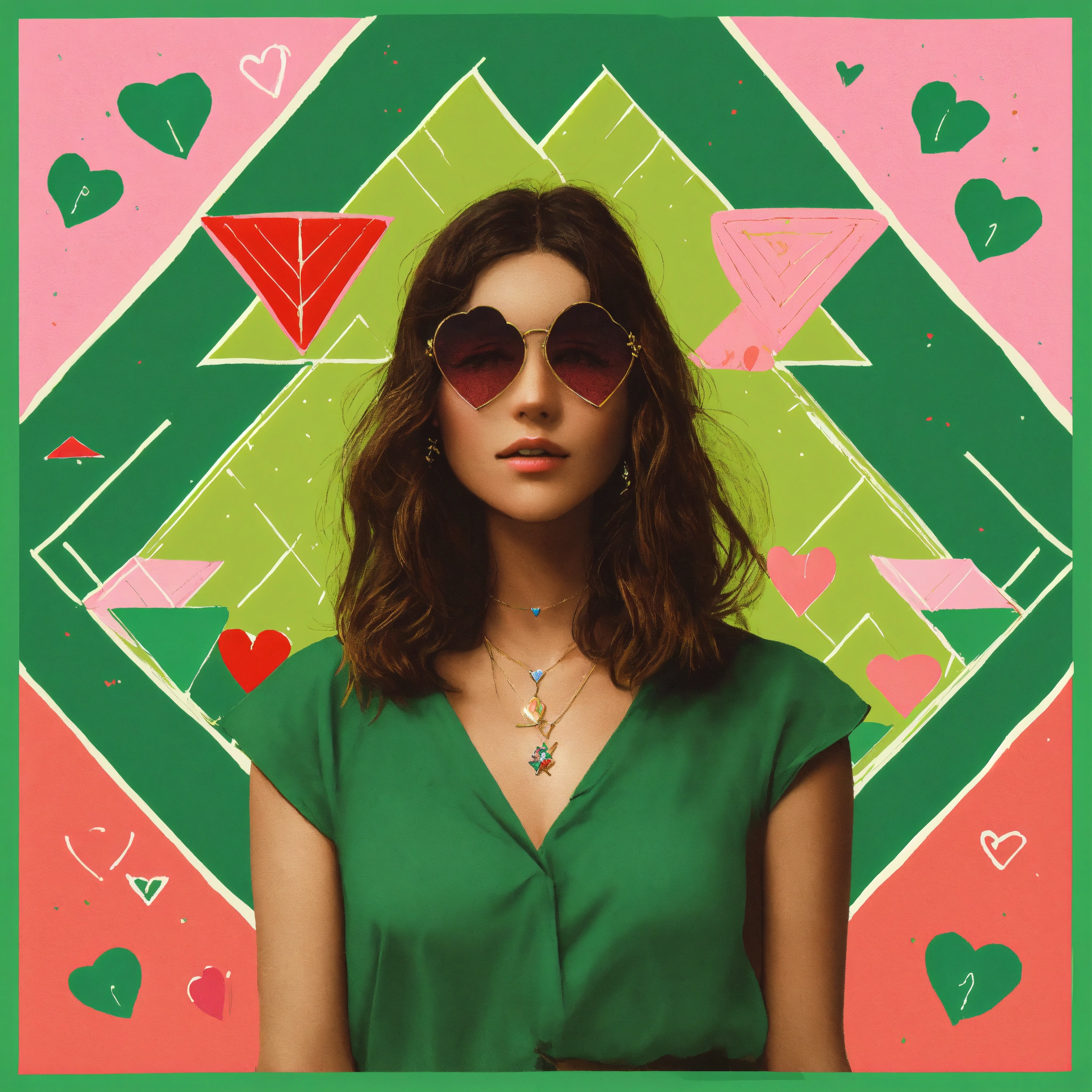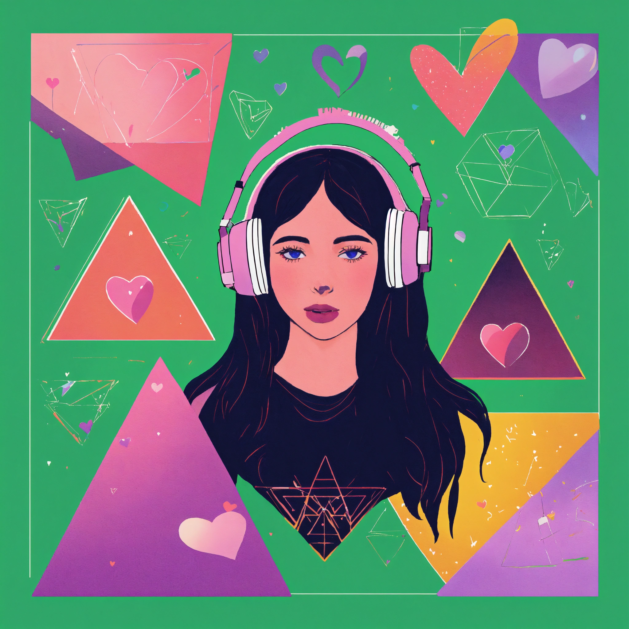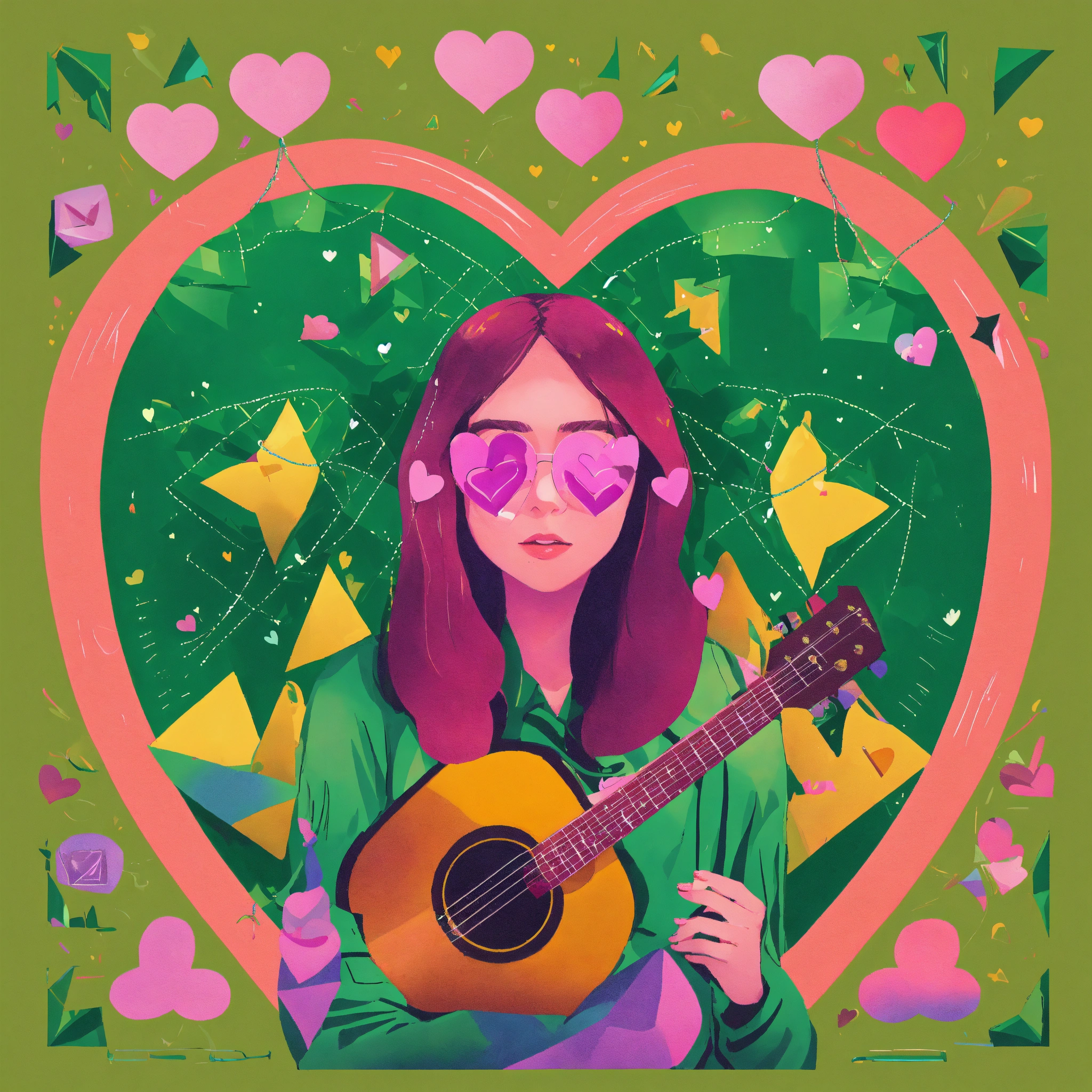 A square instagram post wellness mental health campaign with a female musicians holding a heart shaped triangles having hearts fly out of their heads with the background green colours #468c5c, #f5c24f and #f2e5ba 70s psycadellic hippy