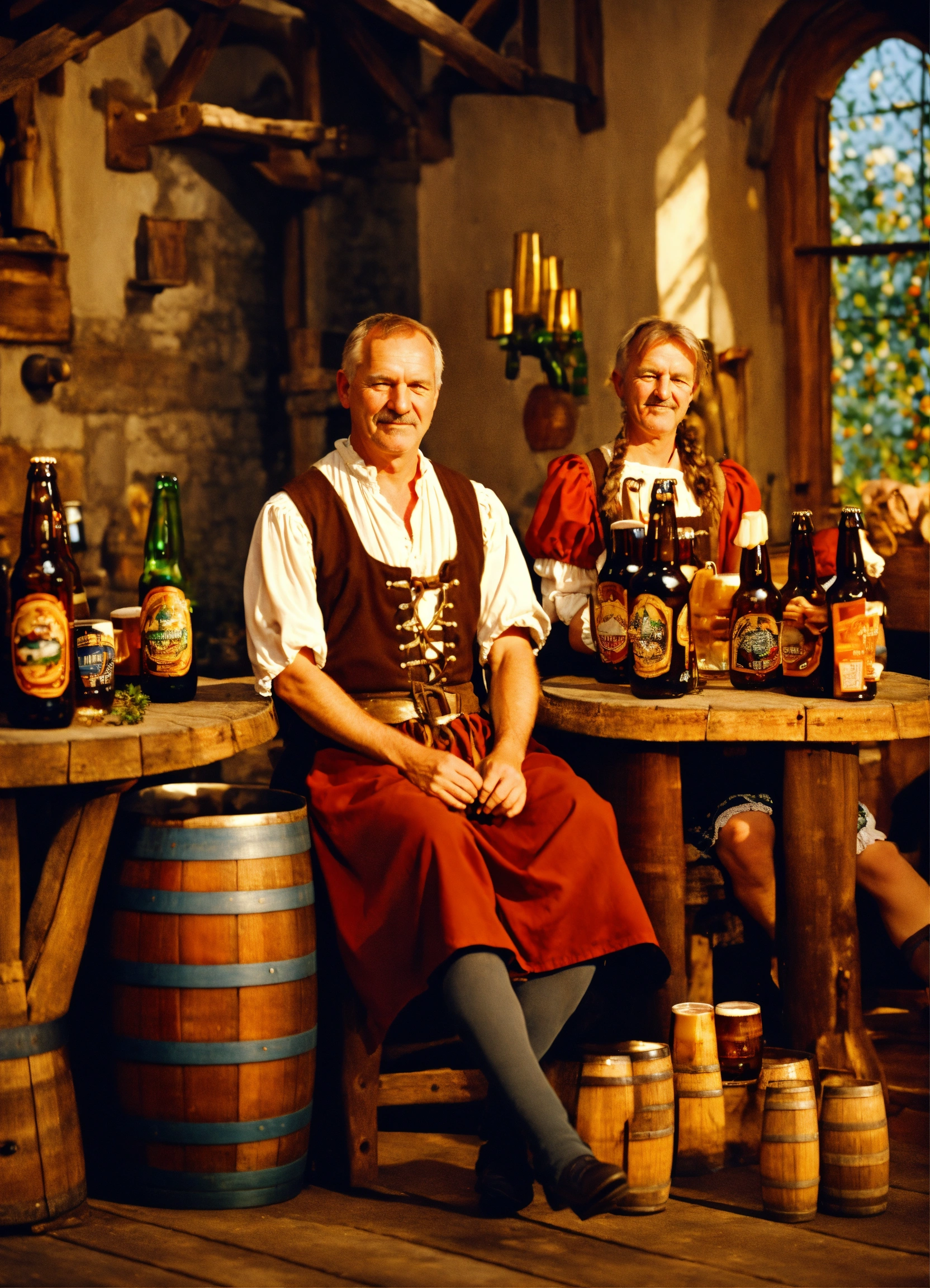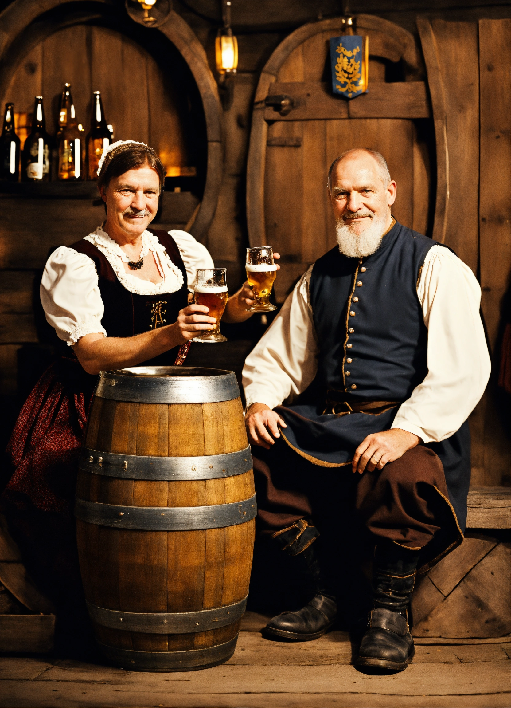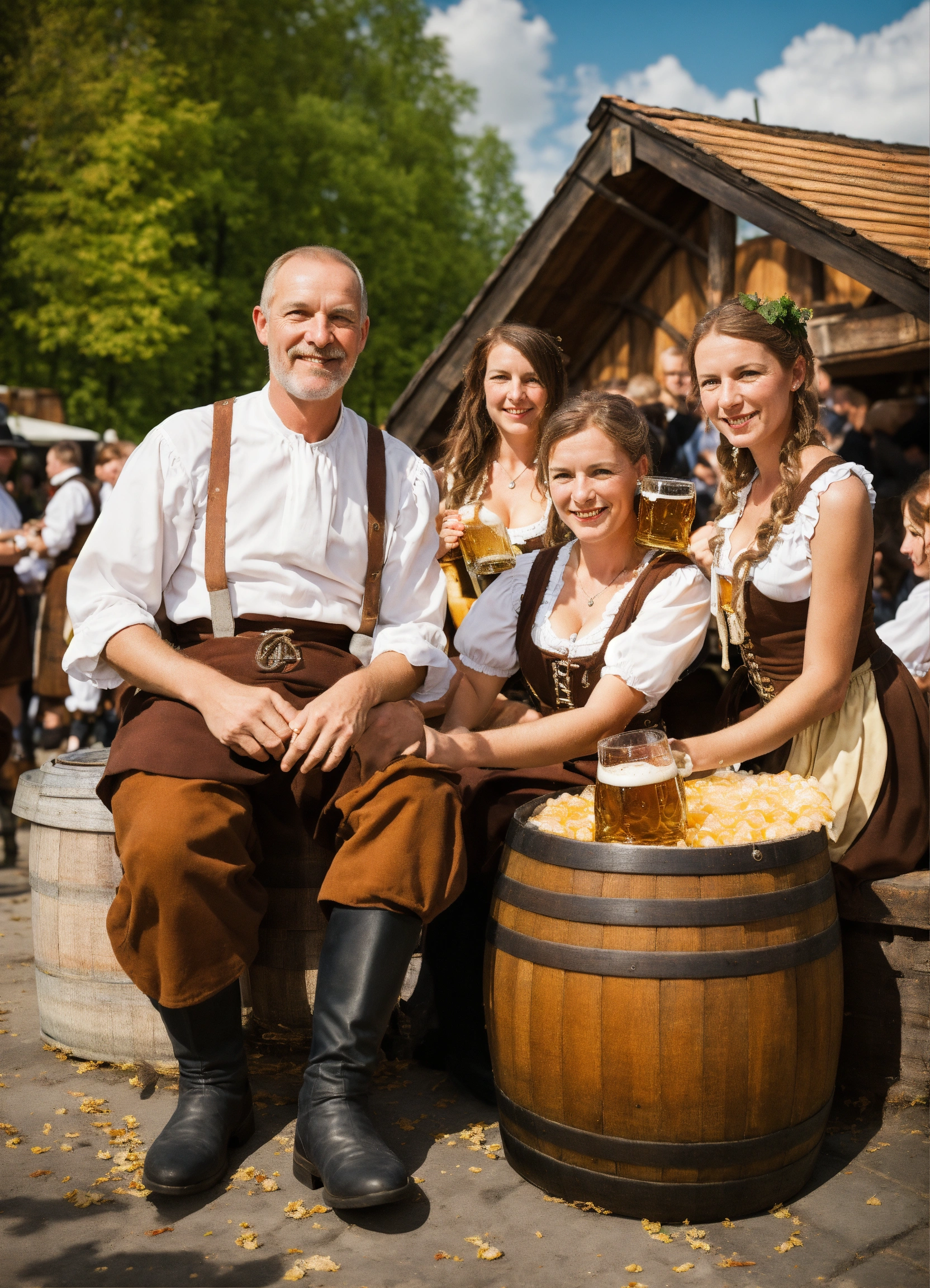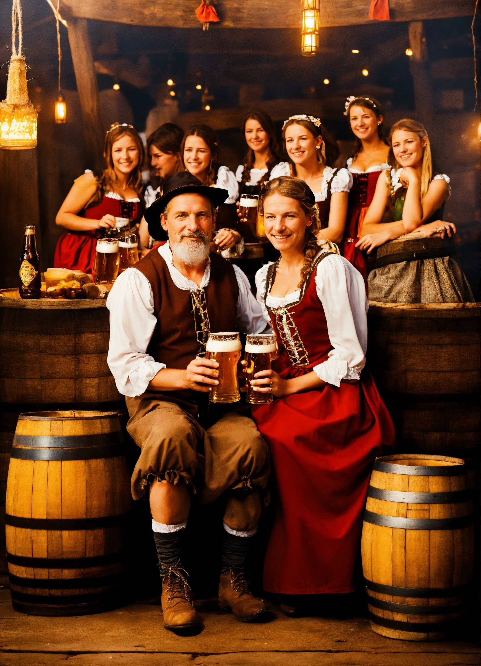 An old german monk invents beer in the middle ages and sits in front of a still and a barrel, above is another picture of an oktoberfest celebration with girls in dirndl dresses and men in lederhosen
