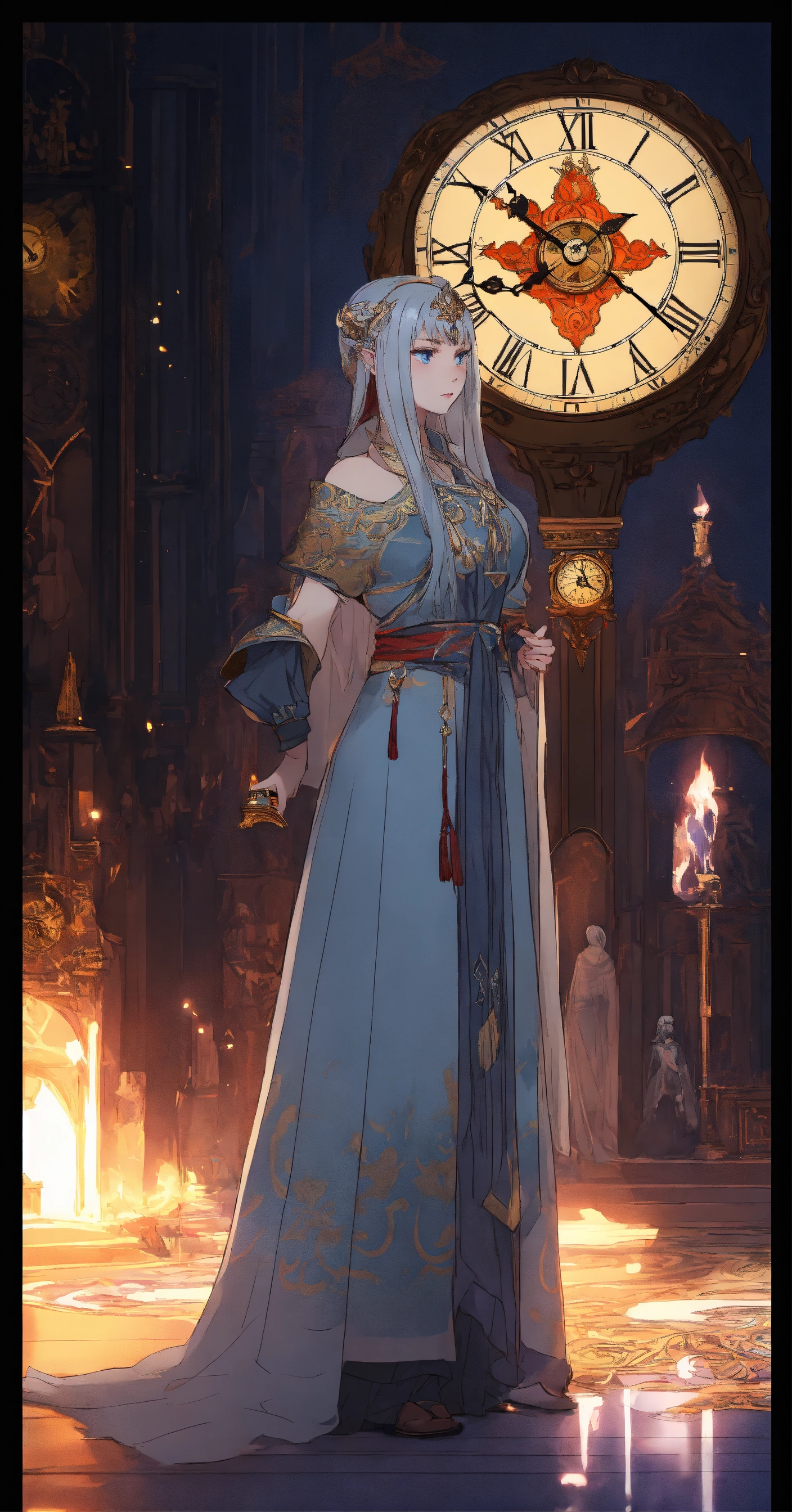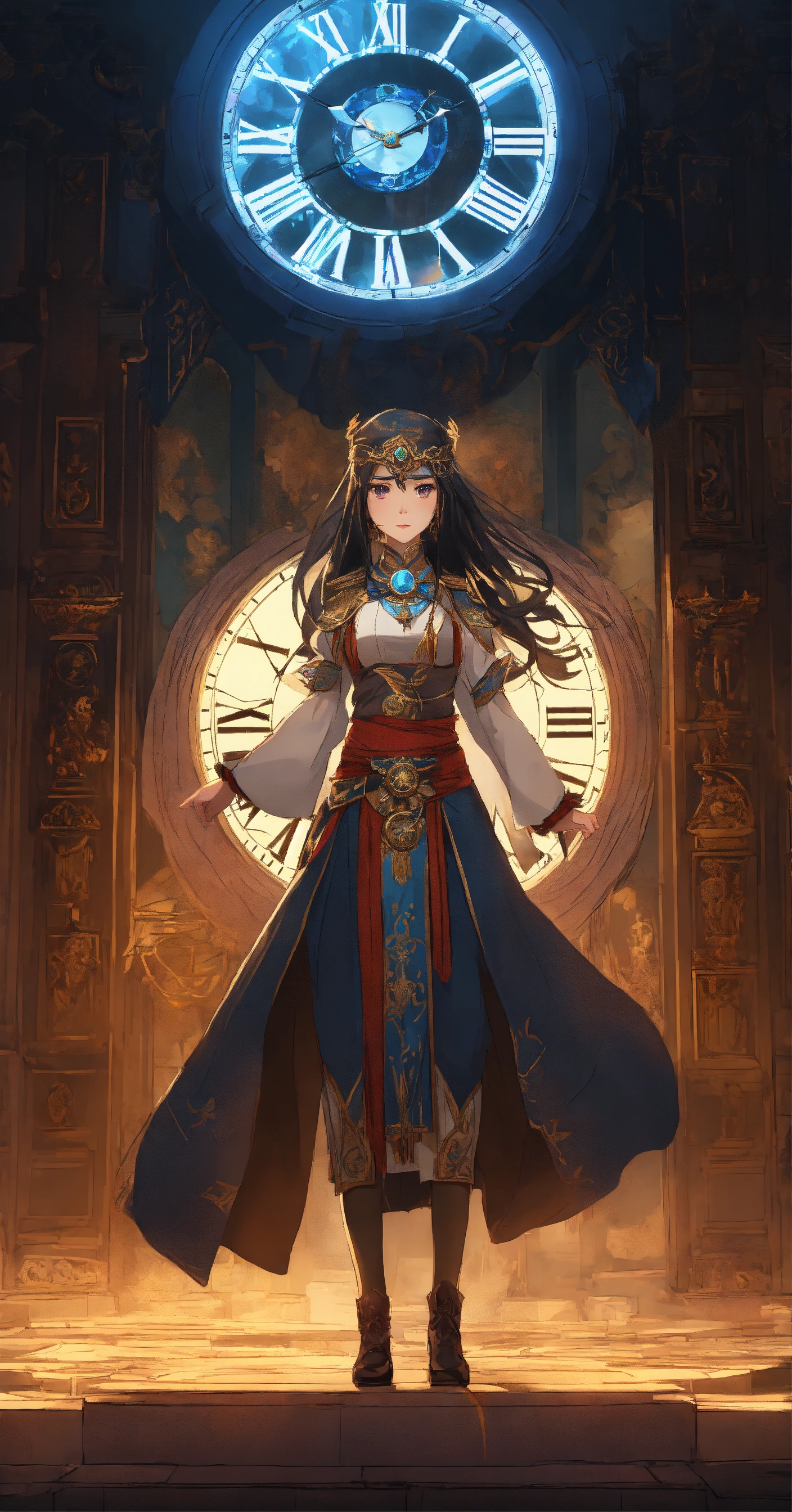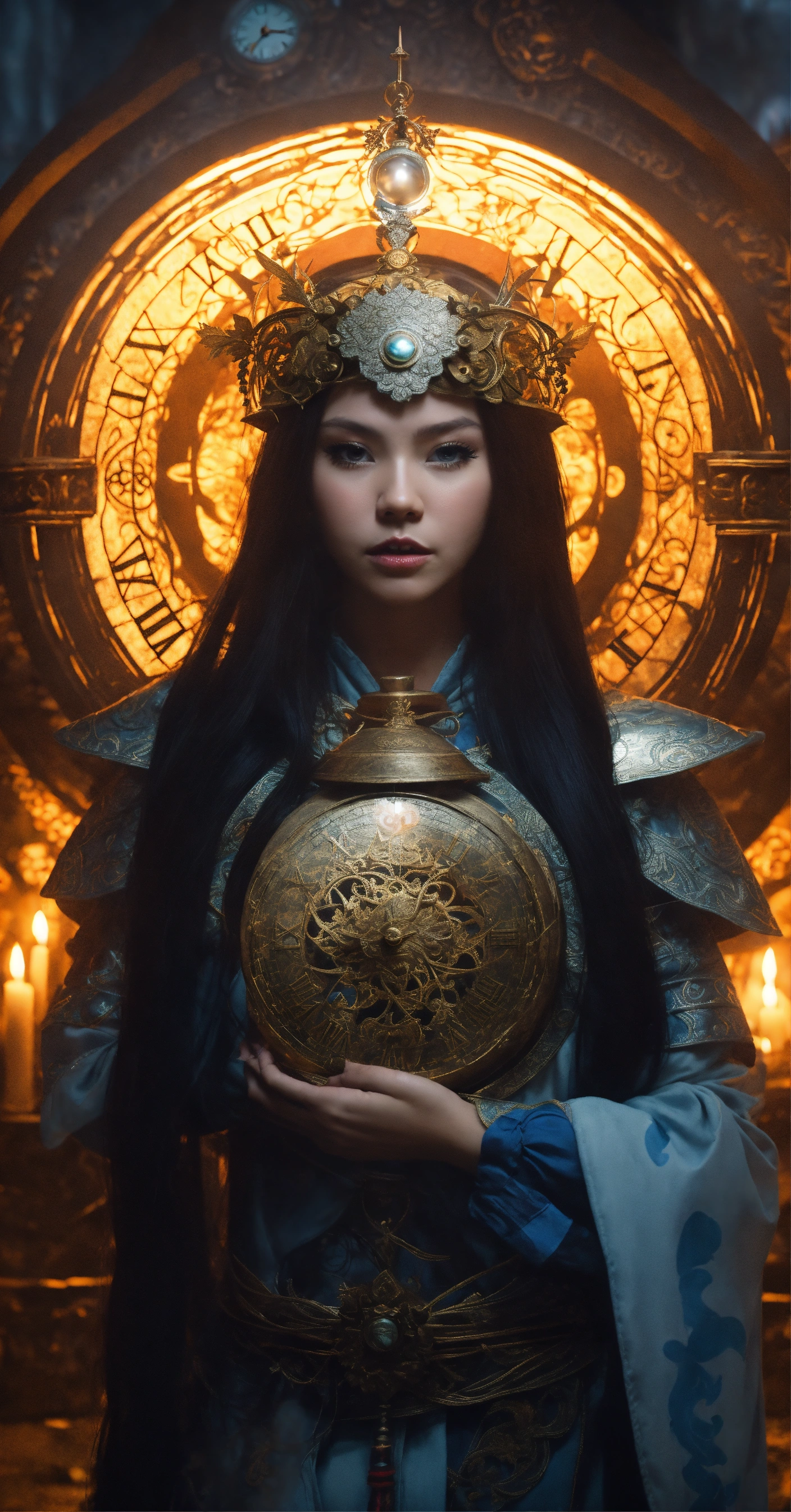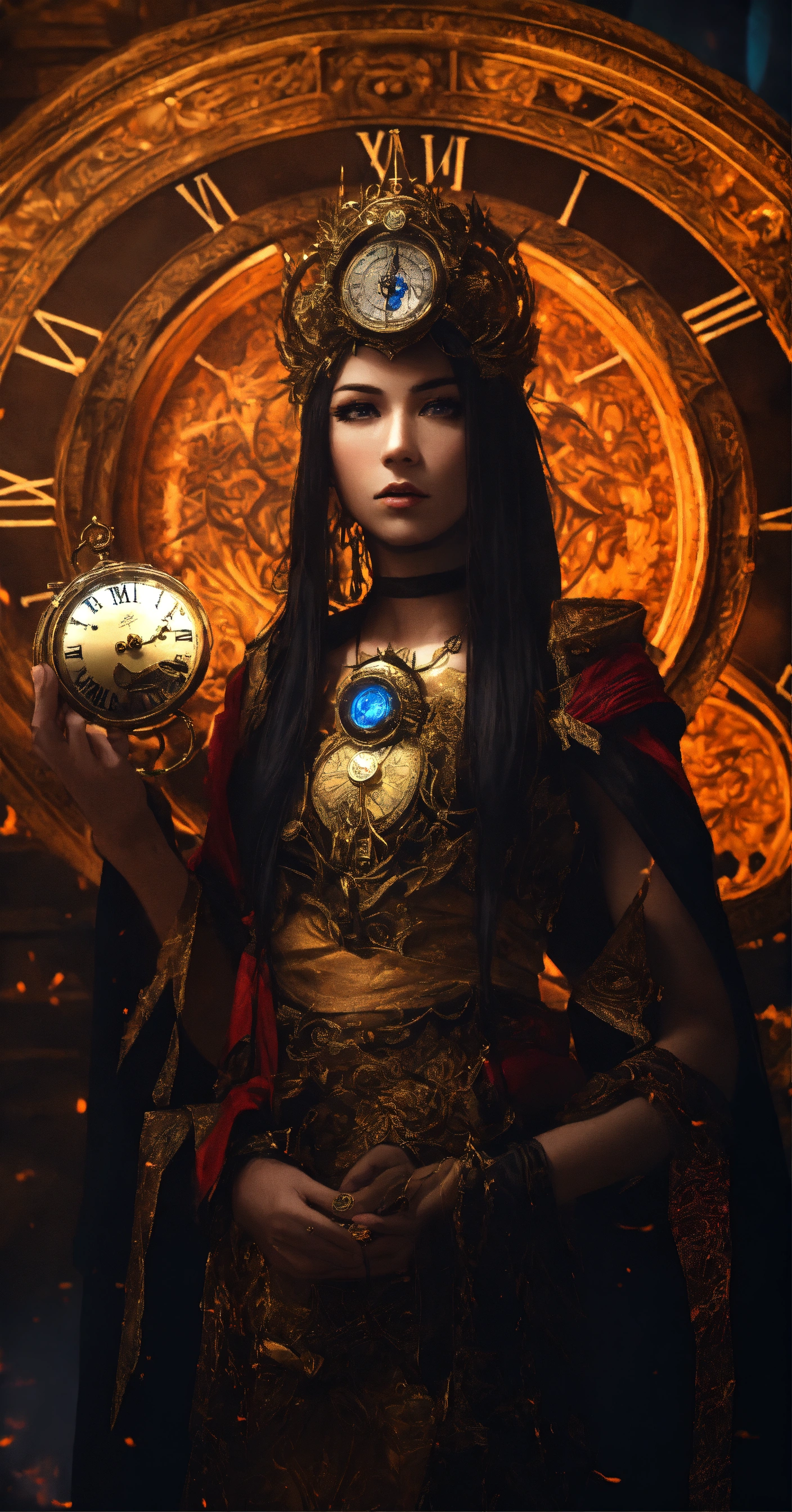 A woman standing in a dark room holding a clock, the fall of gondolin, kerli koiv as anime girl, youtube video screenshot, creating the false christian god, furious dark haired women, blurry image, ign, subtitles, she is dressed in shaman clothes, elfpunk, sarcastic, face very realistic