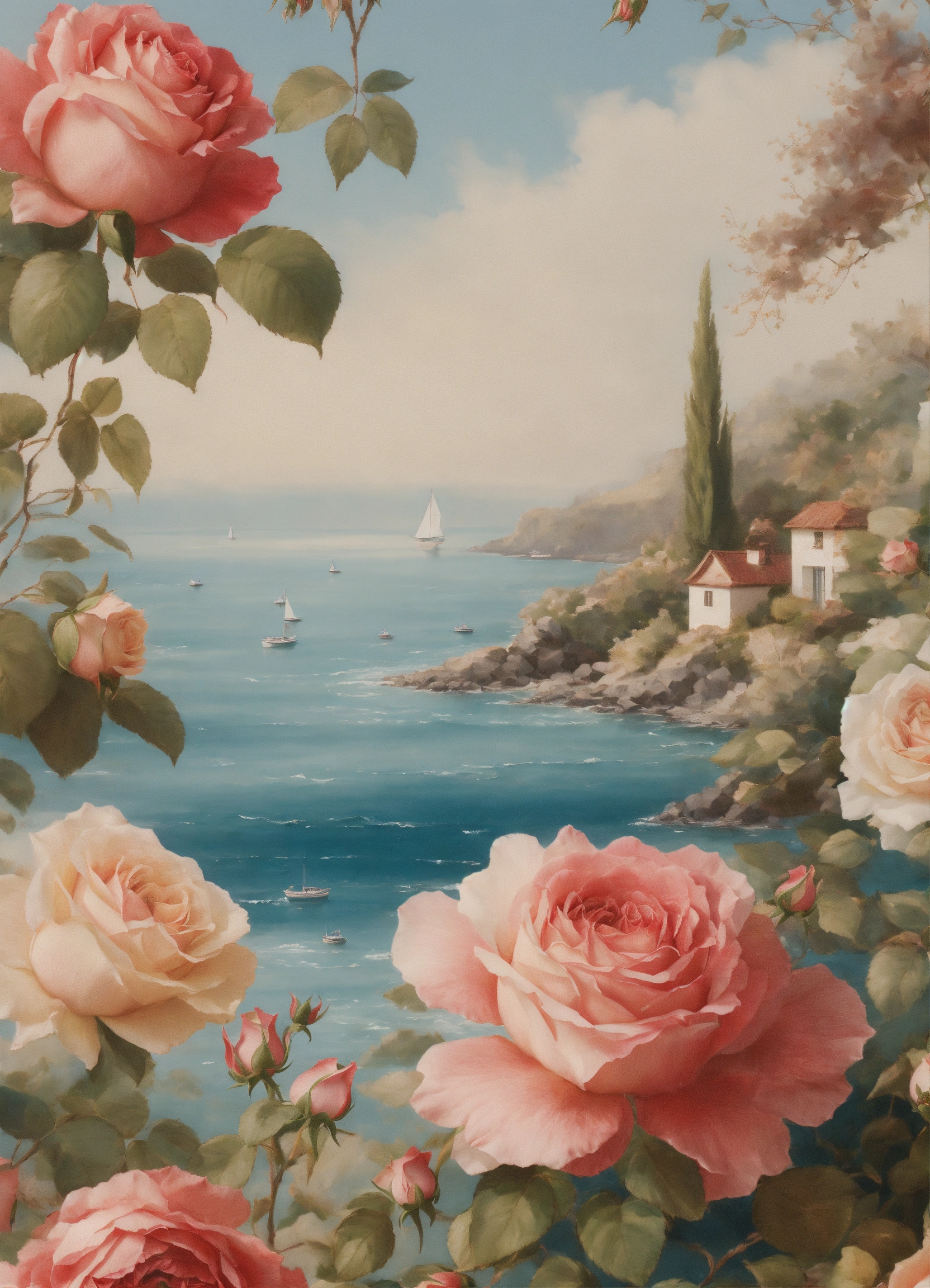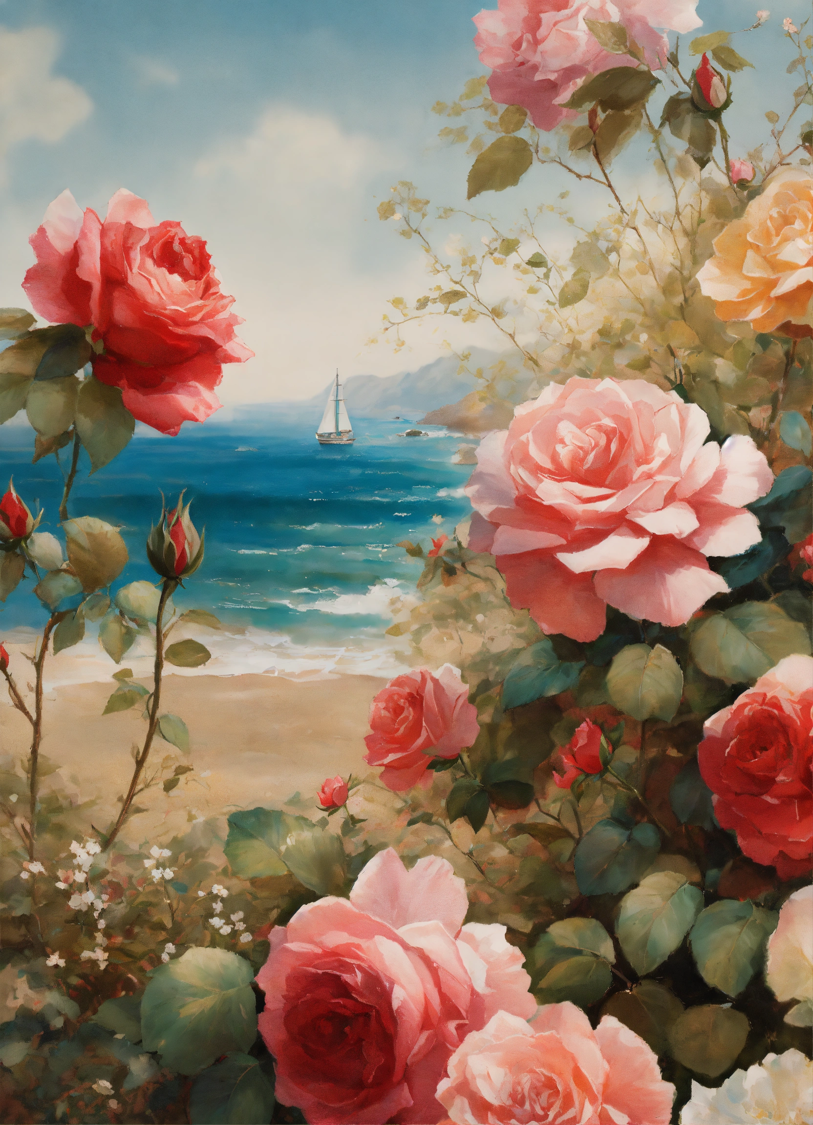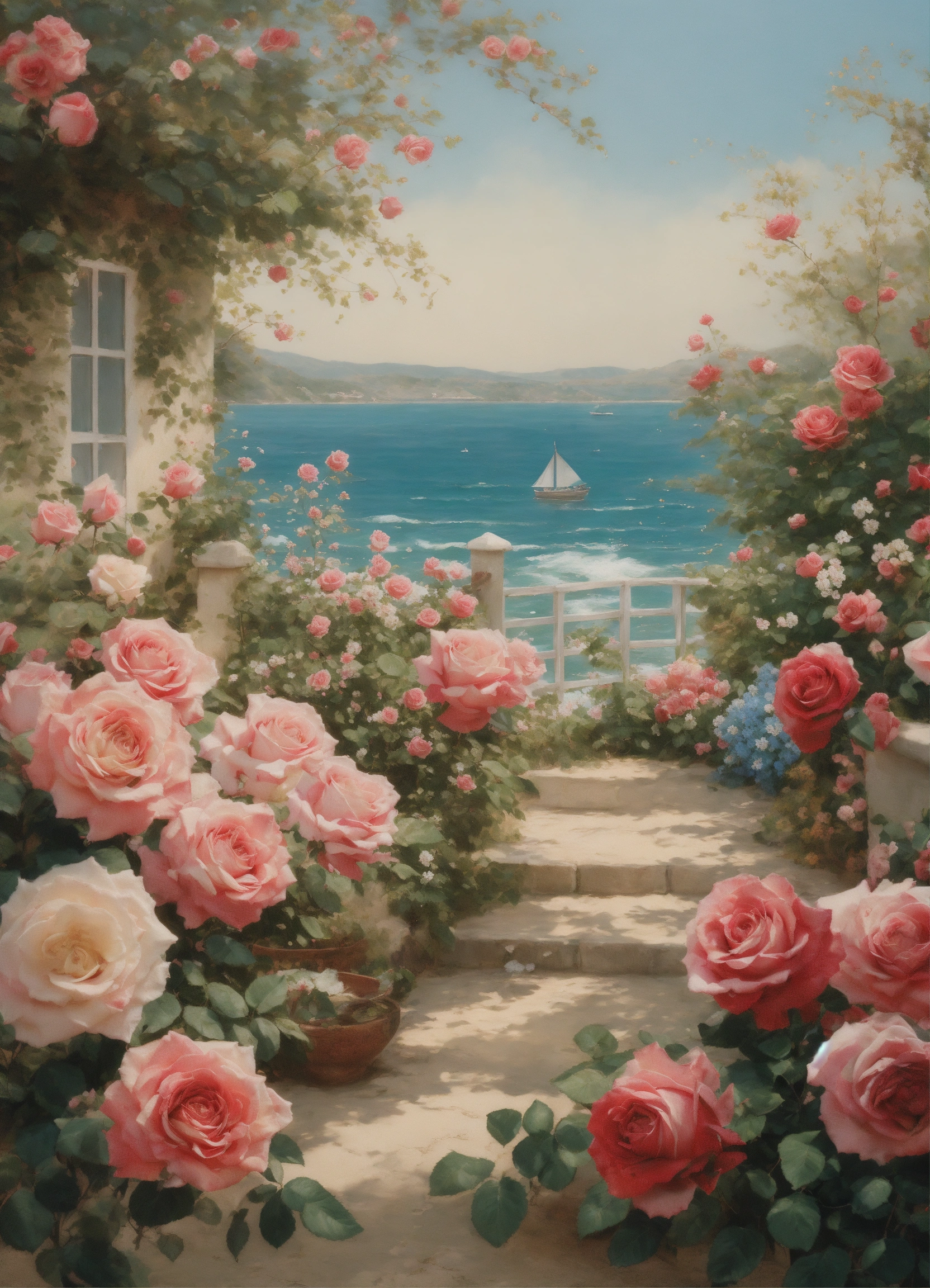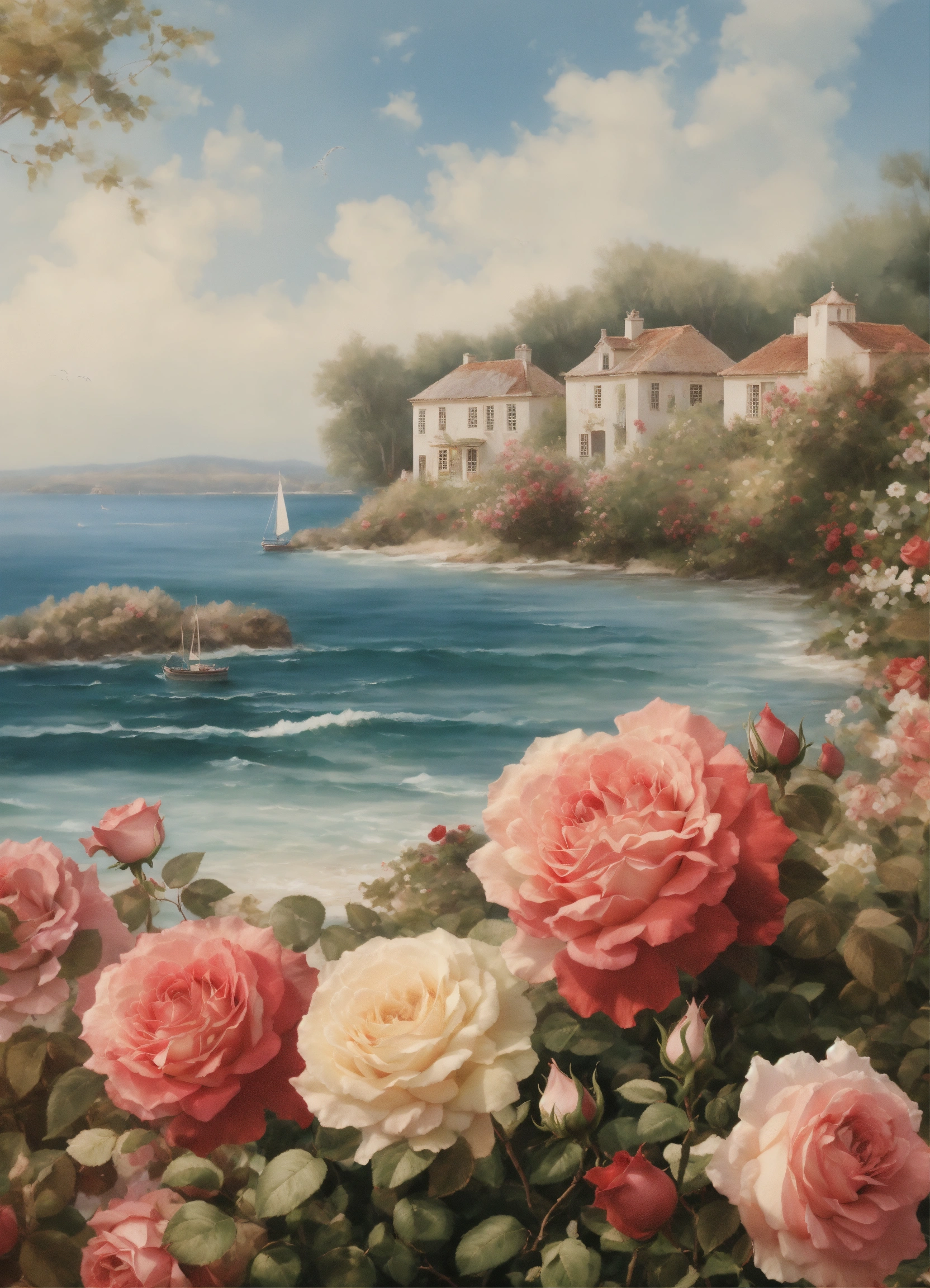 Experience the perfect harmony of roses and the sea. this wallpaper captures the tranquility of a coastal garden, where the salt breeze mingles with the fragrance of roses.