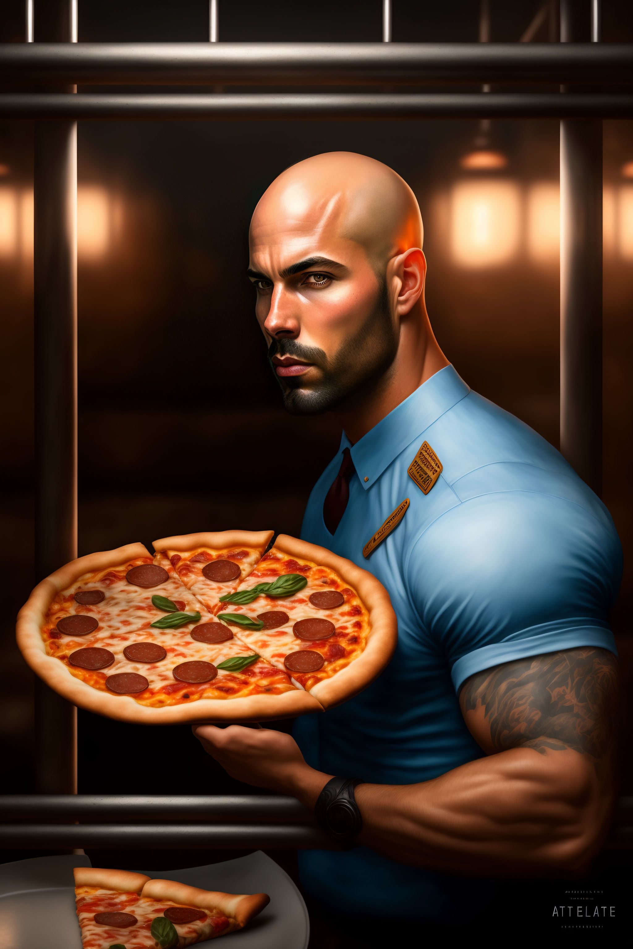 Bald andrew tate eating pizza in a prison, behind bars, realistic portrait, symmetrical, highly detailed, digital painting, artstation, concept art, smooth, sharp focus, illustration, cinematic lighting, art by artgerm and greg rutkowski and alphonse mucha