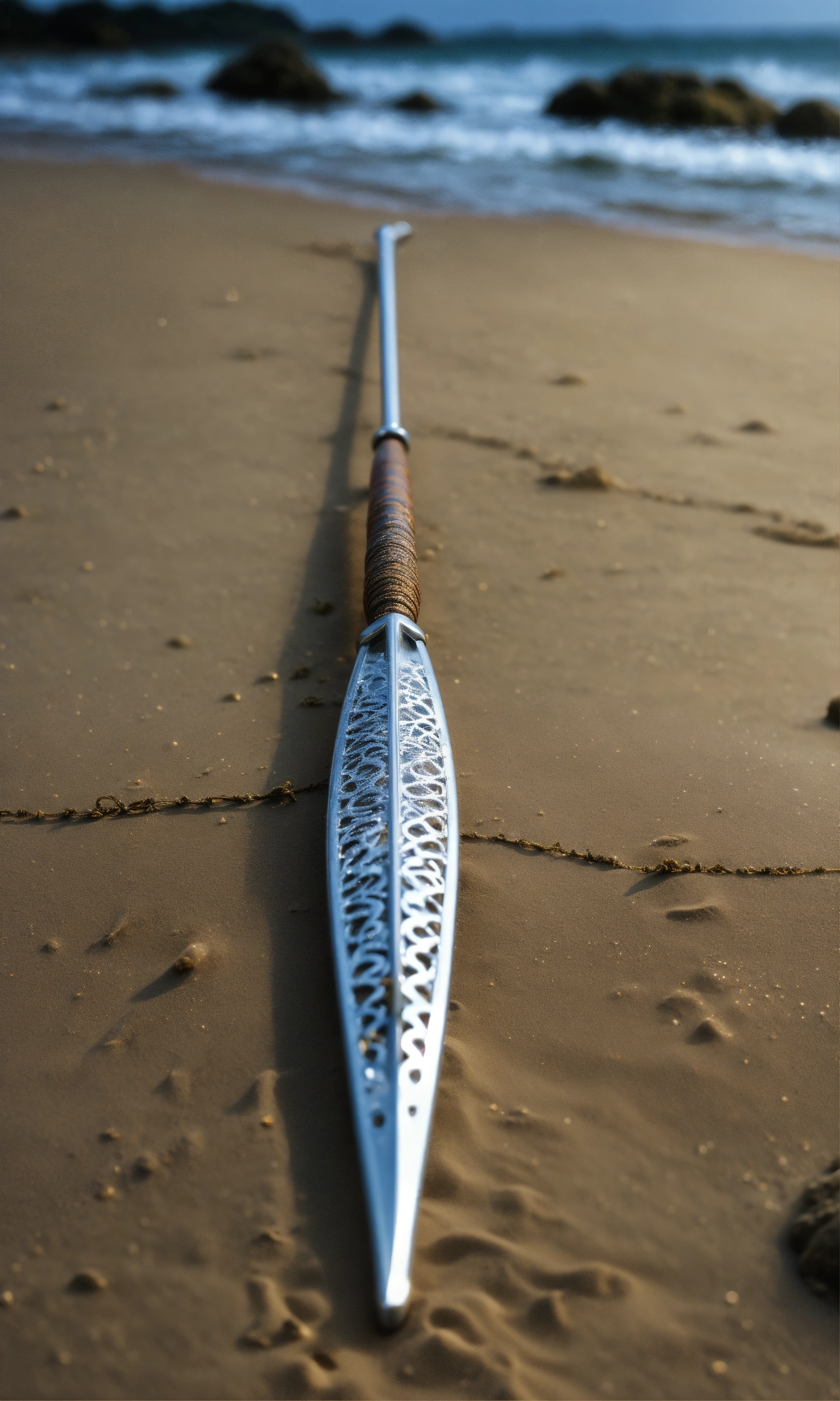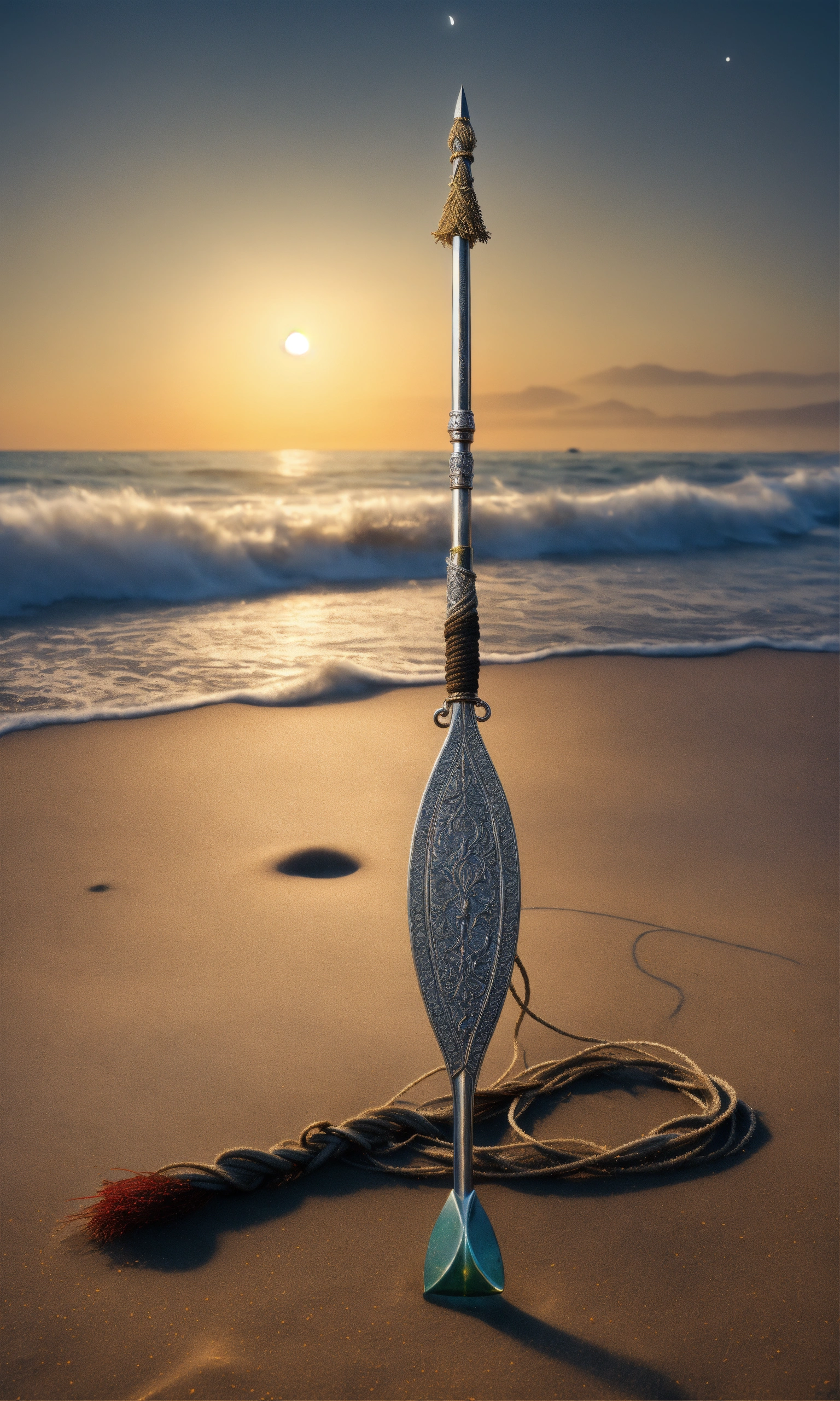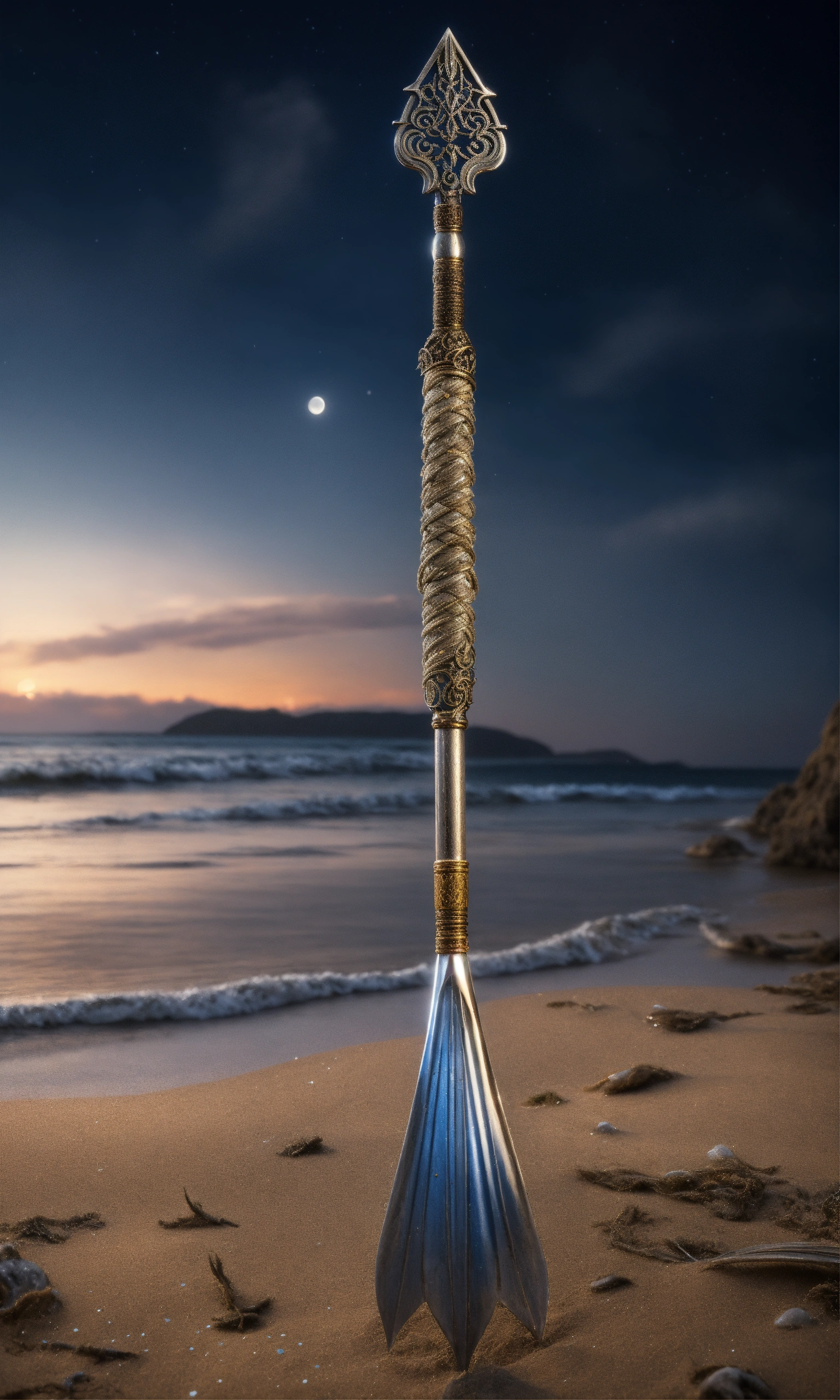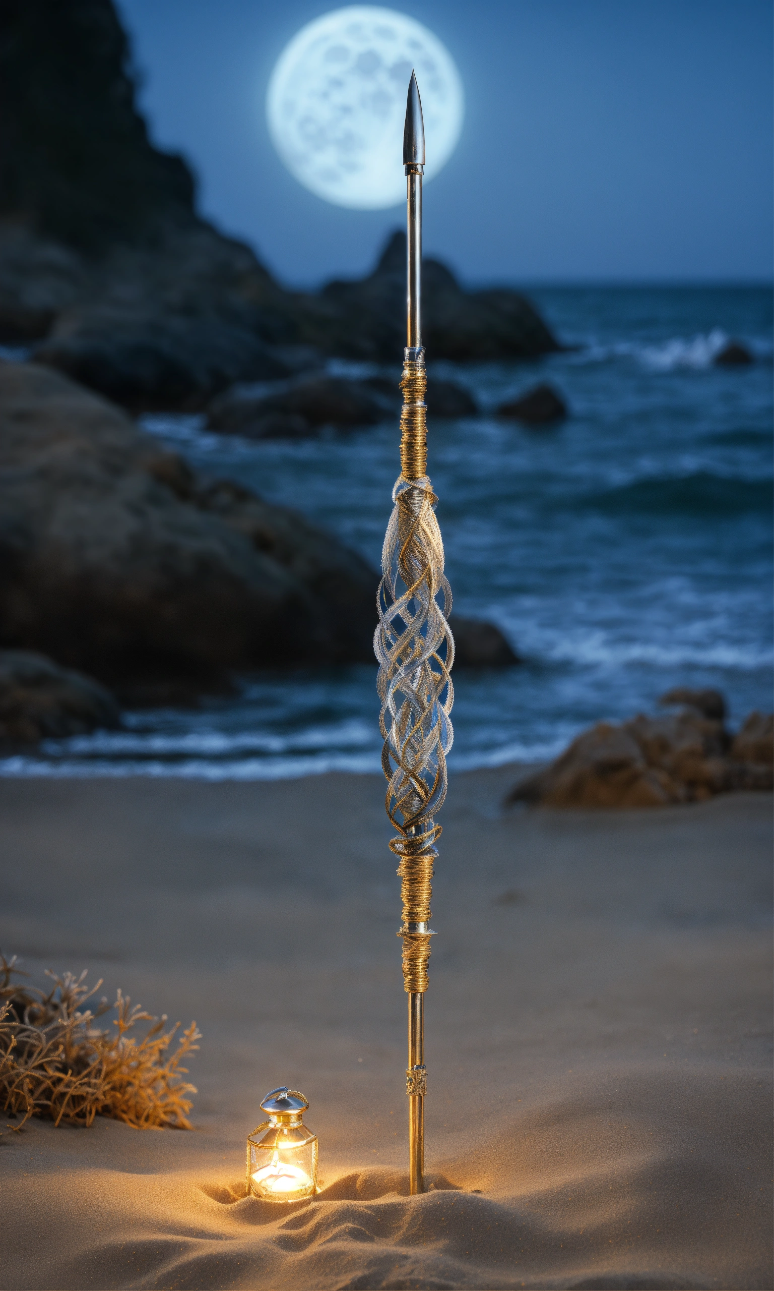 8k, picture of a narrow and delicate toothed fishing spear with barbs made of lunar-silver, highly ornamented, at the bottom there is an eyelet to which a twenty meter long tow line made of braided seaweed is attached, very detailed, ultra realistic, stuck with the bottom end deep in the sand on the beach in a lonely bay, moonlight, fantasy, medieval.