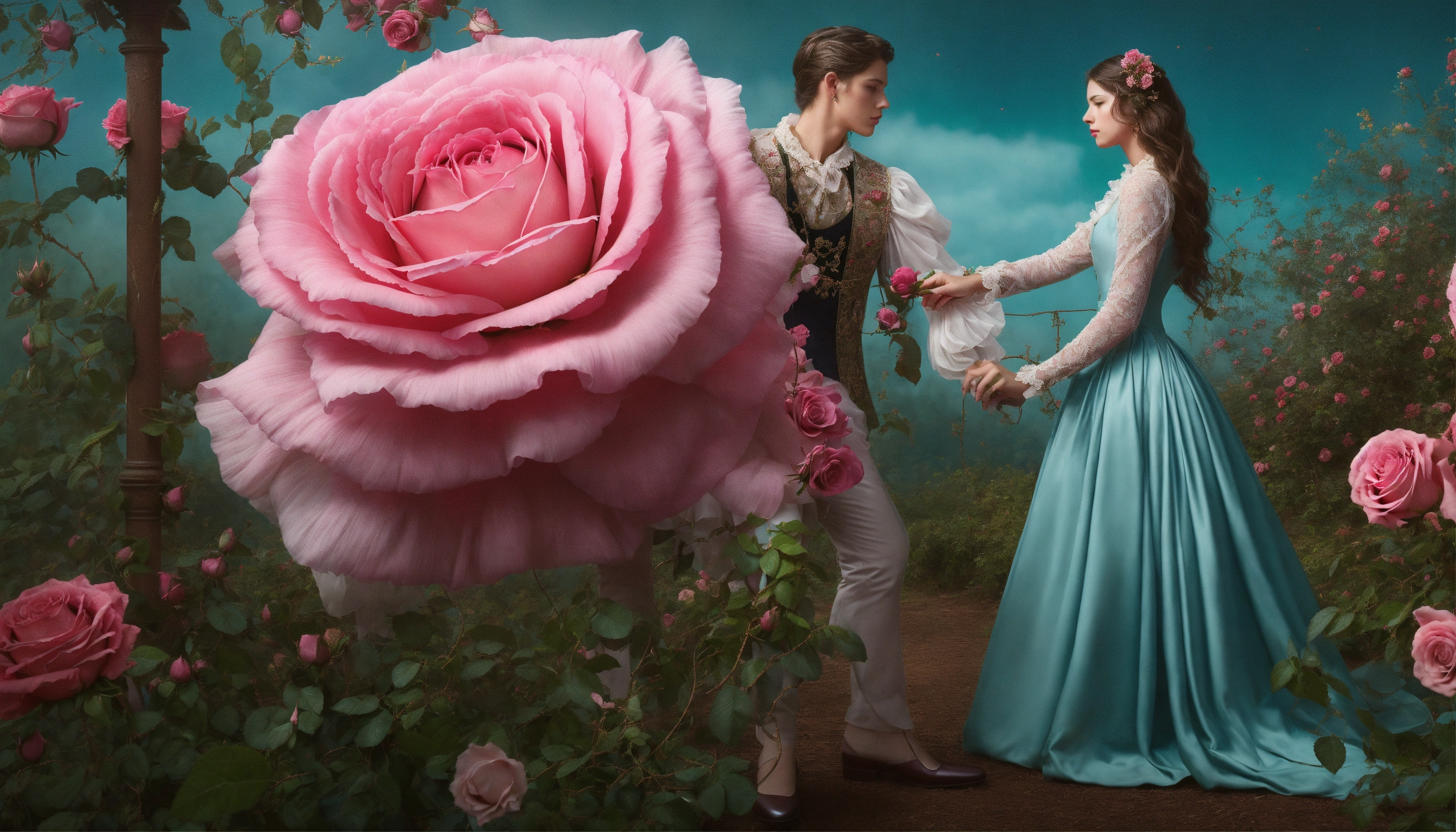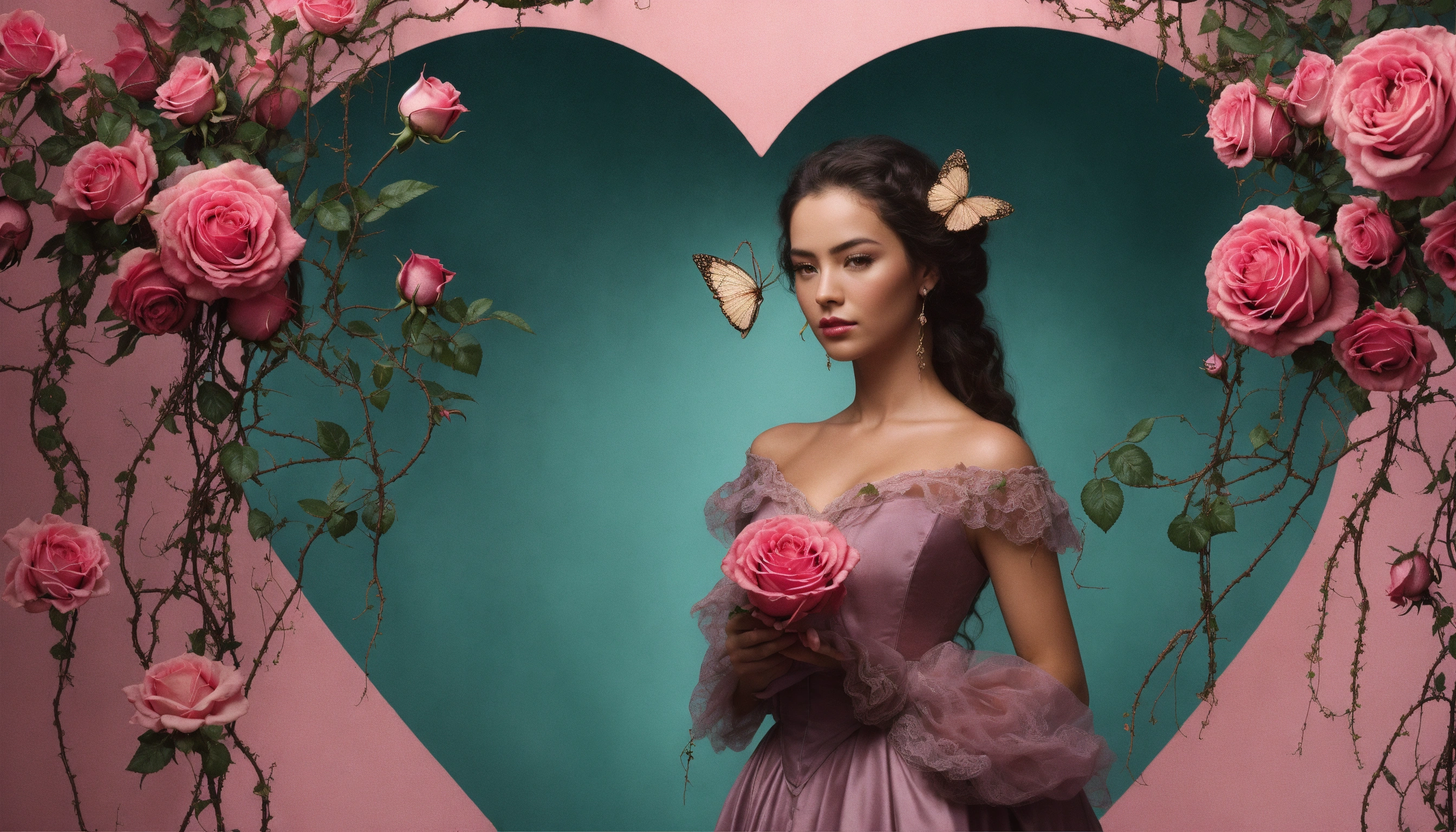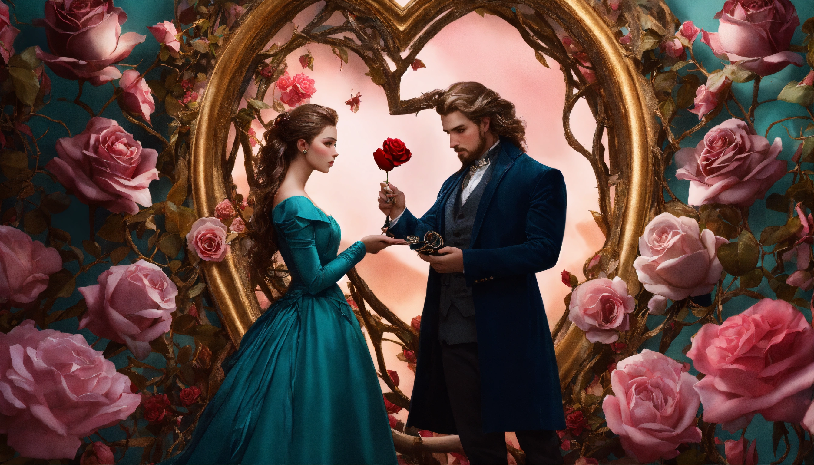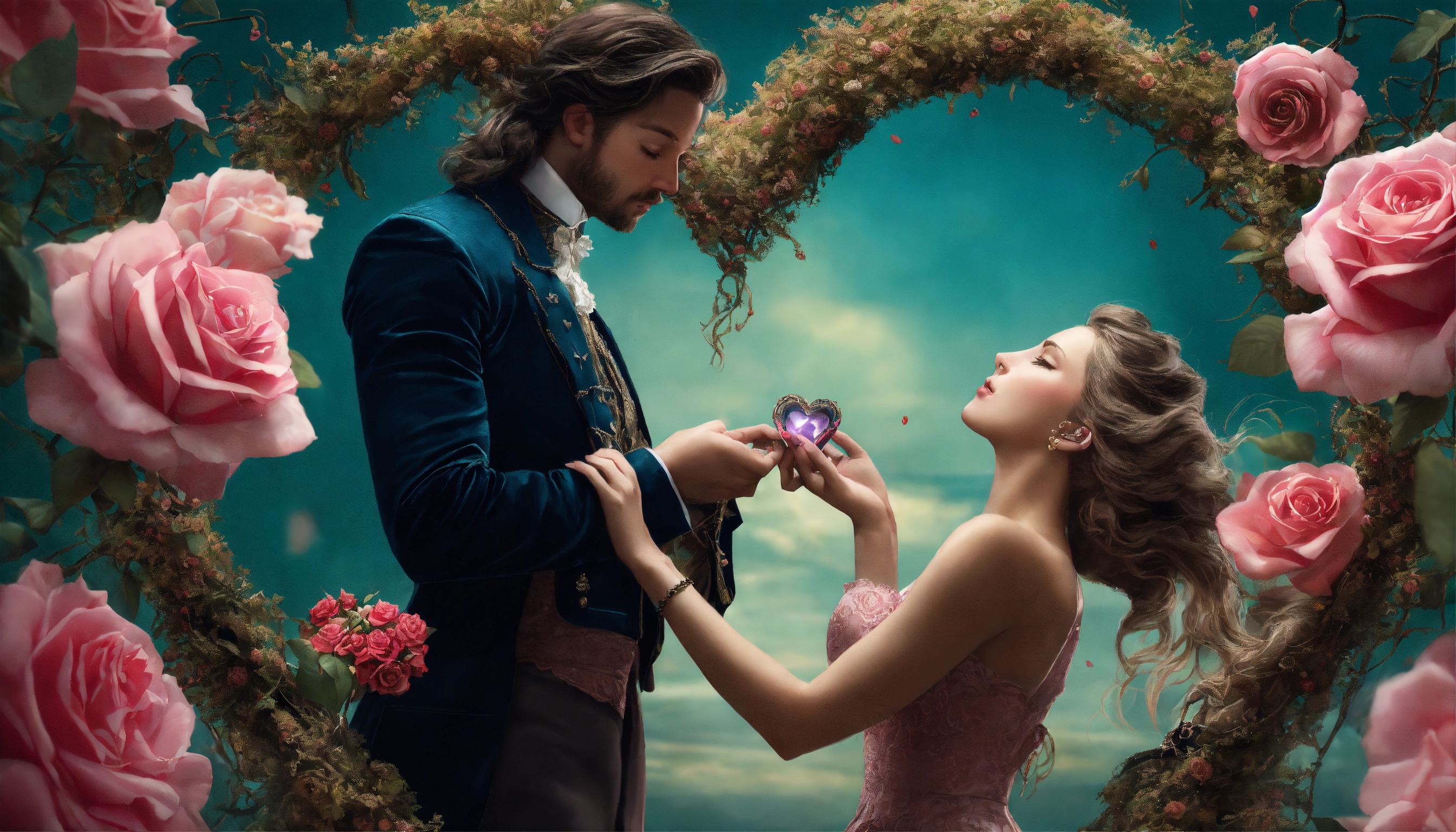 Hyper realistic photoshop composition, a photoreal female model in a 19th century dress with futuristic flowing hair and a male model of fitting style and gorgeous hair. they are balancing a heart shaped object on their fingertipps that symbolized their love. they are framed by giant gnarly rose vines with big thorns and black rose blossoms but one pink rose, a few abstract stringy lines are part of the composition. muted teal background, interesting lighting, studio photography in the style of famous lifestyle and conceptional photographers. wide aspect ratio.