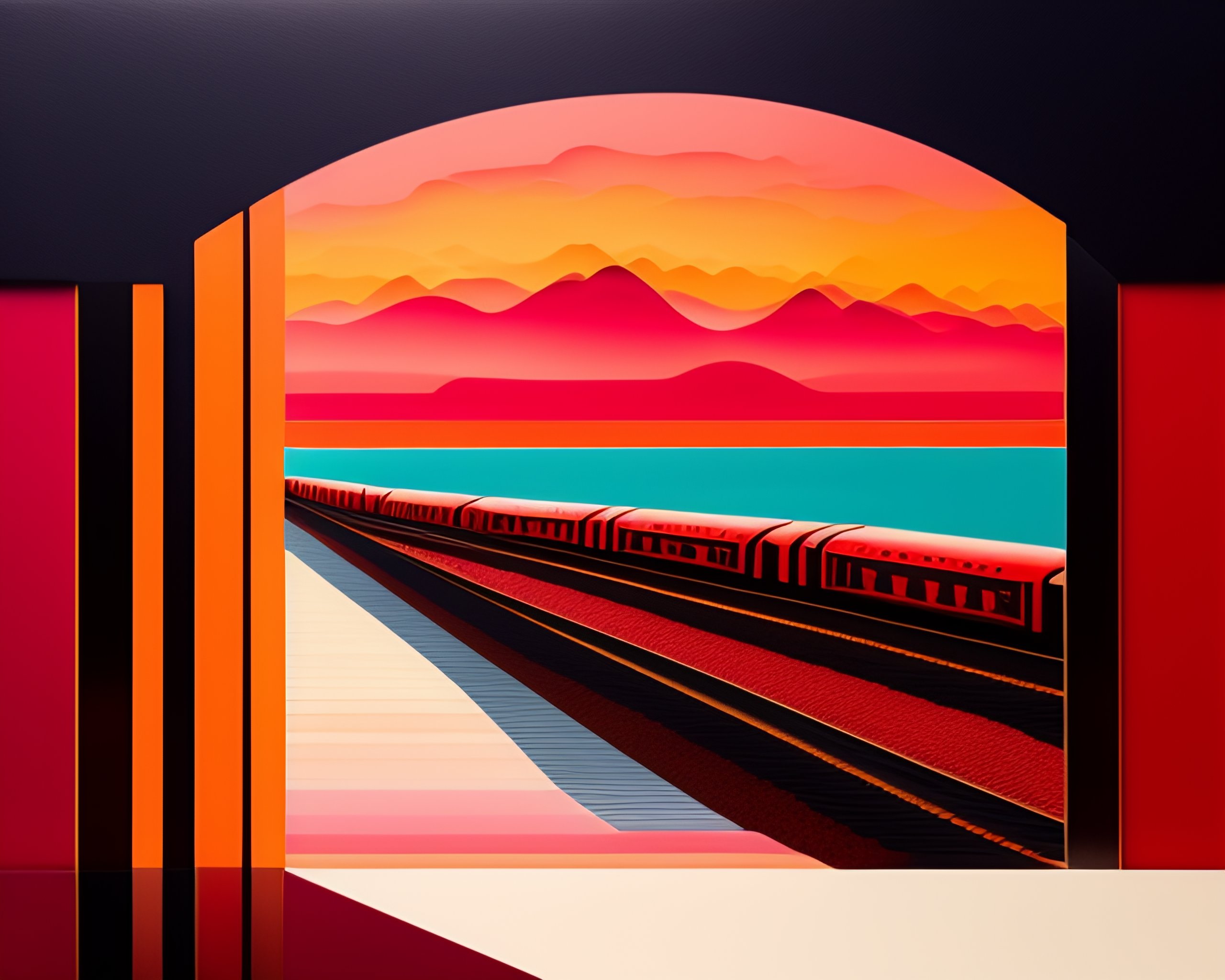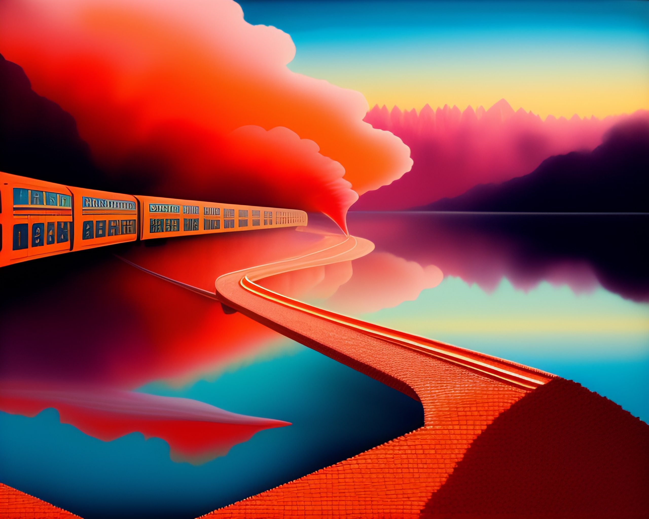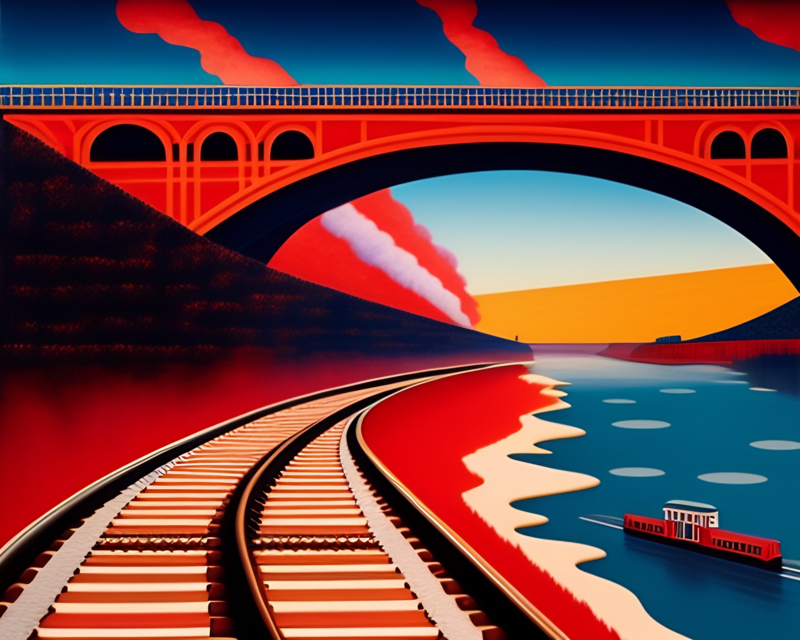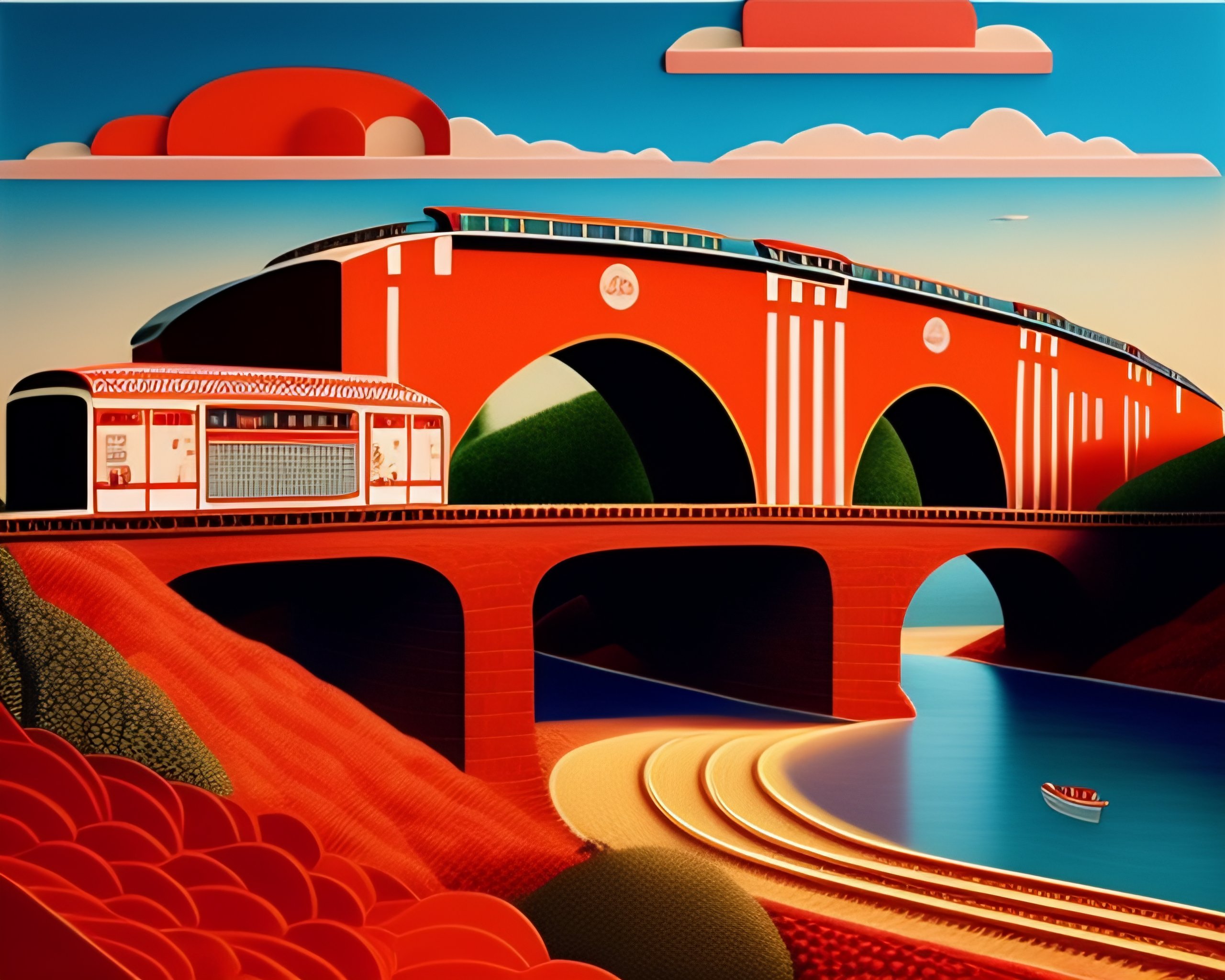 Paper collage art by henri mattisse of a brick railway with several arches under it on a river, red train with smoke in the sky