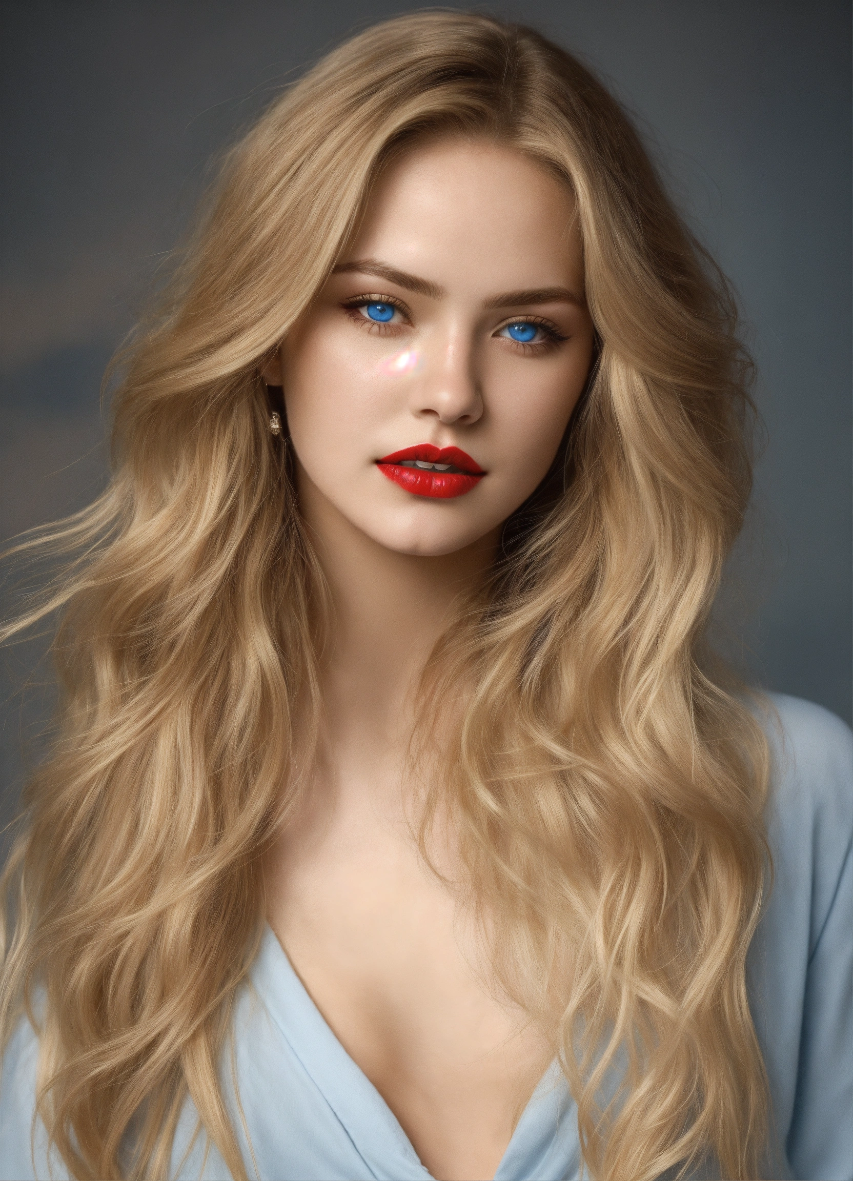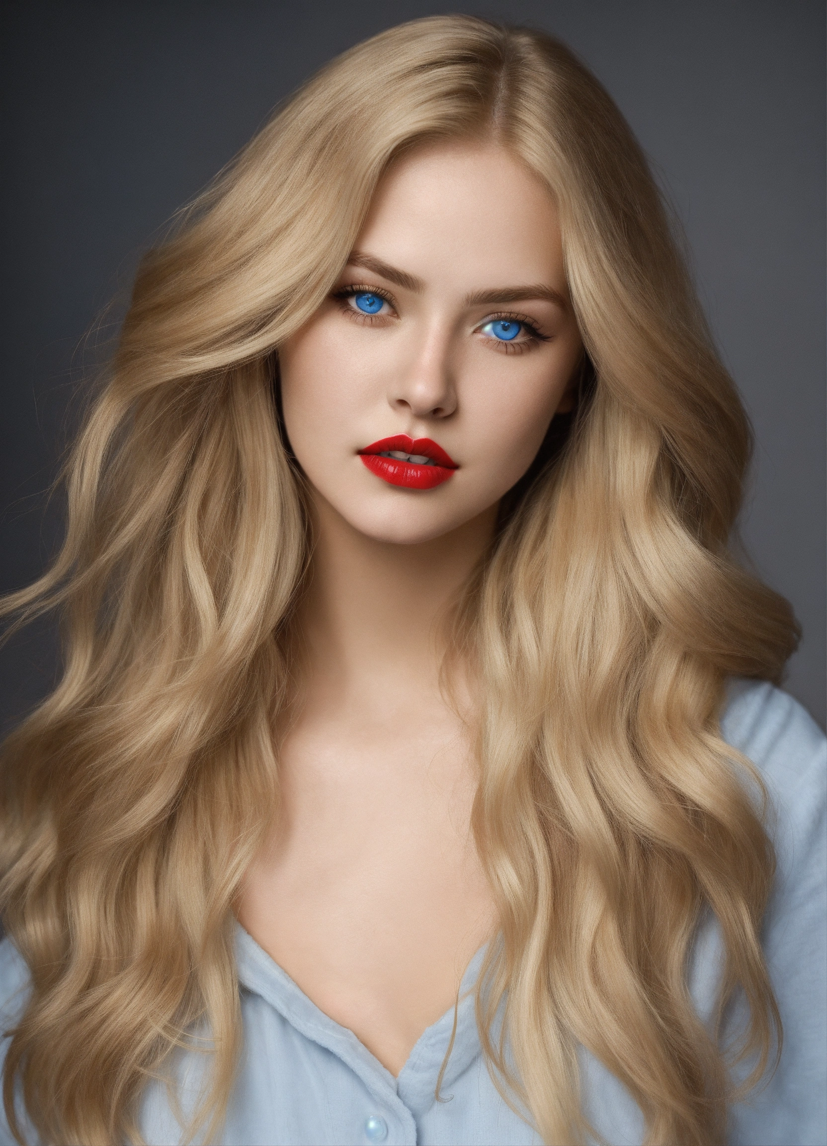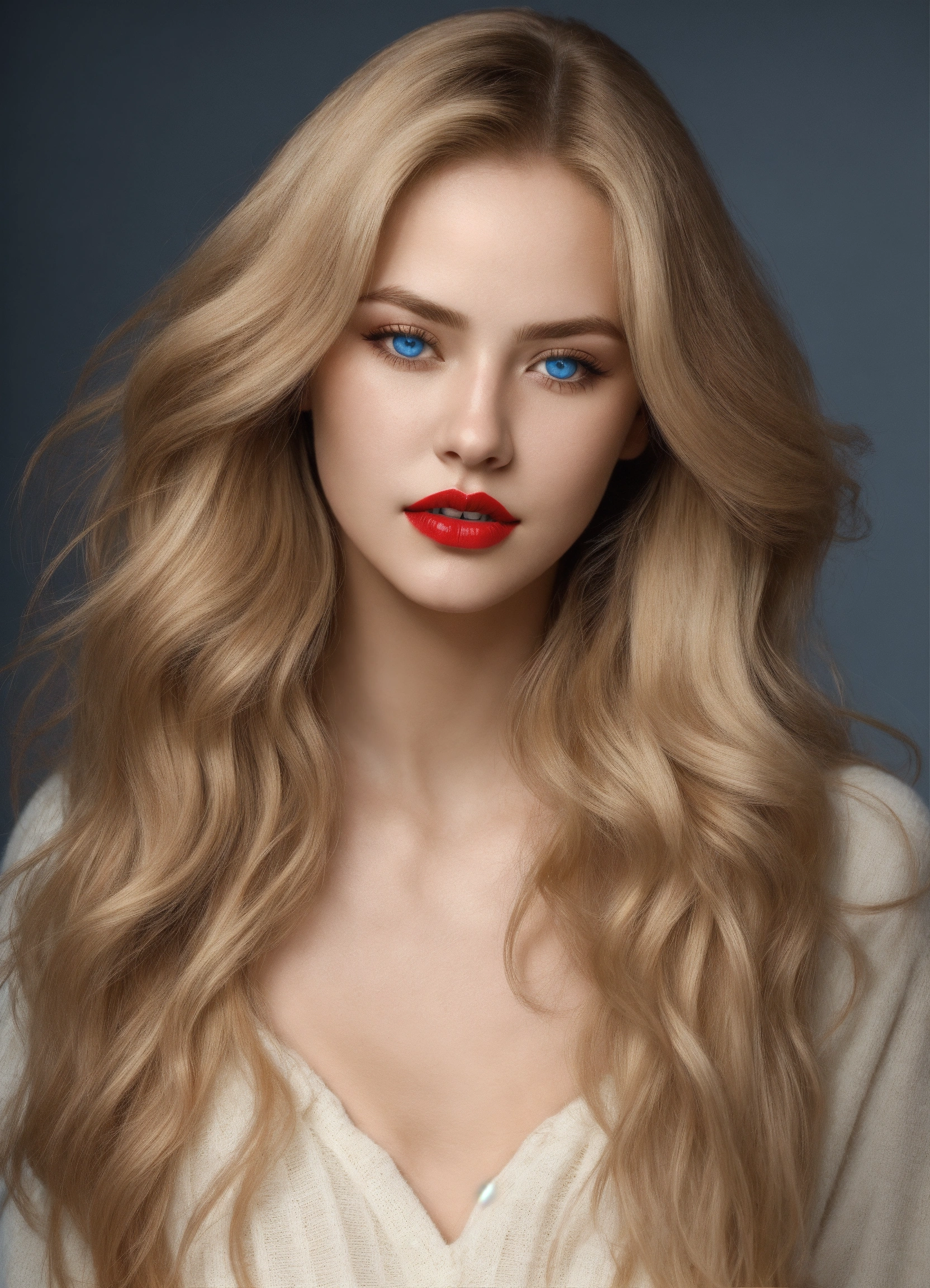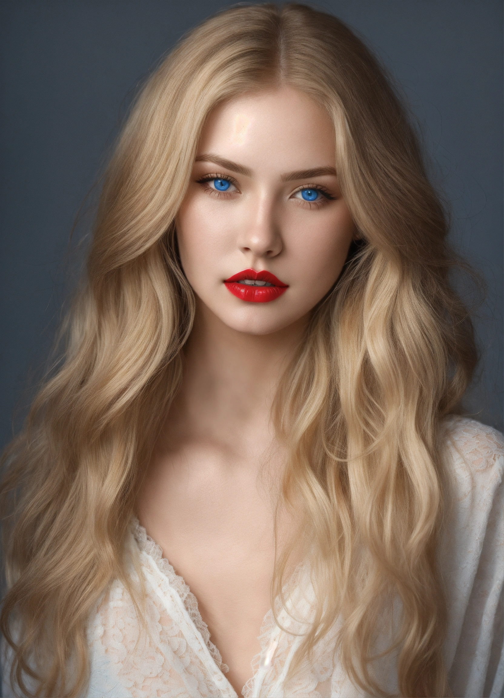 Ultra-realistic very innocent beautiful women 20-year-old with very full red lips, with long blonde hairs, with big bright light naturally blue eyes, photo realistic