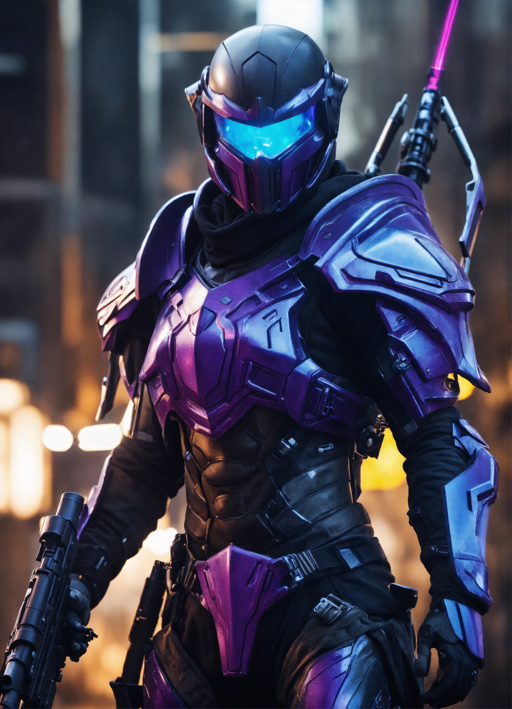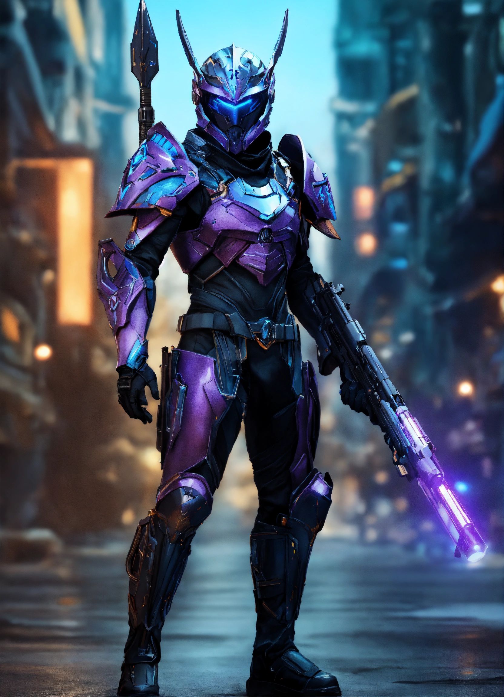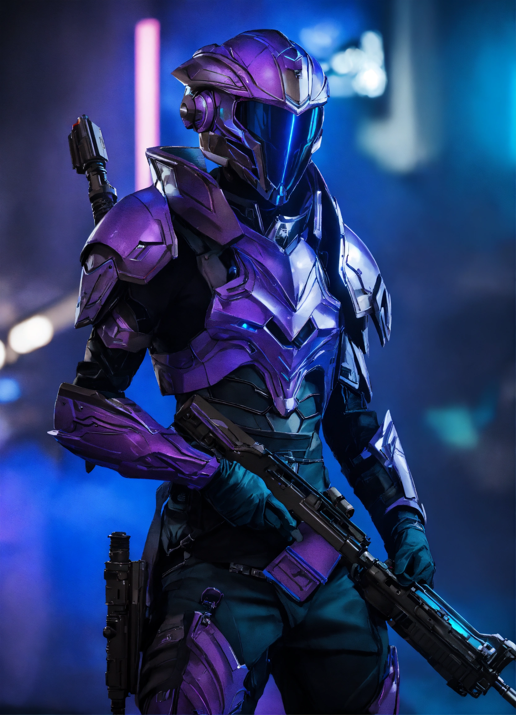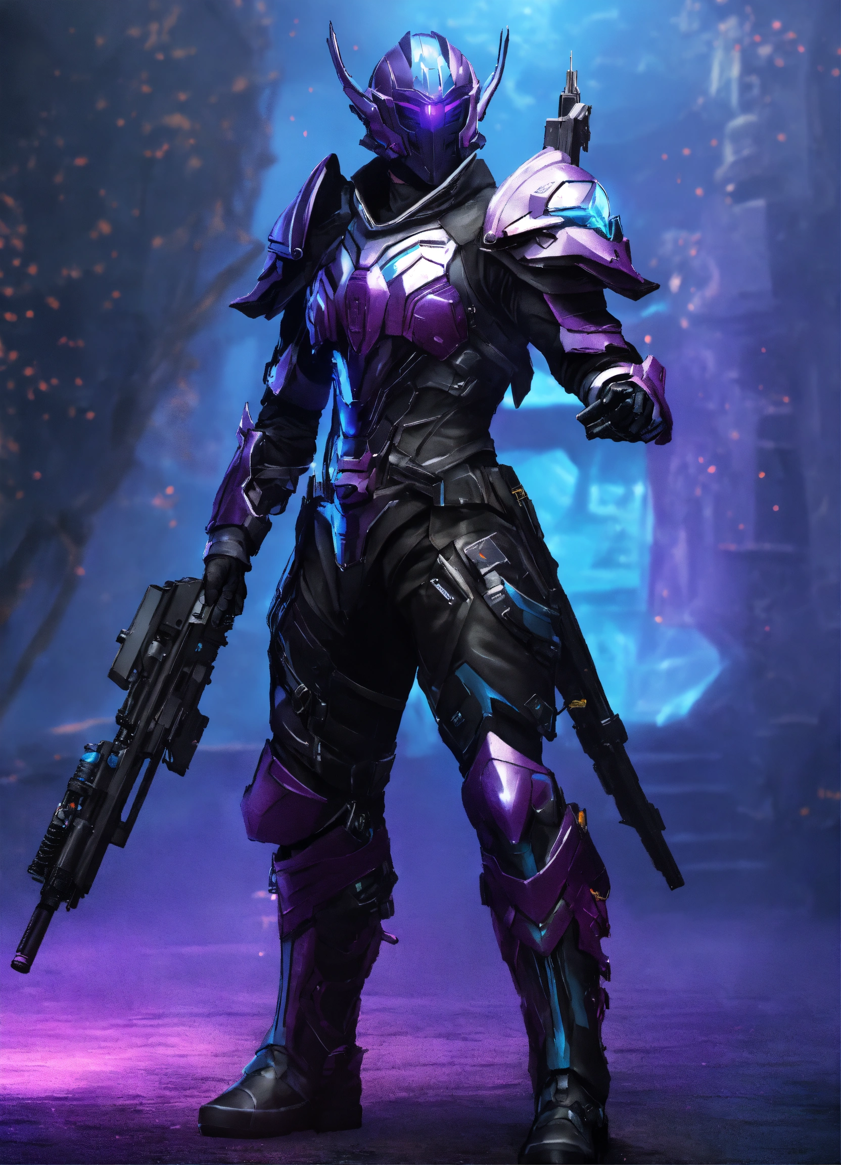 Full body of a high elf sci fi soldier wearing heavy sci fi elven armor, cybernetic black and purple and light blue armor and helmet, boots, male, holding a light machine gun with both hands, full body, hd