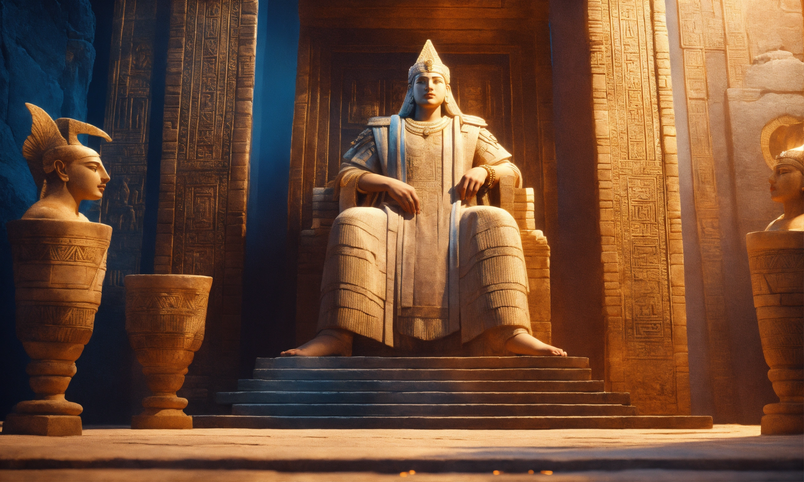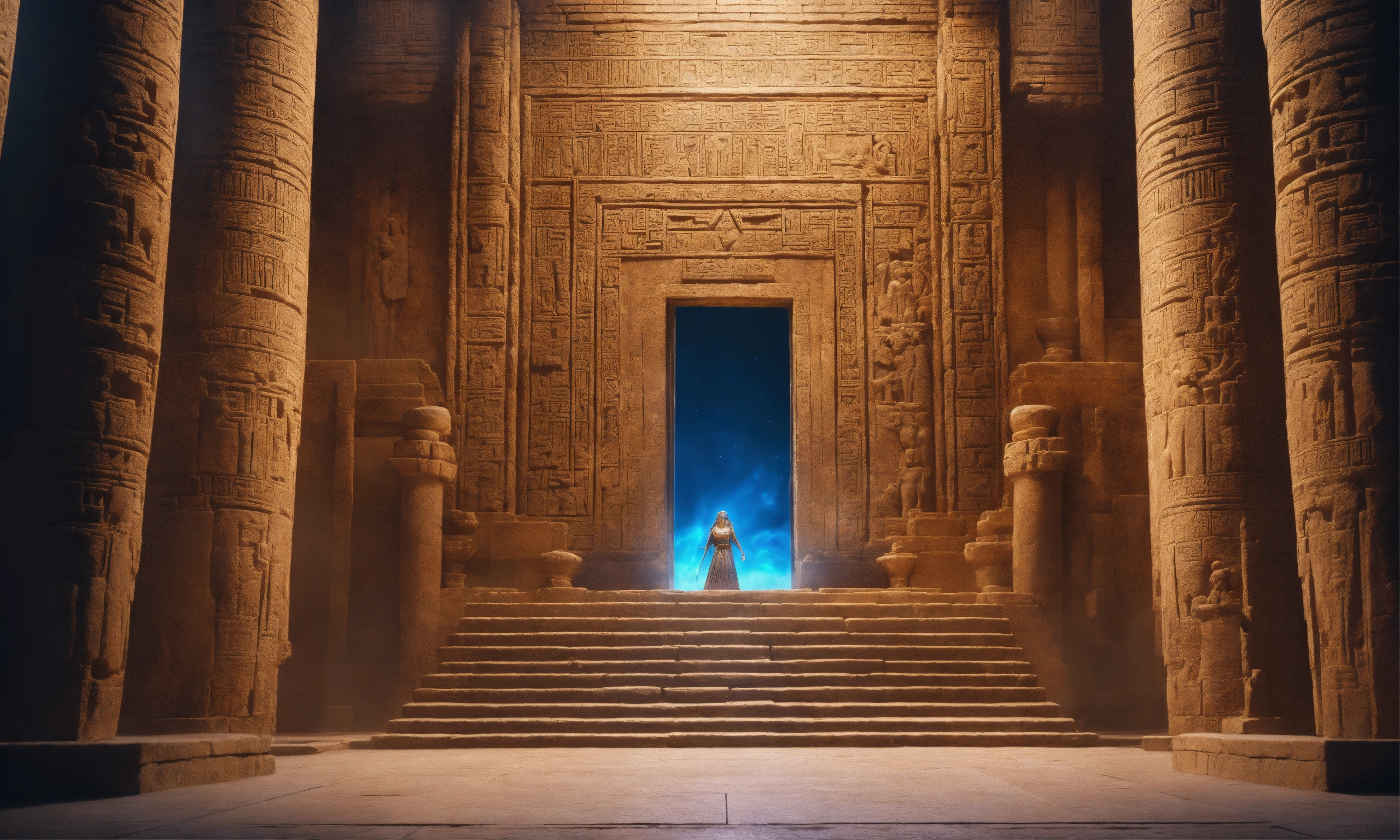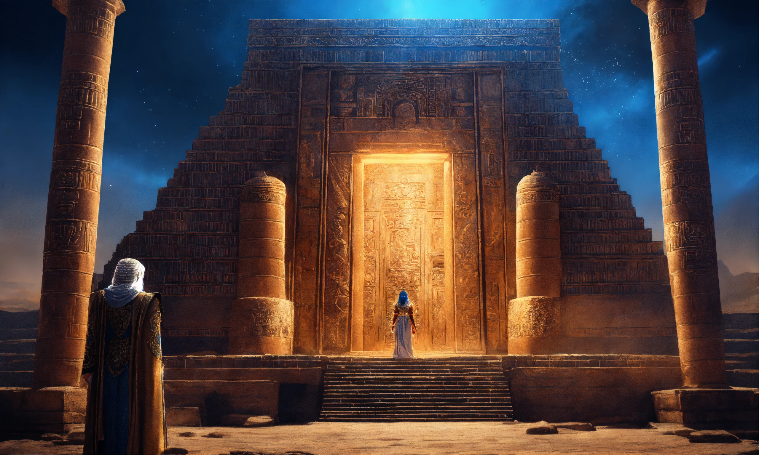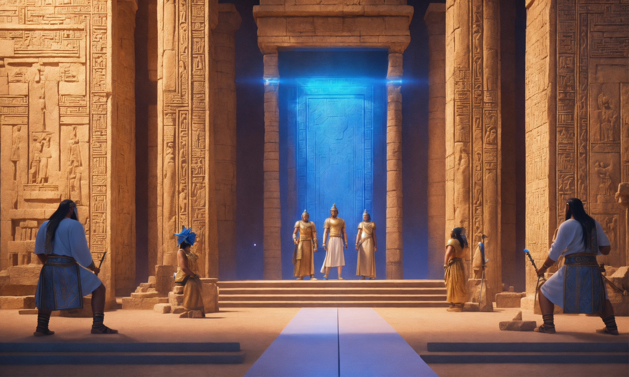 Sumerian gods and goddesses are wearing their godly clothes, their hair is white, their eyes are like a blue light, the background is the sumerian ziggurats, the dimensional door, realistic, cinematic, 8k